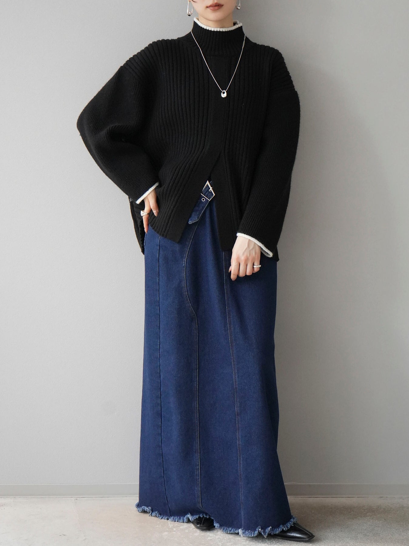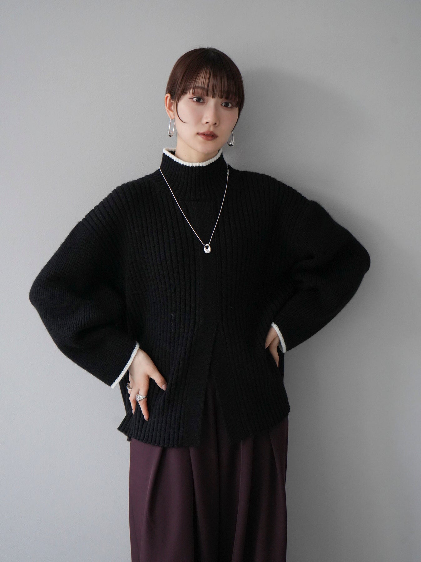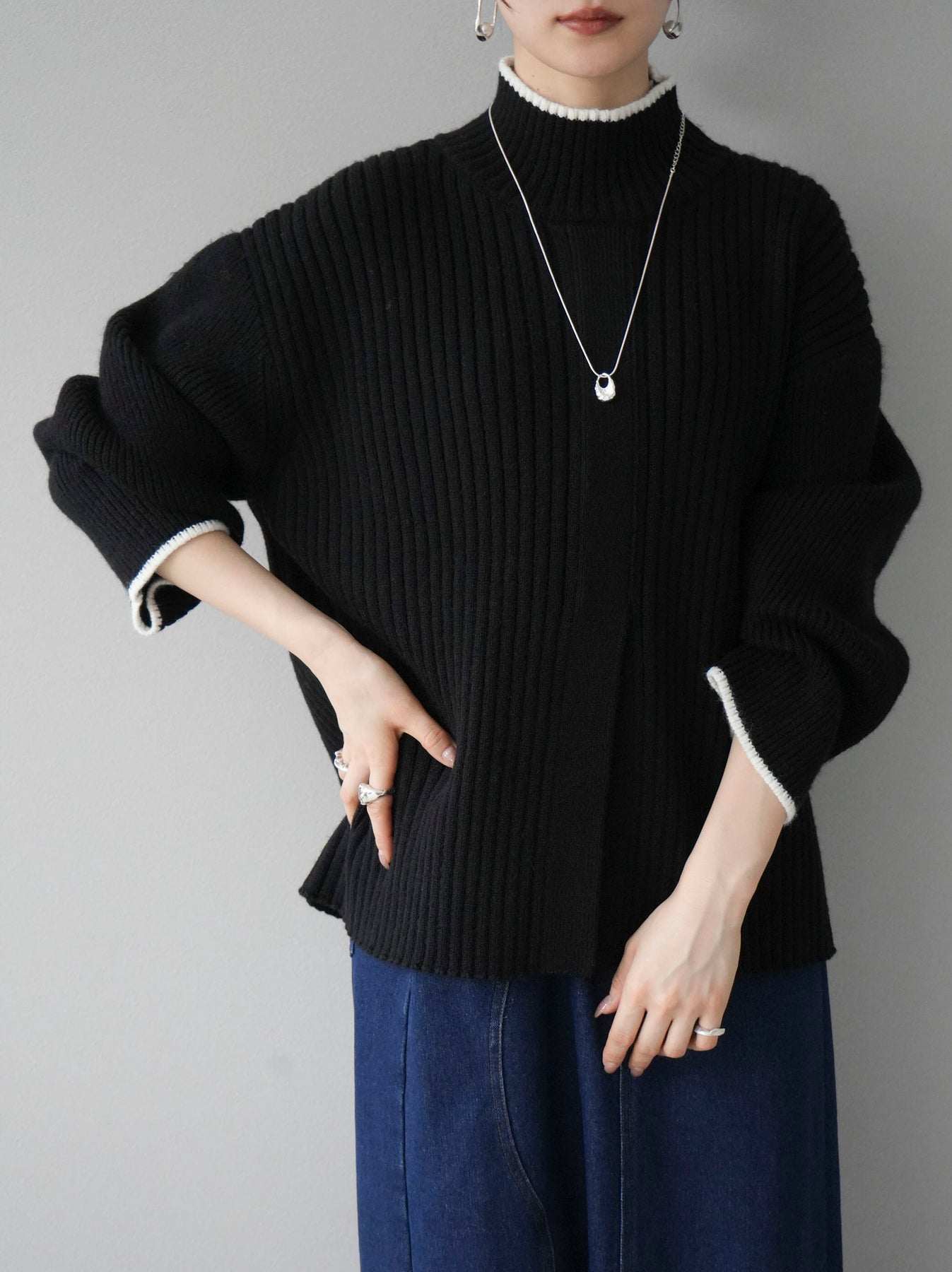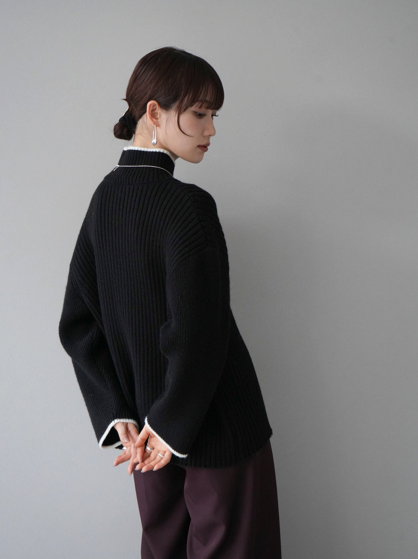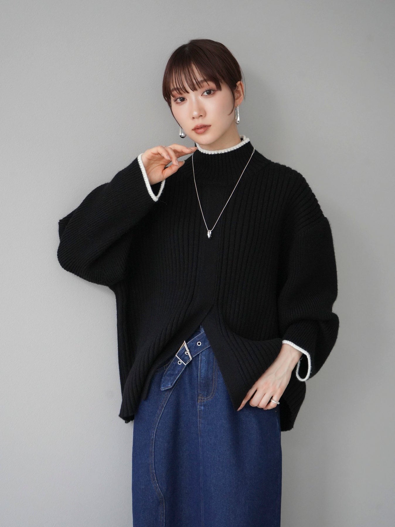 高領針織衫,前開衩,雙色配色引人注目。這件簡單但注重細節的服裝只要穿上它就會成為您服裝的焦點。寬鬆的廓形,前後長度不一,可享受輕鬆的風格。這是一個非常時尚的多功能物品。 ※除下裝、吊帶背心(內衣)以外的所有商品均不包含內衣。
