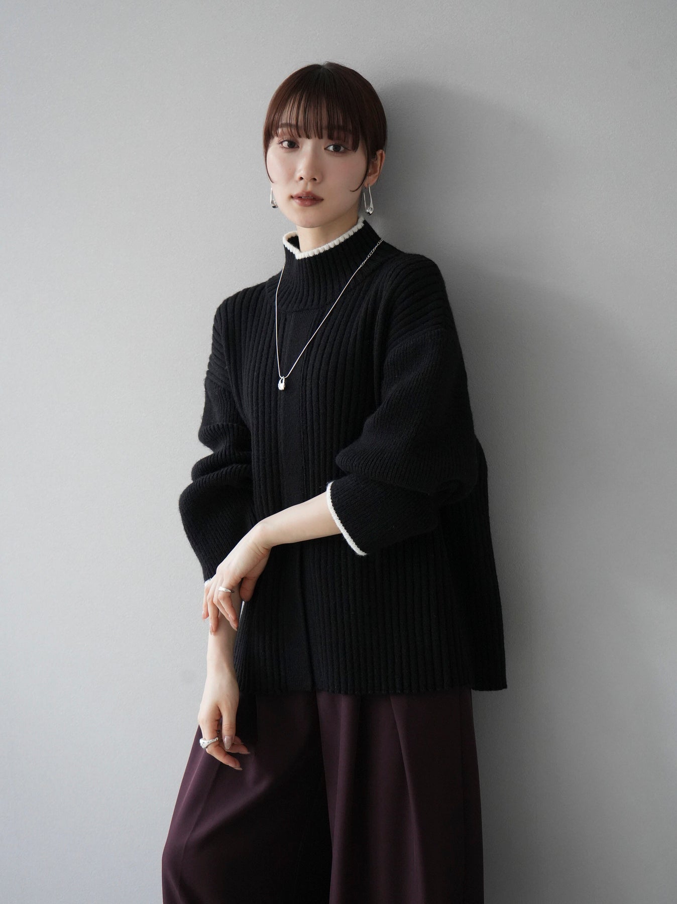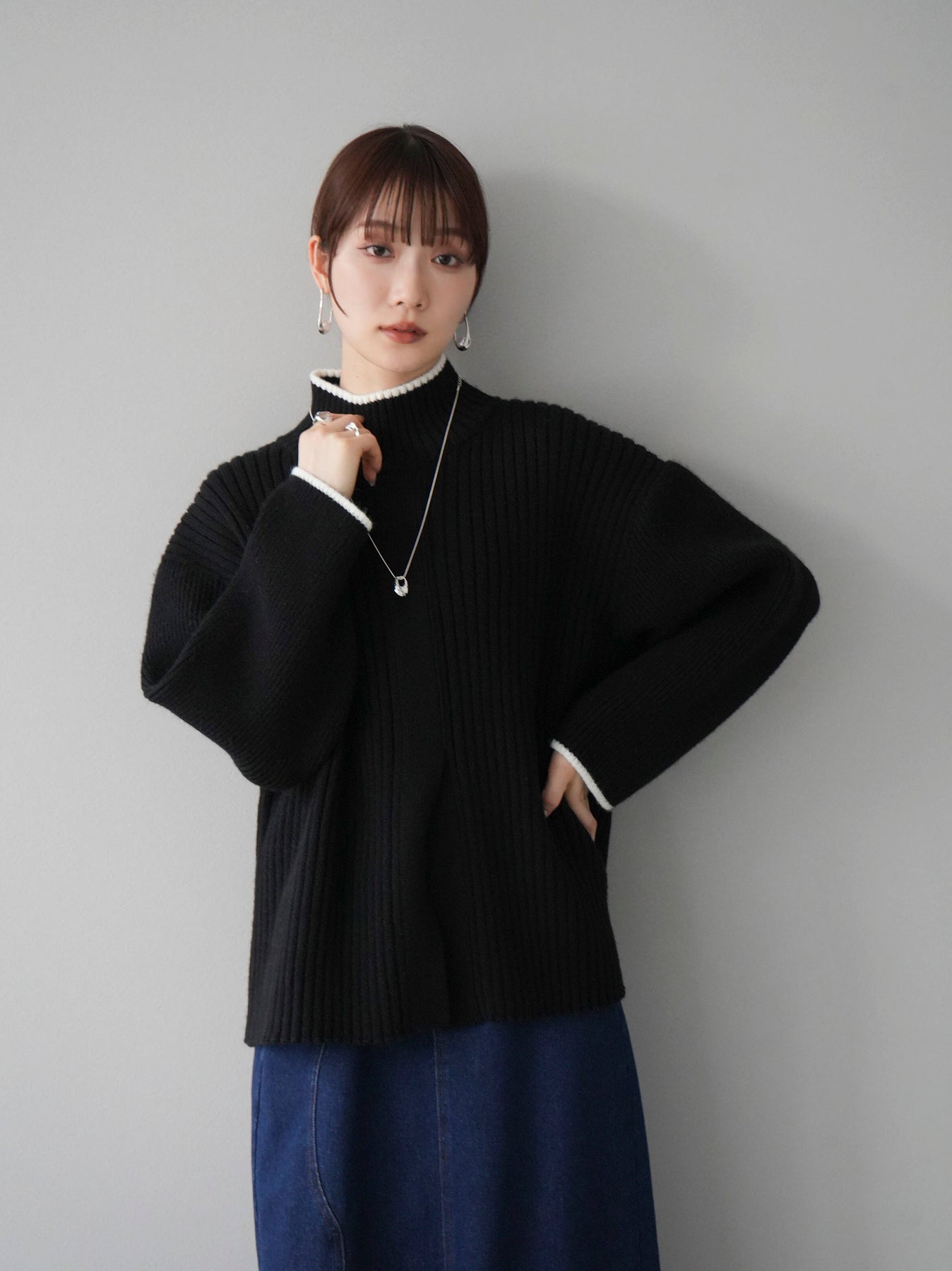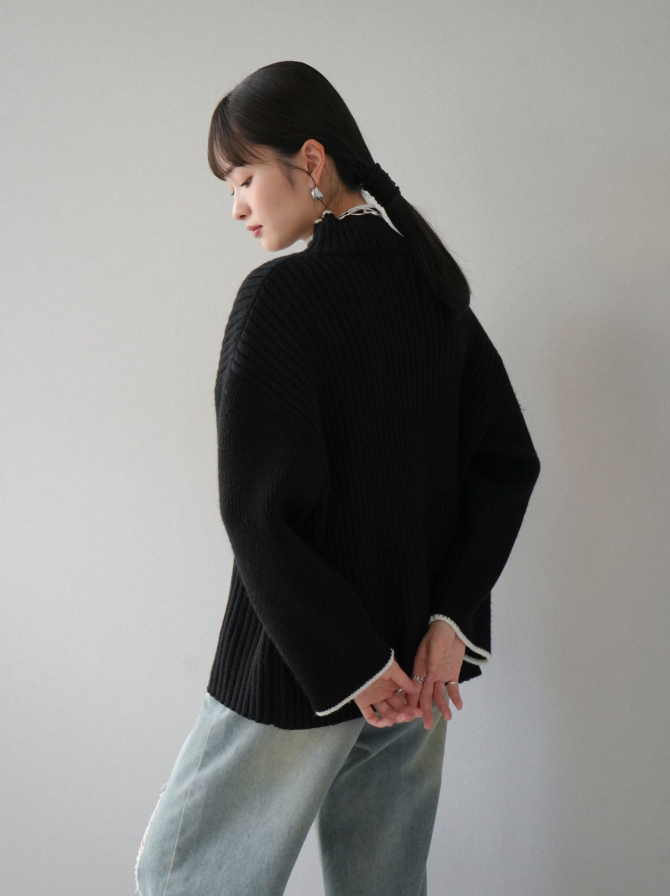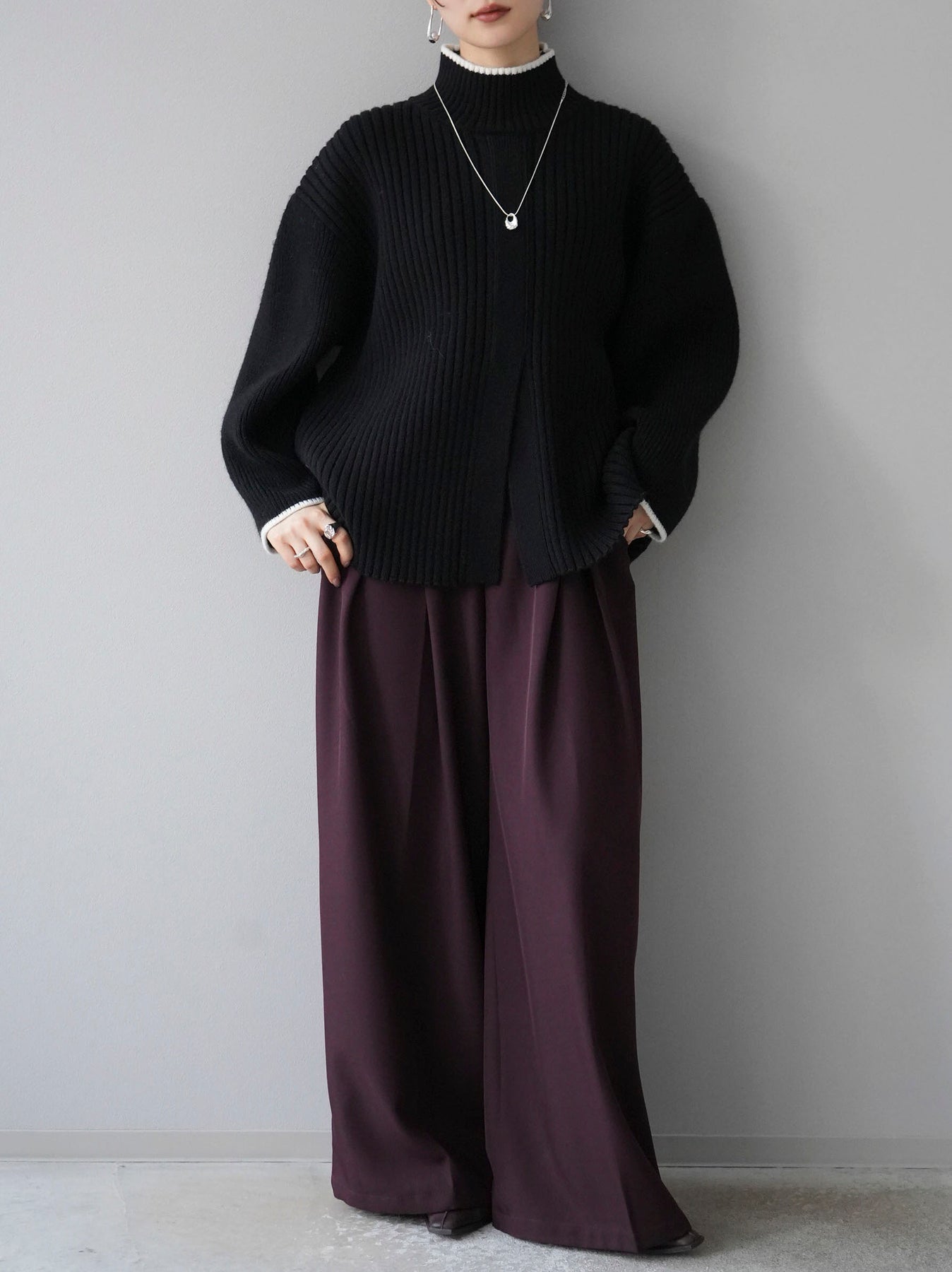 高領針織衫,前開衩,雙色配色引人注目。這件簡單但注重細節的服裝只要穿上它就會成為您服裝的焦點。寬鬆的廓形,前後長度不一,可享受輕鬆的風格。這是一個非常時尚的多功能物品。 ※除下裝、吊帶背心(內衣)以外的所有商品均不包含內衣。