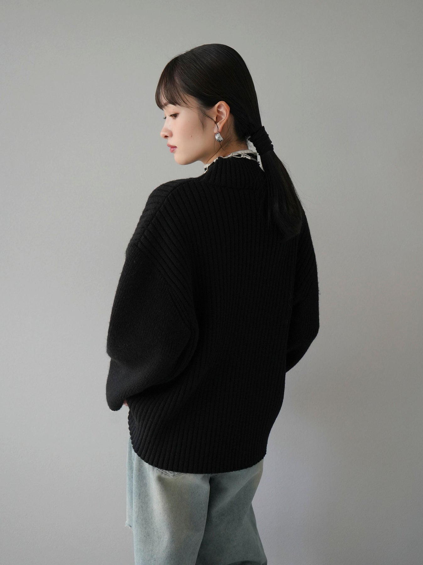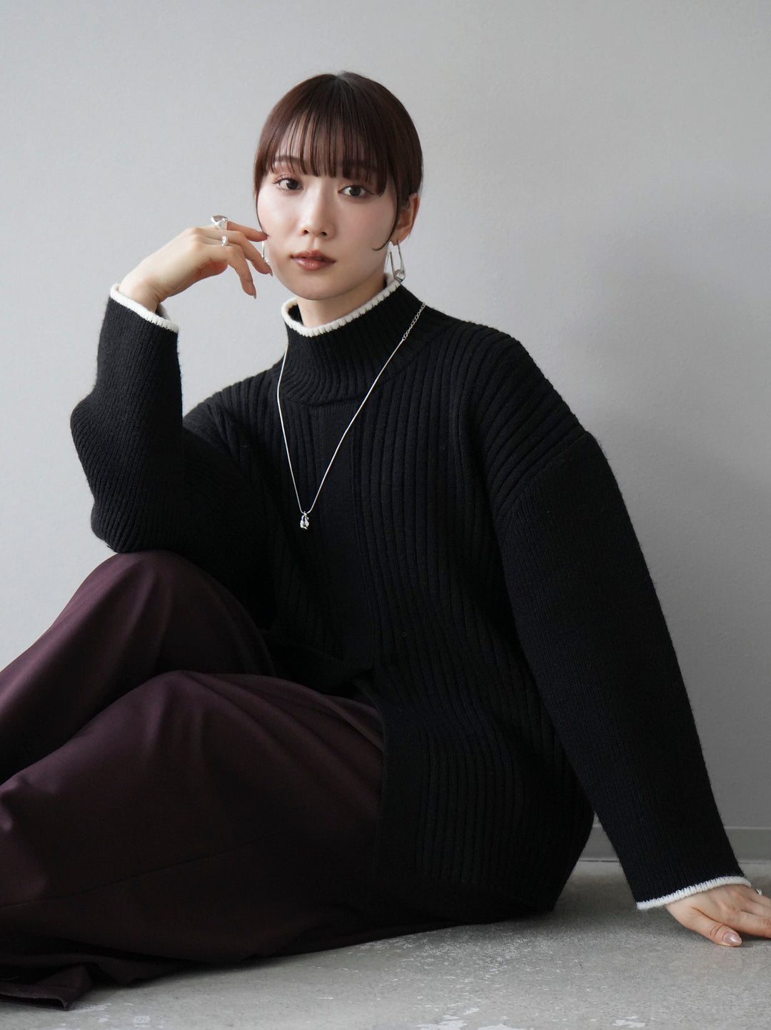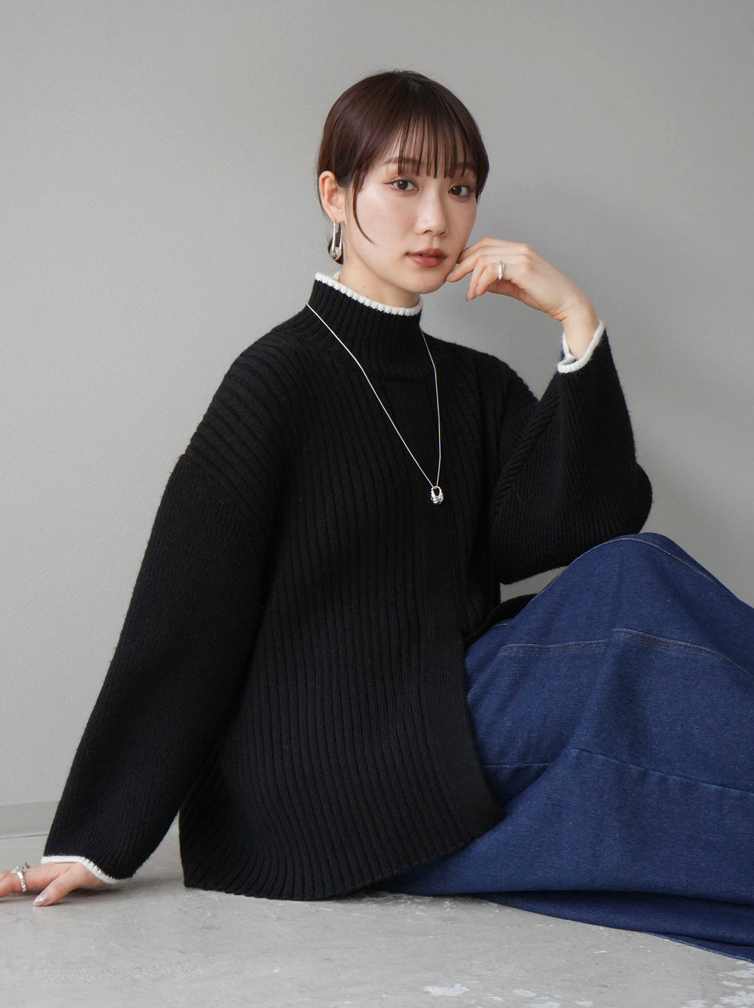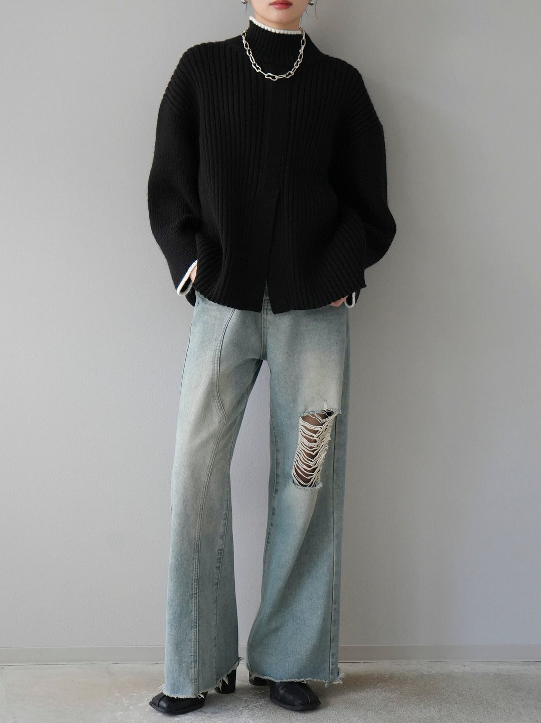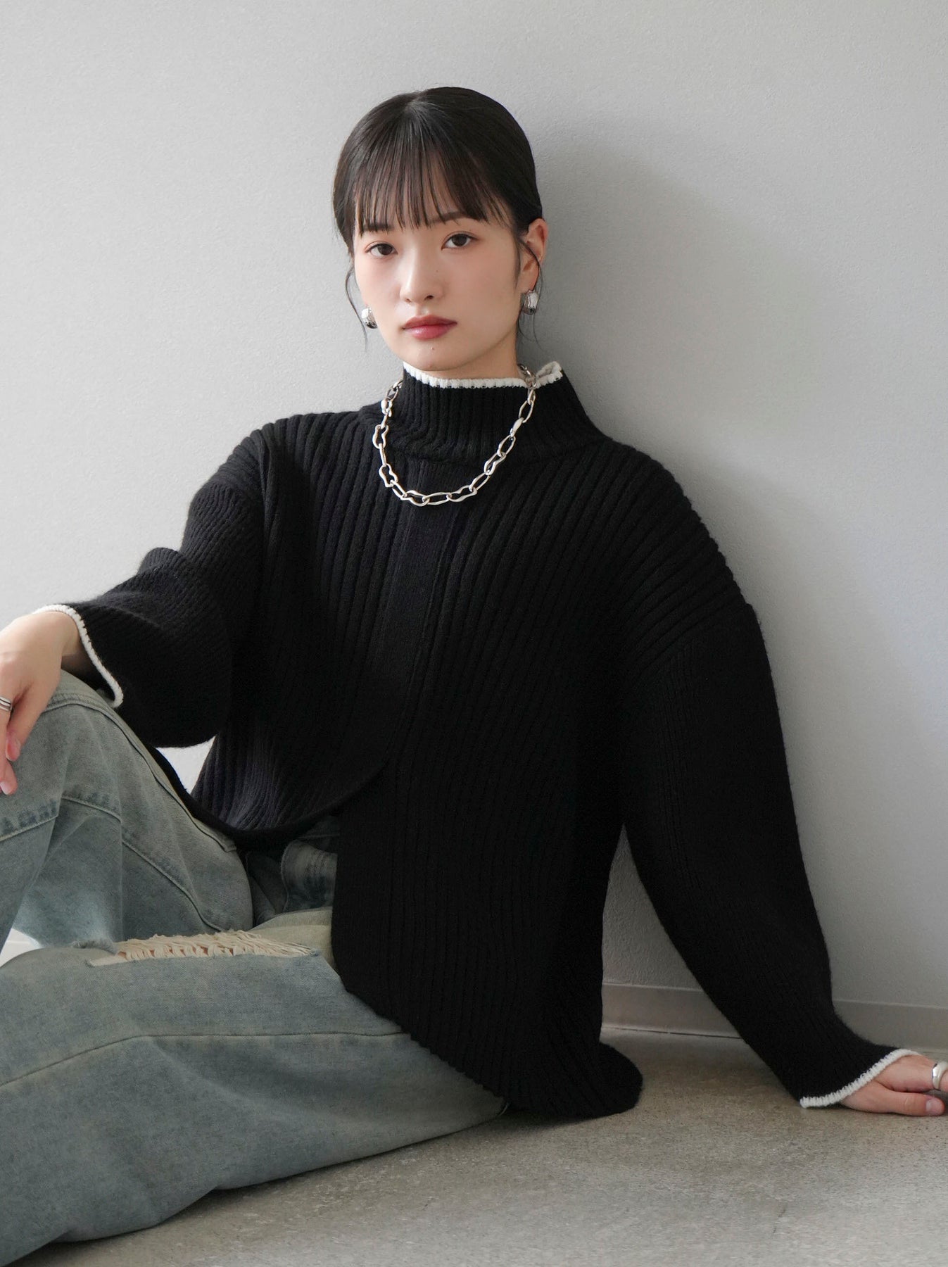 高領針織衫,前開衩,雙色配色引人注目。這件簡單但注重細節的服裝只要穿上它就會成為您服裝的焦點。寬鬆的廓形,前後長度不一,可享受輕鬆的風格。這是一個非常時尚的多功能物品。 ※除下裝、吊帶背心(內衣)以外的所有商品均不包含內衣。