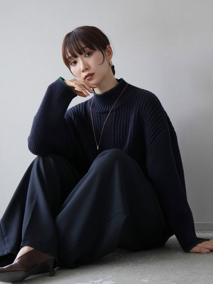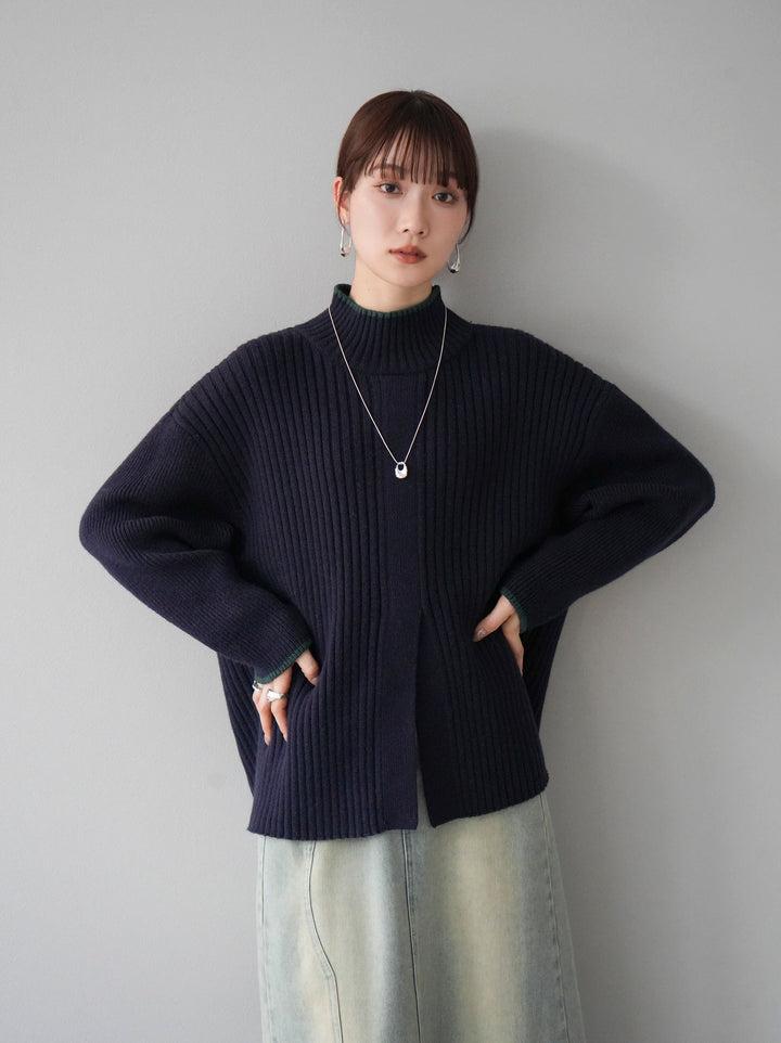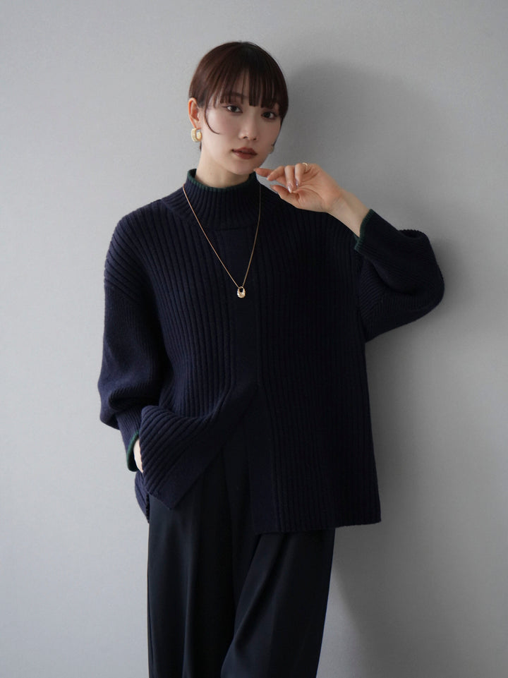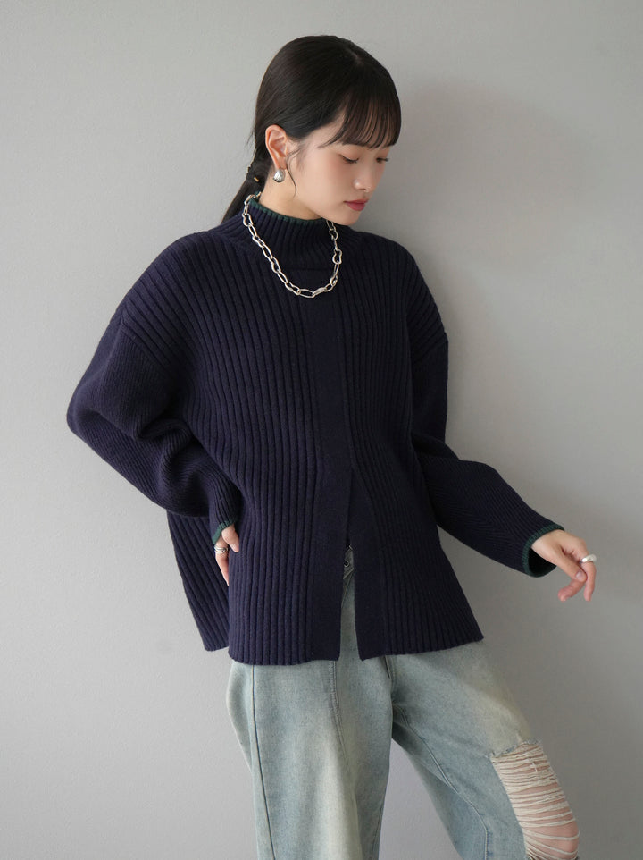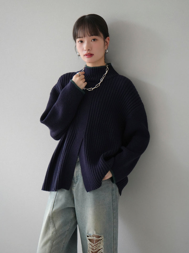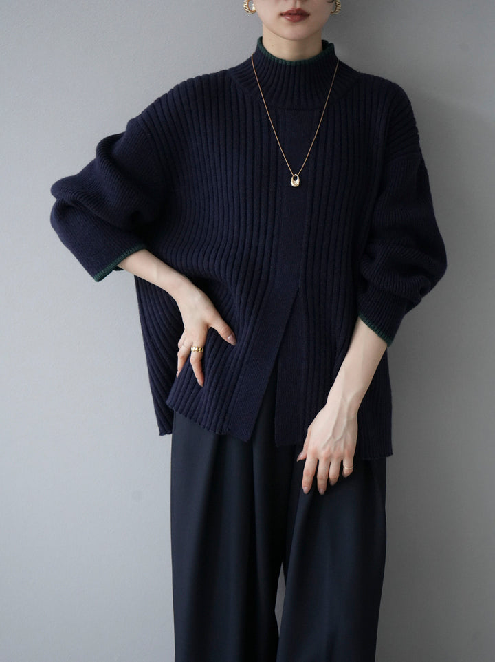 高領針織衫,前開衩,雙色配色引人注目。這件簡單但注重細節的服裝只要穿上它就會成為您服裝的焦點。寬鬆的廓形,前後長度不一,可享受輕鬆的風格。這是一個非常時尚的多功能物品。 ※除下裝、吊帶背心(內衣)以外的所有商品均不包含內衣。