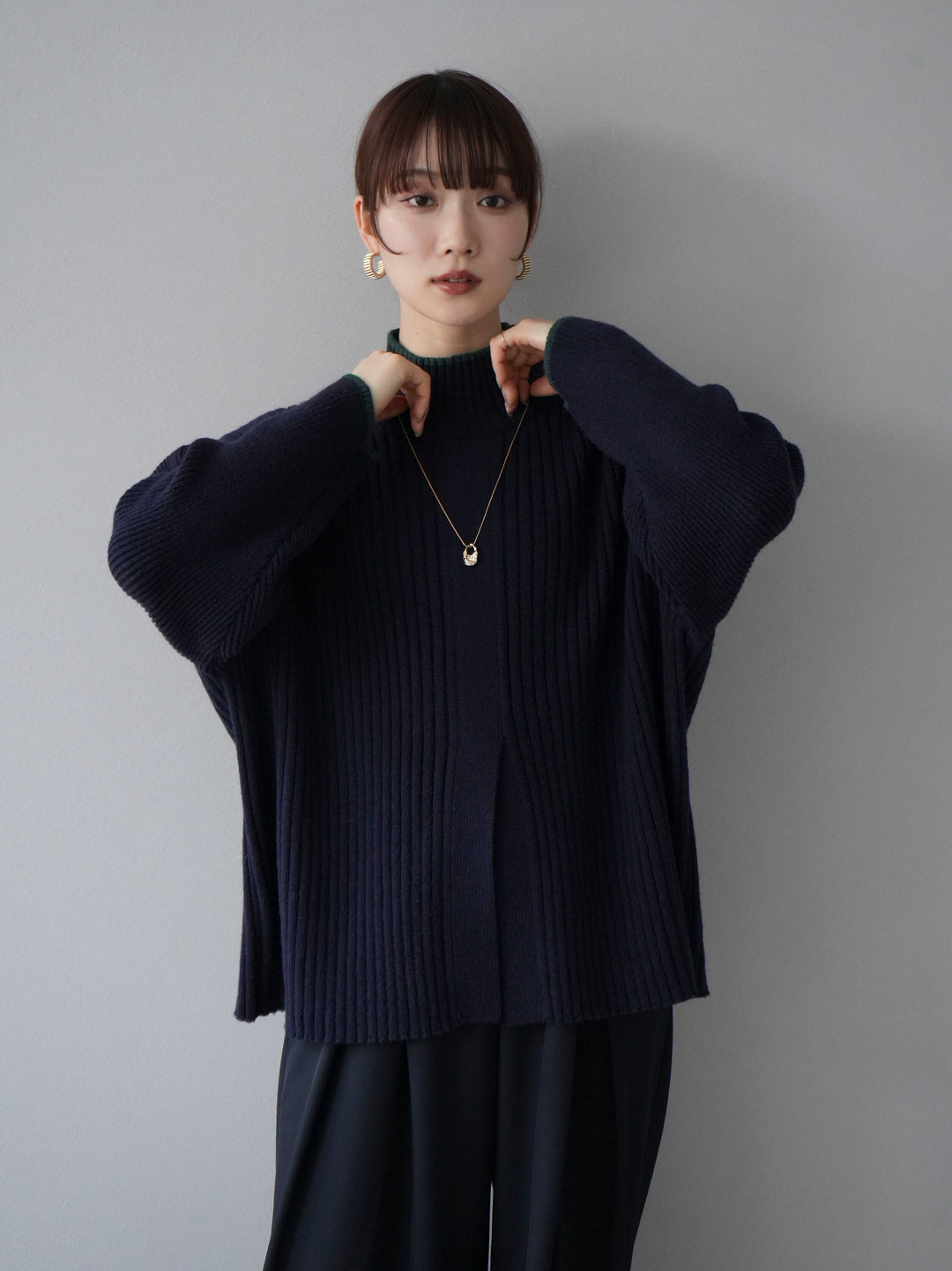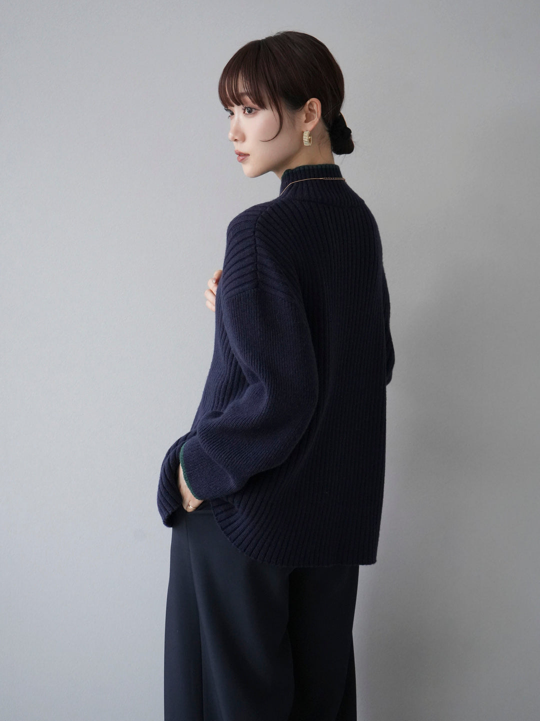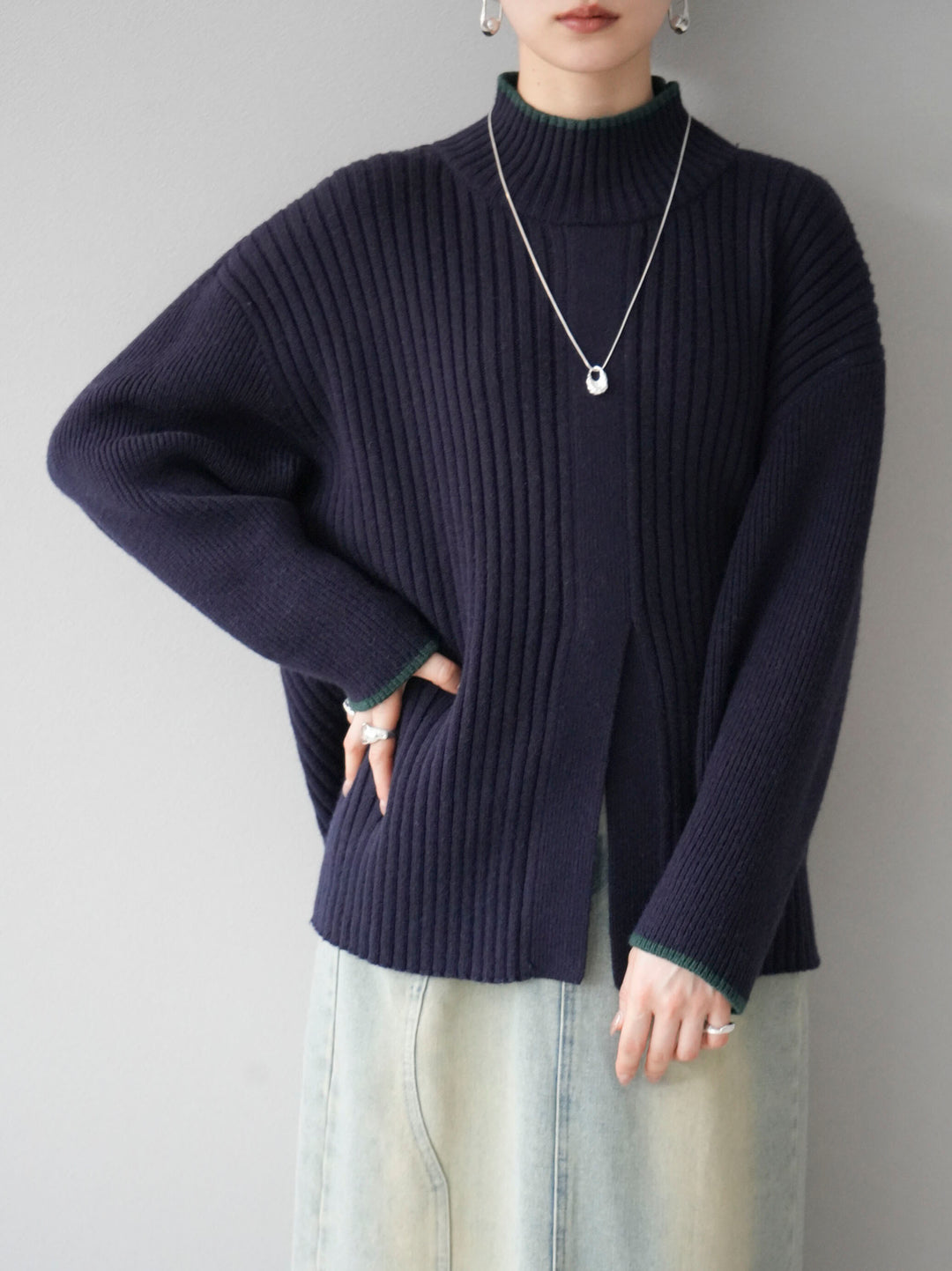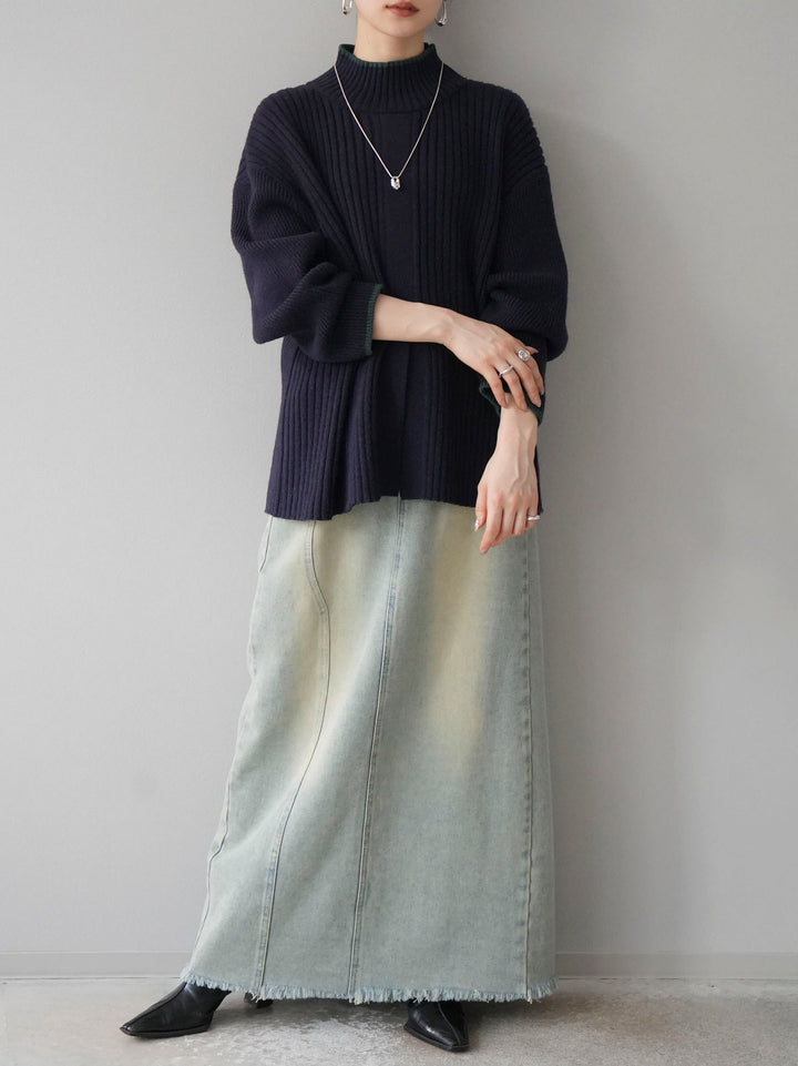 高領針織衫,前開衩,雙色配色引人注目。這件簡單但注重細節的服裝只要穿上它就會成為您服裝的焦點。寬鬆的廓形,前後長度不一,可享受輕鬆的風格。這是一個非常時尚的多功能物品。 ※除下裝、吊帶背心(內衣)以外的所有商品均不包含內衣。