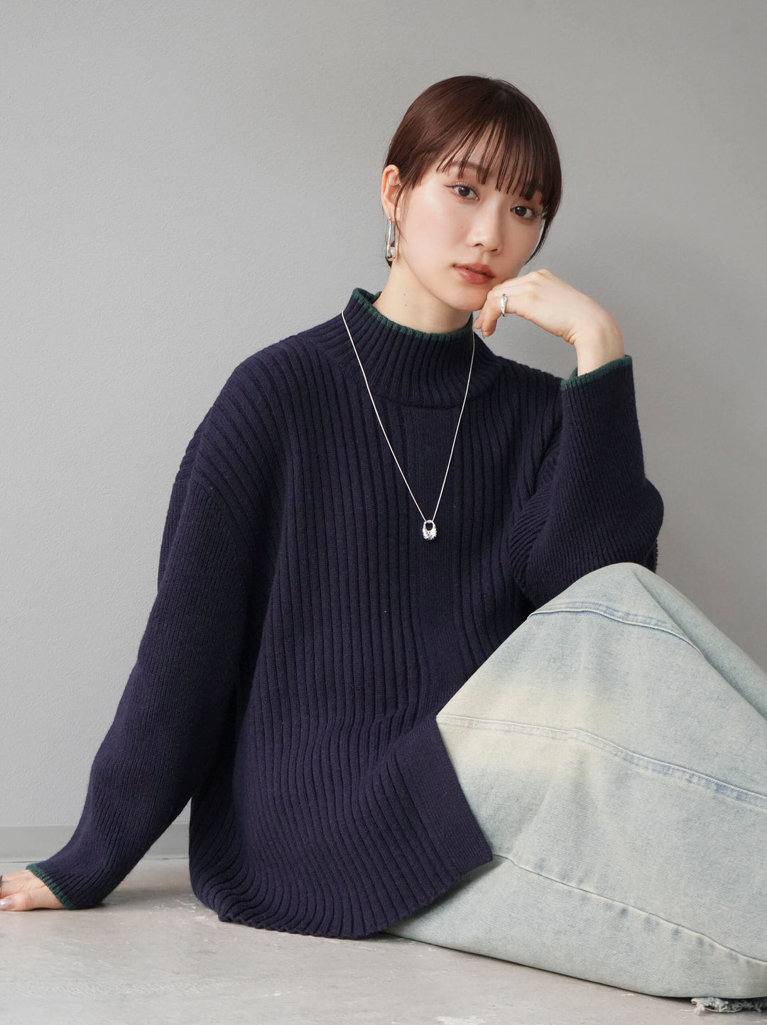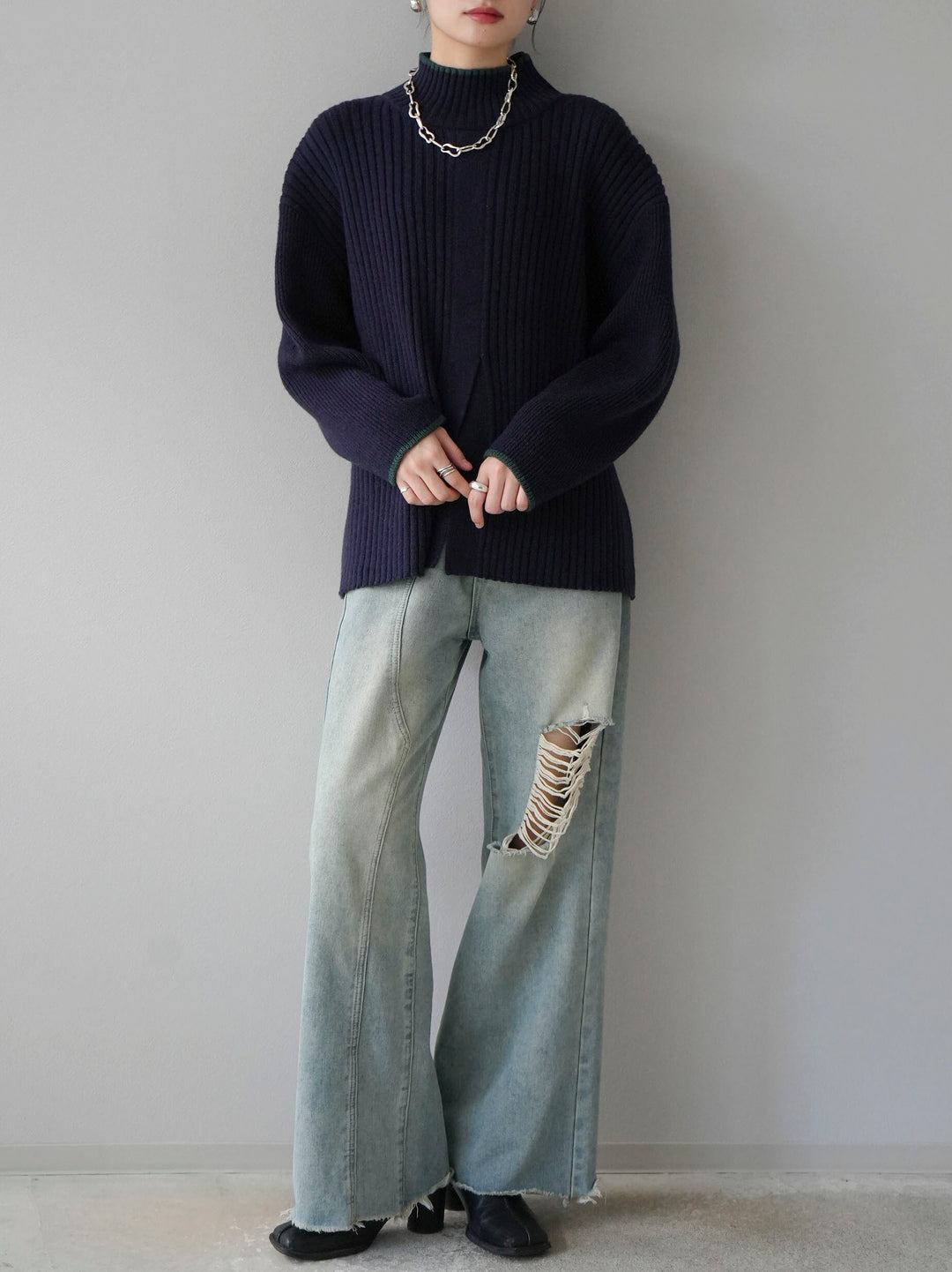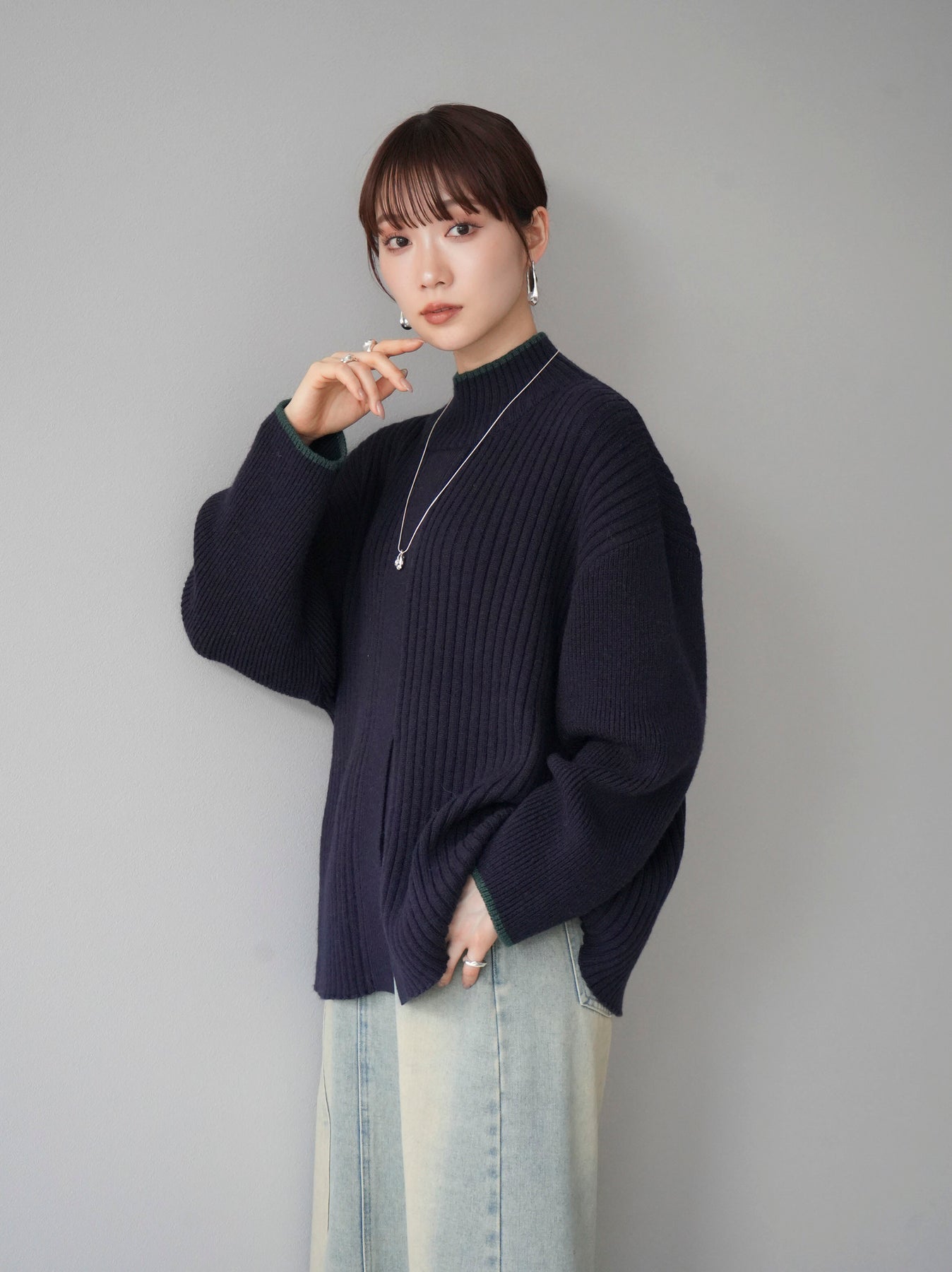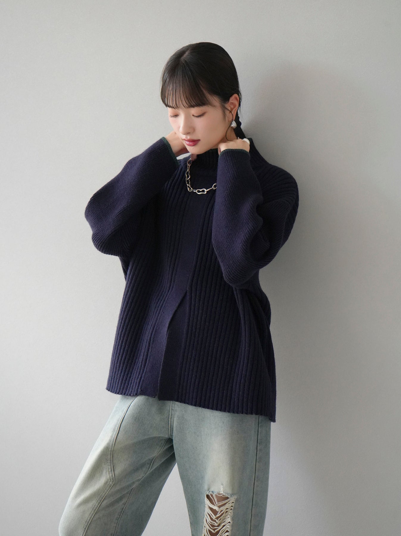 高領針織衫,前開衩,雙色配色引人注目。這件簡單但注重細節的服裝只要穿上它就會成為您服裝的焦點。寬鬆的廓形,前後長度不一,可享受輕鬆的風格。這是一個非常時尚的多功能物品。 ※除下裝、吊帶背心(內衣)以外的所有商品均不包含內衣。