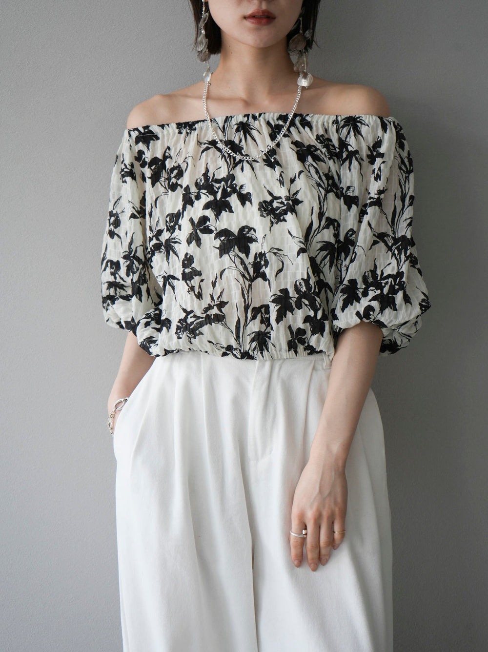 這款露肩襯衫採用輕盈水洗材質和花卉圖案。大膽的肩部設計凸顯女性氣質,褶皺的袖口和下擺增加了體積。這件單品很容易打造休閒風格和女性風格。質地和圖案非常適合春夏搭配,與牛仔布和裙子都很相配。有兩種顏色可供選擇:綠色和灰白色。
