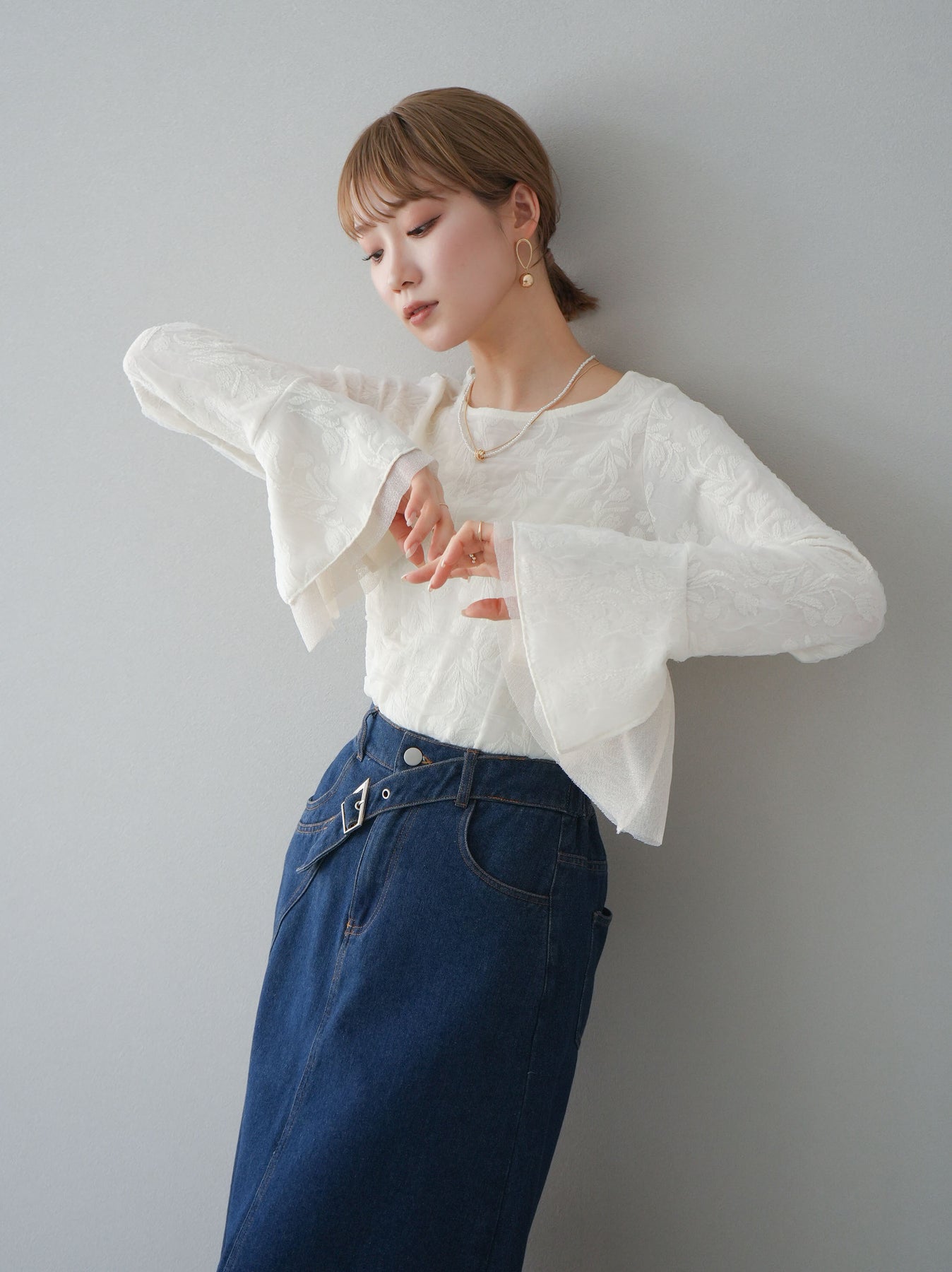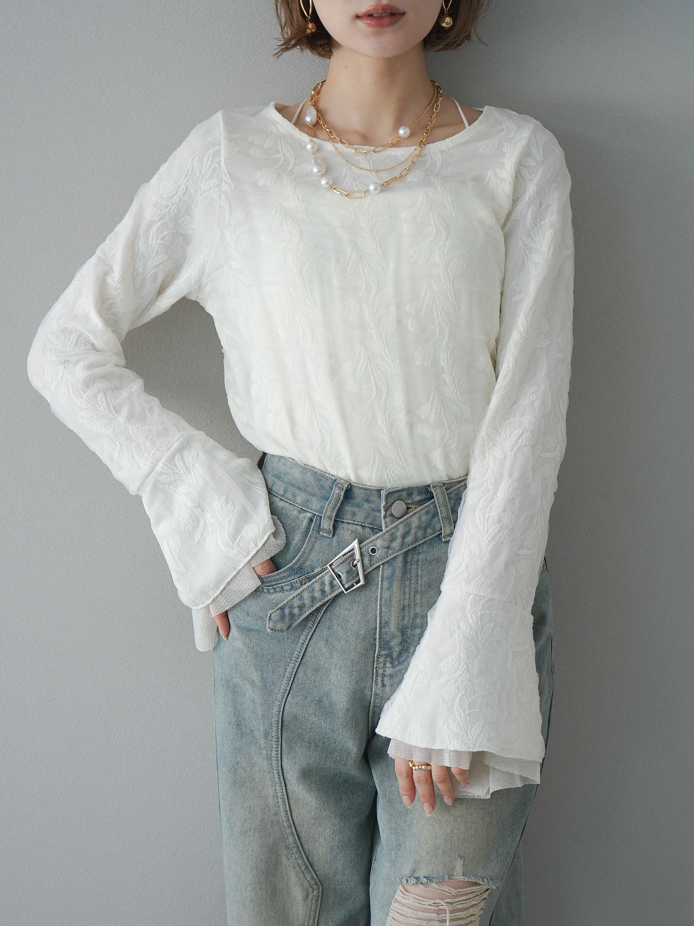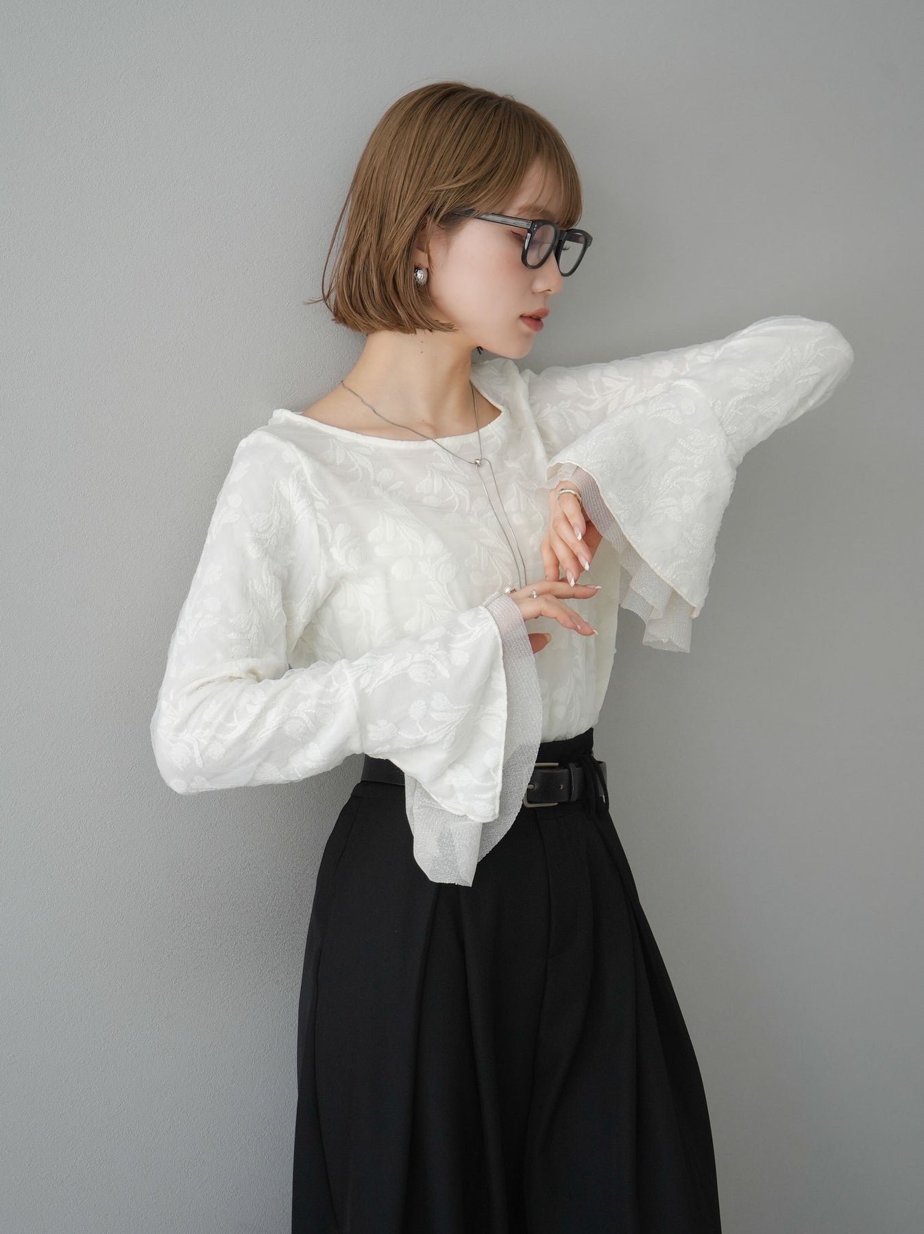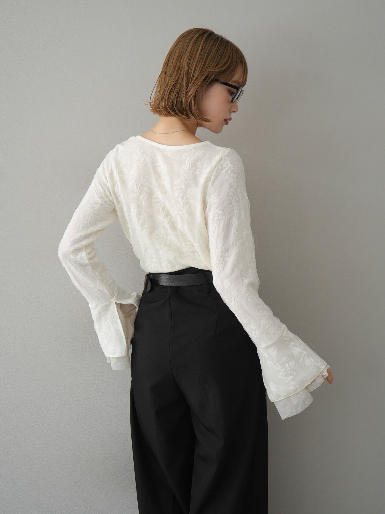 【預購】雙層紗布袖喇叭疊層提花上衣/象牙白