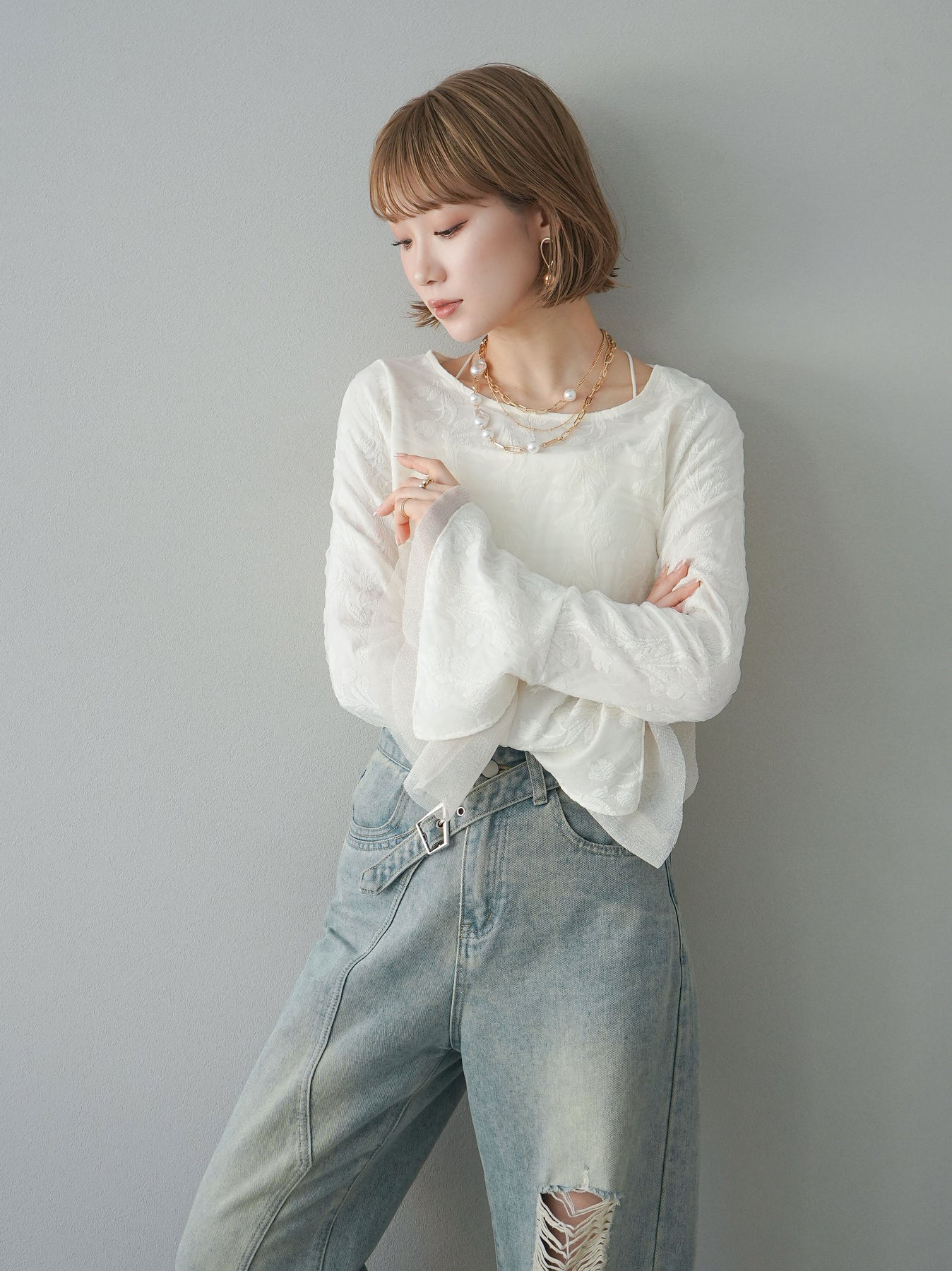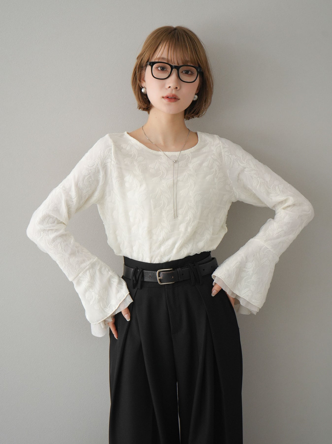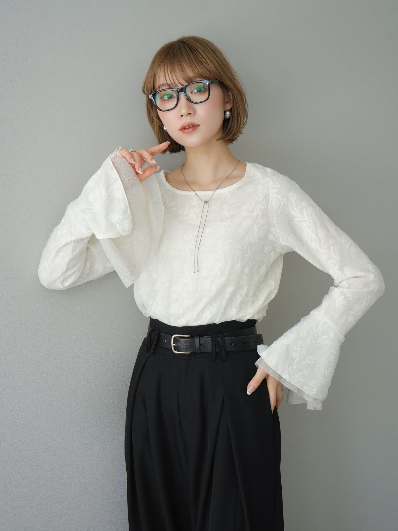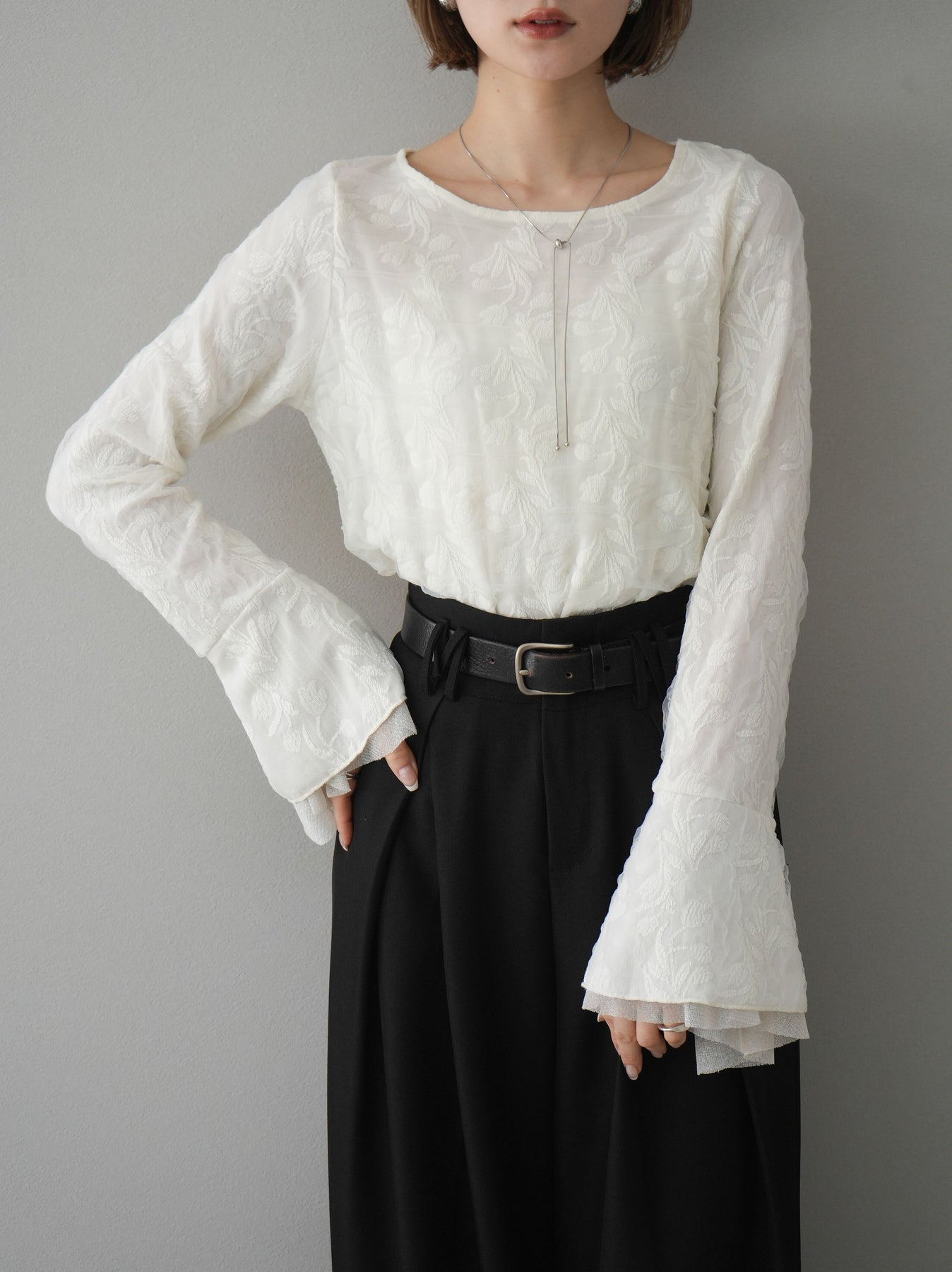 【預購】雙層紗布袖喇叭疊層提花上衣/象牙白