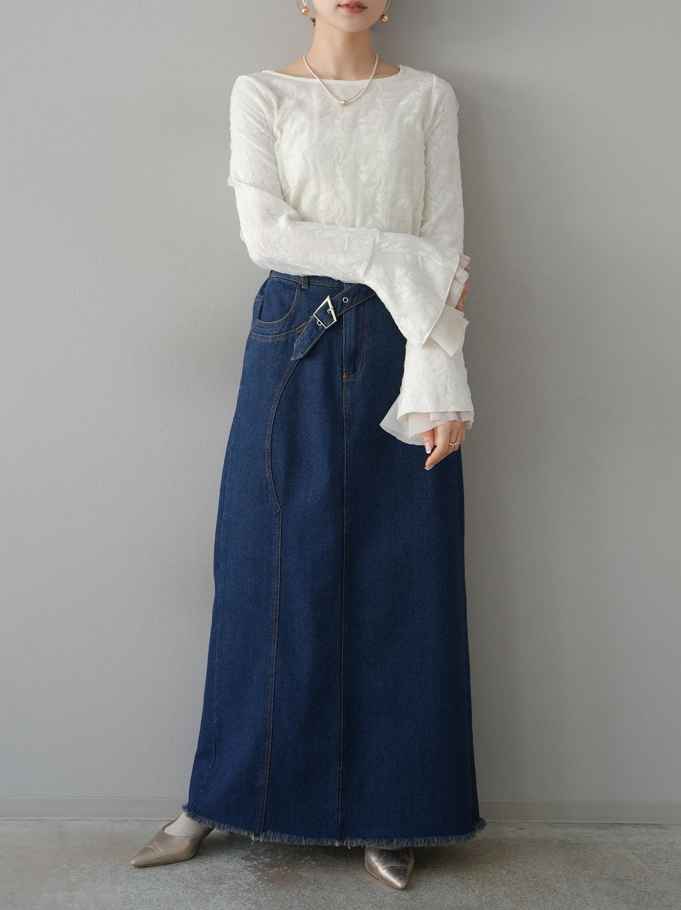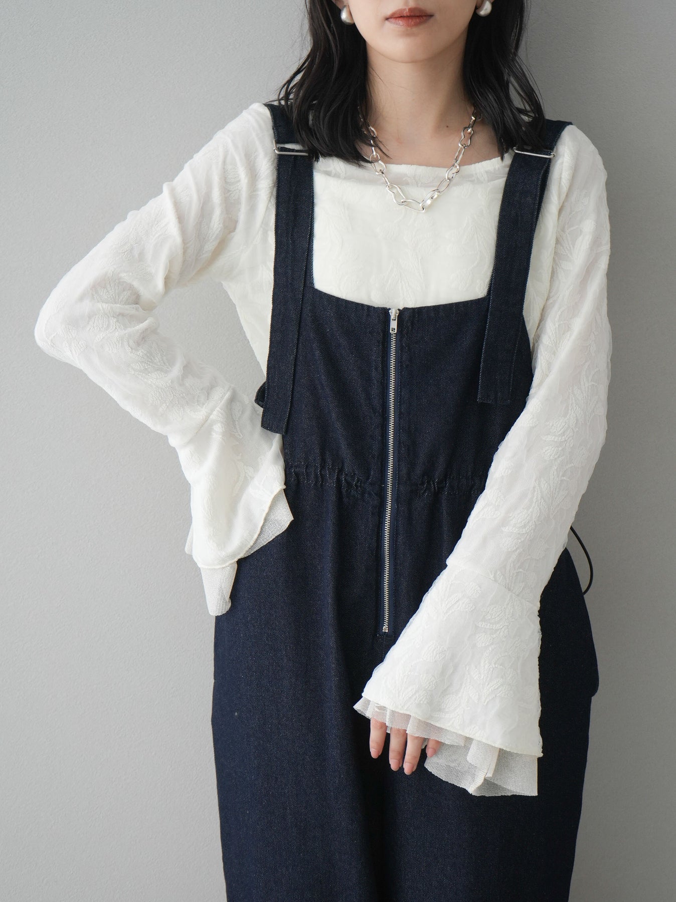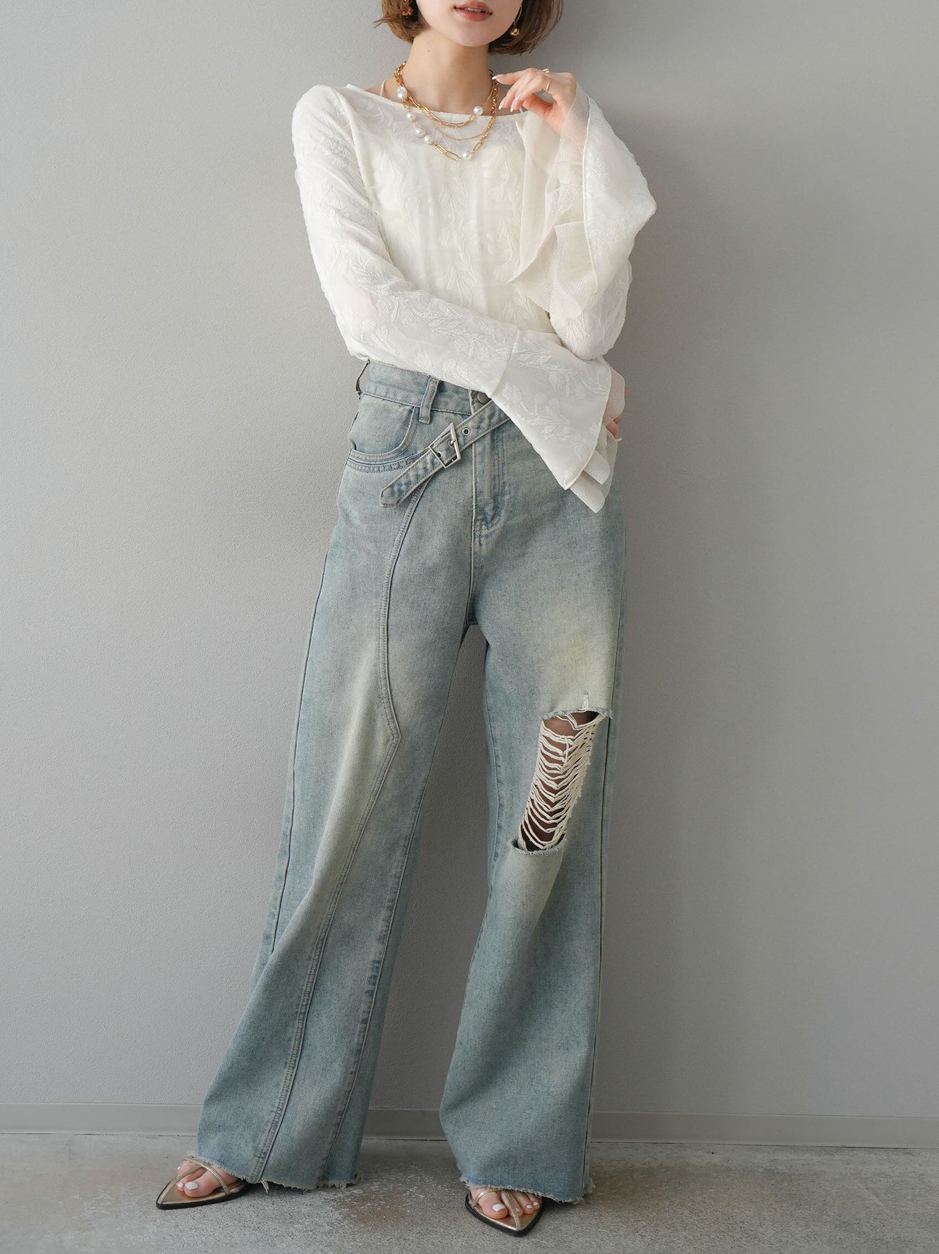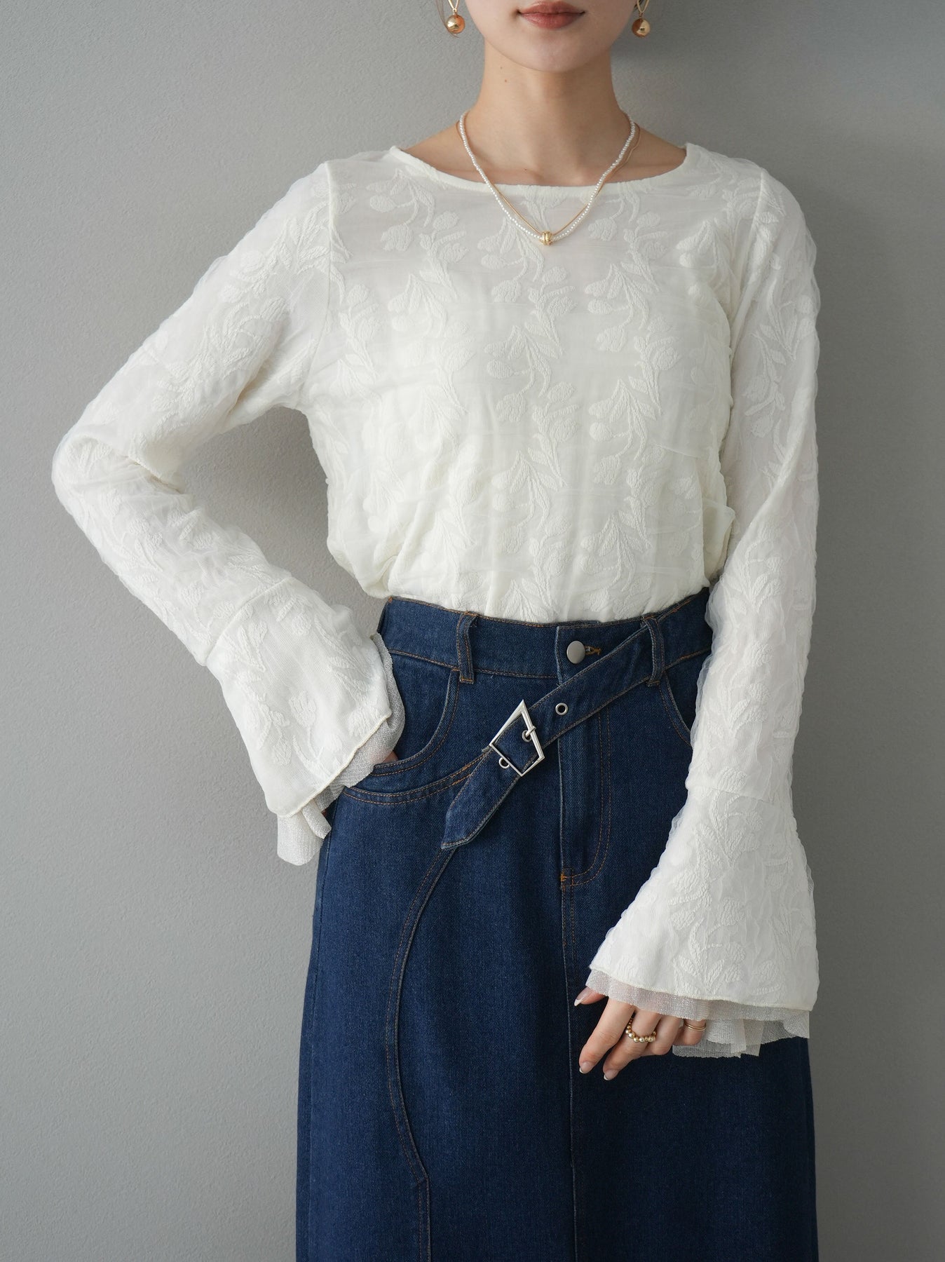 【預購】雙層紗布袖喇叭疊層提花上衣/象牙白