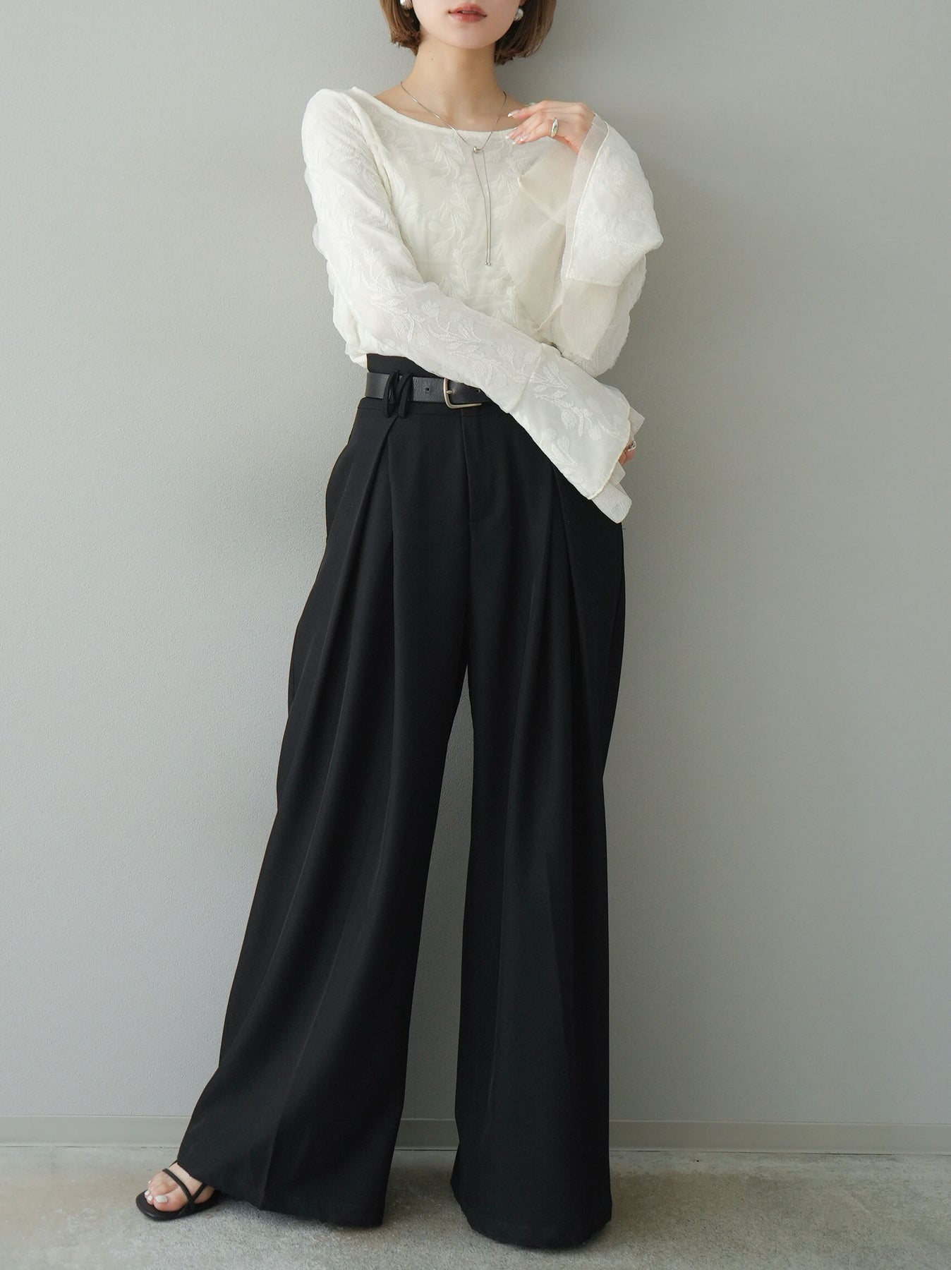 時尚提花上衣。柔軟的雙層紗布面料觸感柔和,精緻的喇叭袖設計營造出動態的視覺效果。輕薄的層疊設計增添一絲魅力,搭配牛仔褲或半身裙,更能展現時尚感。從日常穿著到特殊場合,這款上衣適合各種場合穿著。 ※除下裝、吊帶背心(內衣)以外的商品均為標準品,不含內衣。