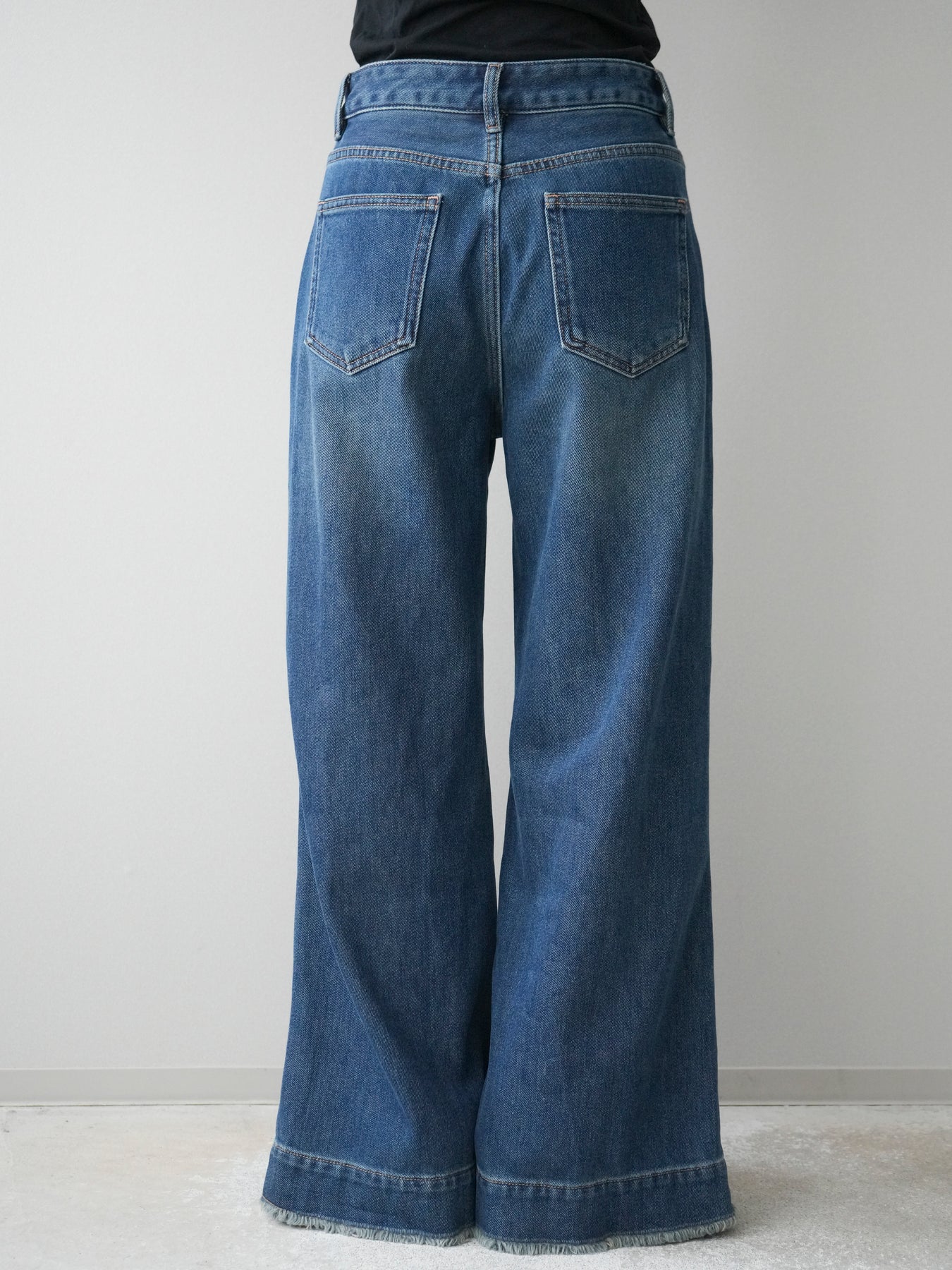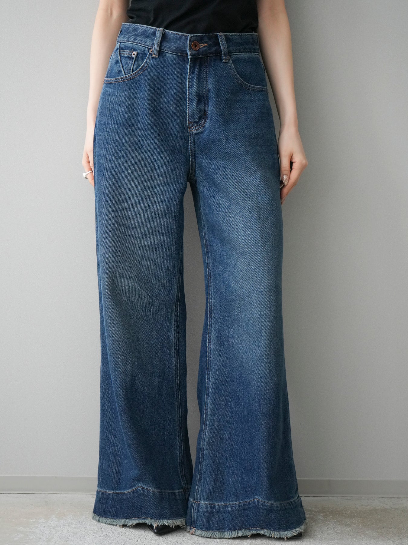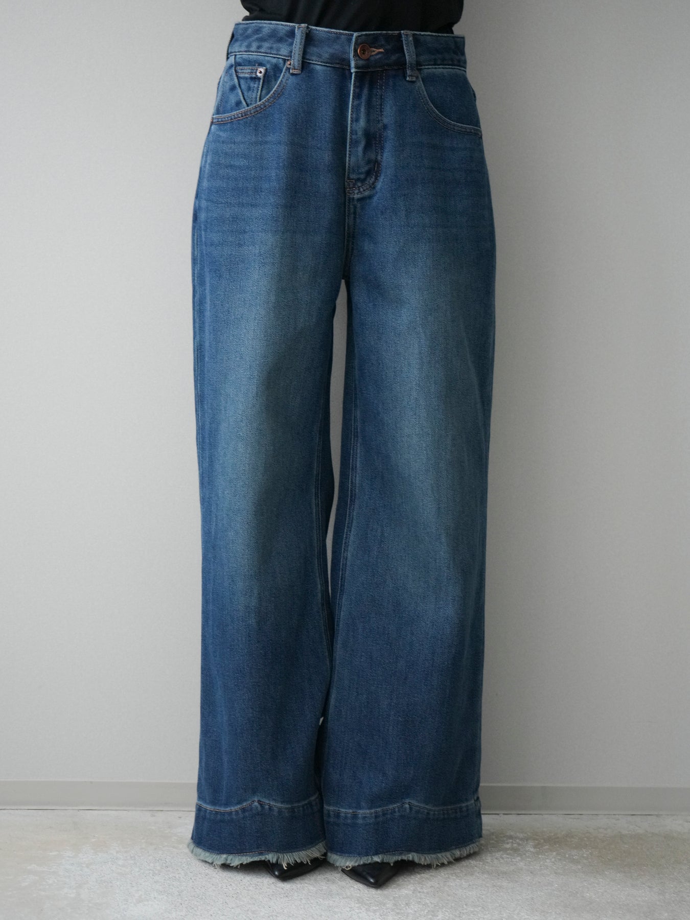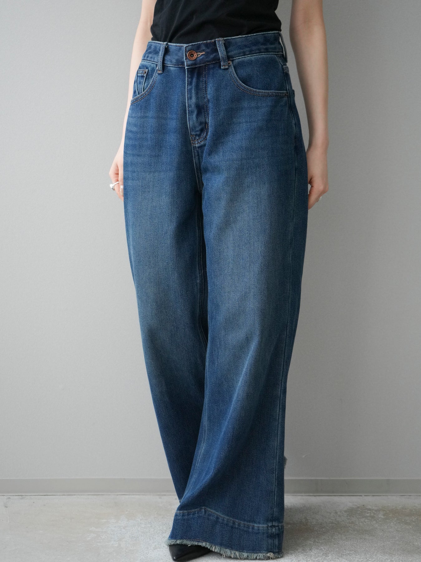 デニムのカジュアルさに、暖かみのある穿き心地を兼ね備えたワイドデニムパンツ。 裏起毛仕様ならではのやさしい肌あたりで、シーズンムードを高めながら快適に着用いただけます。 裾にはさりげないフリンジディテールを施し、シンプルな中にも程よいアクセントをプラス。 ワイドシルエットが自然な落ち感を生み、トップスを選ばずバランスよくスタイリングが決まります。 デイリー使いはもちろん、ニットやアウターと合わせた季節感のあるコーディネートにもおすすめの一本です。
