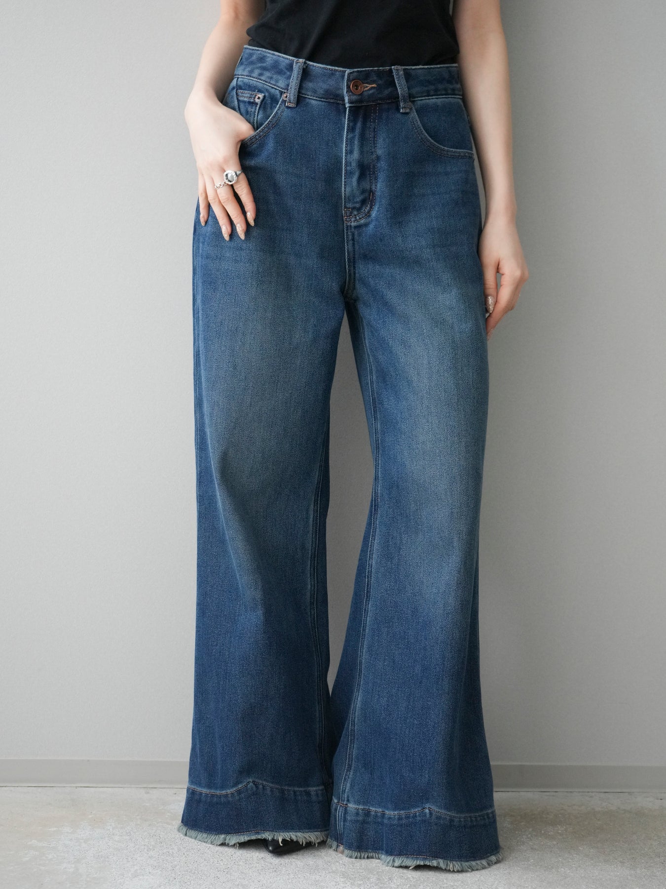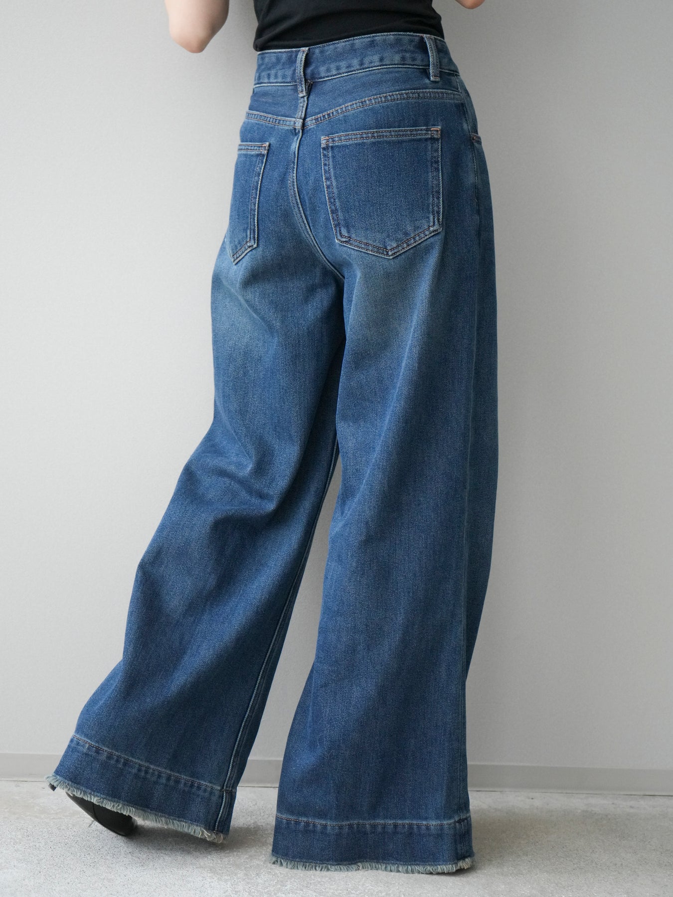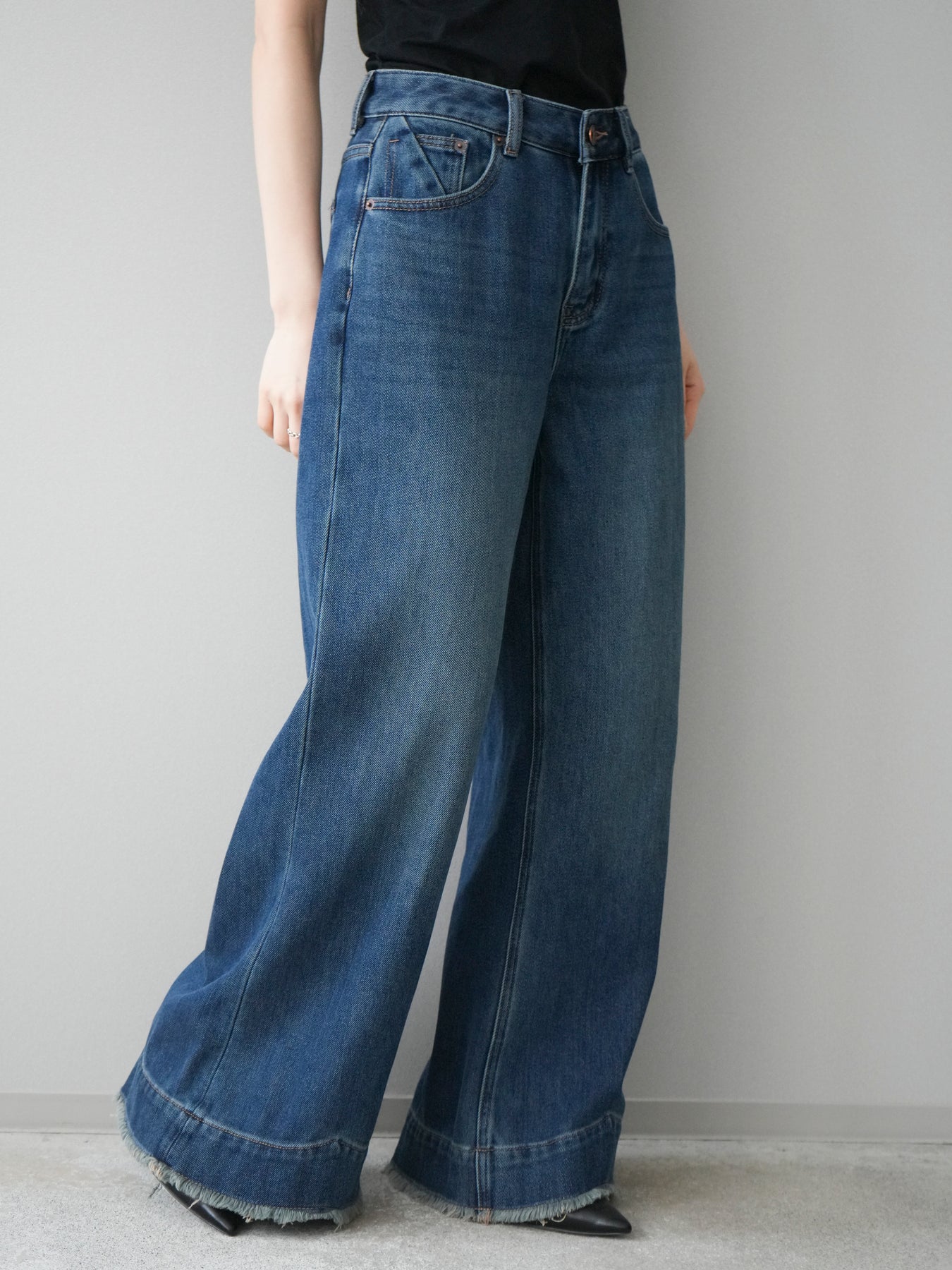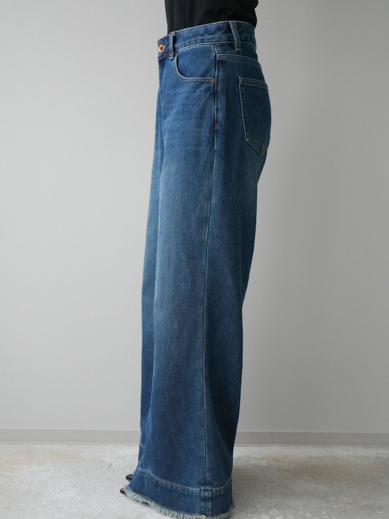 デニムのカジュアルさに、暖かみのある穿き心地を兼ね備えたワイドデニムパンツ。 裏起毛仕様ならではのやさしい肌あたりで、シーズンムードを高めながら快適に着用いただけます。 裾にはさりげないフリンジディテールを施し、シンプルな中にも程よいアクセントをプラス。 ワイドシルエットが自然な落ち感を生み、トップスを選ばずバランスよくスタイリングが決まります。 デイリー使いはもちろん、ニットやアウターと合わせた季節感のあるコーディネートにもおすすめの一本です。