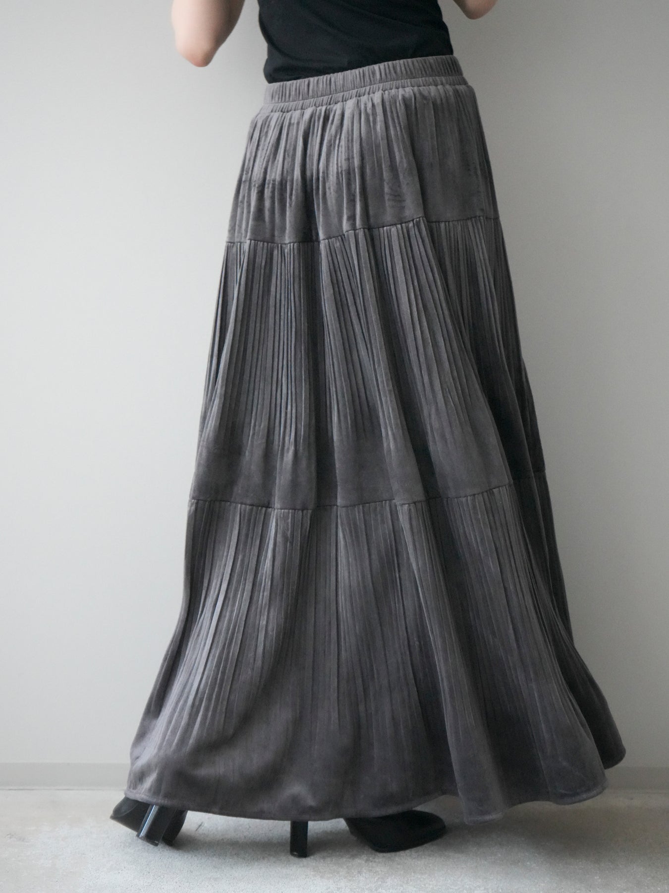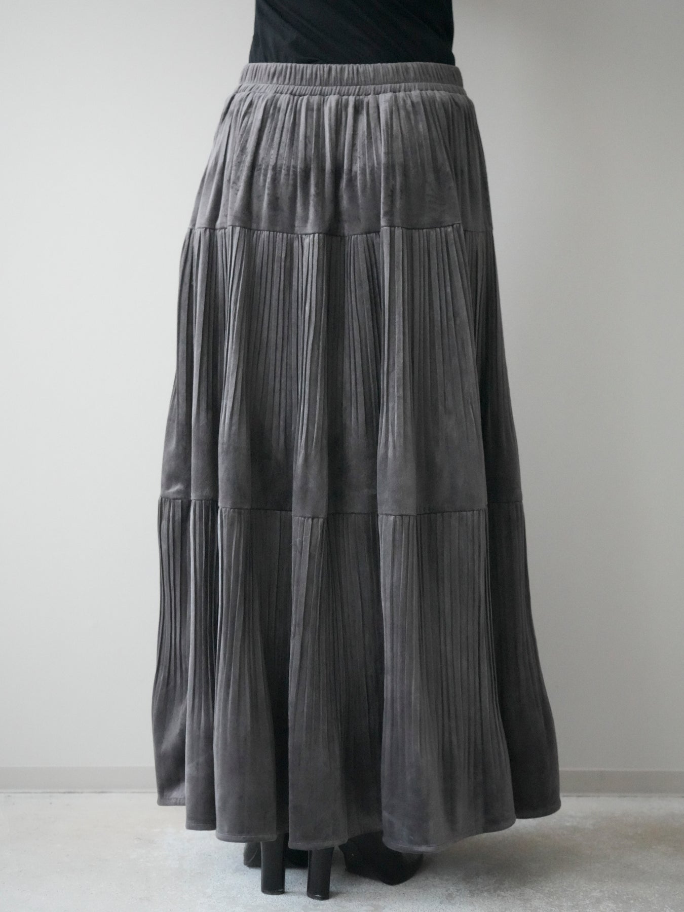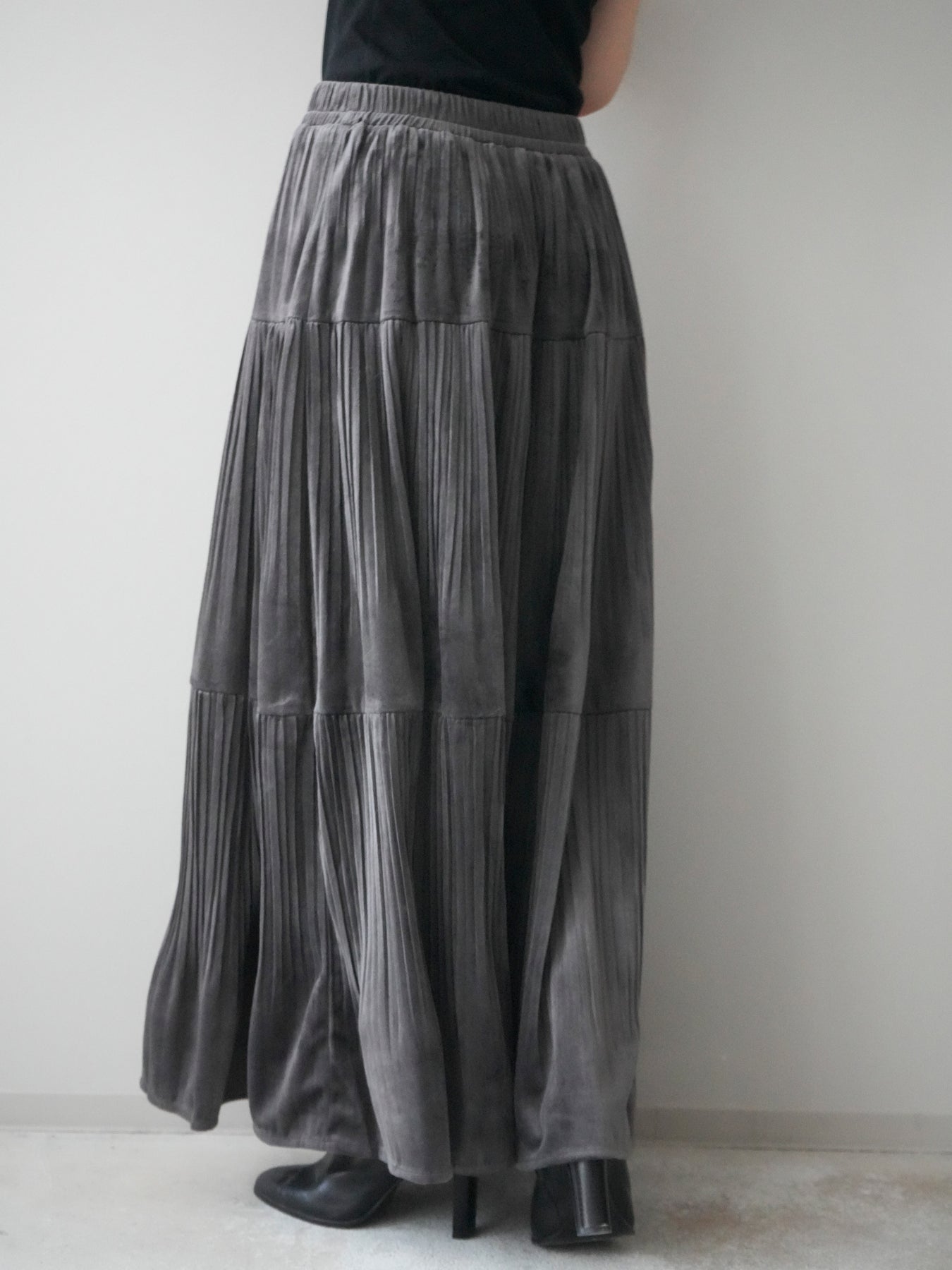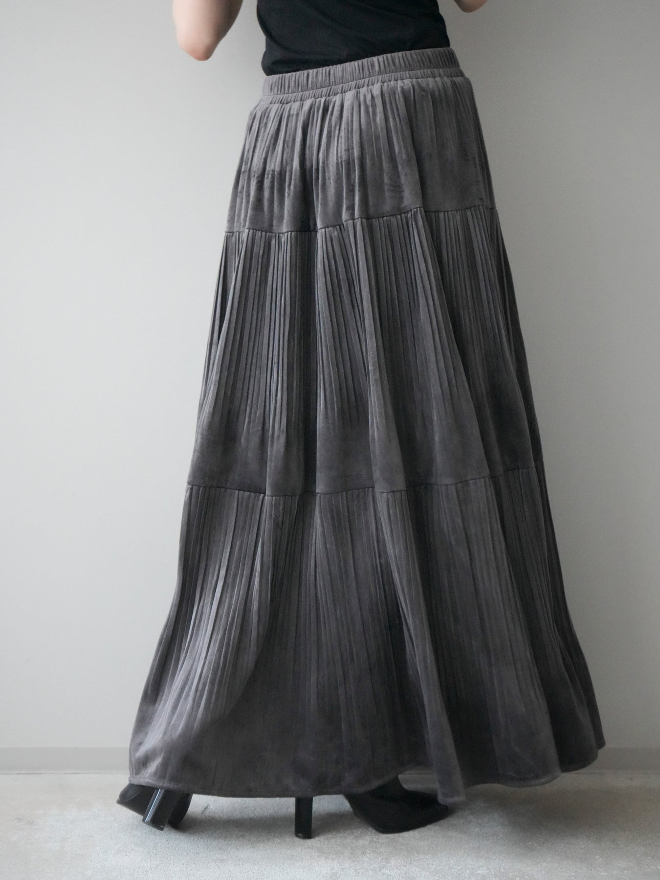 上品な光沢感のあるベロア素材に、ワッシャー加工を施した表情豊かなティアードスカート。 動くたびに陰影が生まれ、シンプルながらも奥行きのあるスタイリングを演出します。 ティアード切り替えによる自然な広がりが、女性らしい柔らかな印象をプラス。 甘くなりすぎない落ち感のあるシルエットで、カジュアルにもきれいめにも馴染みます。 ニットやスウェット、ブラウスなど合わせるトップス次第で幅広い着こなしが可能。 シーズンムードを高めつつ、コーディネートの主役として活躍してくれる一枚です。