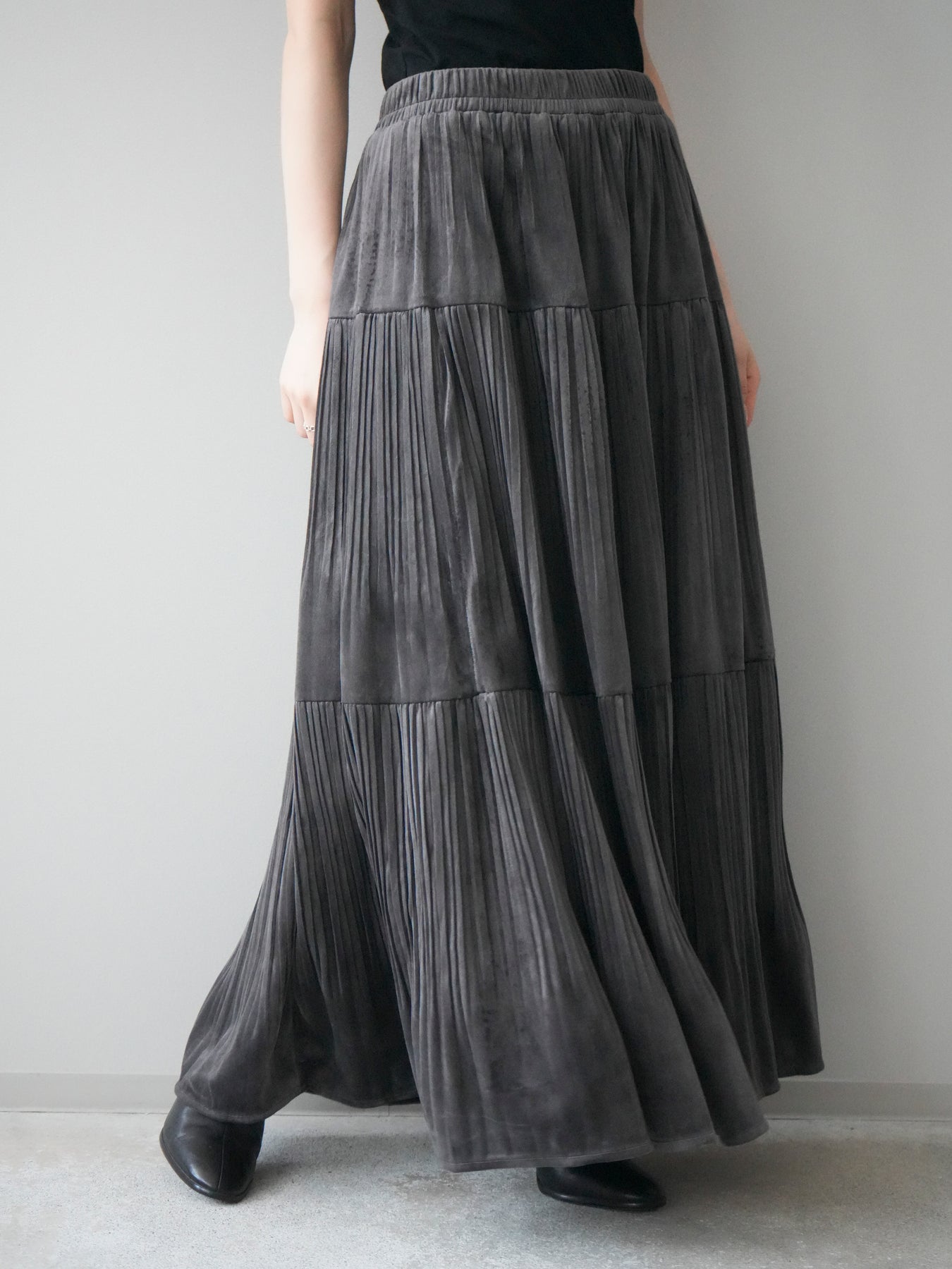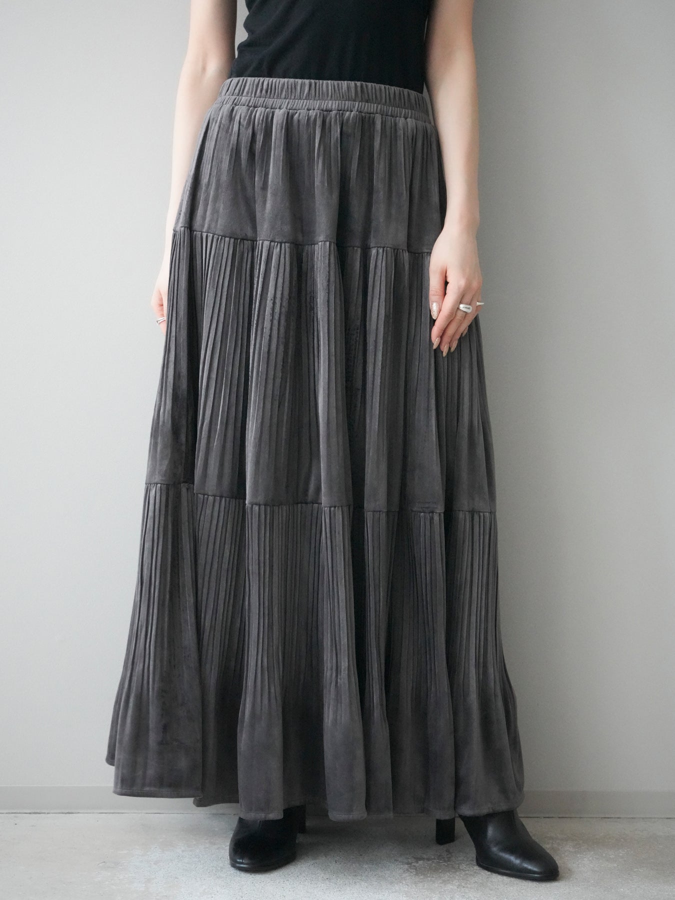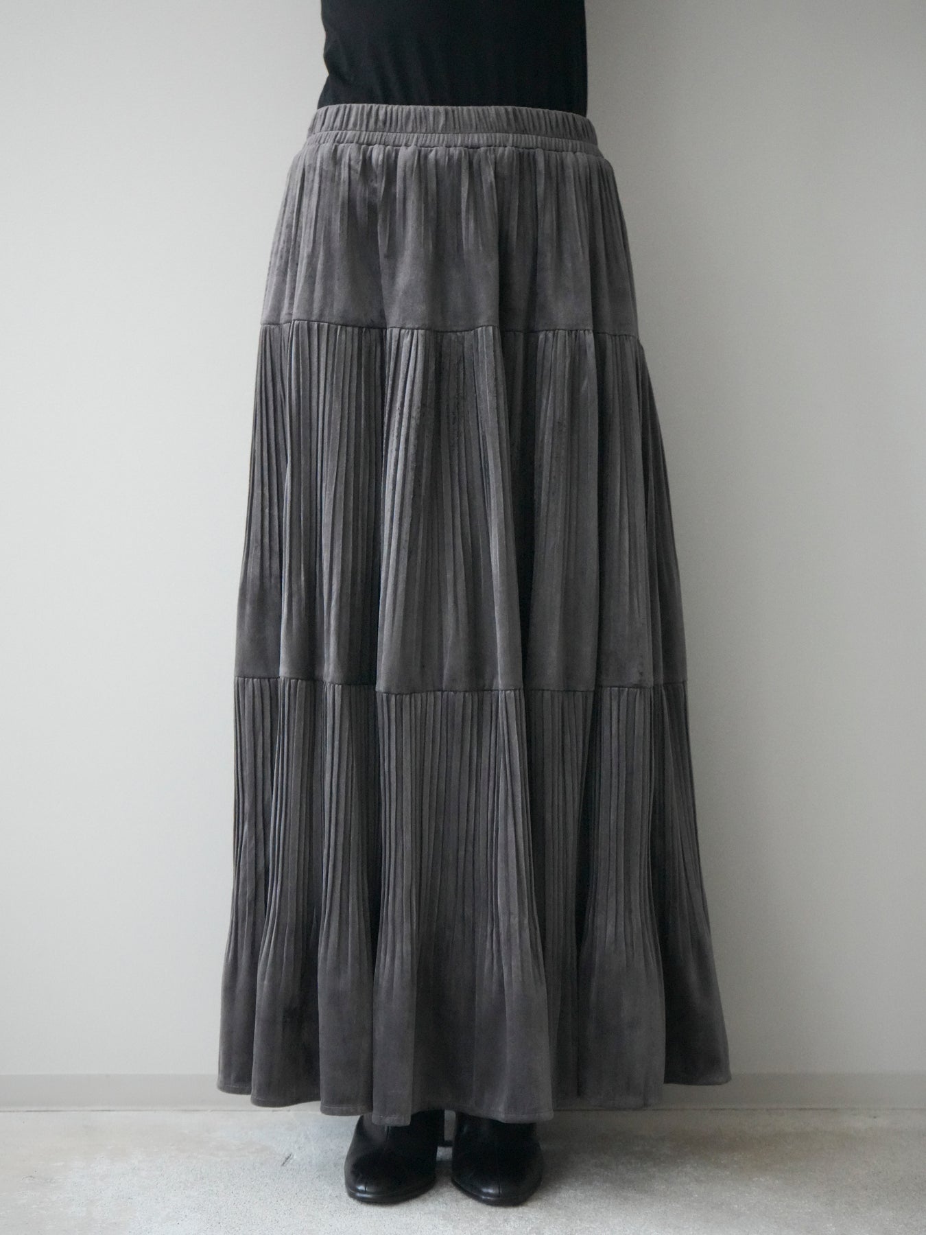 上品な光沢感のあるベロア素材に、ワッシャー加工を施した表情豊かなティアードスカート。 動くたびに陰影が生まれ、シンプルながらも奥行きのあるスタイリングを演出します。 ティアード切り替えによる自然な広がりが、女性らしい柔らかな印象をプラス。 甘くなりすぎない落ち感のあるシルエットで、カジュアルにもきれいめにも馴染みます。 ニットやスウェット、ブラウスなど合わせるトップス次第で幅広い着こなしが可能。 シーズンムードを高めつつ、コーディネートの主役として活躍してくれる一枚です。