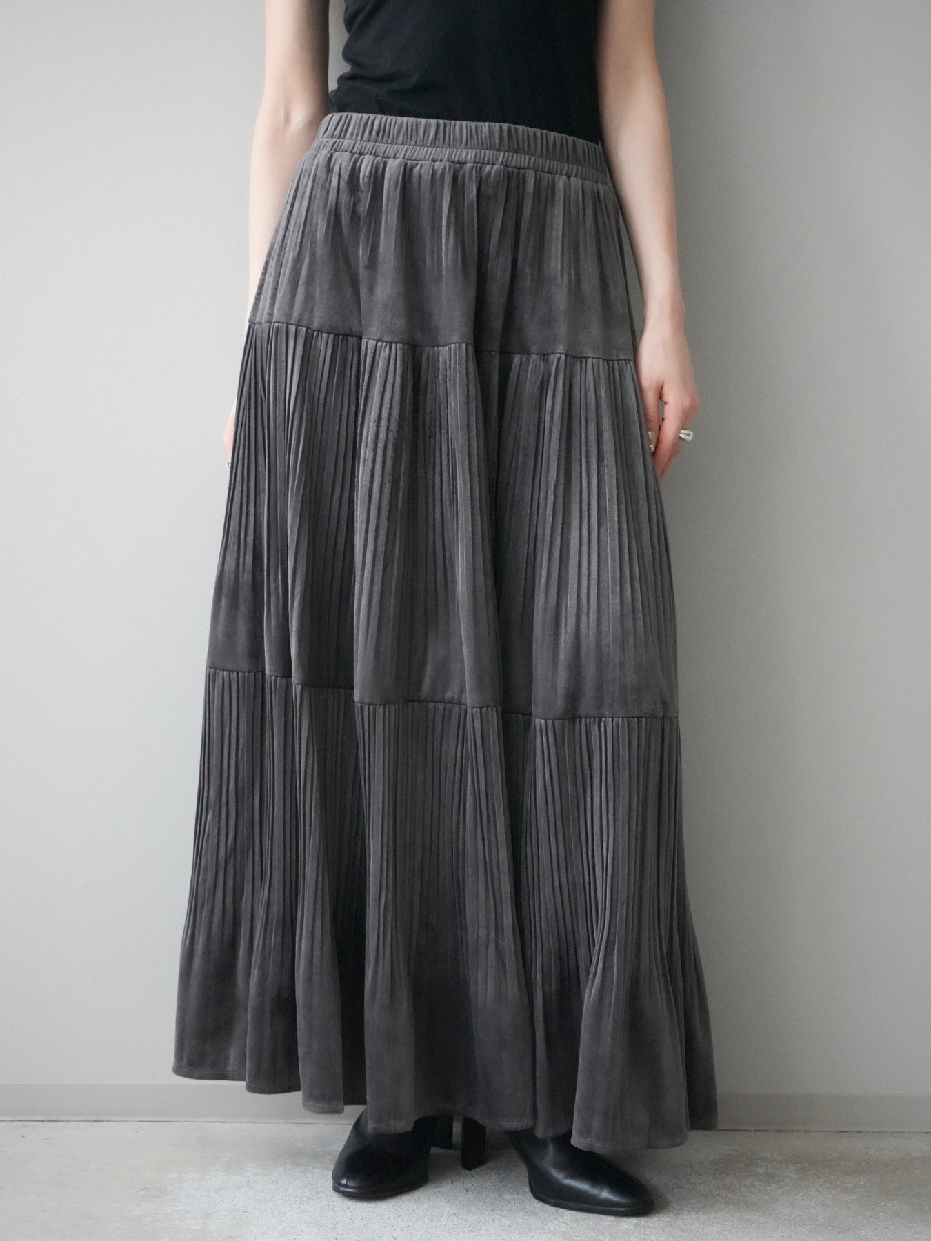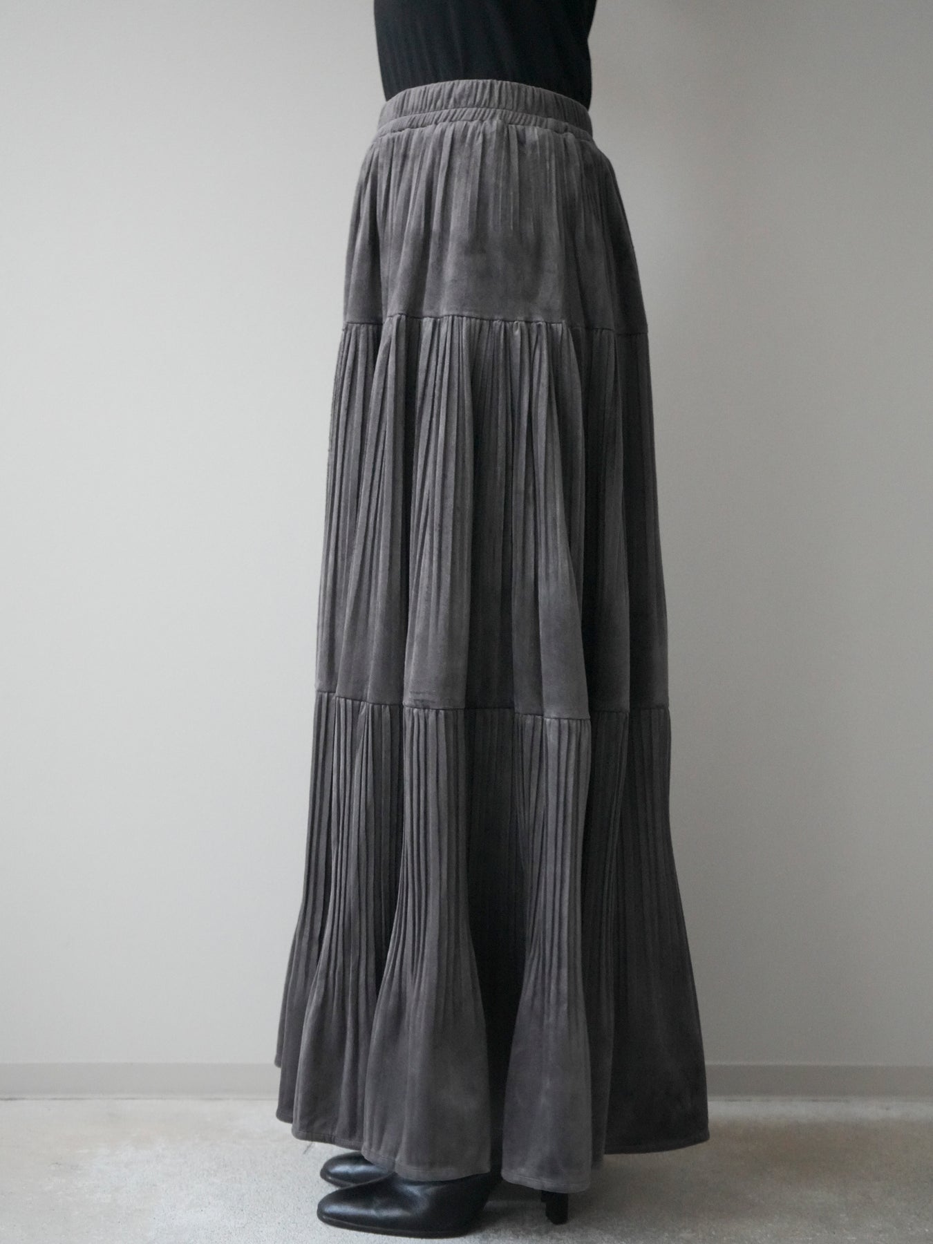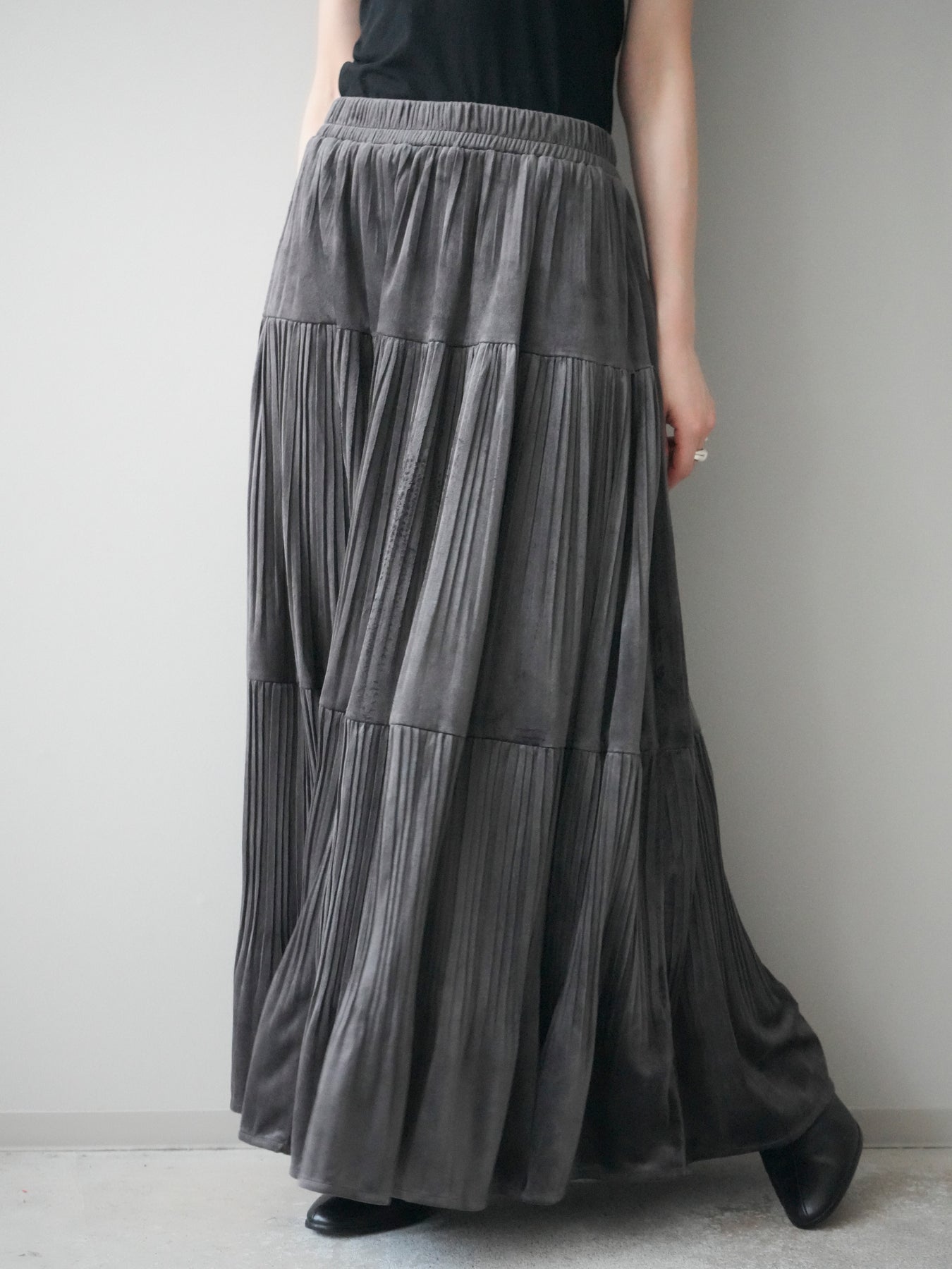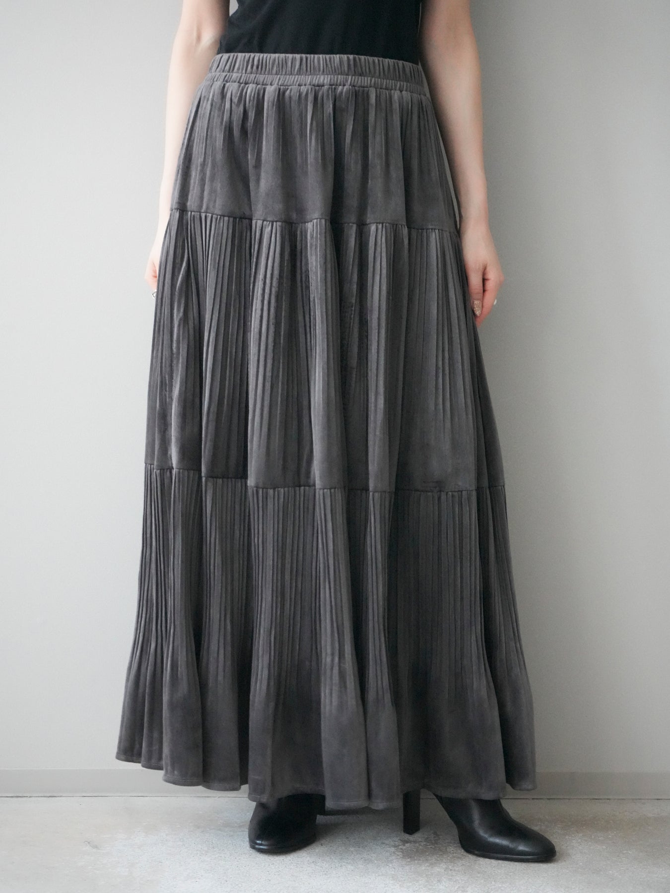 上品な光沢感のあるベロア素材に、ワッシャー加工を施した表情豊かなティアードスカート。 動くたびに陰影が生まれ、シンプルながらも奥行きのあるスタイリングを演出します。 ティアード切り替えによる自然な広がりが、女性らしい柔らかな印象をプラス。 甘くなりすぎない落ち感のあるシルエットで、カジュアルにもきれいめにも馴染みます。 ニットやスウェット、ブラウスなど合わせるトップス次第で幅広い着こなしが可能。 シーズンムードを高めつつ、コーディネートの主役として活躍してくれる一枚です。