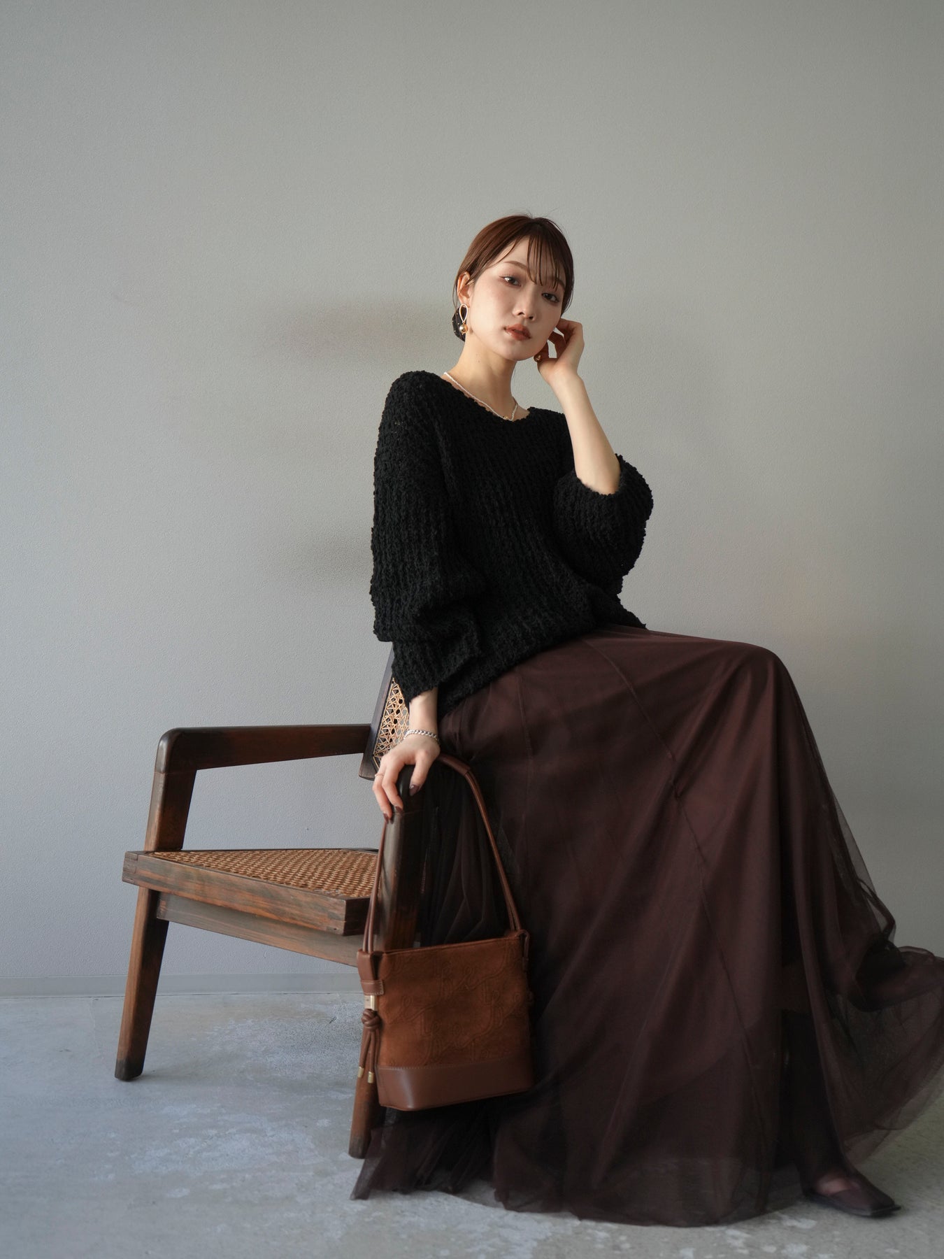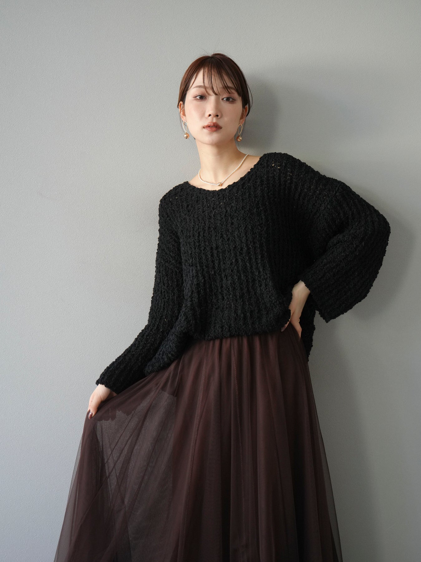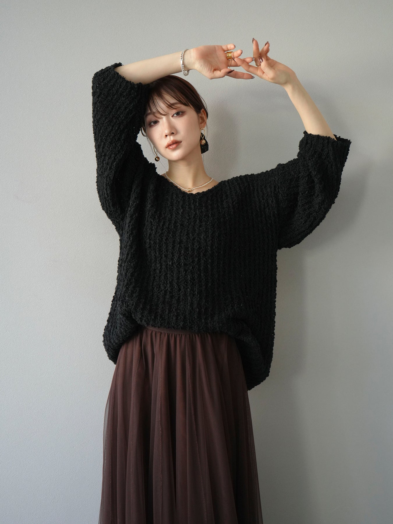 立体感のあるポコポコとした編地が特徴のVネックニットプルオーバー。ざっくりとした編み目が程よい抜け感を演出し、シンプルながらも存在感のある一枚です。ドロップショルダーのリラックスシルエットで、ゆったりとした着心地ながら女性らしいバランスに。首元のVネックが顔まわりをすっきり見せ、シャツやタートルを重ねたレイヤードも楽しめます。デイリー使いはもちろん、こなれたスタイリングにもぴったりな万能ニットです。
