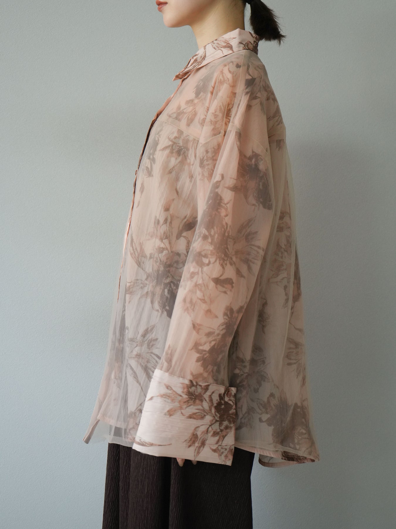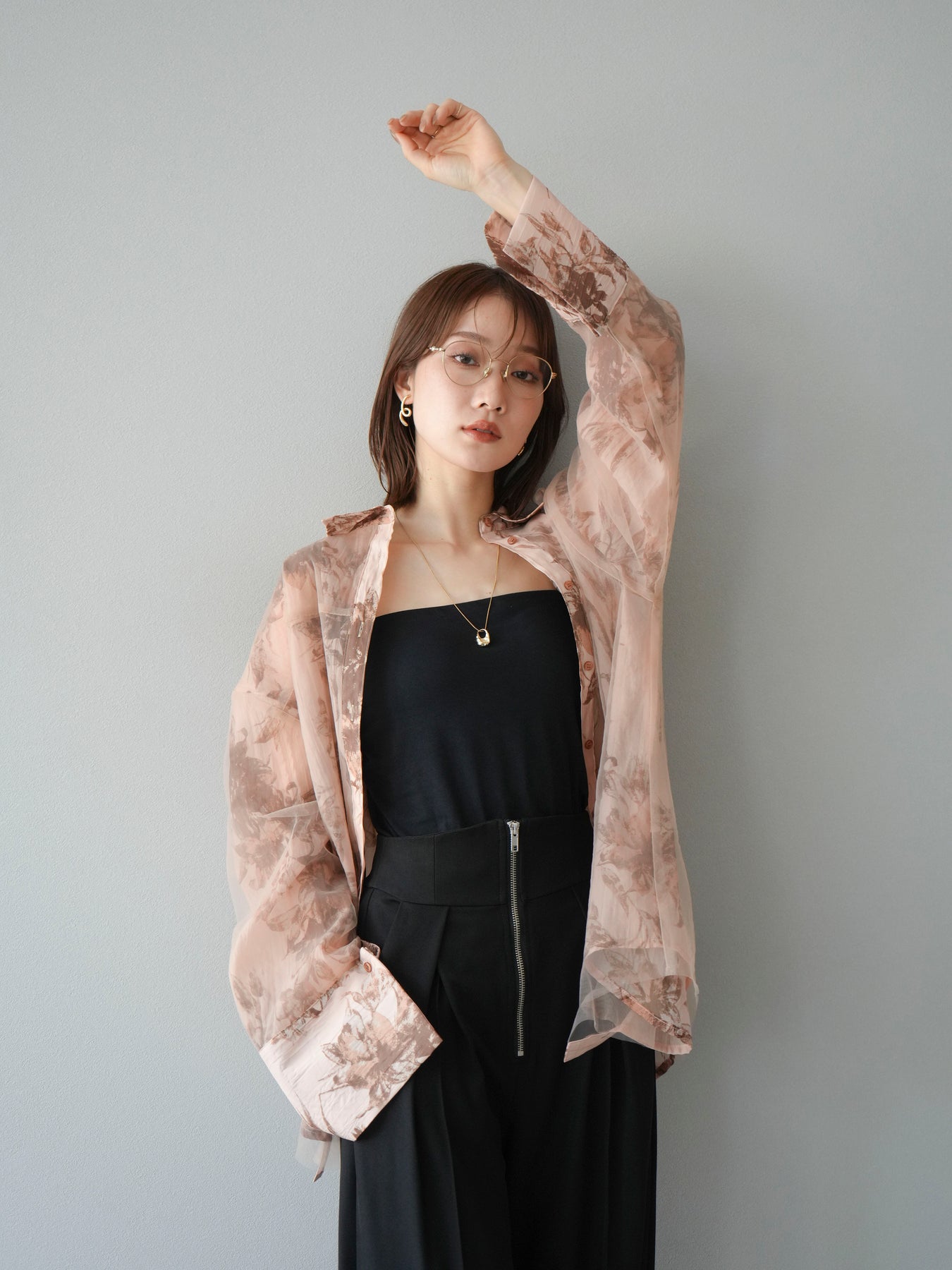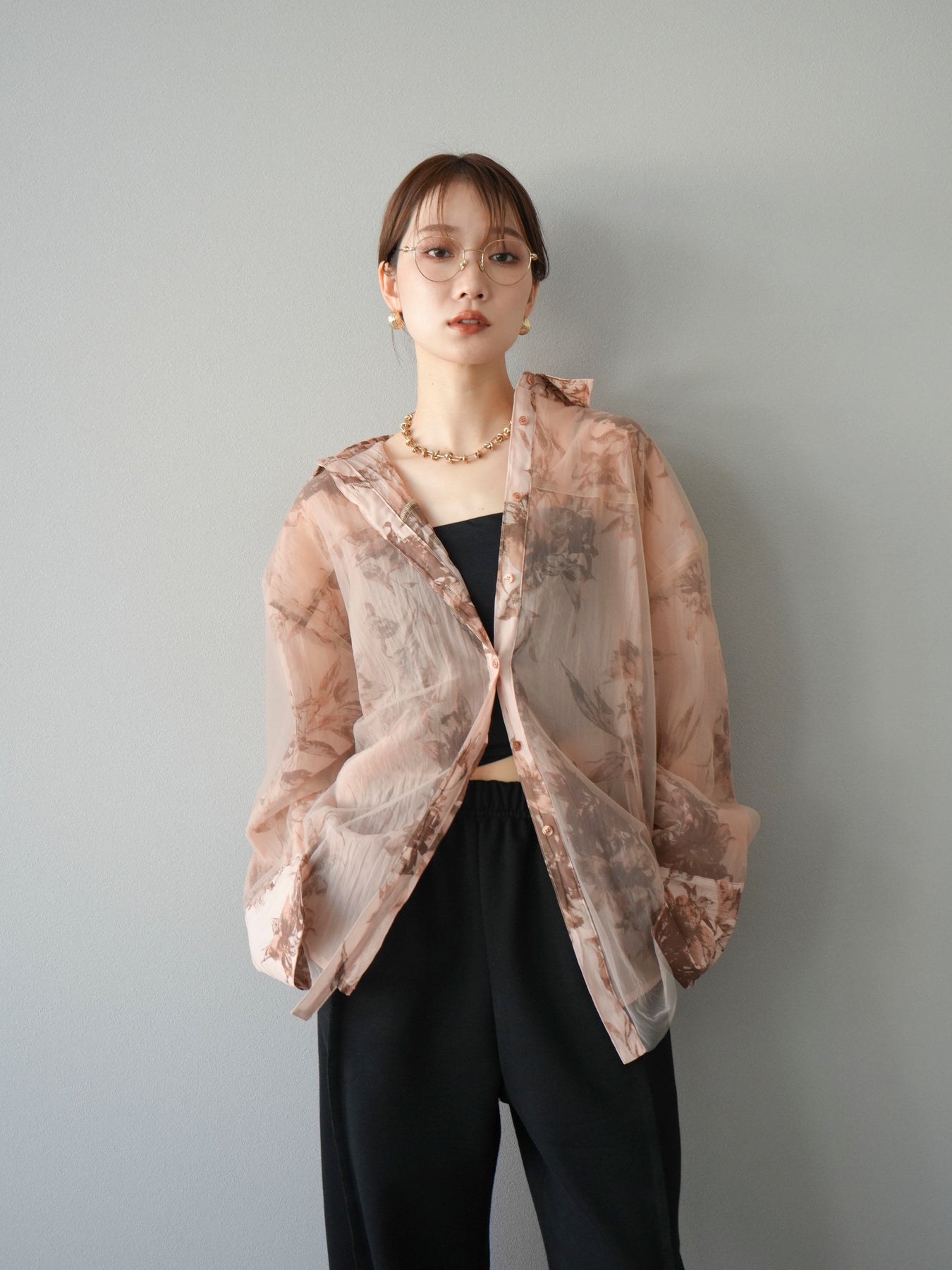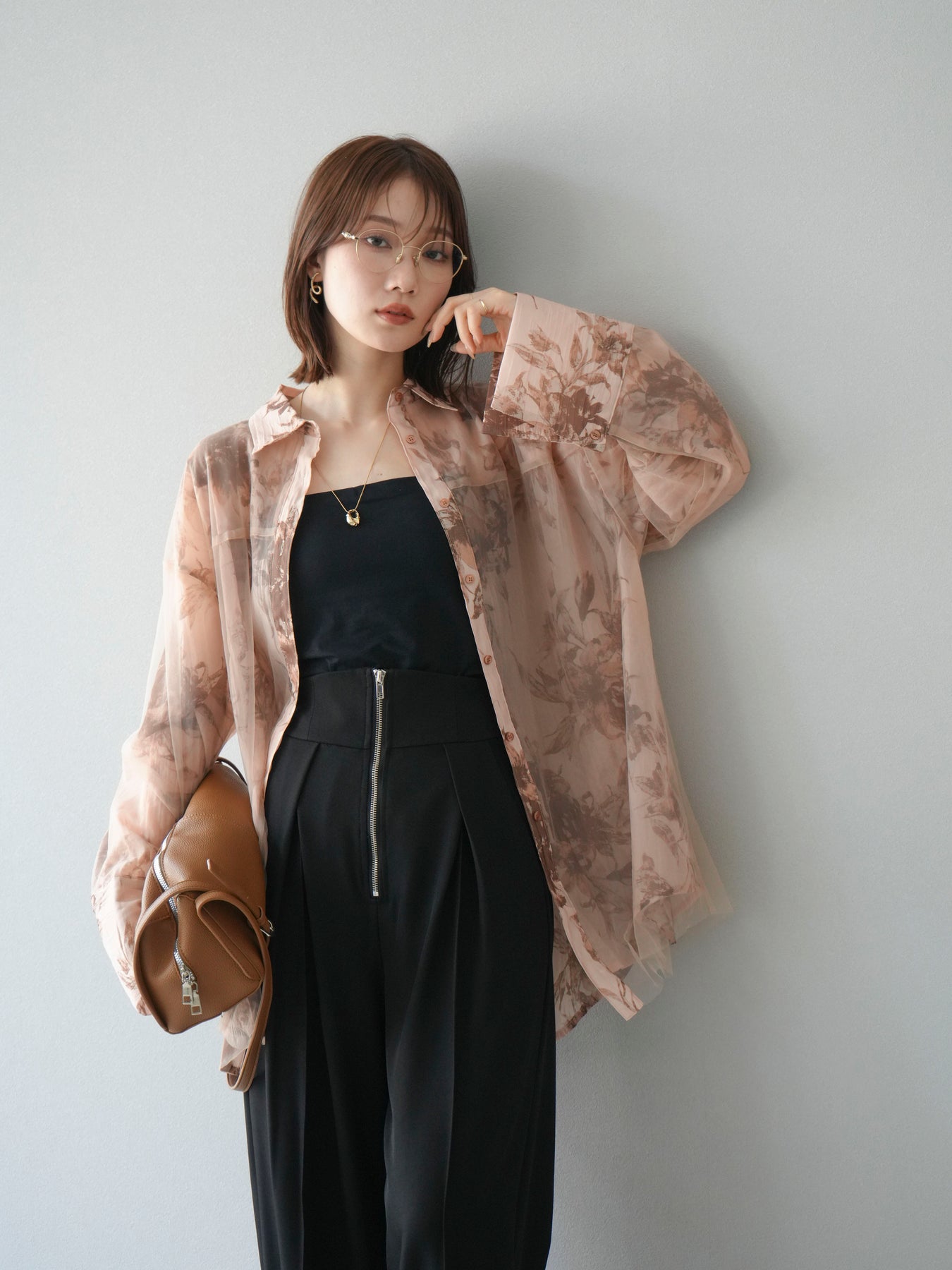 透け感のある軽やかなチュールと繊細なフラワー柄を組み合わせたオーバーサイズシャツ。柔らかな風合いと程よい光沢感が上品さを演出します。ゆったりとしたシルエットとドロップショルダーで抜け感をプラスし、羽織りとしても一枚着としても活躍。袖口のワイドカフスが手元を華奢に見せ、シンプルなボトムと合わせるだけで大人フェミニンな着こなしが完成します。 ※ボトムス、キャミソール(インナー)以外の商品は一律でインナーは付属していません