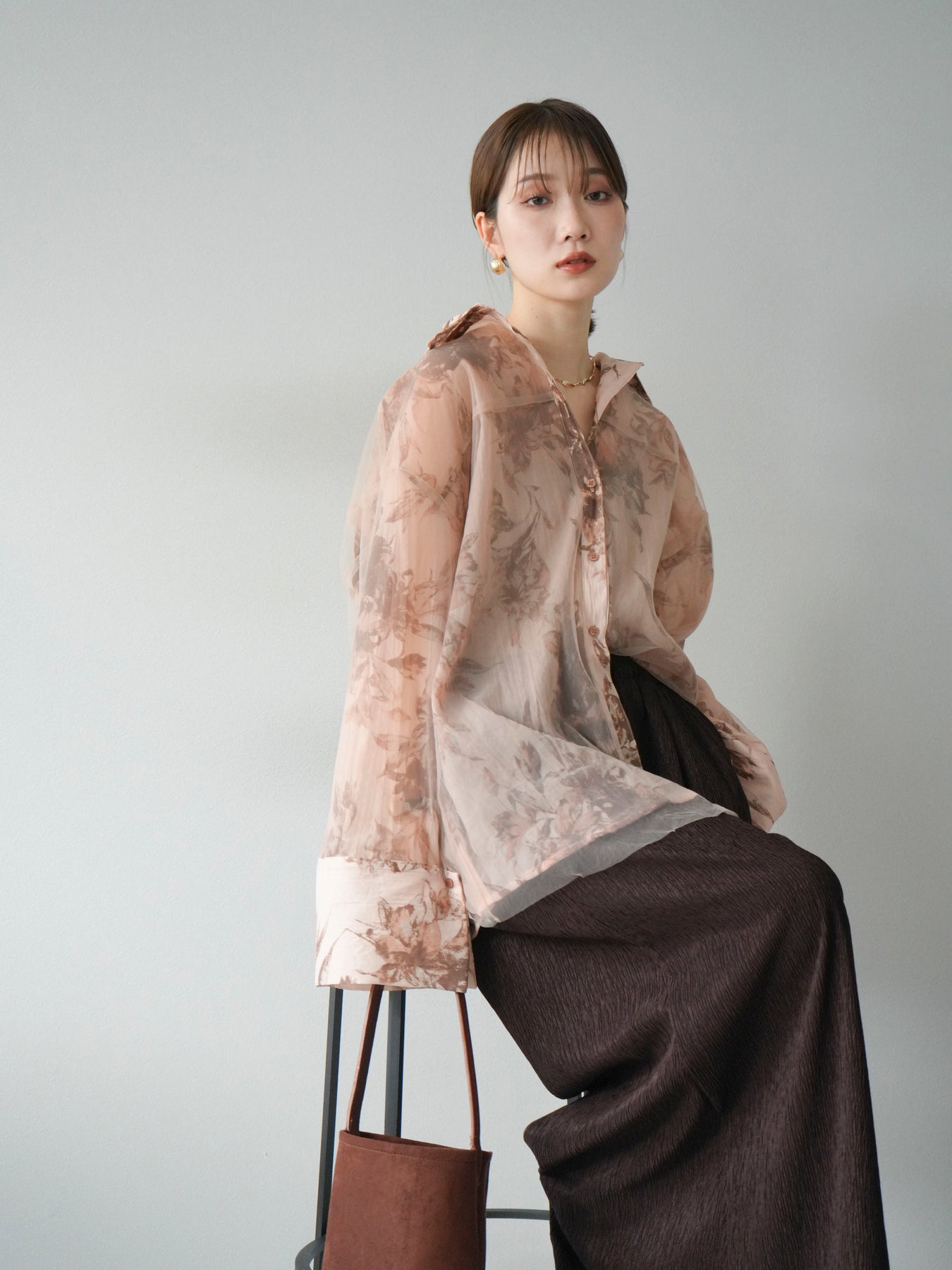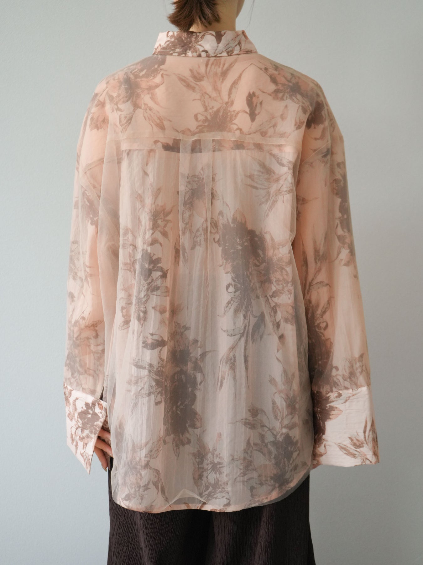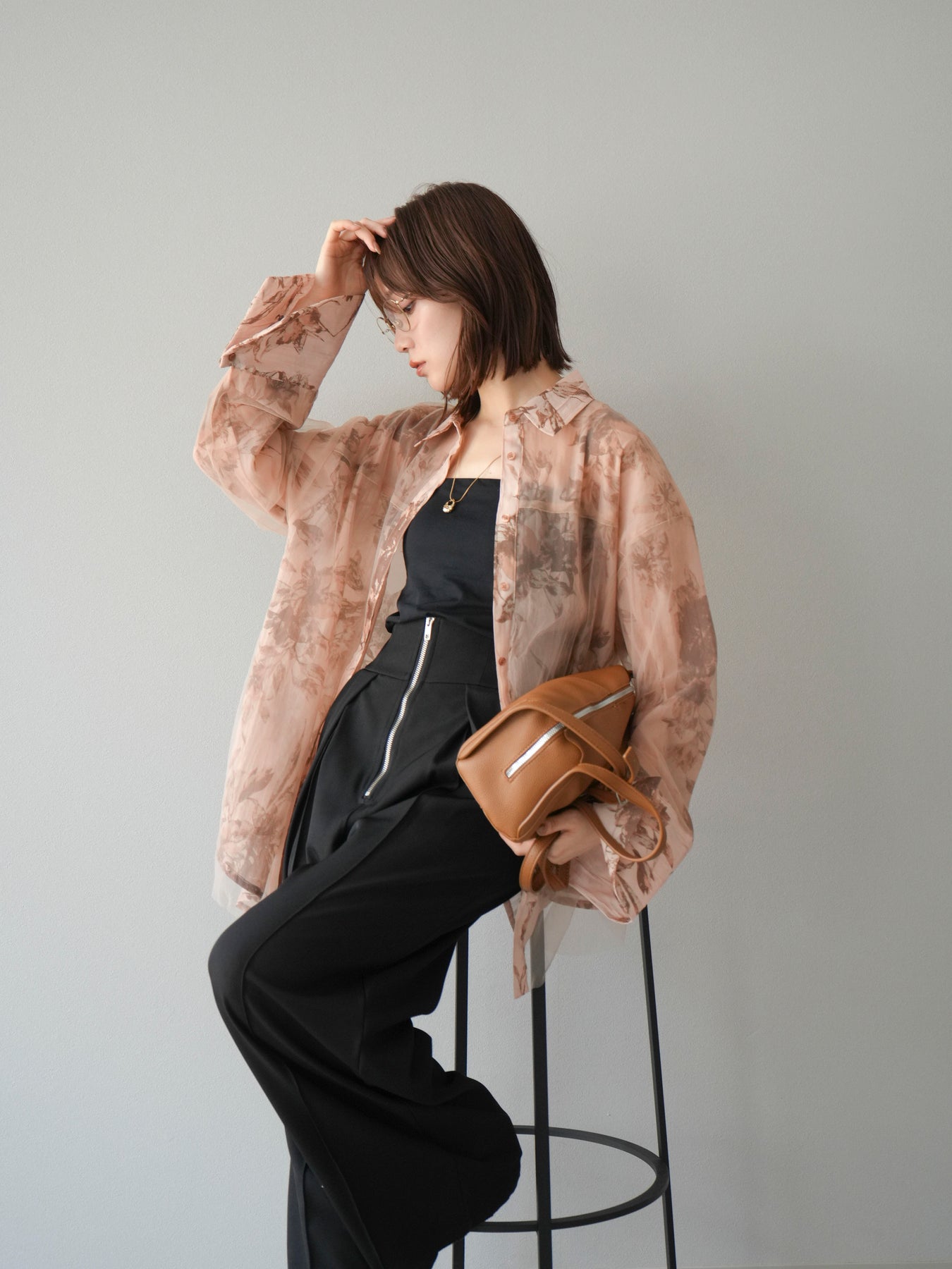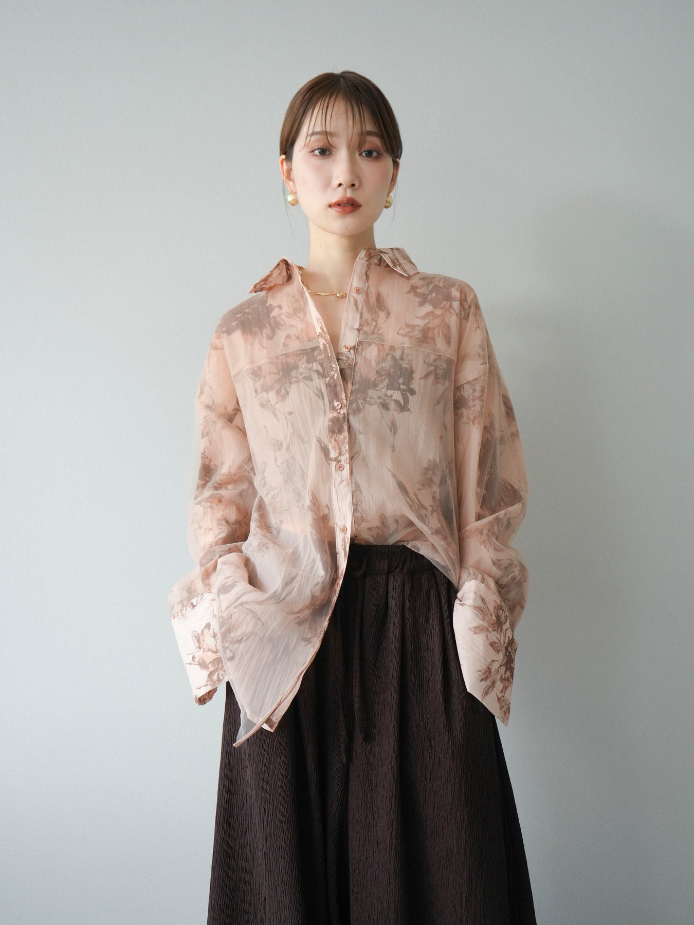 透け感のある軽やかなチュールと繊細なフラワー柄を組み合わせたオーバーサイズシャツ。柔らかな風合いと程よい光沢感が上品さを演出します。ゆったりとしたシルエットとドロップショルダーで抜け感をプラスし、羽織りとしても一枚着としても活躍。袖口のワイドカフスが手元を華奢に見せ、シンプルなボトムと合わせるだけで大人フェミニンな着こなしが完成します。 ※ボトムス、キャミソール(インナー)以外の商品は一律でインナーは付属していません