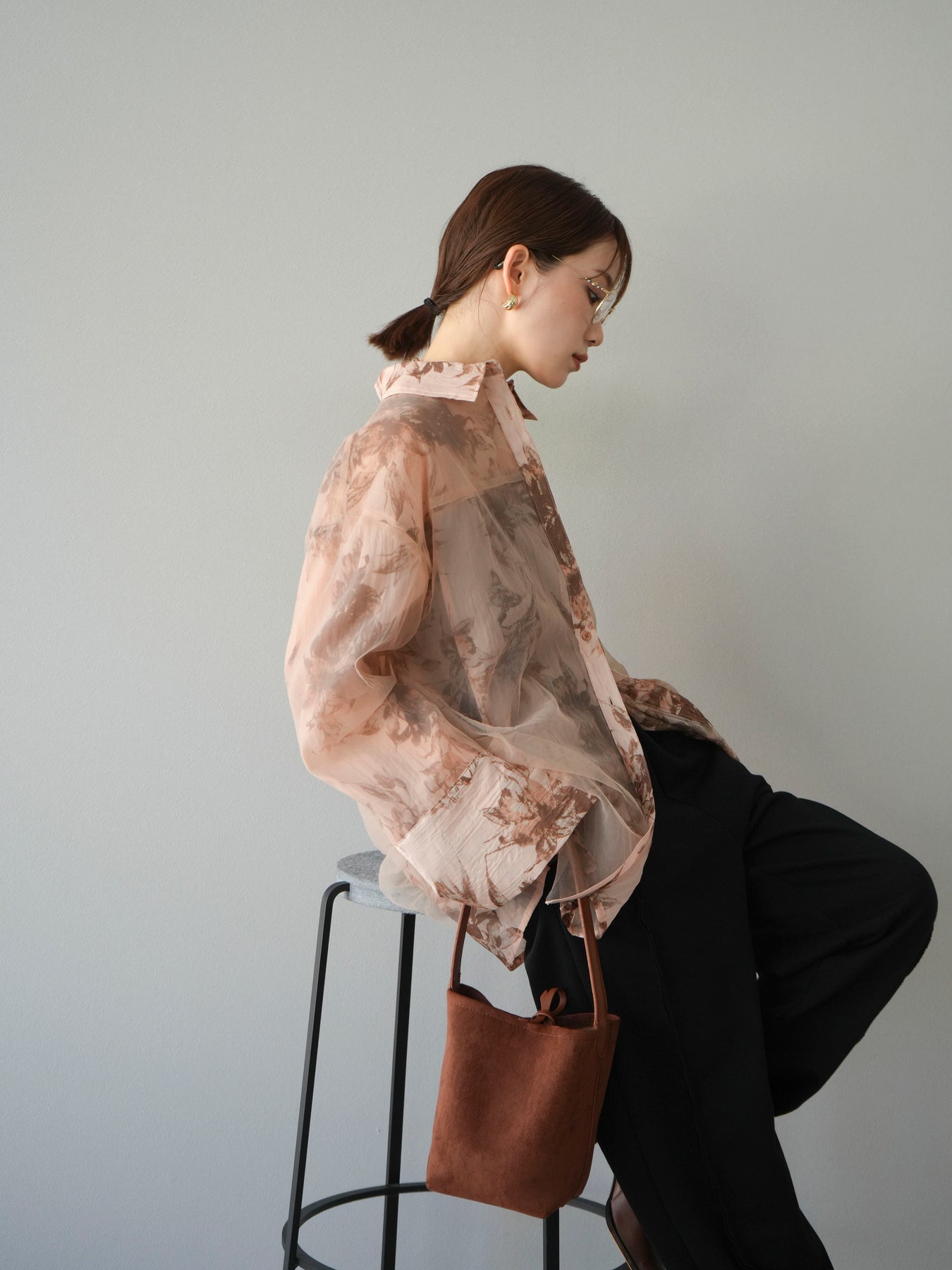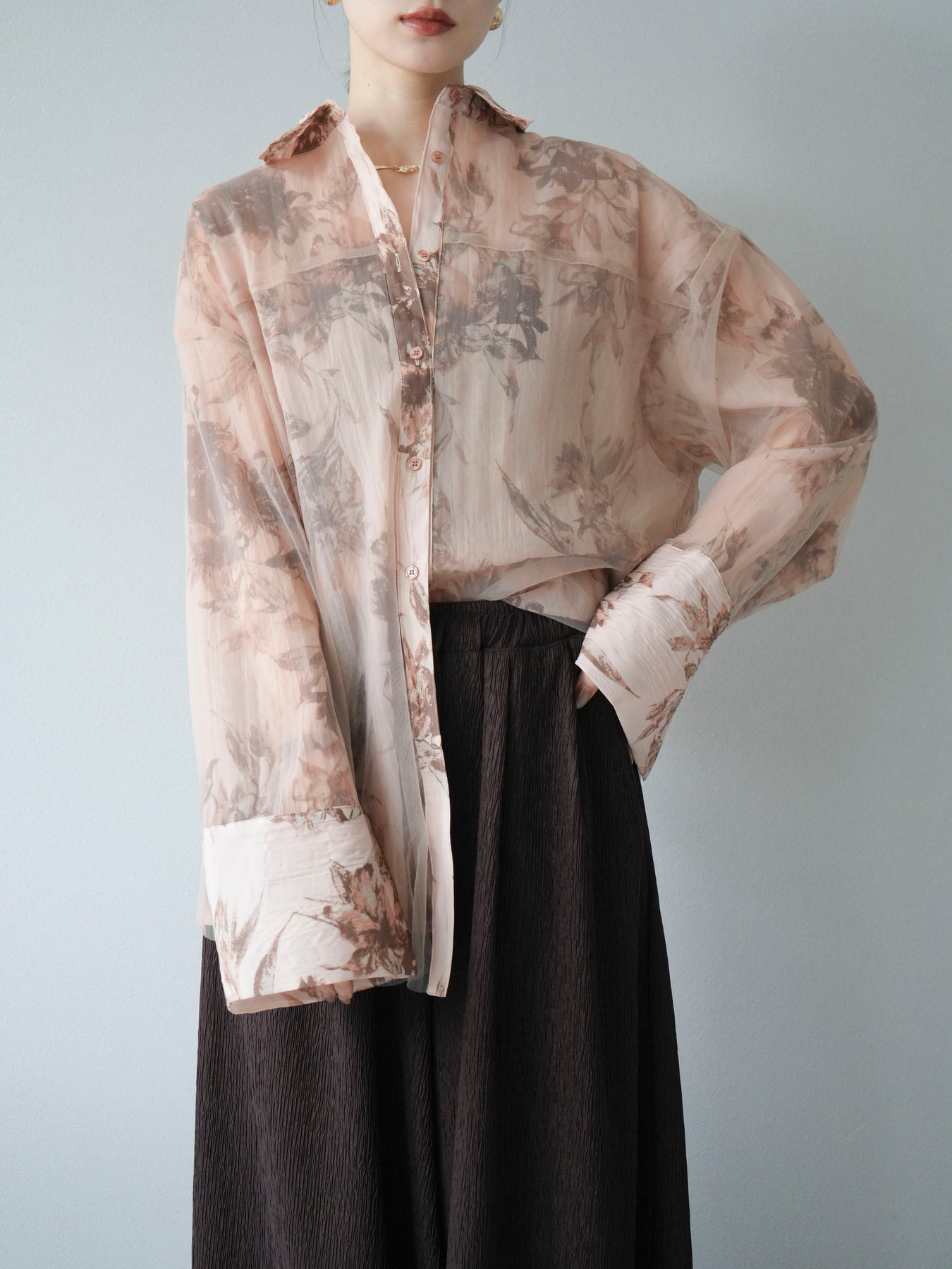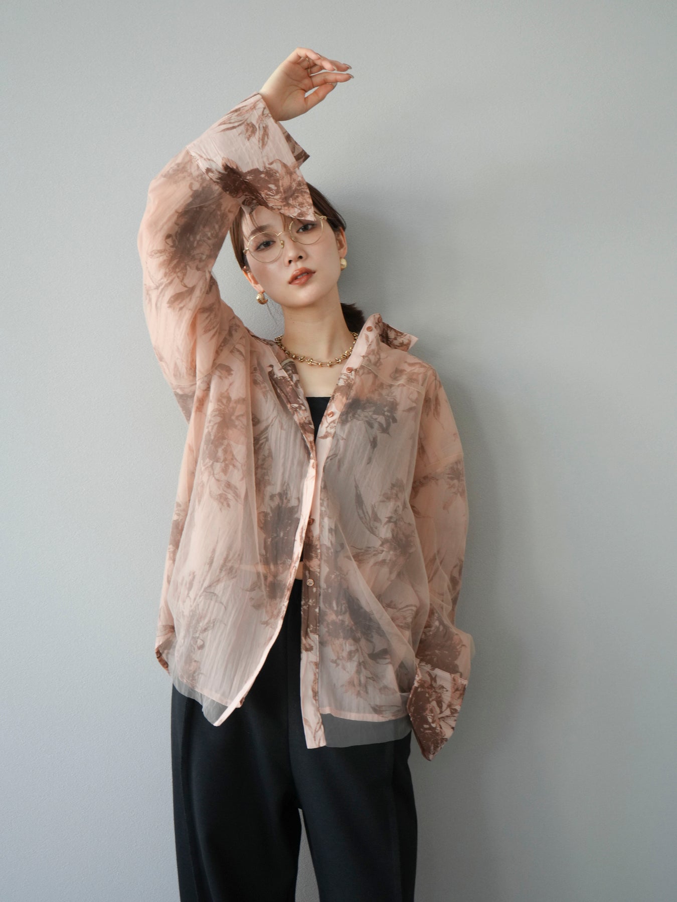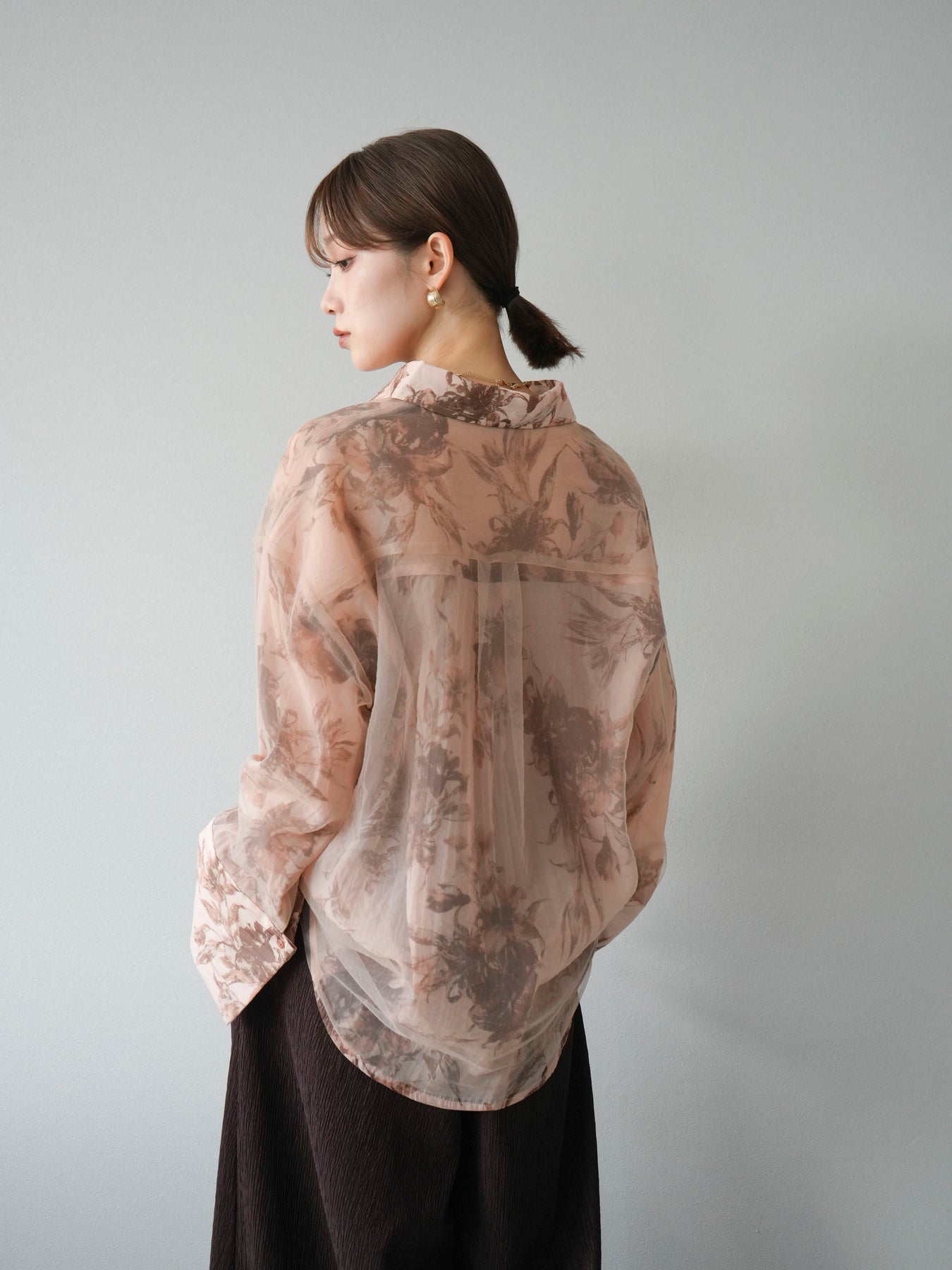 透け感のある軽やかなチュールと繊細なフラワー柄を組み合わせたオーバーサイズシャツ。柔らかな風合いと程よい光沢感が上品さを演出します。ゆったりとしたシルエットとドロップショルダーで抜け感をプラスし、羽織りとしても一枚着としても活躍。袖口のワイドカフスが手元を華奢に見せ、シンプルなボトムと合わせるだけで大人フェミニンな着こなしが完成します。 ※ボトムス、キャミソール(インナー)以外の商品は一律でインナーは付属していません