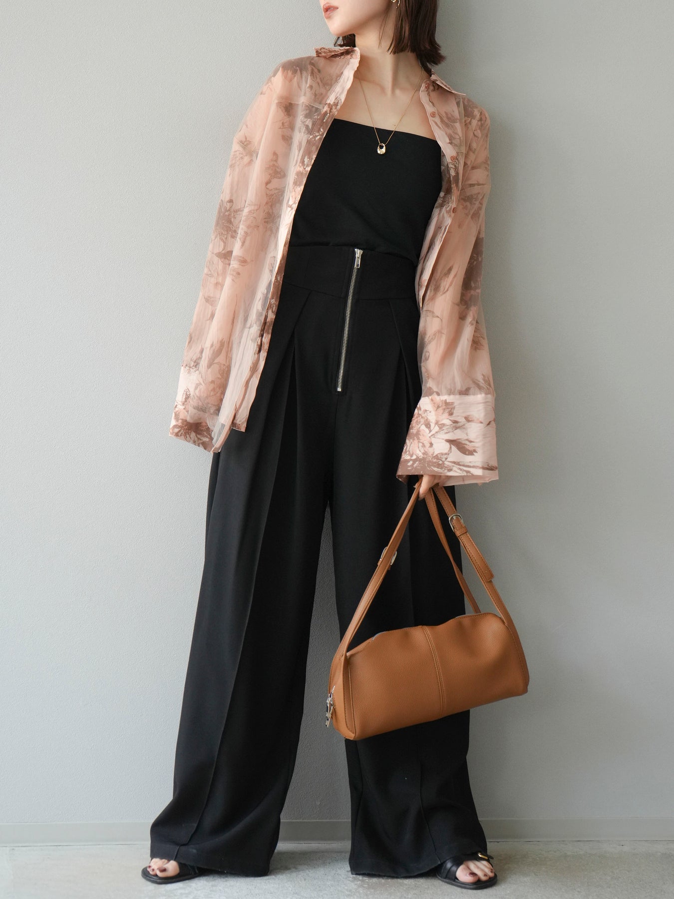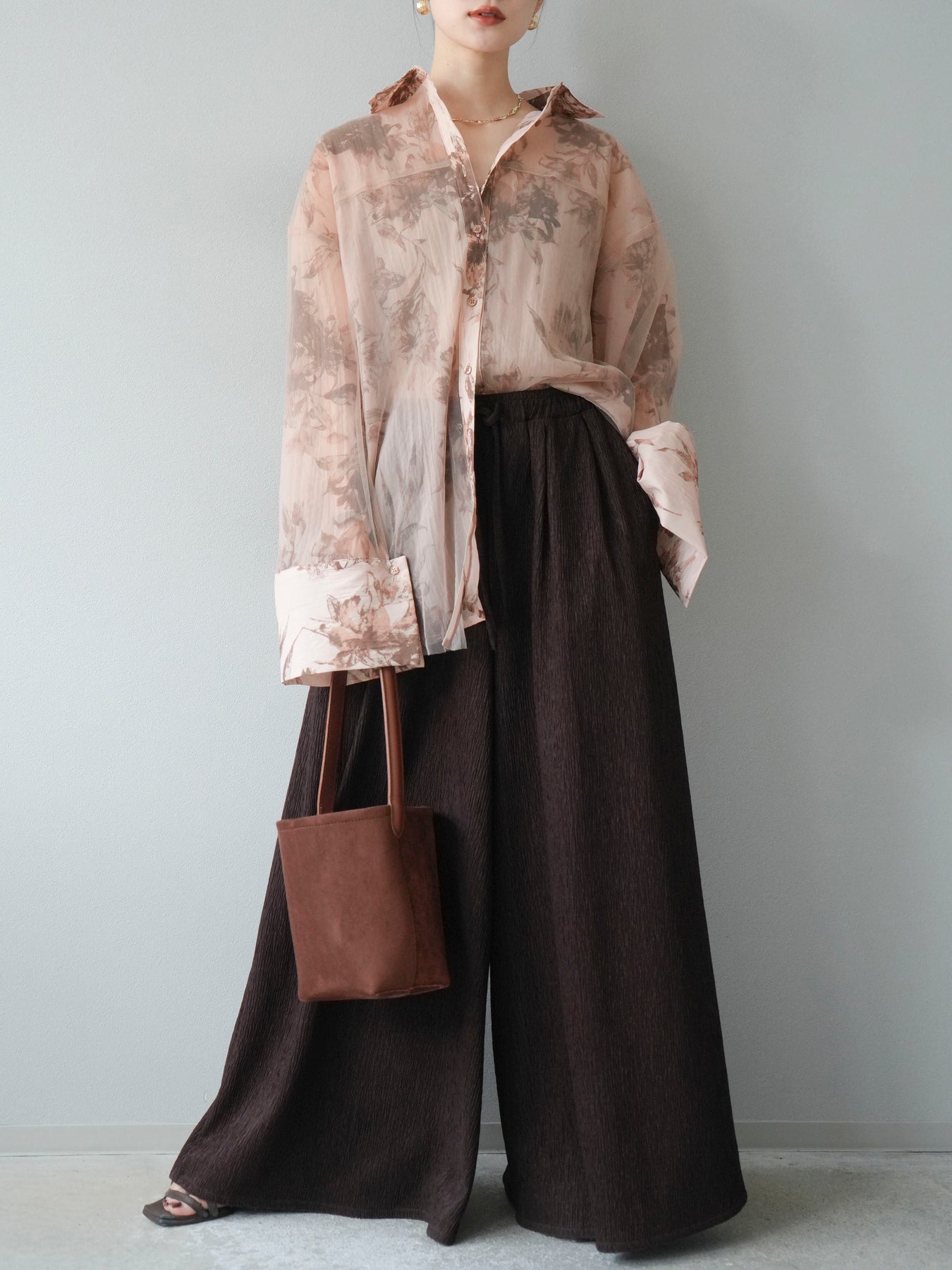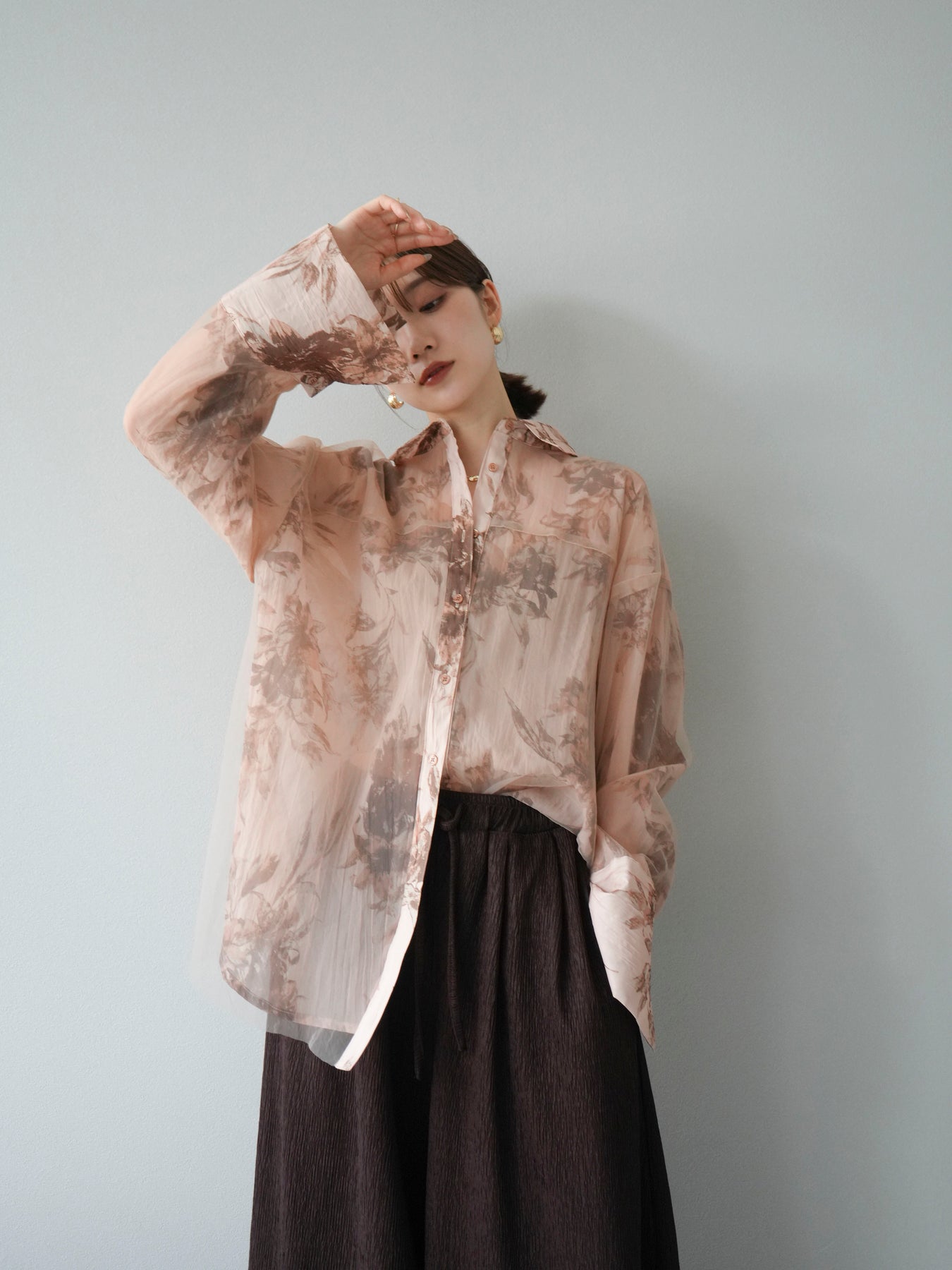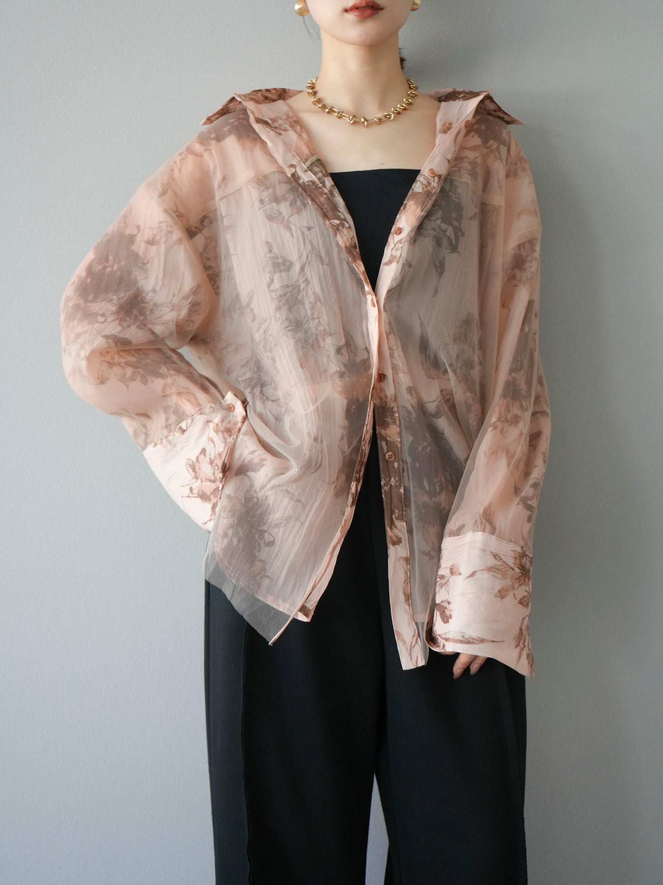 透け感のある軽やかなチュールと繊細なフラワー柄を組み合わせたオーバーサイズシャツ。柔らかな風合いと程よい光沢感が上品さを演出します。ゆったりとしたシルエットとドロップショルダーで抜け感をプラスし、羽織りとしても一枚着としても活躍。袖口のワイドカフスが手元を華奢に見せ、シンプルなボトムと合わせるだけで大人フェミニンな着こなしが完成します。 ※ボトムス、キャミソール(インナー)以外の商品は一律でインナーは付属していません