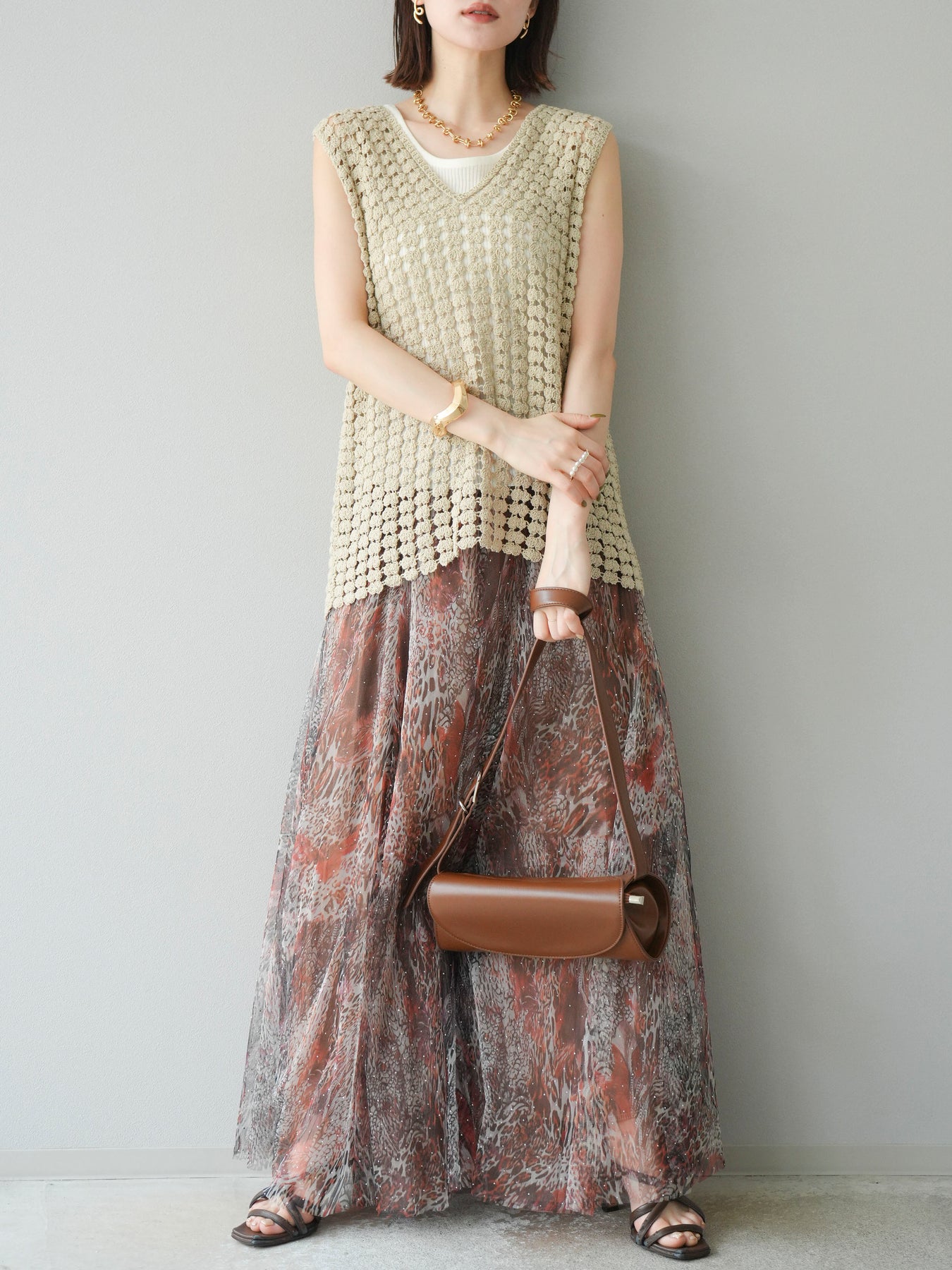 幻想的なニュアンス柄プリントに、繊細なチュールを重ねたレイヤードプリーツスカート。動くたびにふわりと揺れるシアー感が美しく、コーディネートに透明感と奥行きを与えてくれる一枚です。 ウエストはゴム仕様でストレスフリーな着心地ながら、ウエストラインをすっきり見せる仕様に。シンプルなトップスを合わせるだけで華やかなスタイリングが完成します。 デイリーはもちろん、お出かけや特別な日にも活躍する、存在感のある主役スカートです。