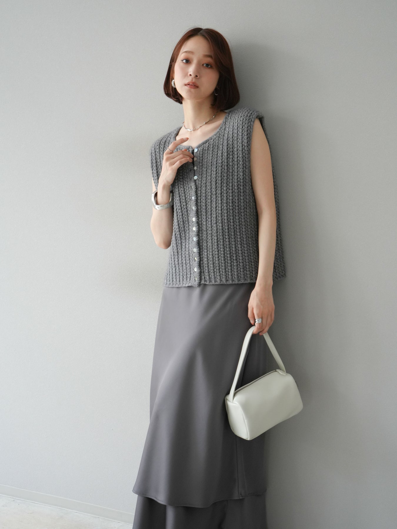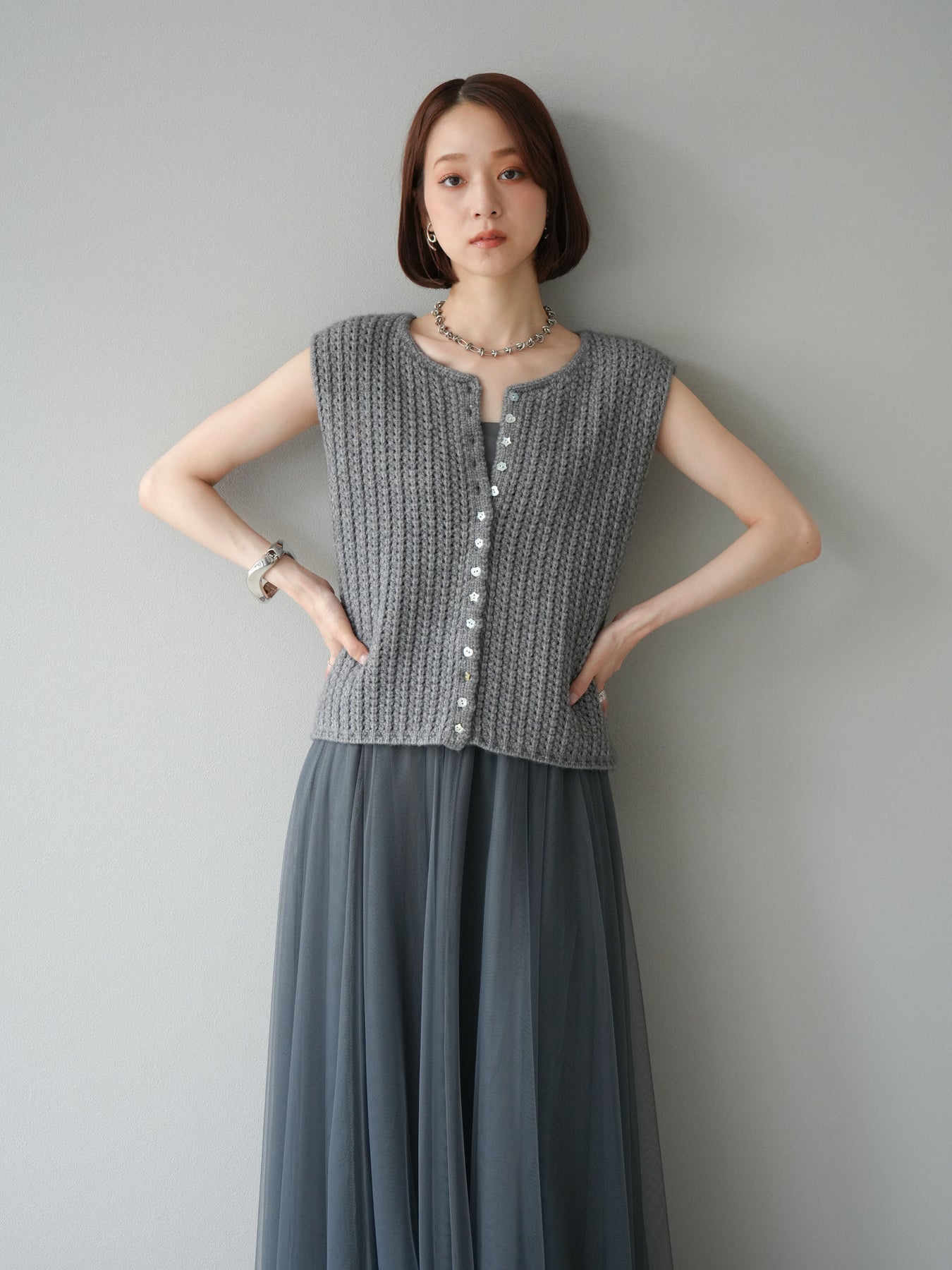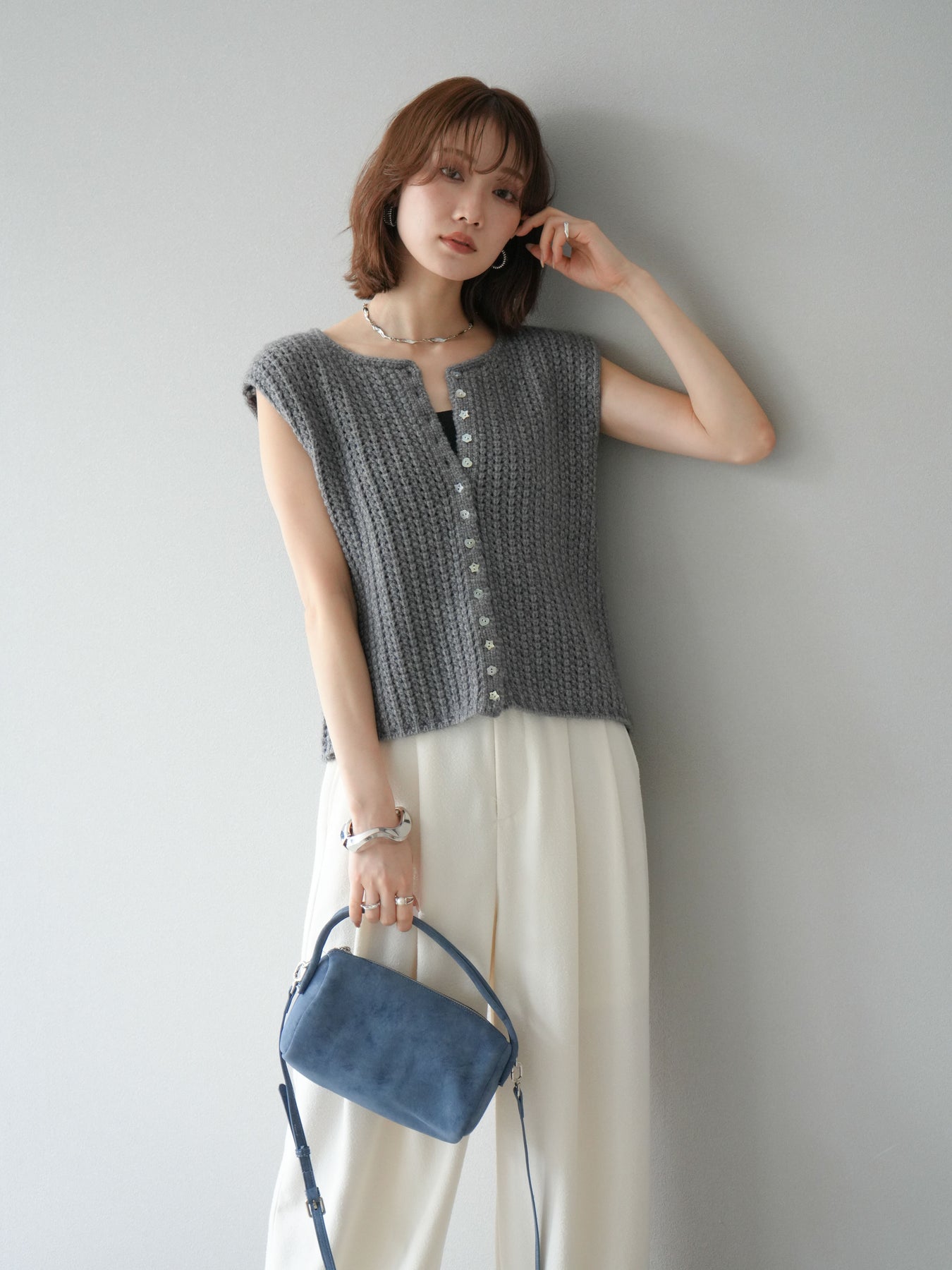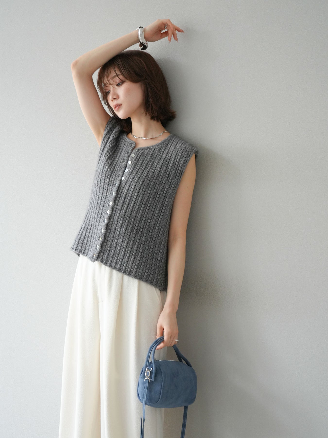 立体感のある編地に、遊び心のあるランダムボタンをあしらったニットベスト。シンプルなシルエットに個性的なディテールを加えることで、羽織るだけでスタイリングの主役になる一枚です。程よい厚みで体のラインを拾いにくく、コンパクトな丈感がボトムスとのバランスを取りやすいデザイン。シャツやカットソーに重ねてレイヤードを楽しんだり、ボタンを留めてトップス風に着こなすことも可能です。カジュアルからきれいめまで幅広く対応でき、季節を問わず活躍する万能アイテムです。 ※ボトムス、キャミソール(インナー)以外の商品は一律でインナーは付属していません。