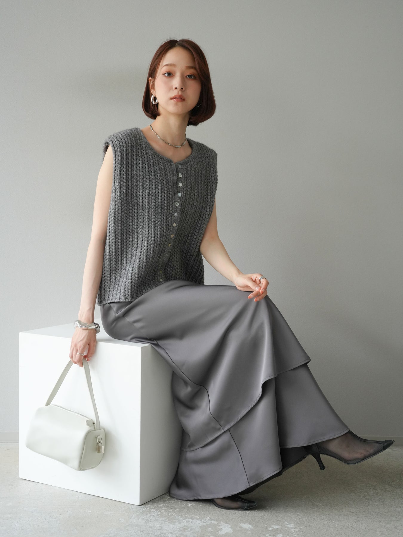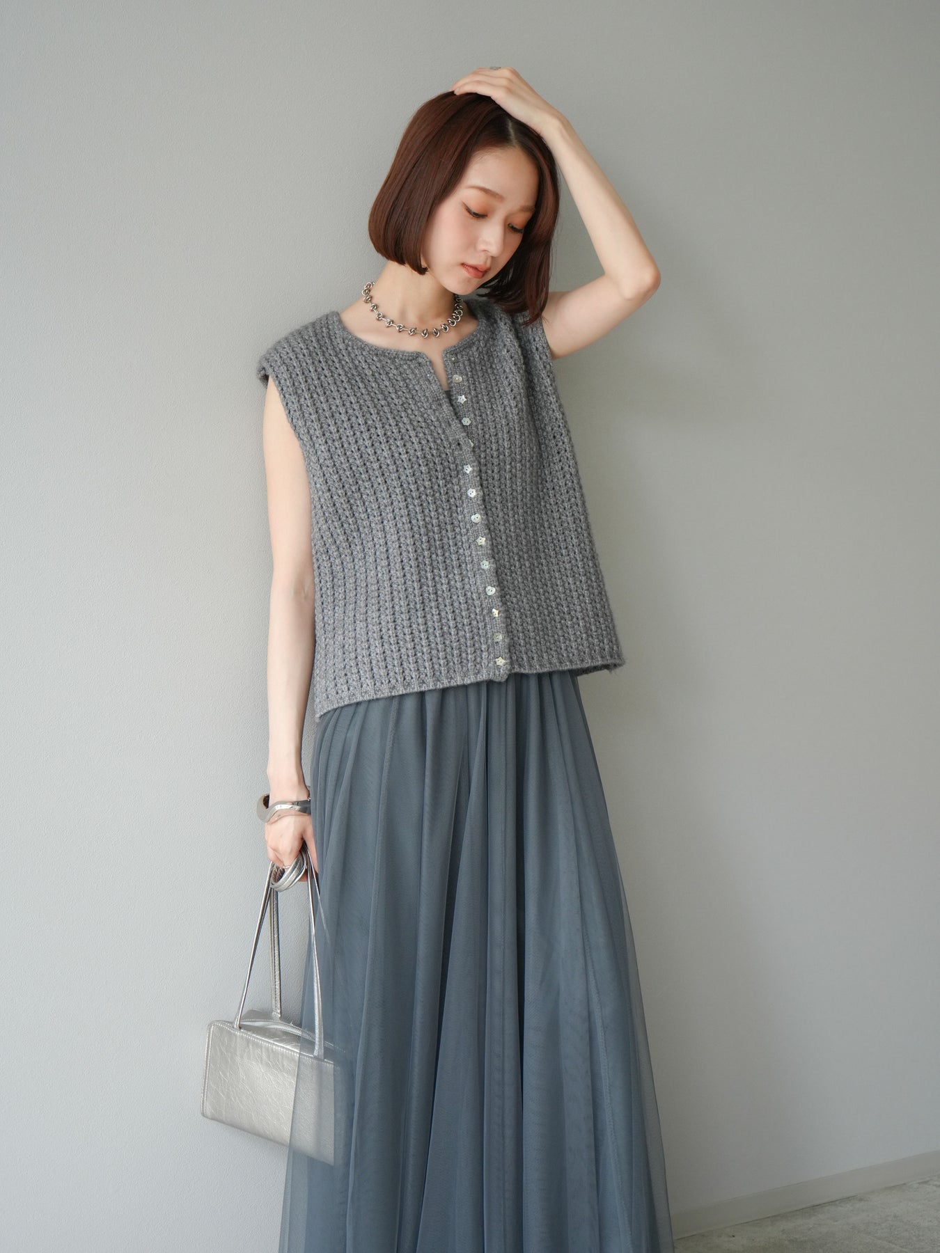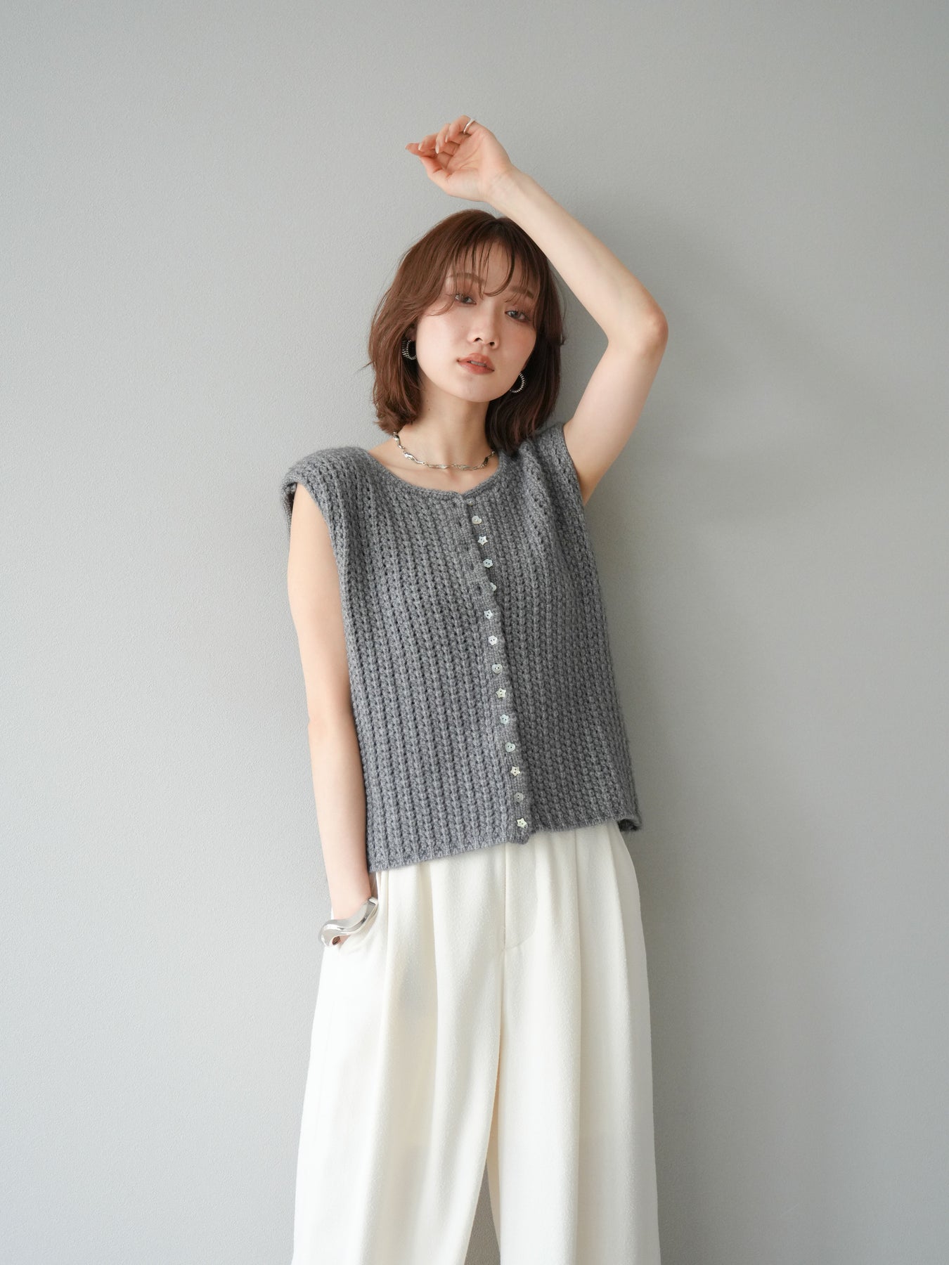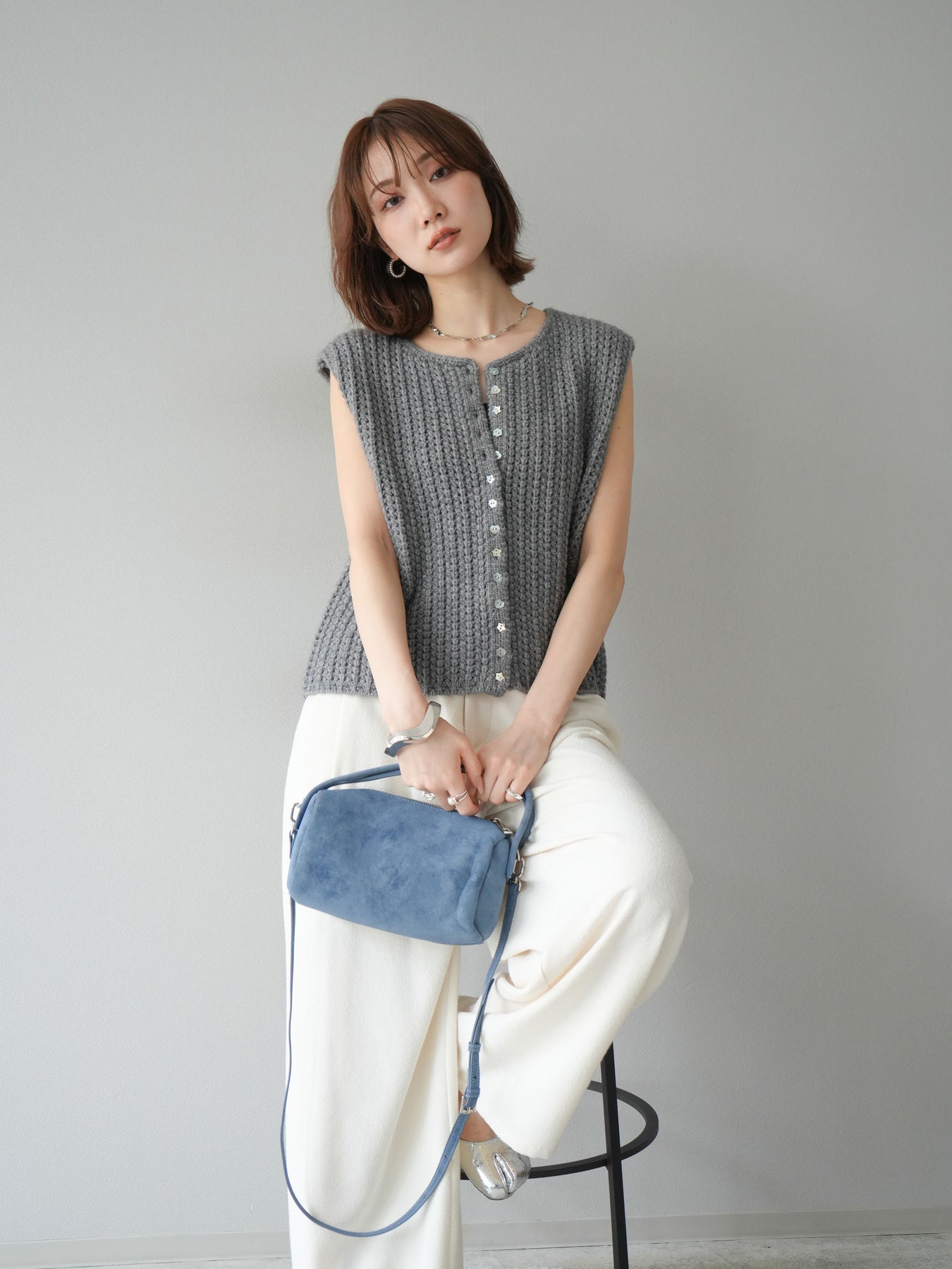 立体感のある編地に、遊び心のあるランダムボタンをあしらったニットベスト。シンプルなシルエットに個性的なディテールを加えることで、羽織るだけでスタイリングの主役になる一枚です。程よい厚みで体のラインを拾いにくく、コンパクトな丈感がボトムスとのバランスを取りやすいデザイン。シャツやカットソーに重ねてレイヤードを楽しんだり、ボタンを留めてトップス風に着こなすことも可能です。カジュアルからきれいめまで幅広く対応でき、季節を問わず活躍する万能アイテムです。 ※ボトムス、キャミソール(インナー)以外の商品は一律でインナーは付属していません。