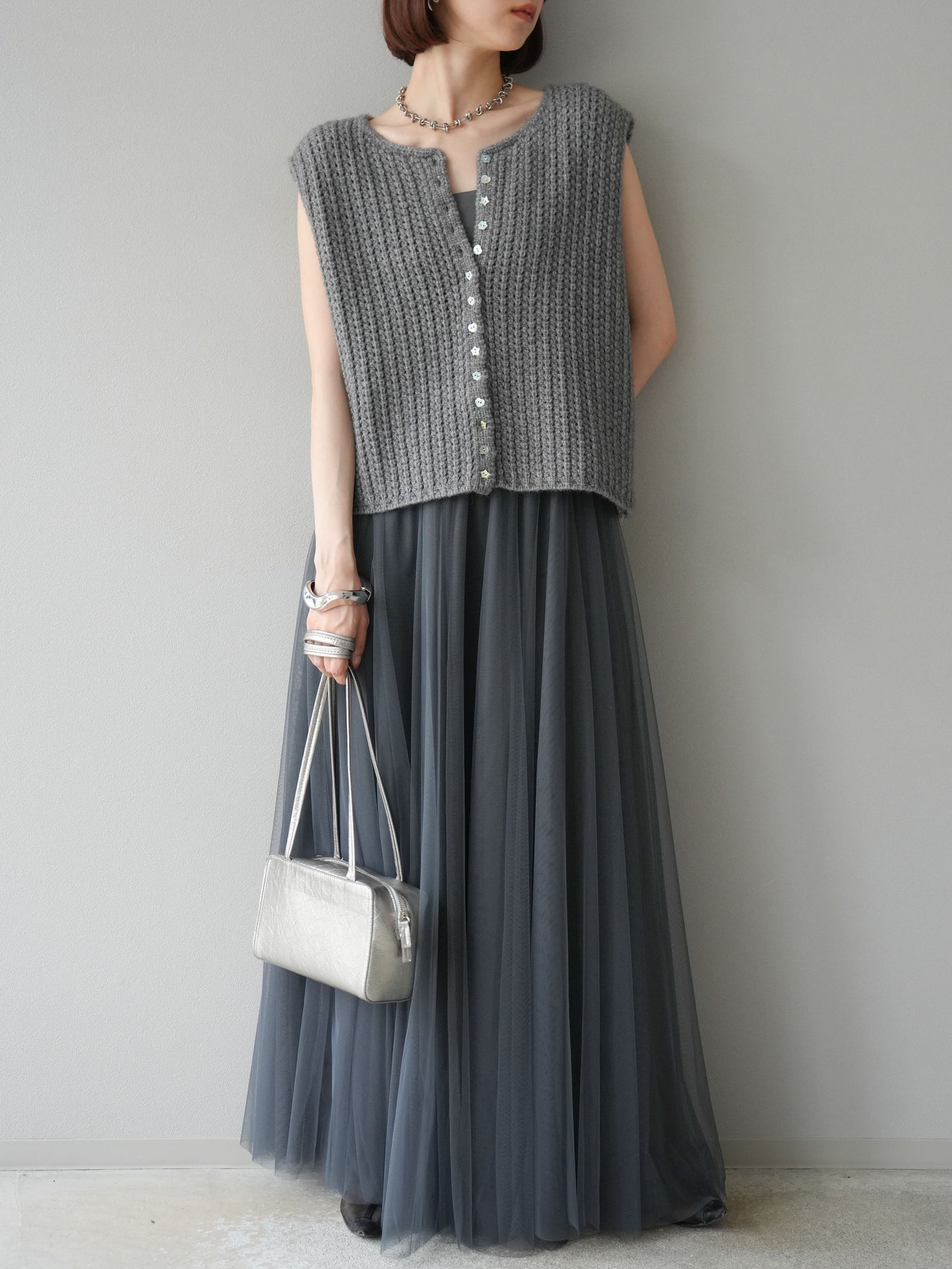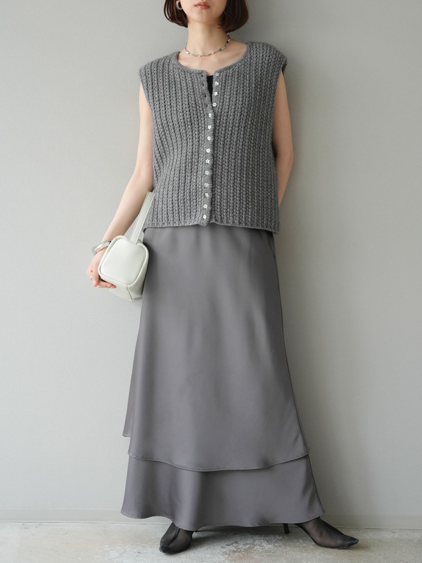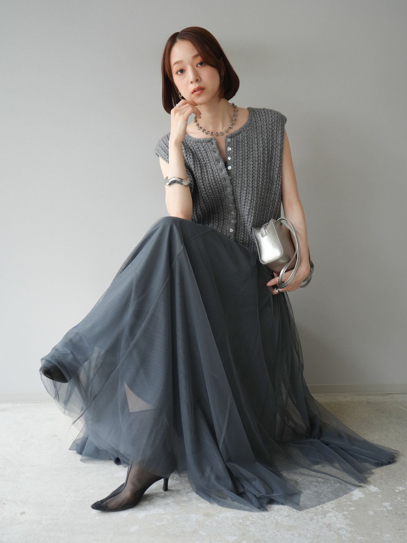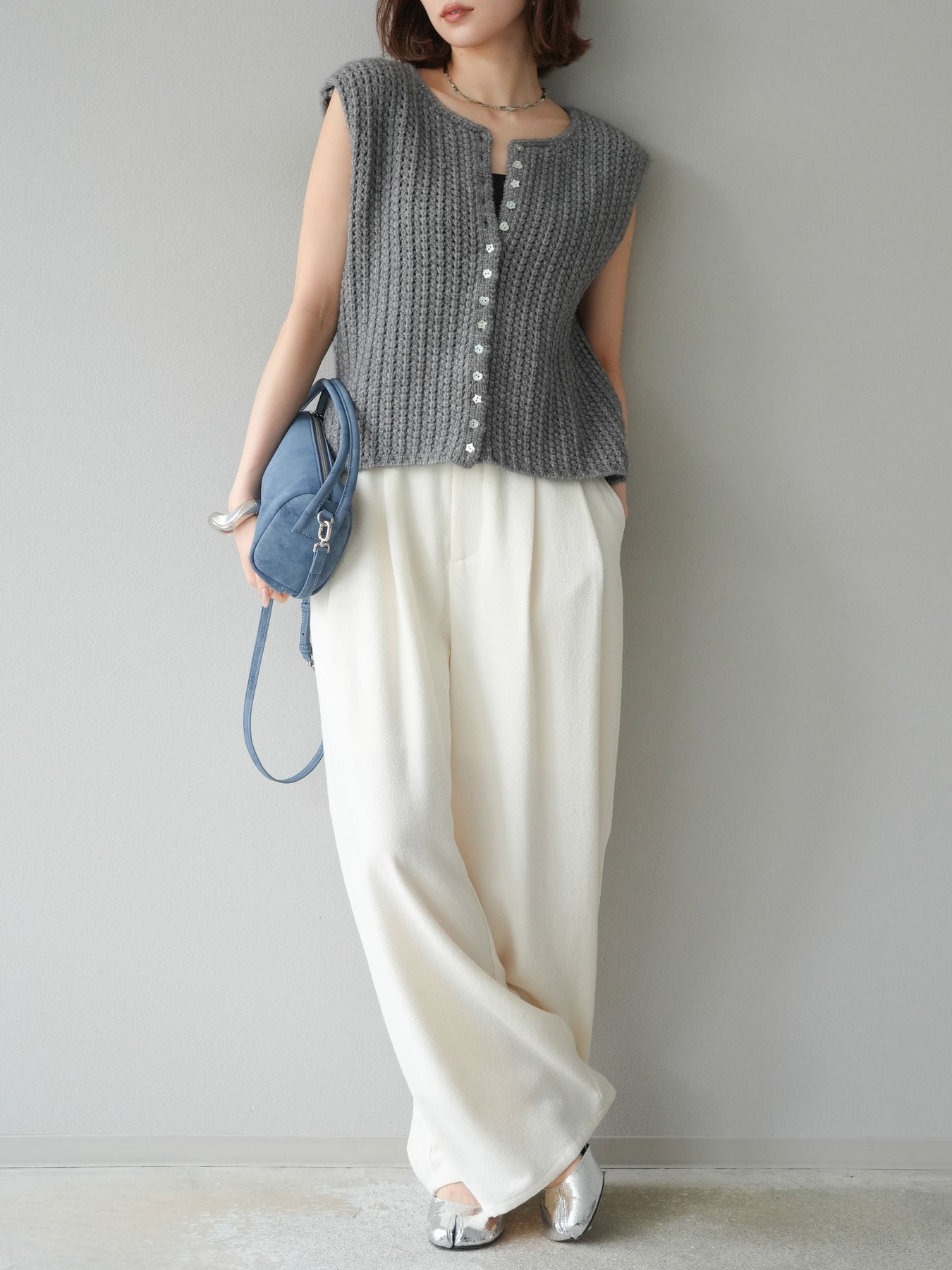 立体感のある編地に、遊び心のあるランダムボタンをあしらったニットベスト。シンプルなシルエットに個性的なディテールを加えることで、羽織るだけでスタイリングの主役になる一枚です。程よい厚みで体のラインを拾いにくく、コンパクトな丈感がボトムスとのバランスを取りやすいデザイン。シャツやカットソーに重ねてレイヤードを楽しんだり、ボタンを留めてトップス風に着こなすことも可能です。カジュアルからきれいめまで幅広く対応でき、季節を問わず活躍する万能アイテムです。 ※ボトムス、キャミソール(インナー)以外の商品は一律でインナーは付属していません。