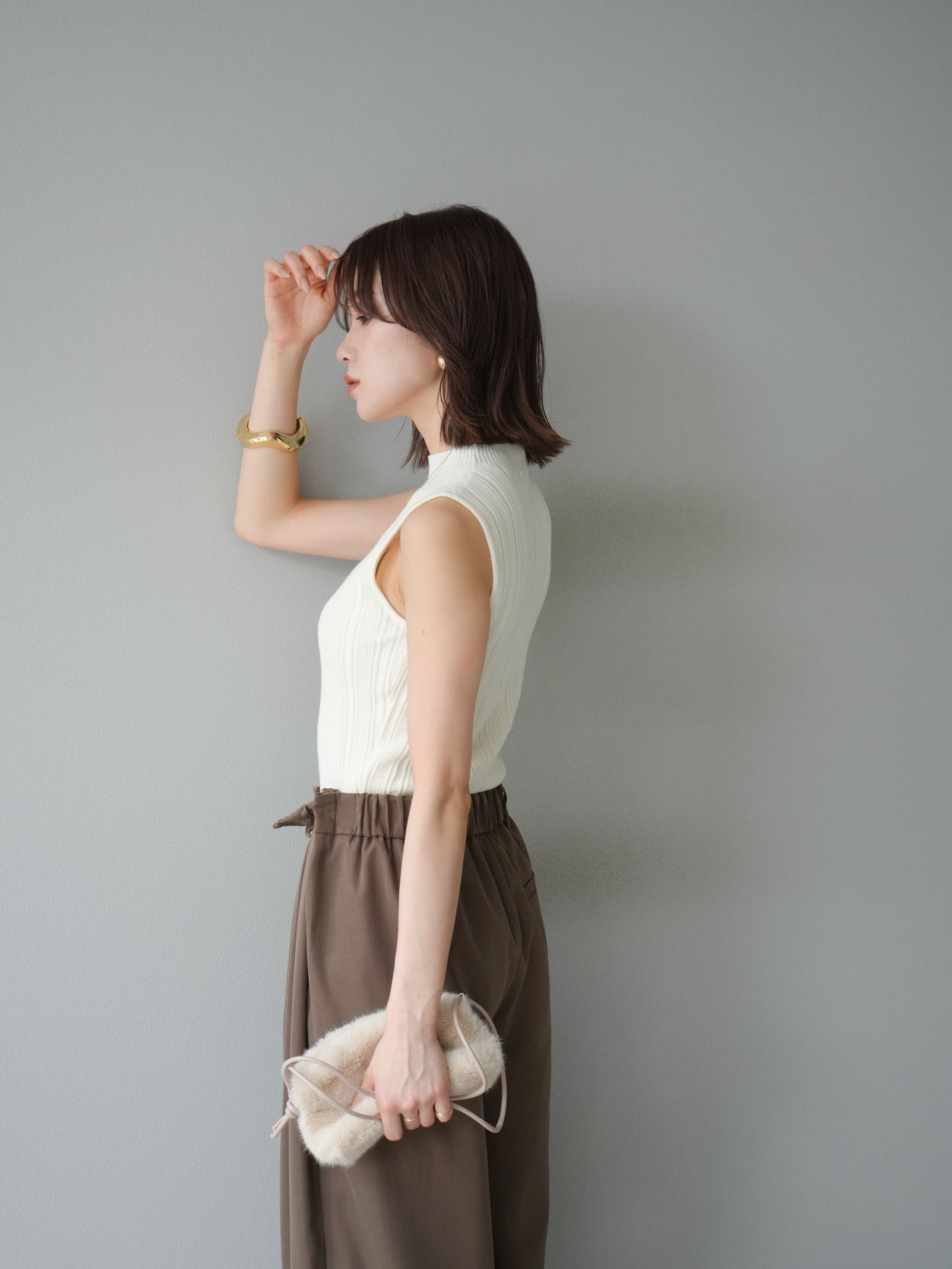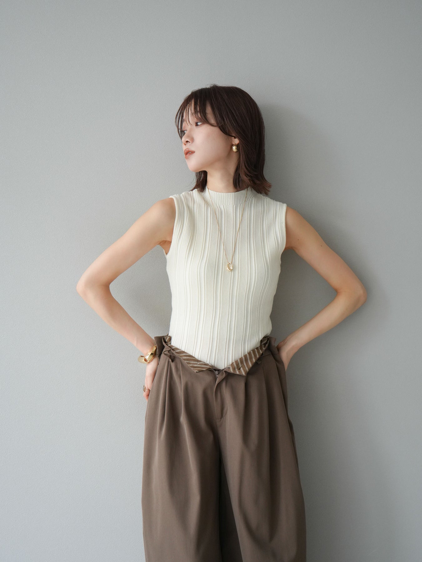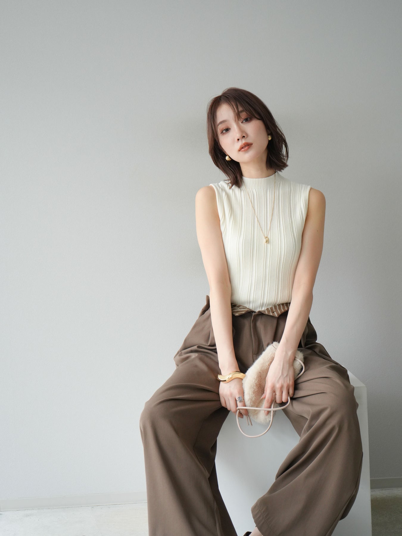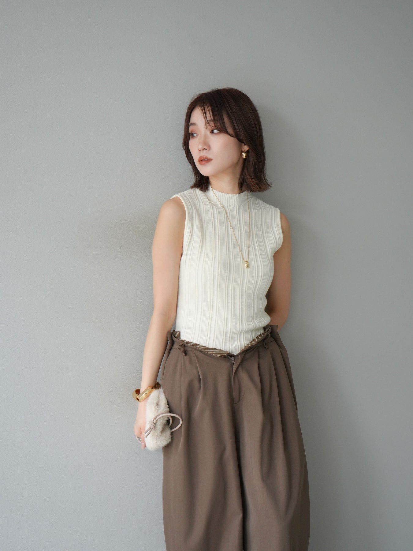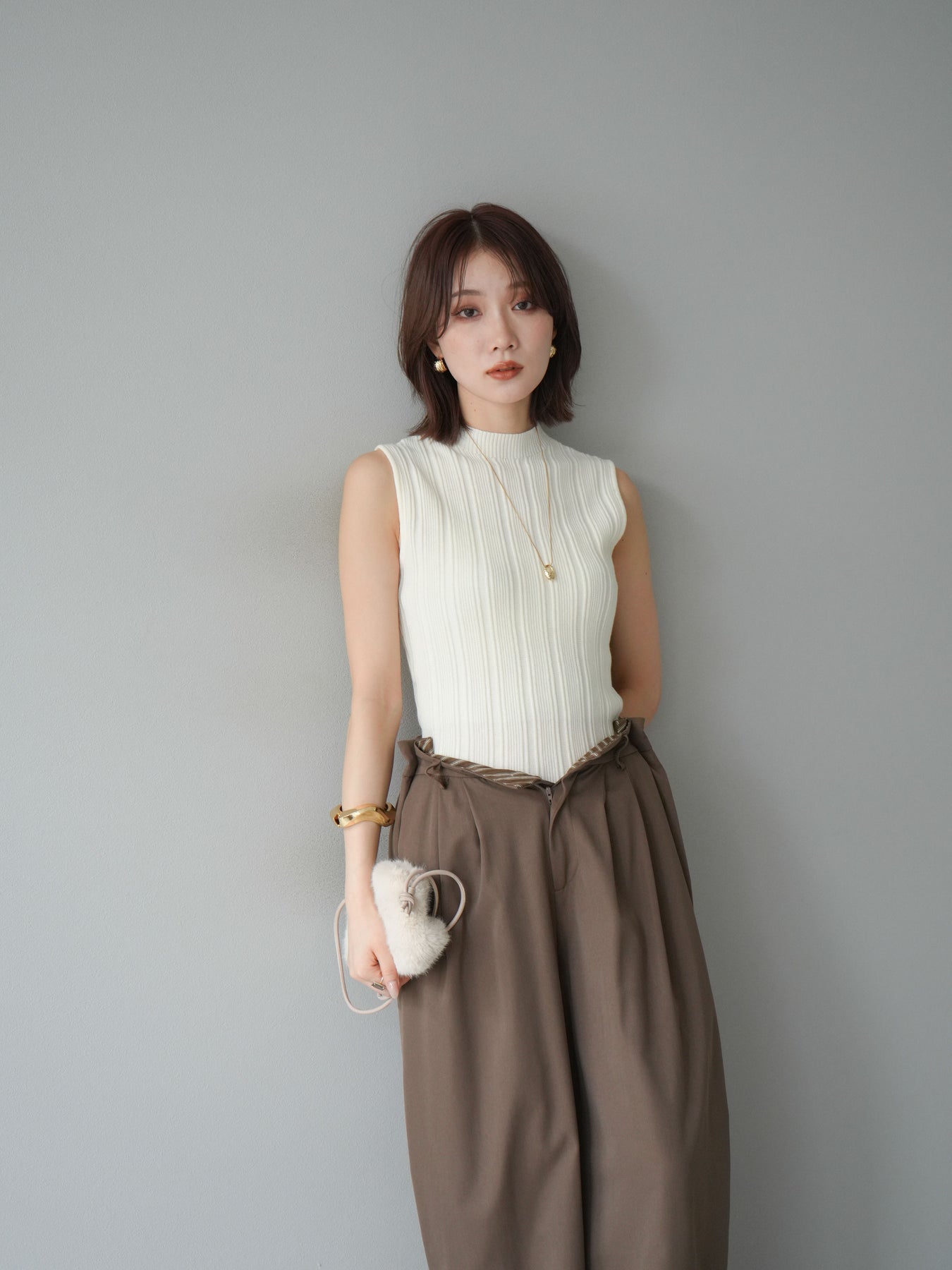 ランダムに編み立てたリブが縦のラインを強調し、すっきりとした印象を与えるスリーブレストップス。程よく身体にフィットするシルエットで、シンプルながらも洗練された雰囲気を演出します。1枚で着るのはもちろん、ジャケットやカーディガンのインナーとしても活躍し、ロングシーズン着回せる万能アイテム。きれいめからカジュアルまで幅広いスタイリングにマッチします。 ※ボトムス、キャミソール(インナー)以外の商品は一律でインナーは付属していません。