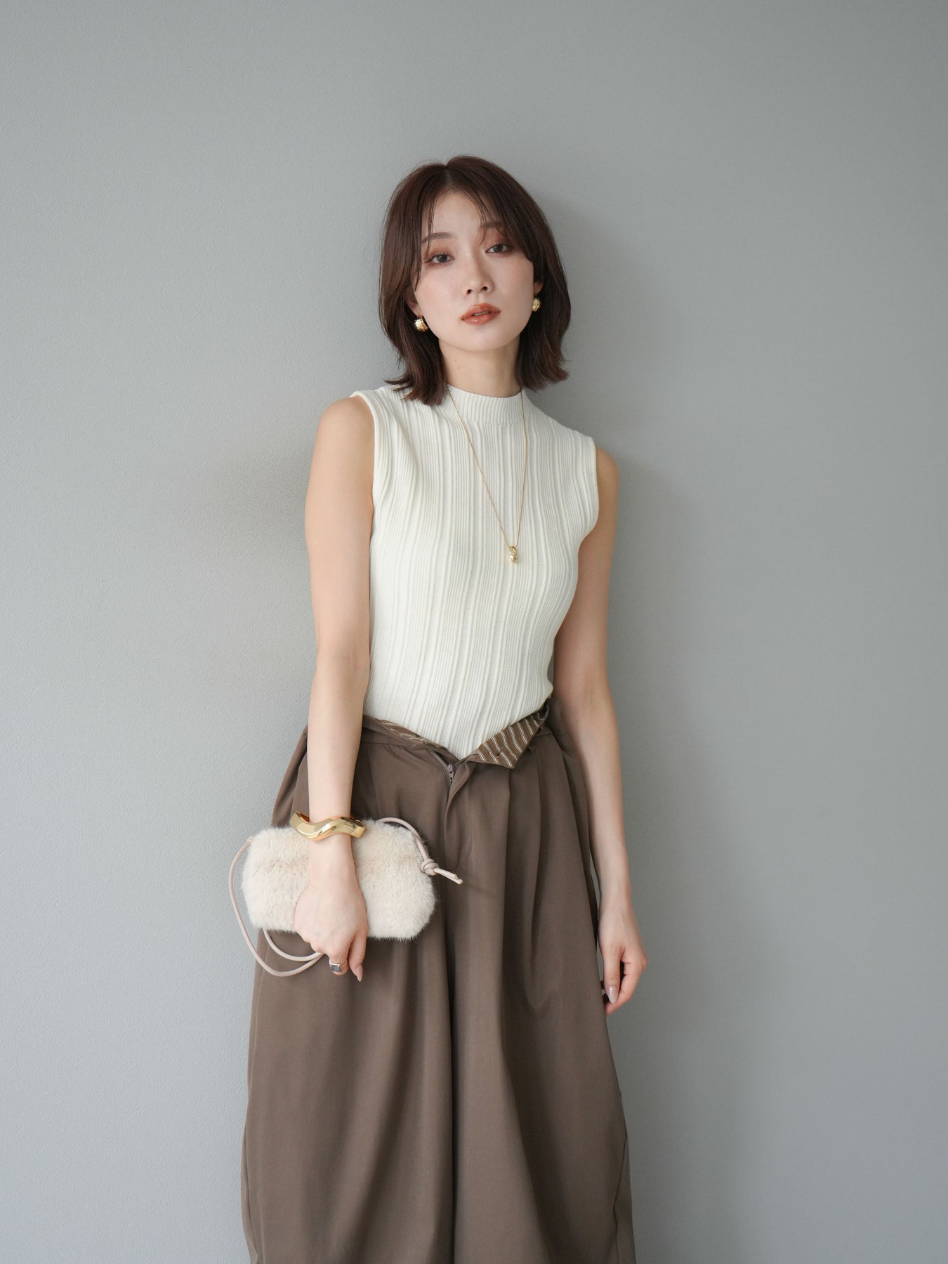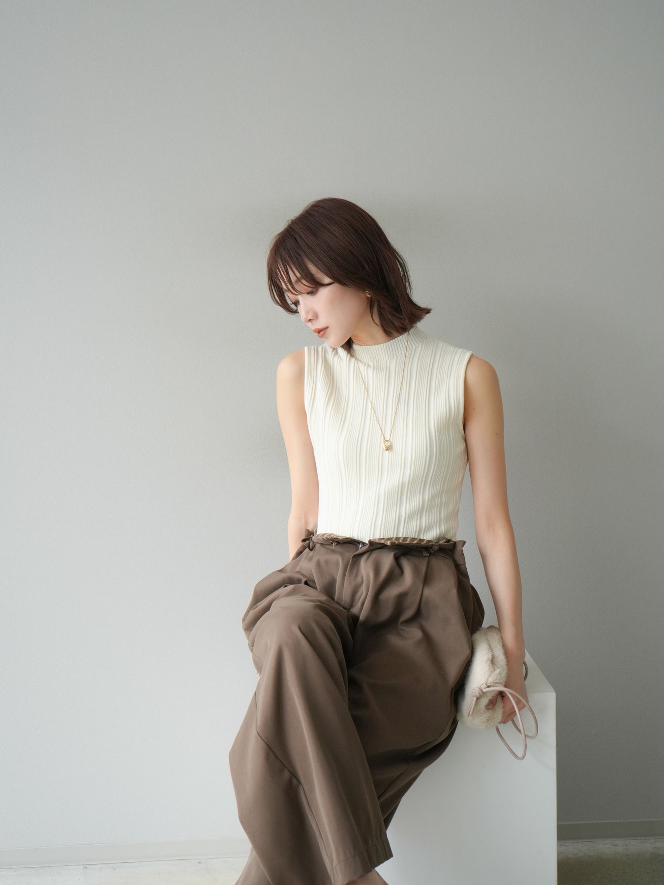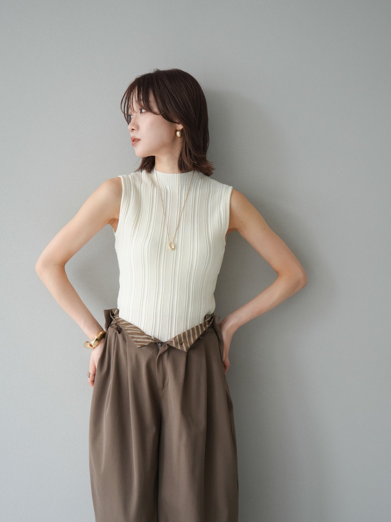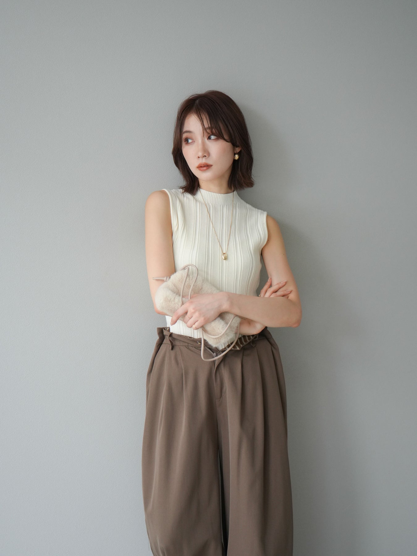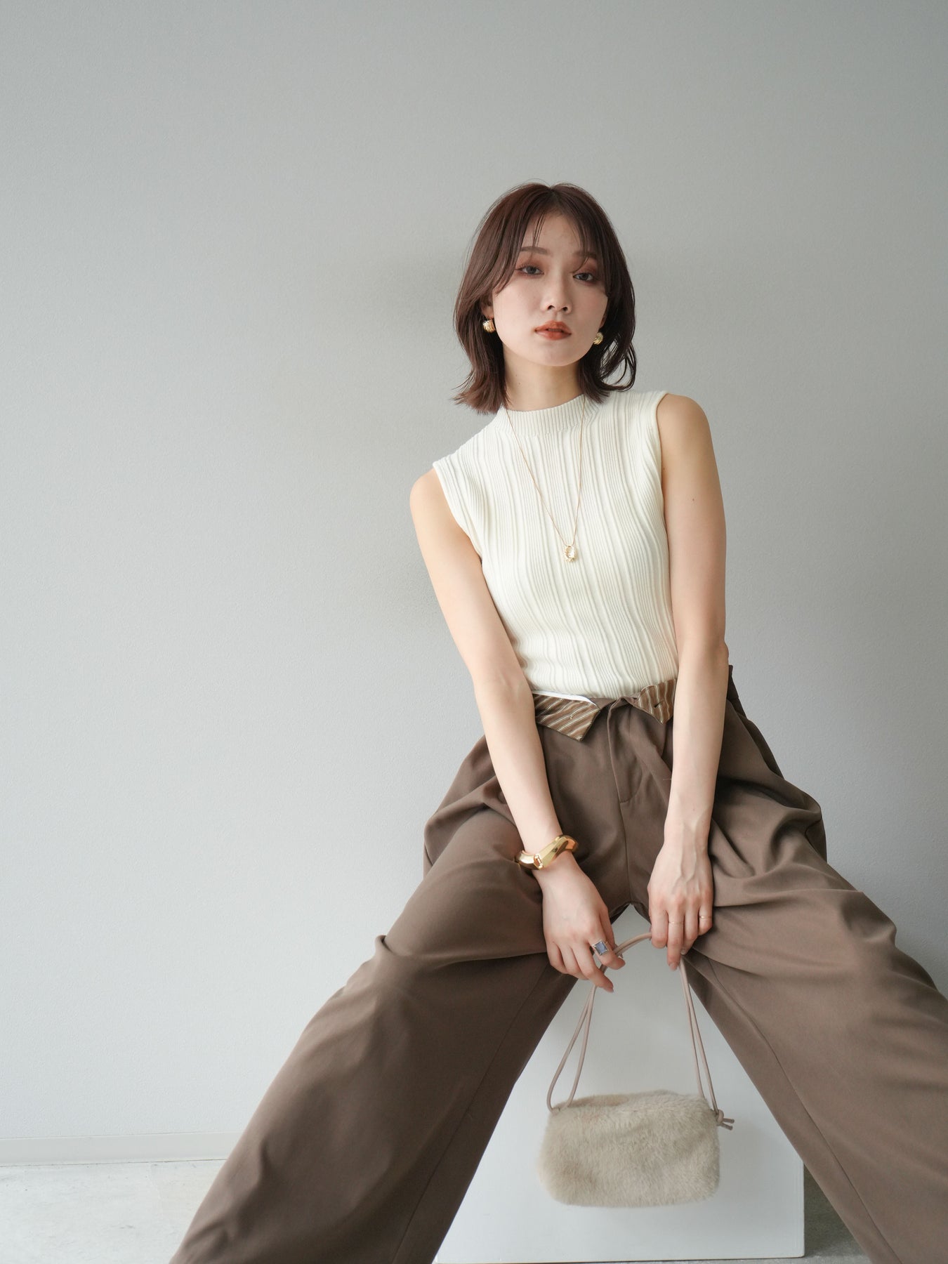 ランダムに編み立てたリブが縦のラインを強調し、すっきりとした印象を与えるスリーブレストップス。程よく身体にフィットするシルエットで、シンプルながらも洗練された雰囲気を演出します。1枚で着るのはもちろん、ジャケットやカーディガンのインナーとしても活躍し、ロングシーズン着回せる万能アイテム。きれいめからカジュアルまで幅広いスタイリングにマッチします。 ※ボトムス、キャミソール(インナー)以外の商品は一律でインナーは付属していません。