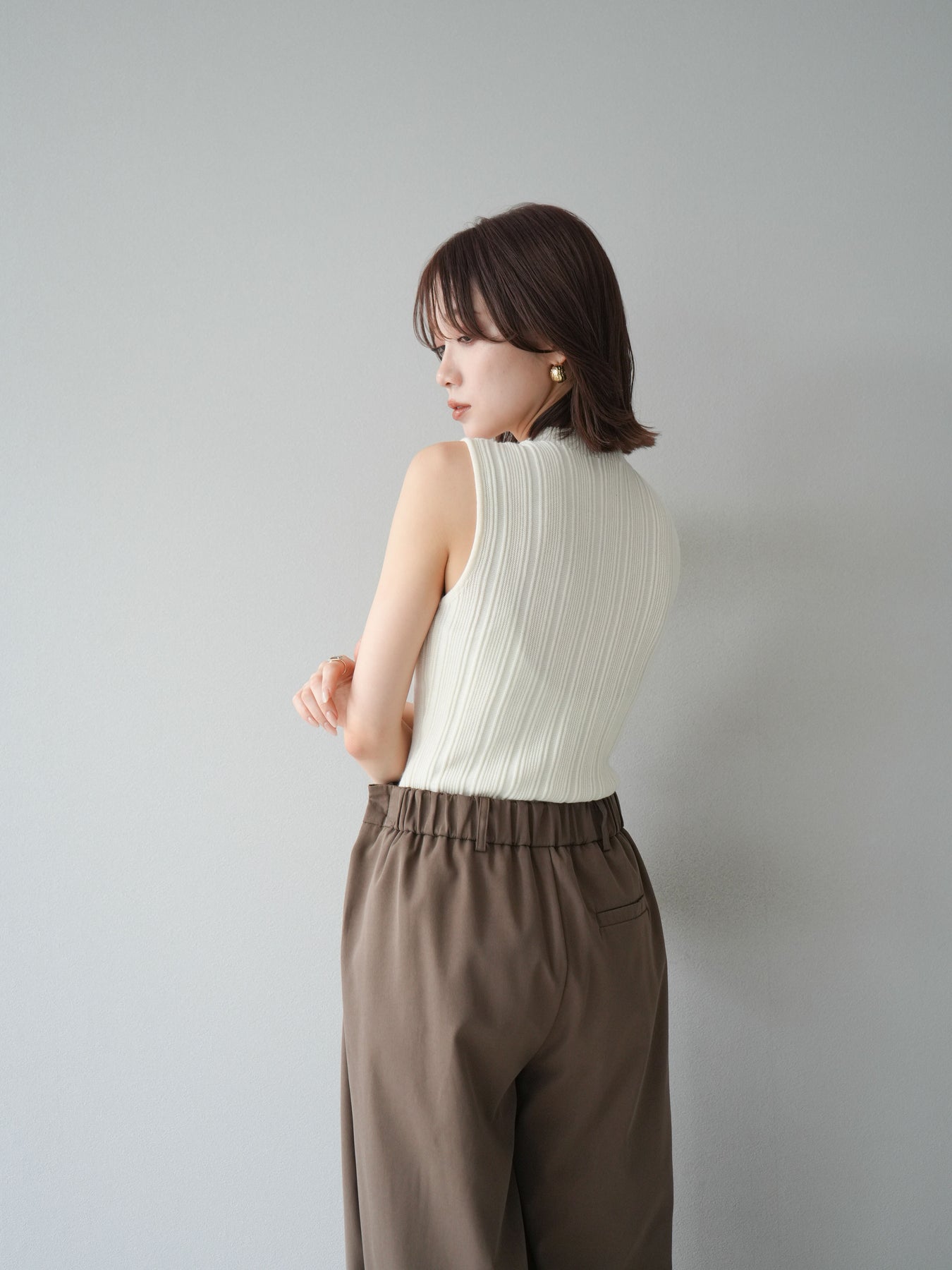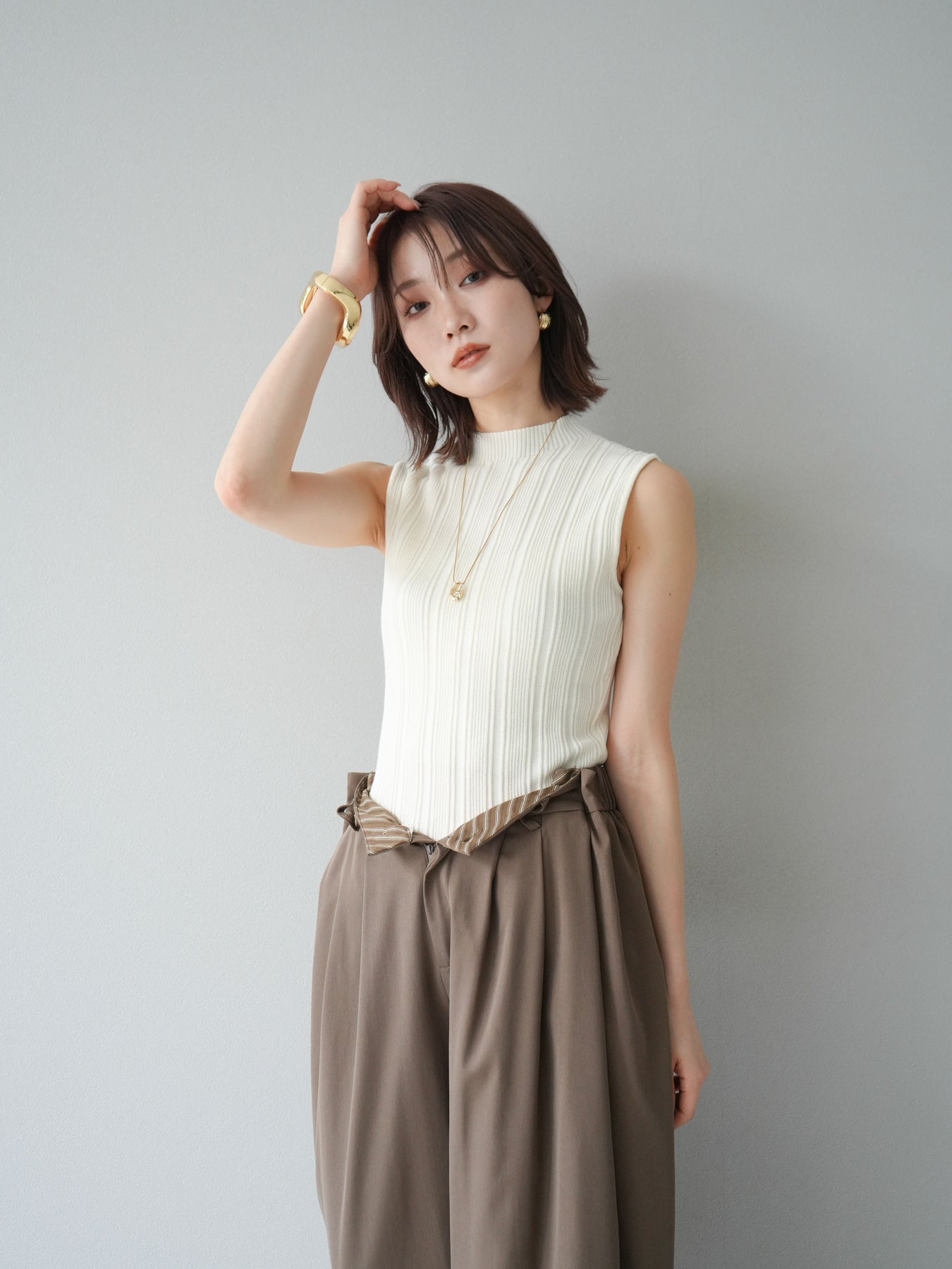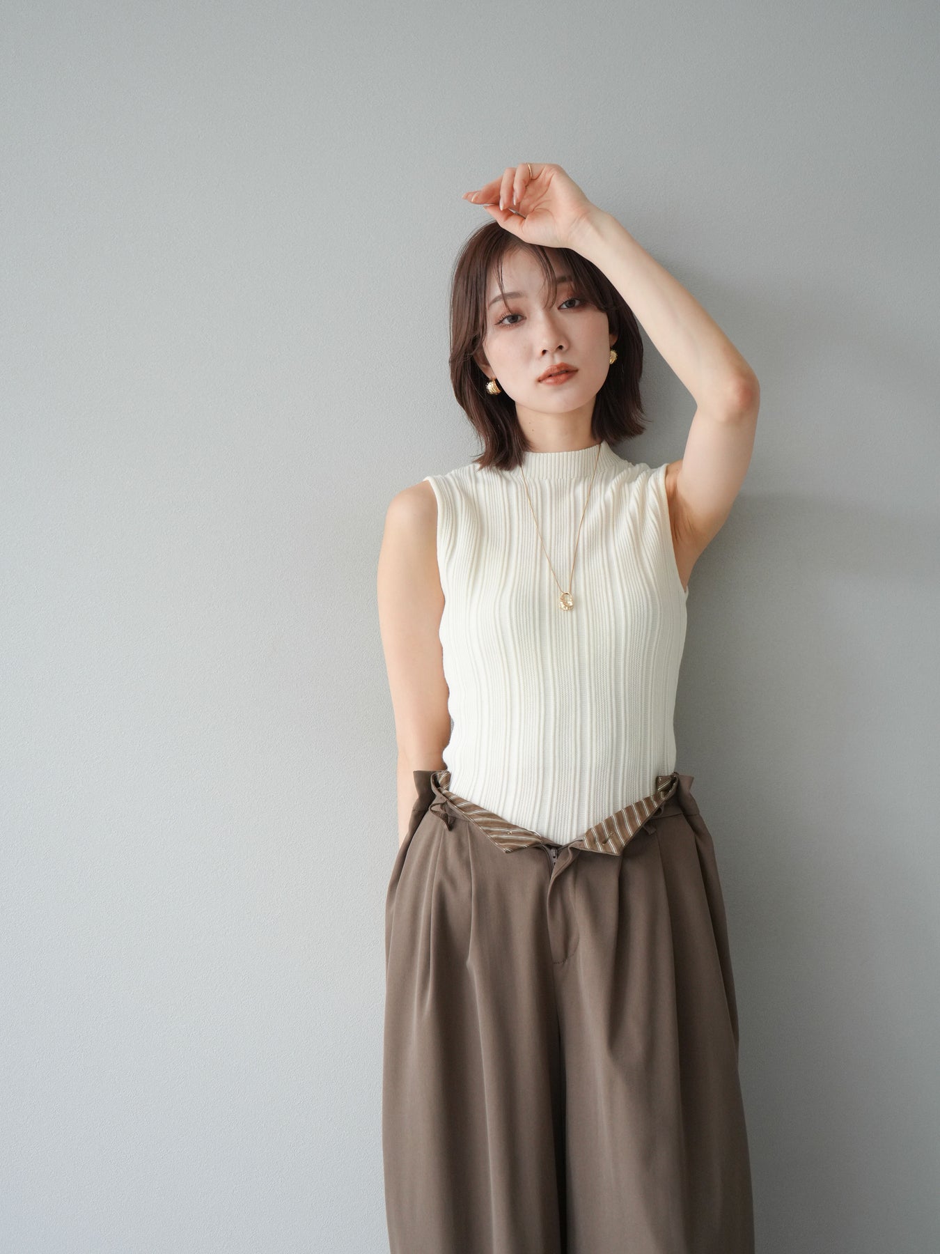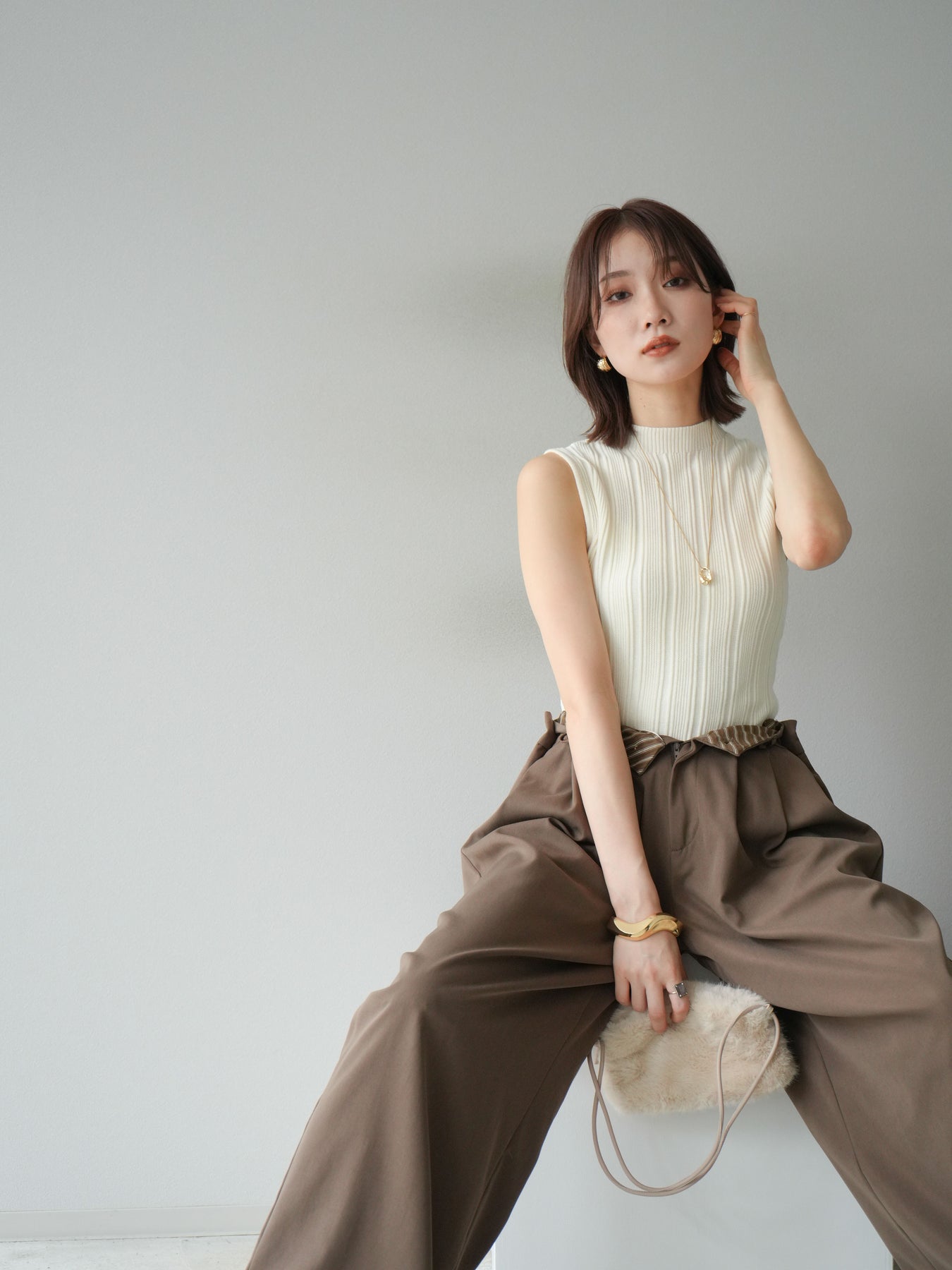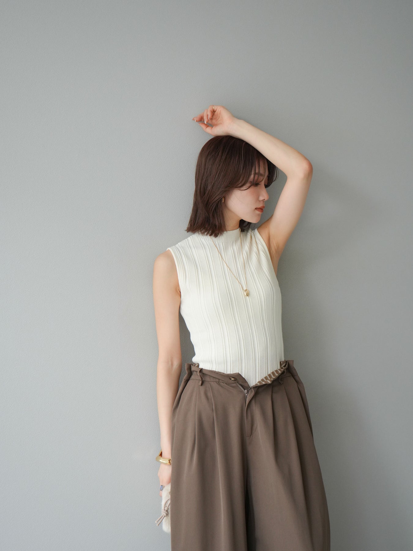 ランダムに編み立てたリブが縦のラインを強調し、すっきりとした印象を与えるスリーブレストップス。程よく身体にフィットするシルエットで、シンプルながらも洗練された雰囲気を演出します。1枚で着るのはもちろん、ジャケットやカーディガンのインナーとしても活躍し、ロングシーズン着回せる万能アイテム。きれいめからカジュアルまで幅広いスタイリングにマッチします。 ※ボトムス、キャミソール(インナー)以外の商品は一律でインナーは付属していません。