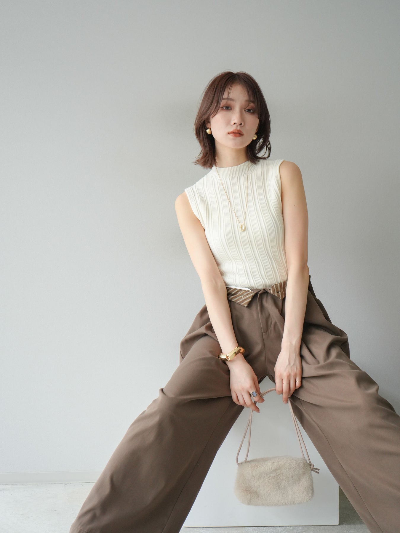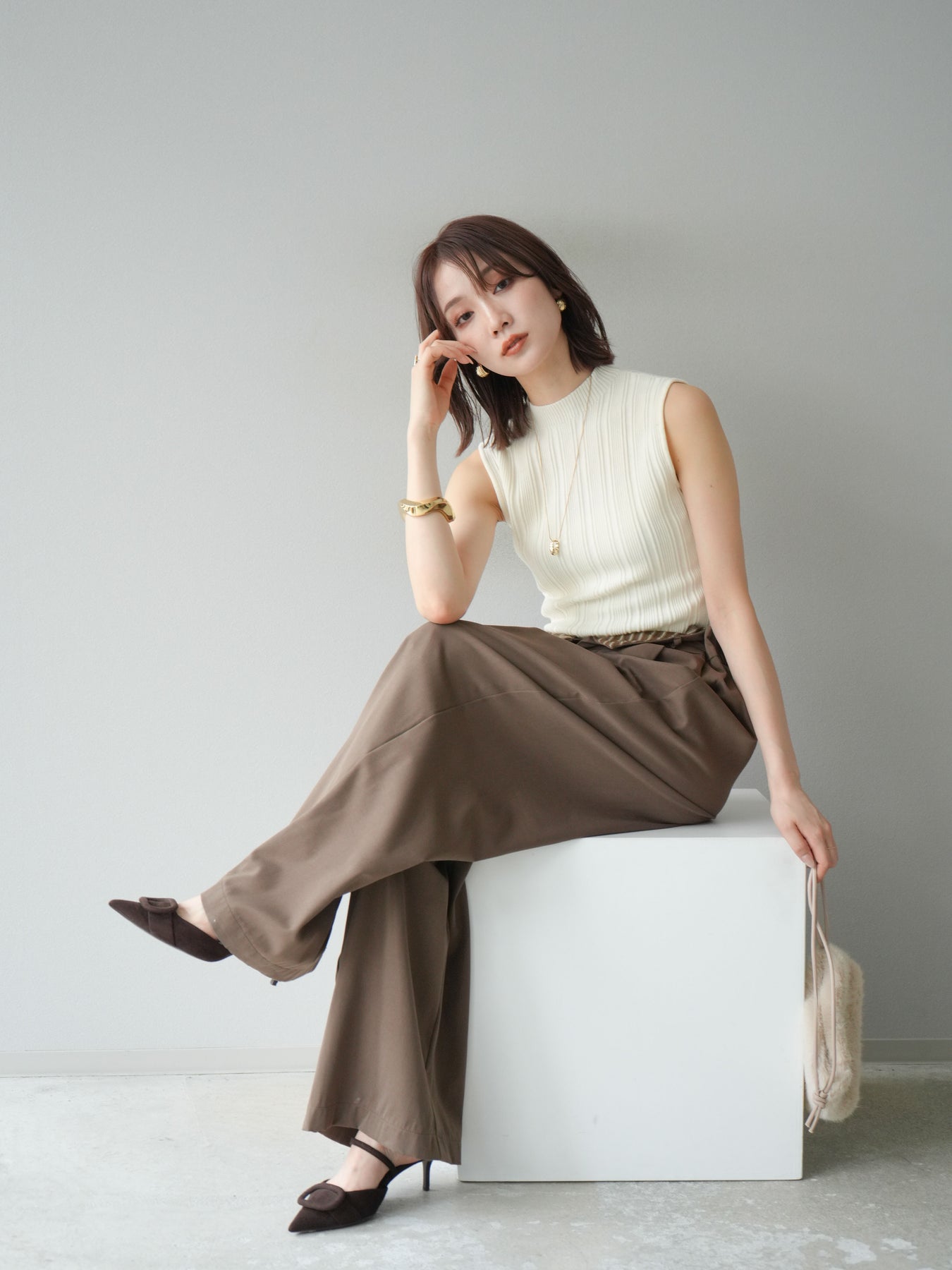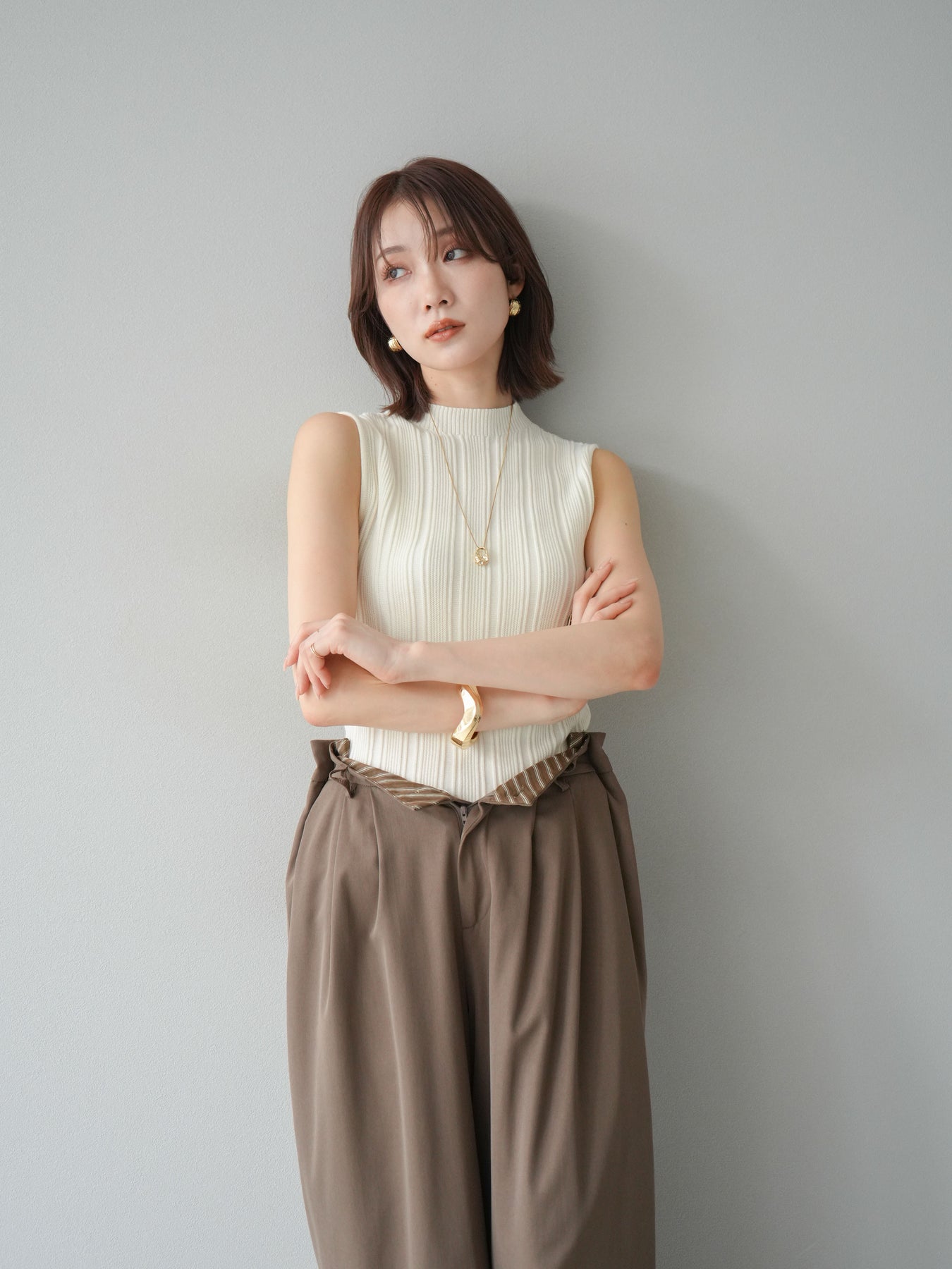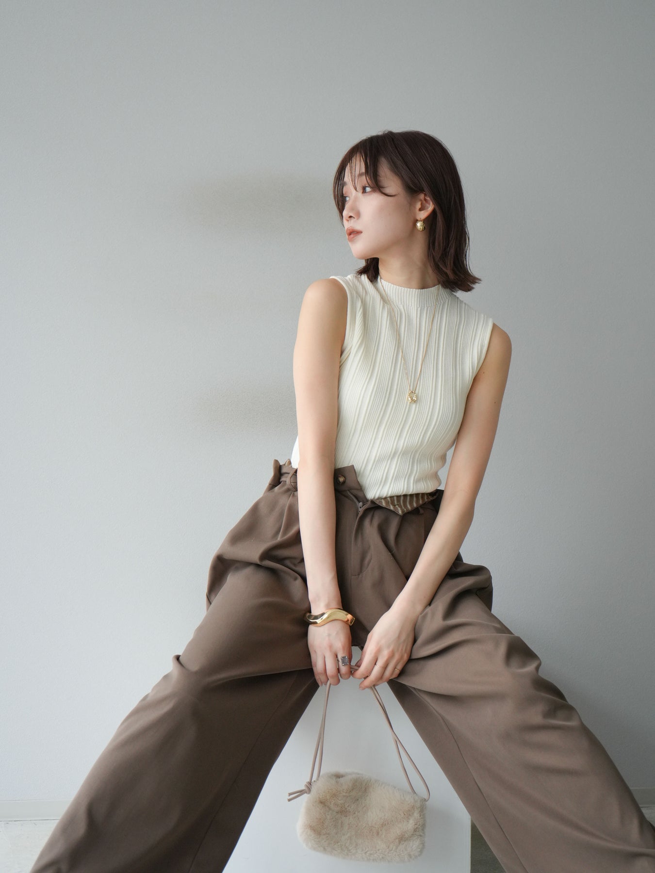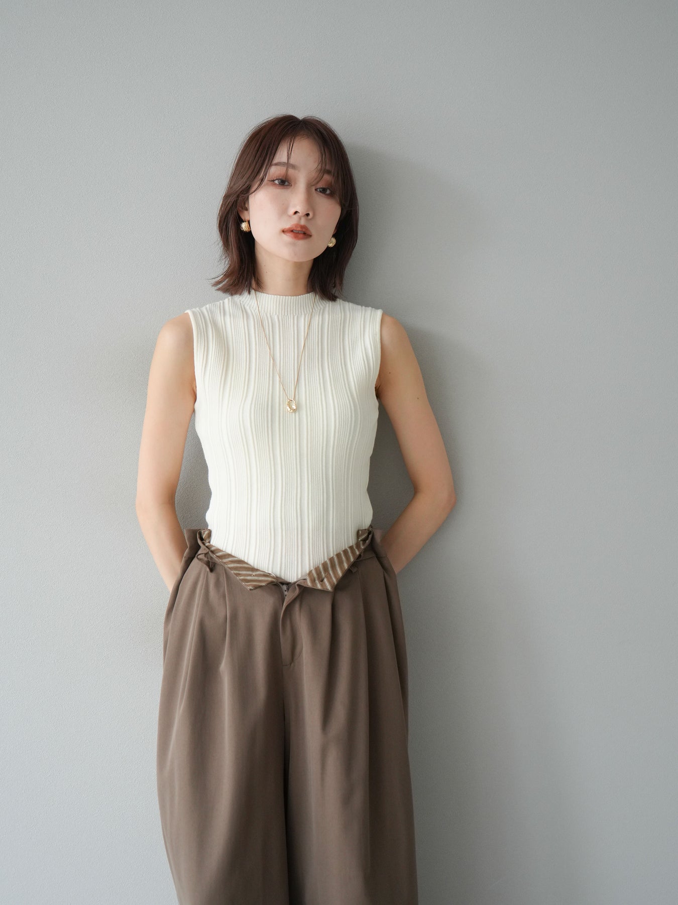 ランダムに編み立てたリブが縦のラインを強調し、すっきりとした印象を与えるスリーブレストップス。程よく身体にフィットするシルエットで、シンプルながらも洗練された雰囲気を演出します。1枚で着るのはもちろん、ジャケットやカーディガンのインナーとしても活躍し、ロングシーズン着回せる万能アイテム。きれいめからカジュアルまで幅広いスタイリングにマッチします。 ※ボトムス、キャミソール(インナー)以外の商品は一律でインナーは付属していません。
