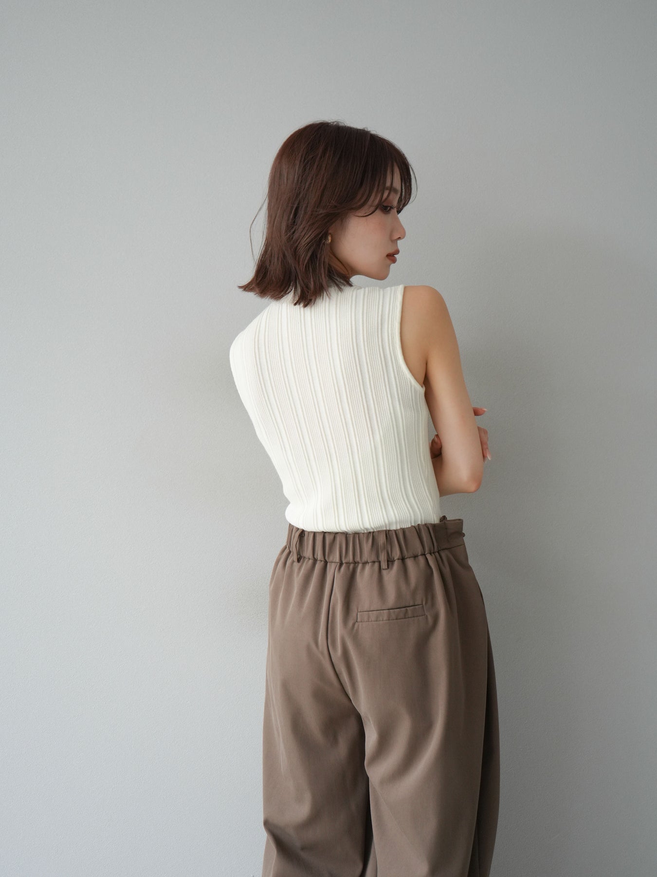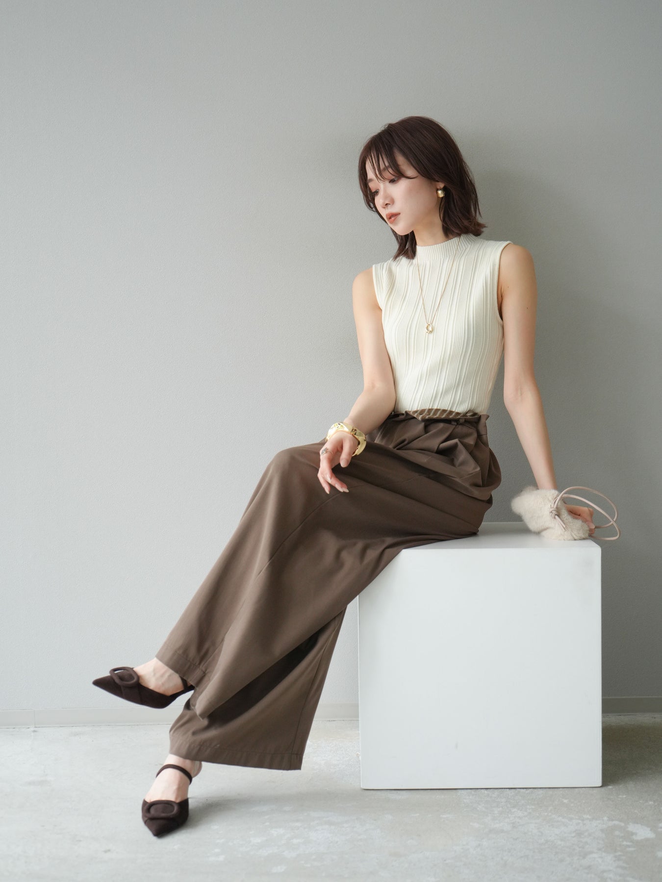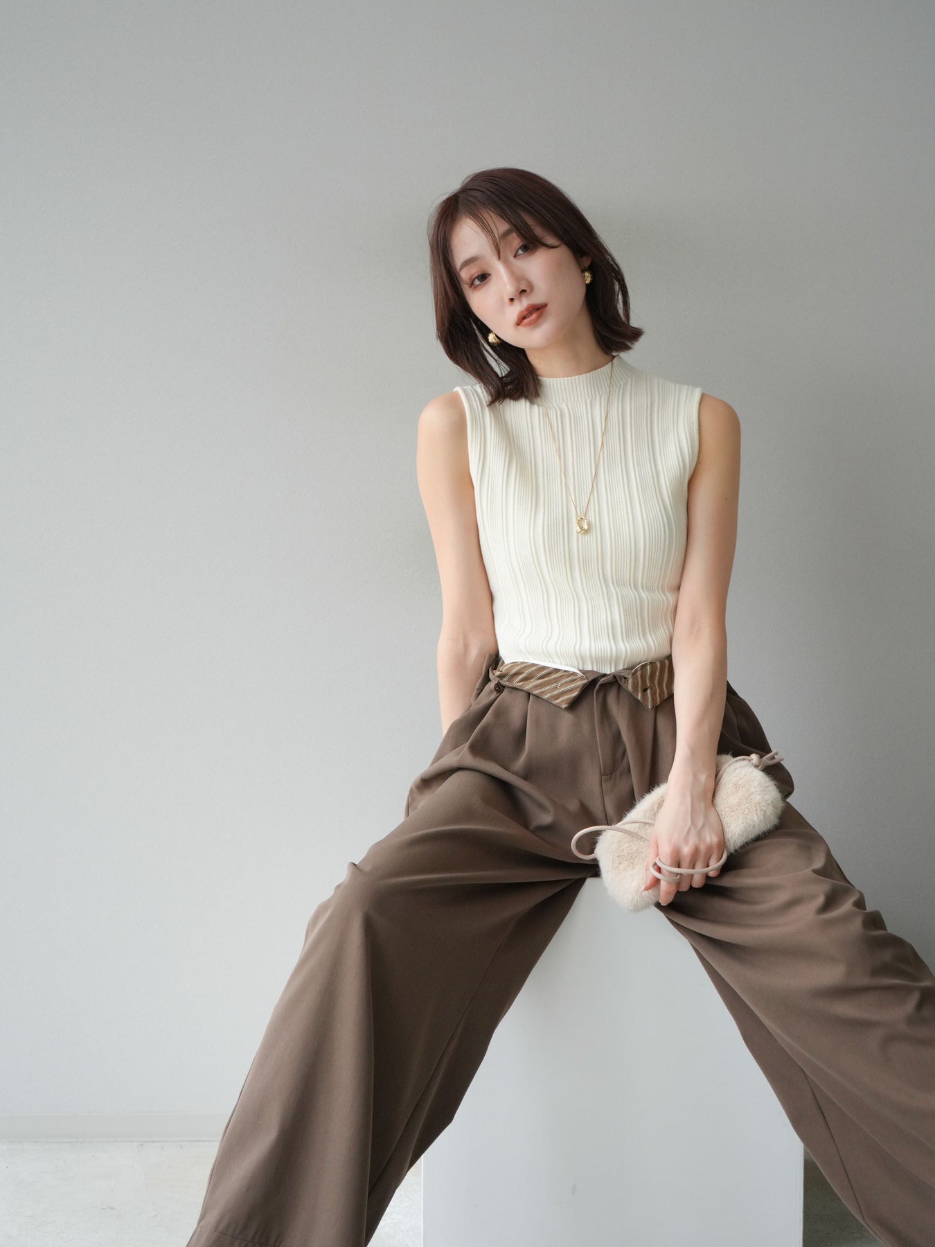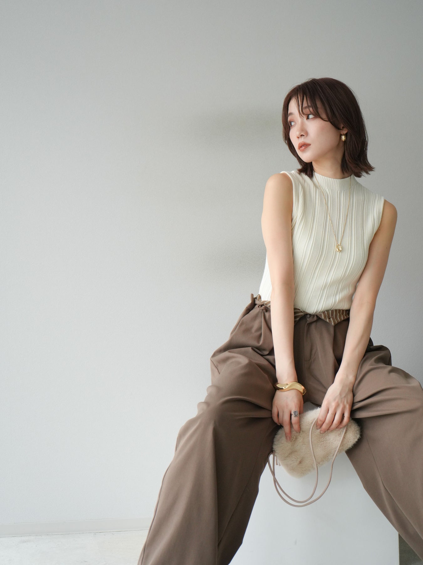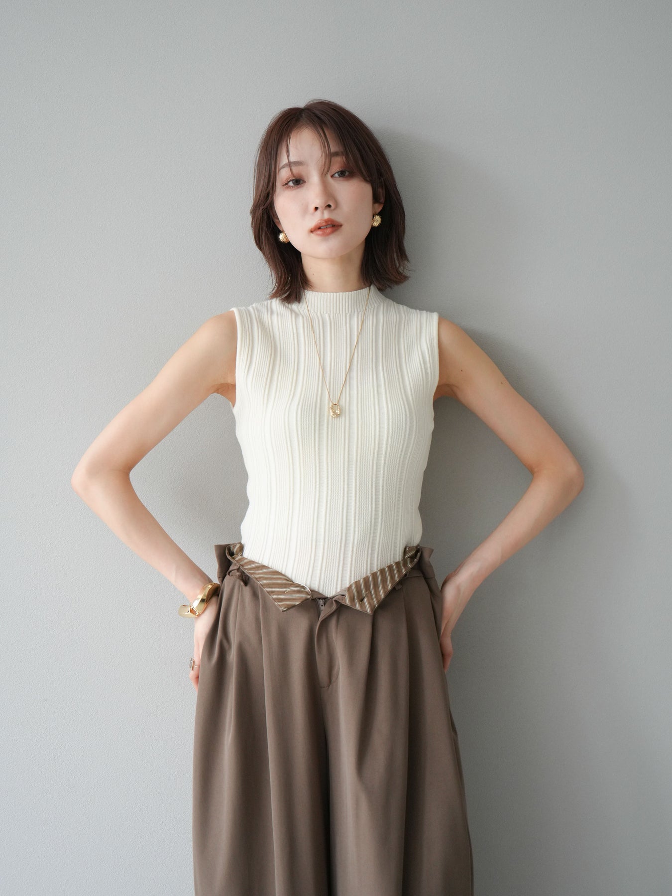 ランダムに編み立てたリブが縦のラインを強調し、すっきりとした印象を与えるスリーブレストップス。程よく身体にフィットするシルエットで、シンプルながらも洗練された雰囲気を演出します。1枚で着るのはもちろん、ジャケットやカーディガンのインナーとしても活躍し、ロングシーズン着回せる万能アイテム。きれいめからカジュアルまで幅広いスタイリングにマッチします。 ※ボトムス、キャミソール(インナー)以外の商品は一律でインナーは付属していません。