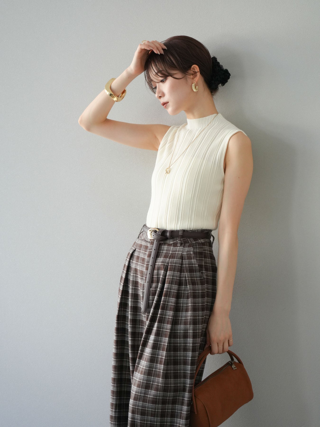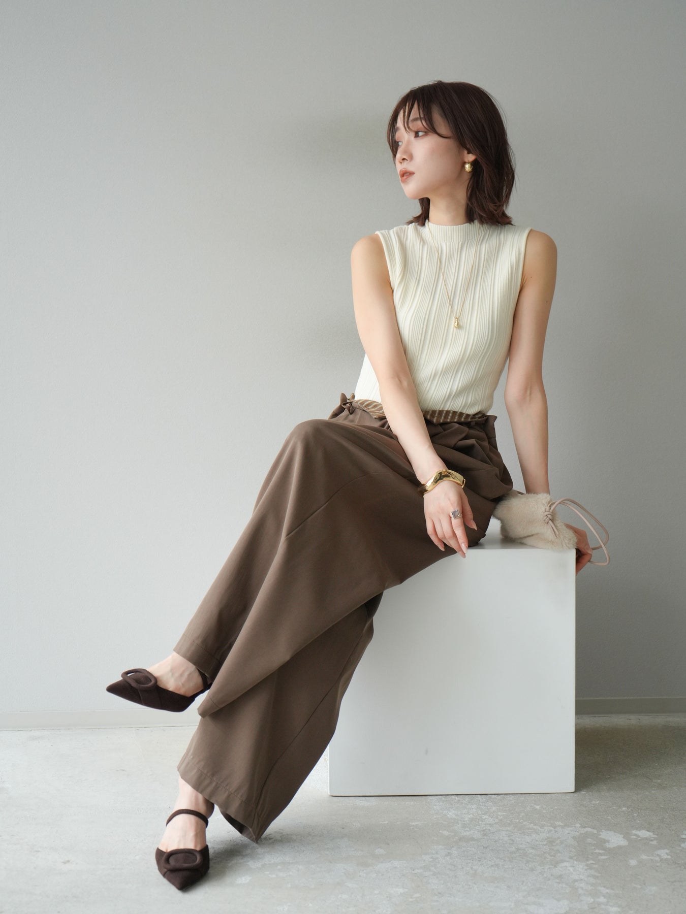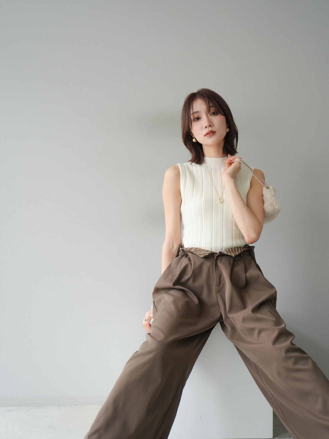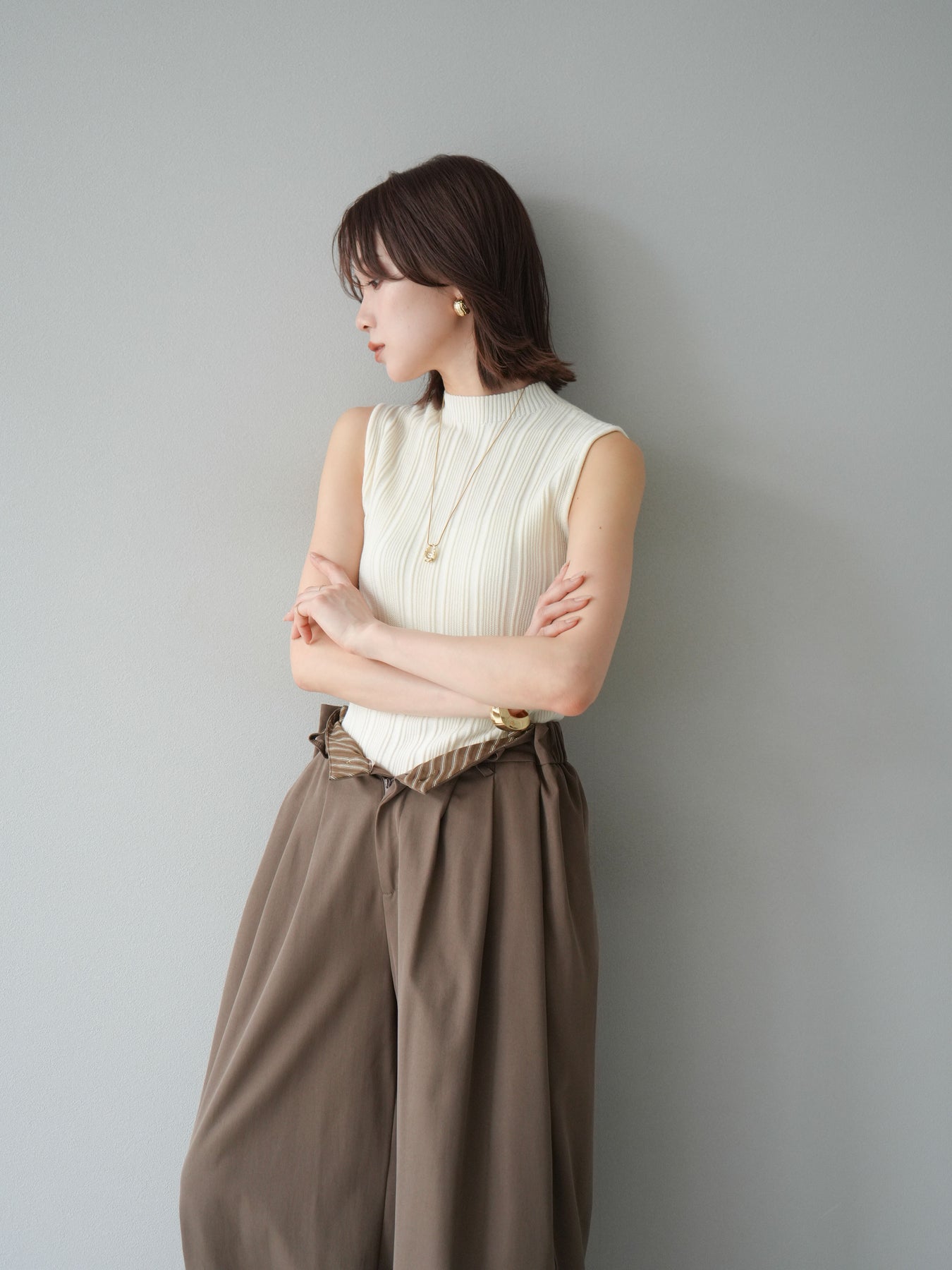 ランダムに編み立てたリブが縦のラインを強調し、すっきりとした印象を与えるスリーブレストップス。程よく身体にフィットするシルエットで、シンプルながらも洗練された雰囲気を演出します。1枚で着るのはもちろん、ジャケットやカーディガンのインナーとしても活躍し、ロングシーズン着回せる万能アイテム。きれいめからカジュアルまで幅広いスタイリングにマッチします。 ※ボトムス、キャミソール(インナー)以外の商品は一律でインナーは付属していません。