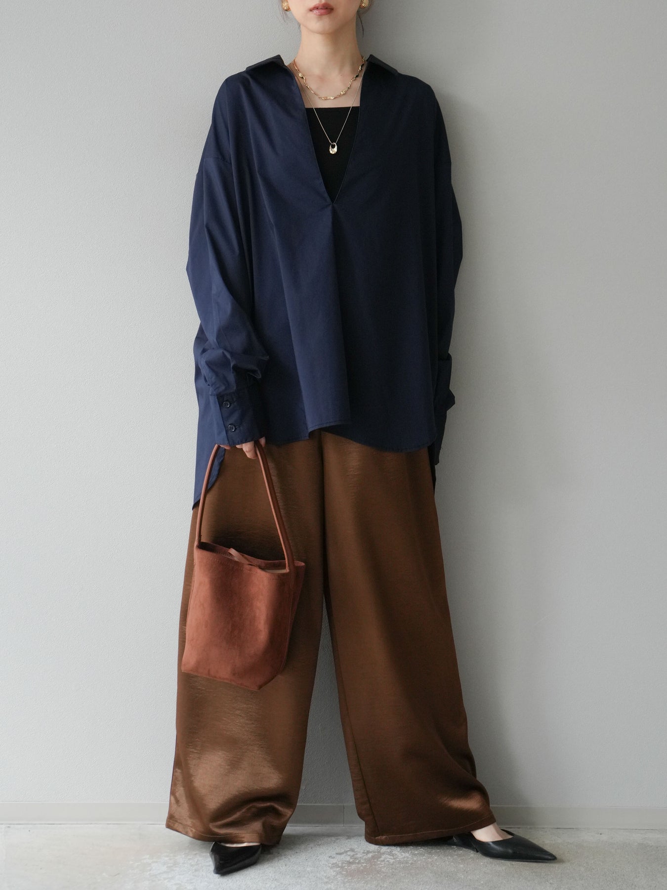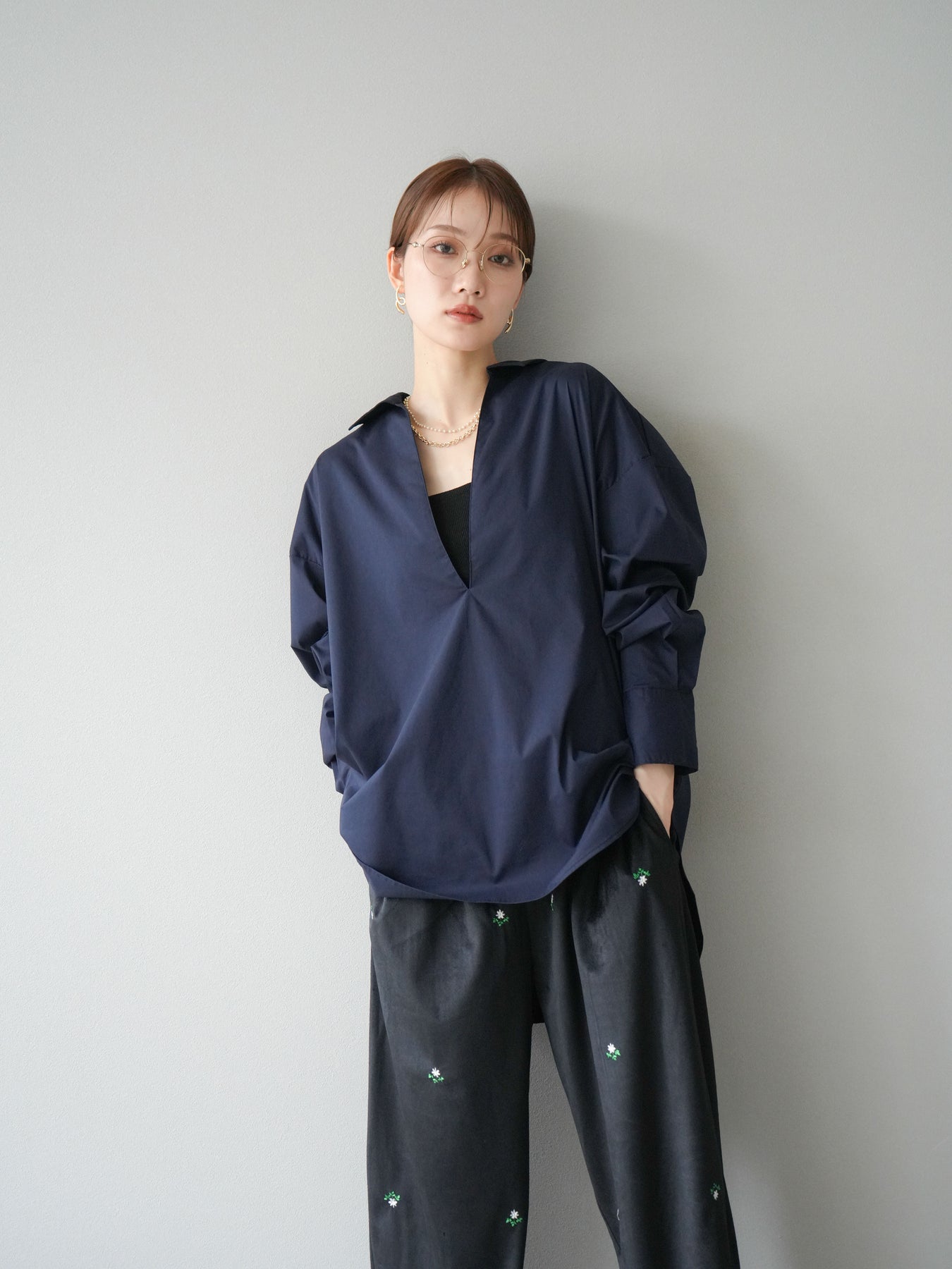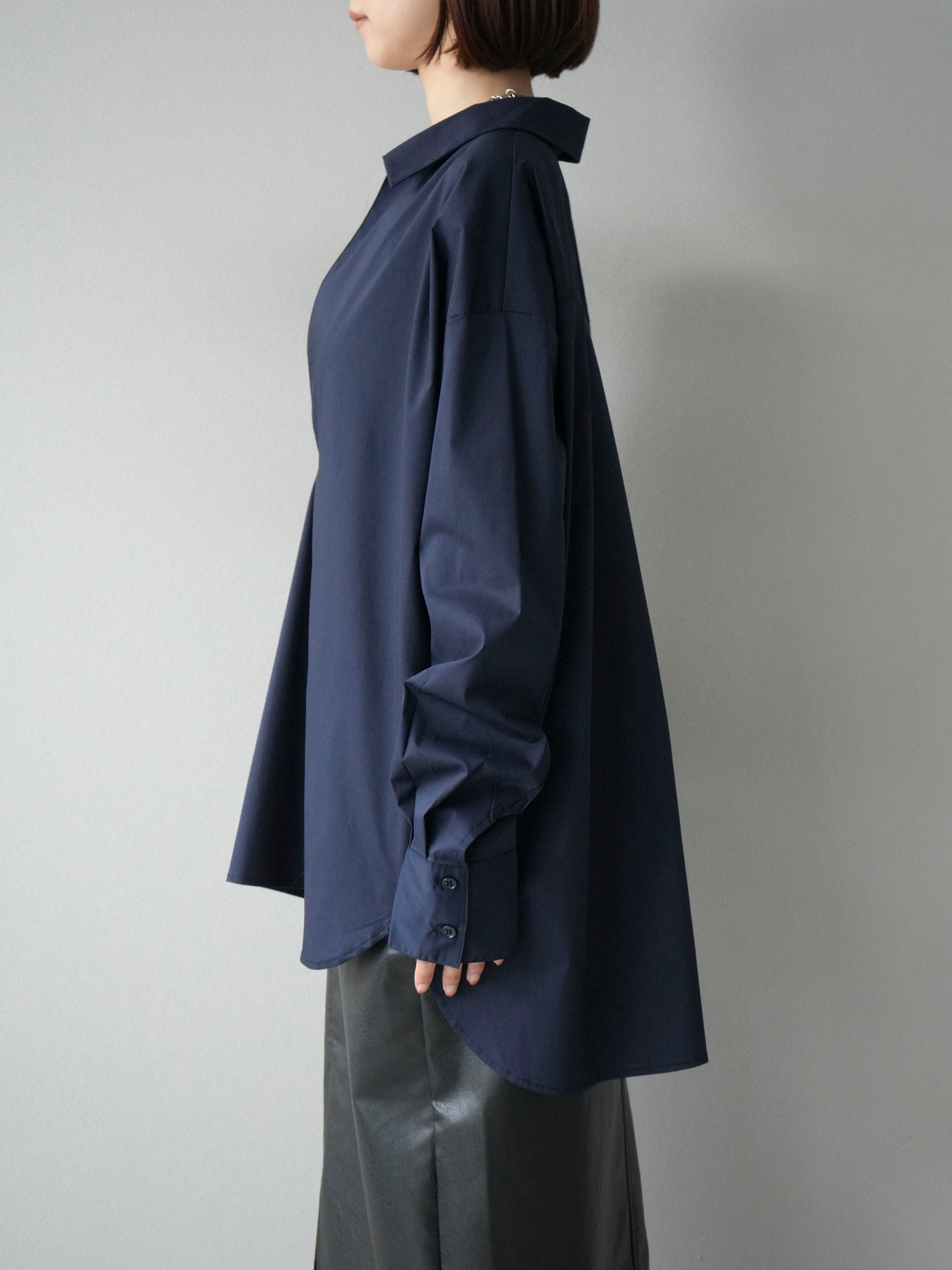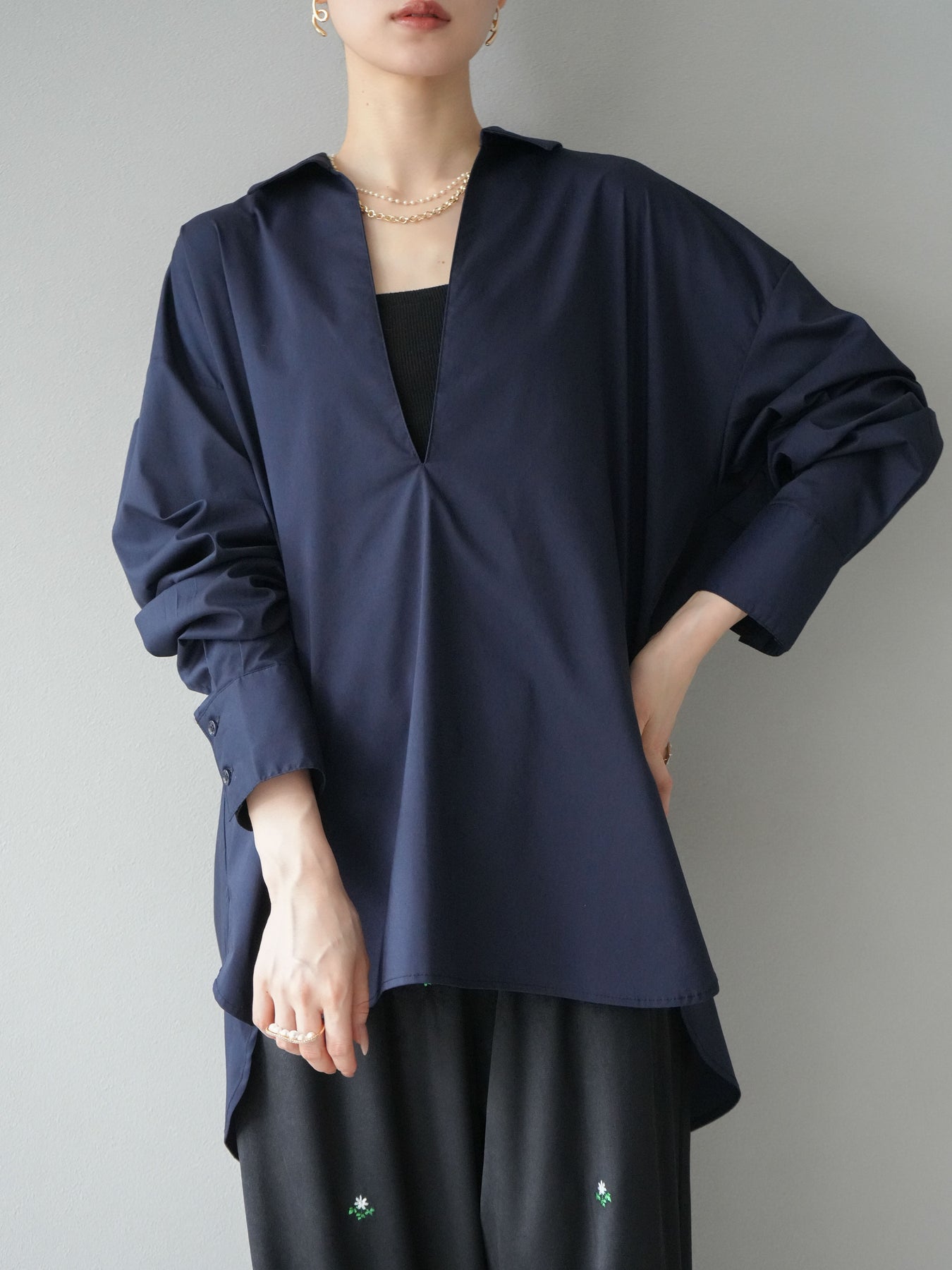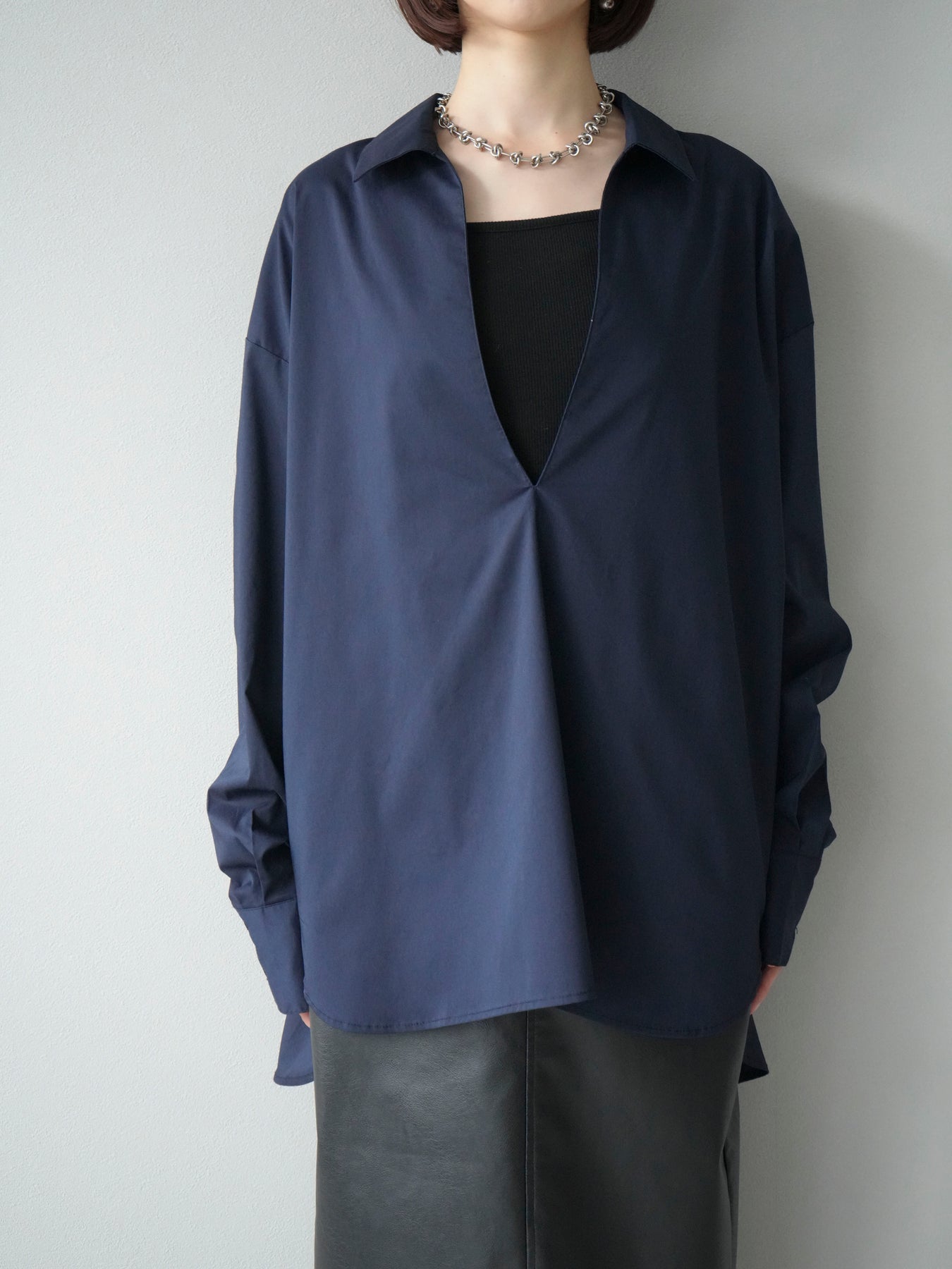 ハリ感のあるブロード素材を使用したディープスキッパーブラウス。深めに開いたスキッパーネックが抜け感を演出し、シンプルながらも洗練された大人の雰囲気に仕上げています。ゆったりとしたオーバーシルエットがリラックス感を与えつつ、前後差のある着丈でスタイルアップ効果も期待できる一枚。パンツと合わせてシャープにまとめるのはもちろん、スカートと合わせれば女性らしいバランスに。インナーにキャミソールやシアートップスを重ねることで、表情豊かなレイヤードスタイルも楽しめます。 ※ボトムス、キャミソール(インナー)以外の商品は一律でインナーは付属していません。