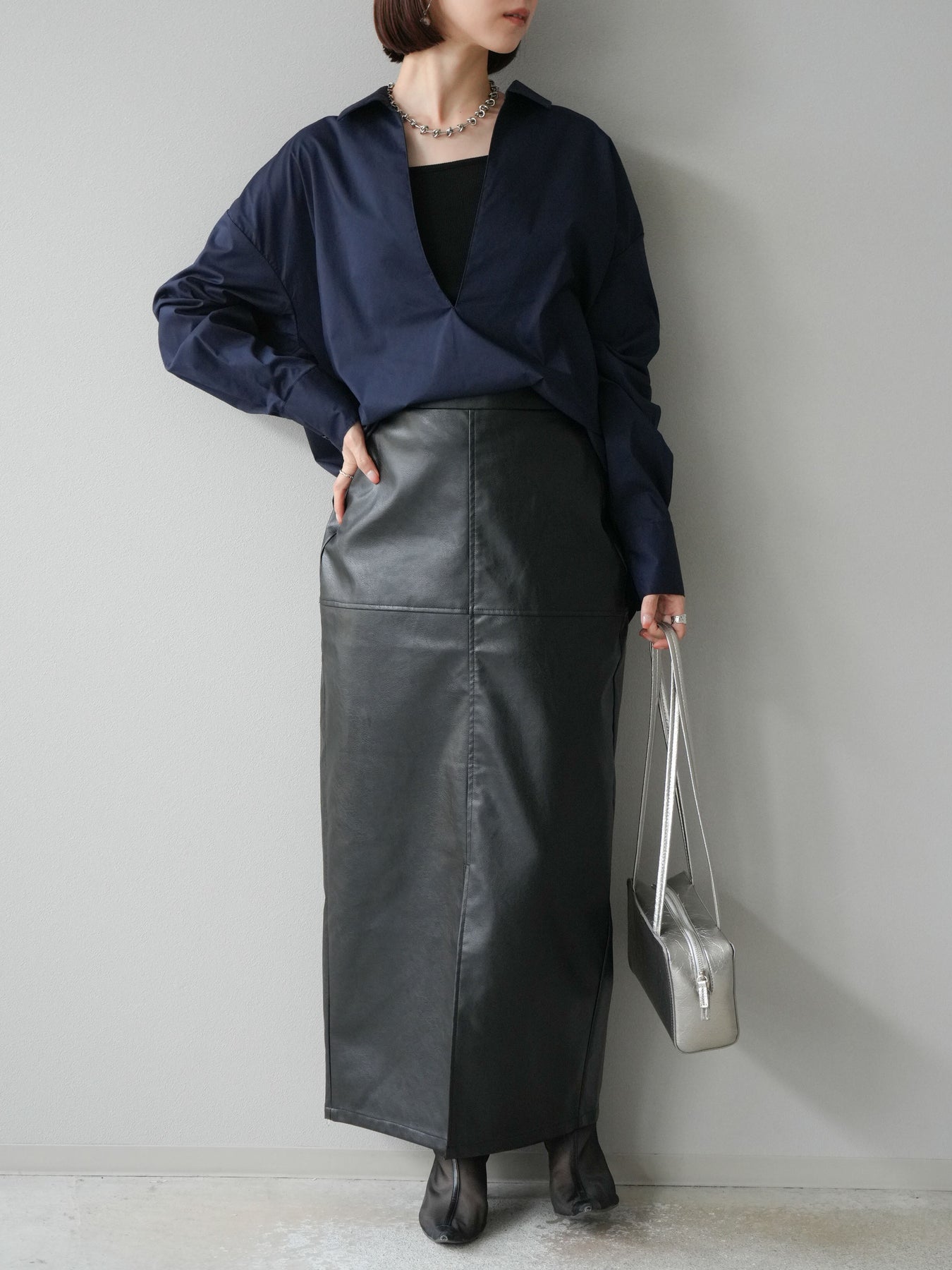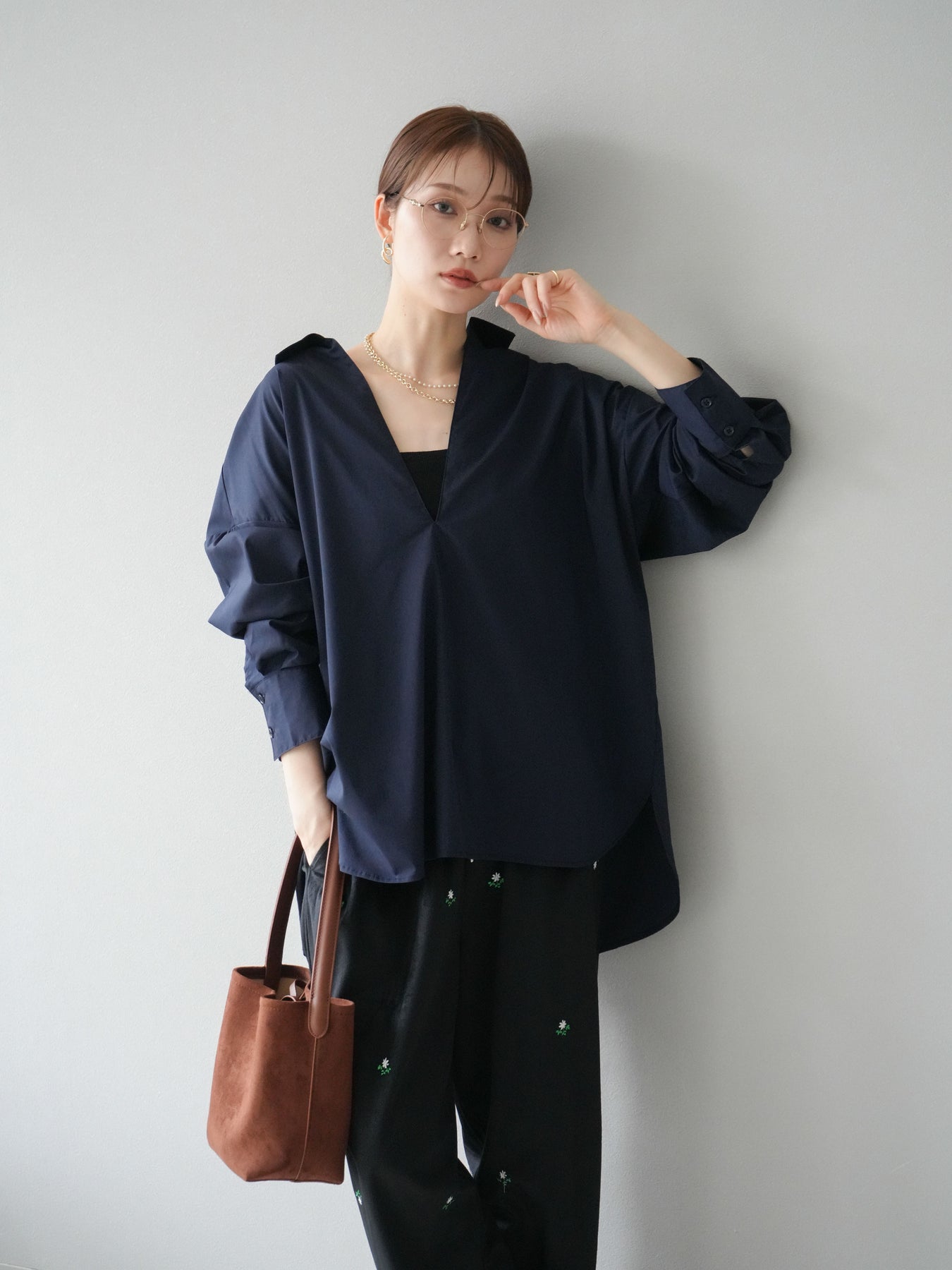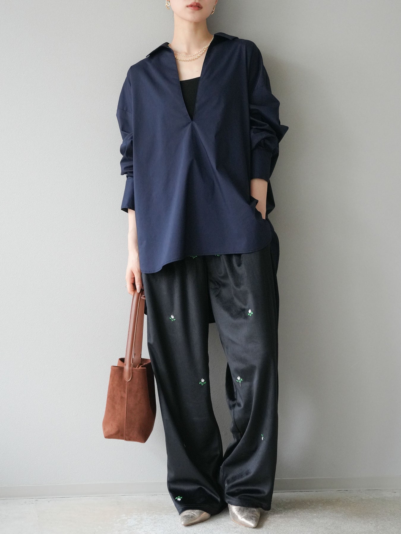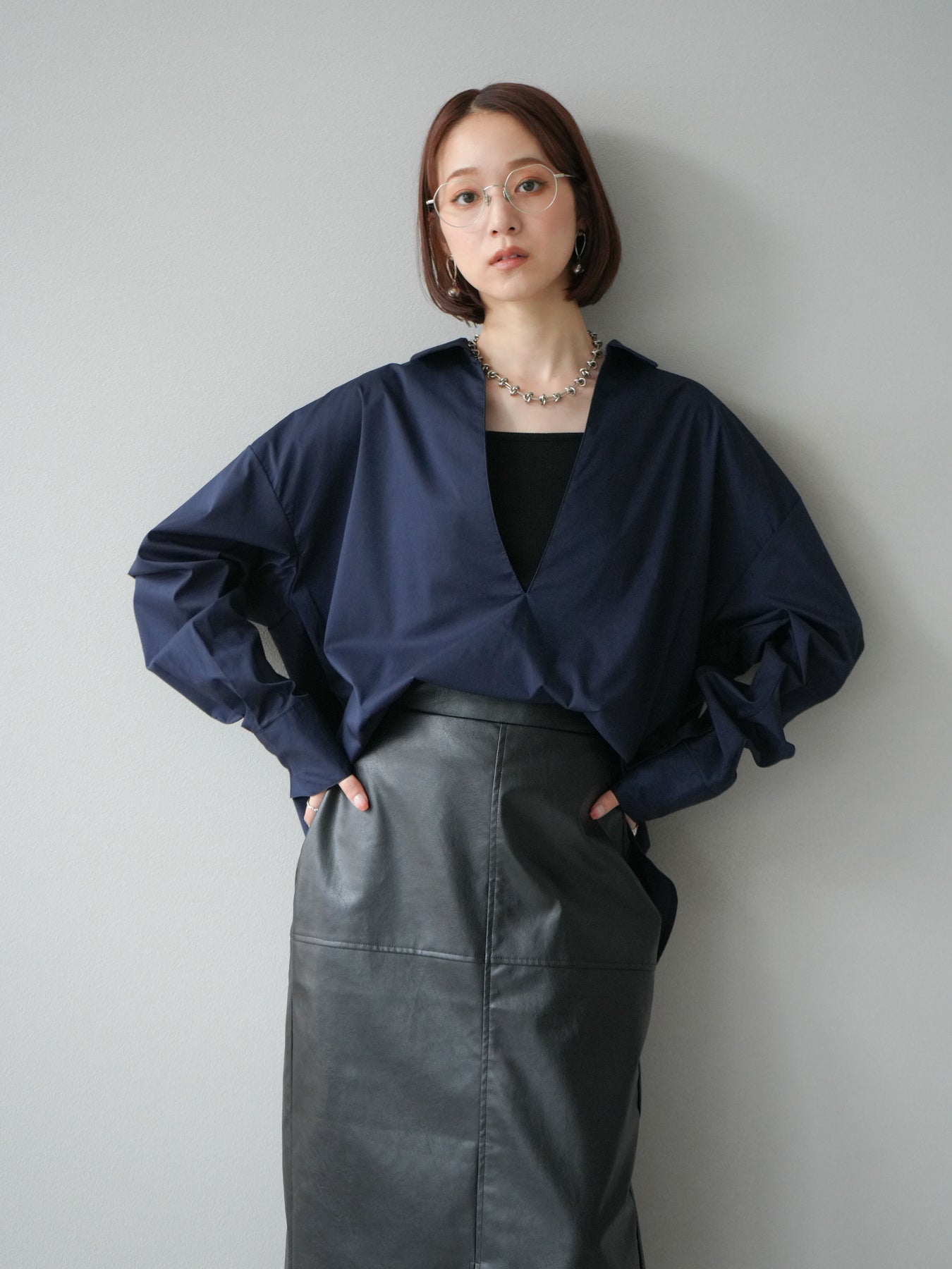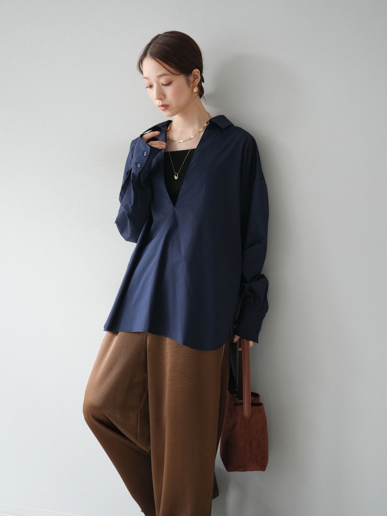 ハリ感のあるブロード素材を使用したディープスキッパーブラウス。深めに開いたスキッパーネックが抜け感を演出し、シンプルながらも洗練された大人の雰囲気に仕上げています。ゆったりとしたオーバーシルエットがリラックス感を与えつつ、前後差のある着丈でスタイルアップ効果も期待できる一枚。パンツと合わせてシャープにまとめるのはもちろん、スカートと合わせれば女性らしいバランスに。インナーにキャミソールやシアートップスを重ねることで、表情豊かなレイヤードスタイルも楽しめます。 ※ボトムス、キャミソール(インナー)以外の商品は一律でインナーは付属していません。