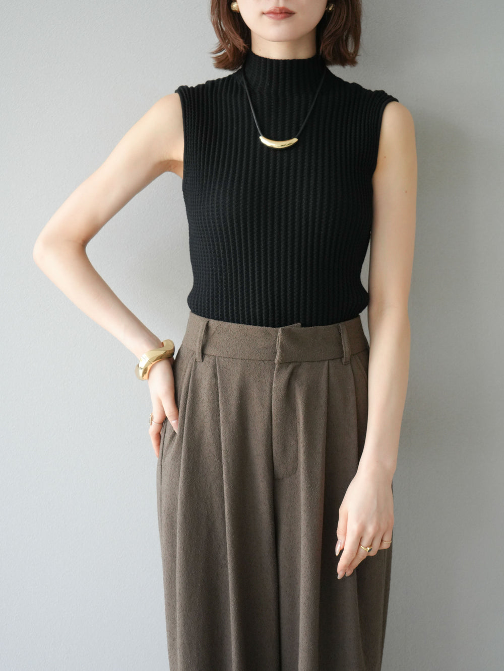 [予約]ボトルネックワッフル編みノースリーブニットトップス/ブラック