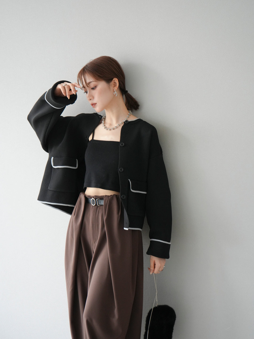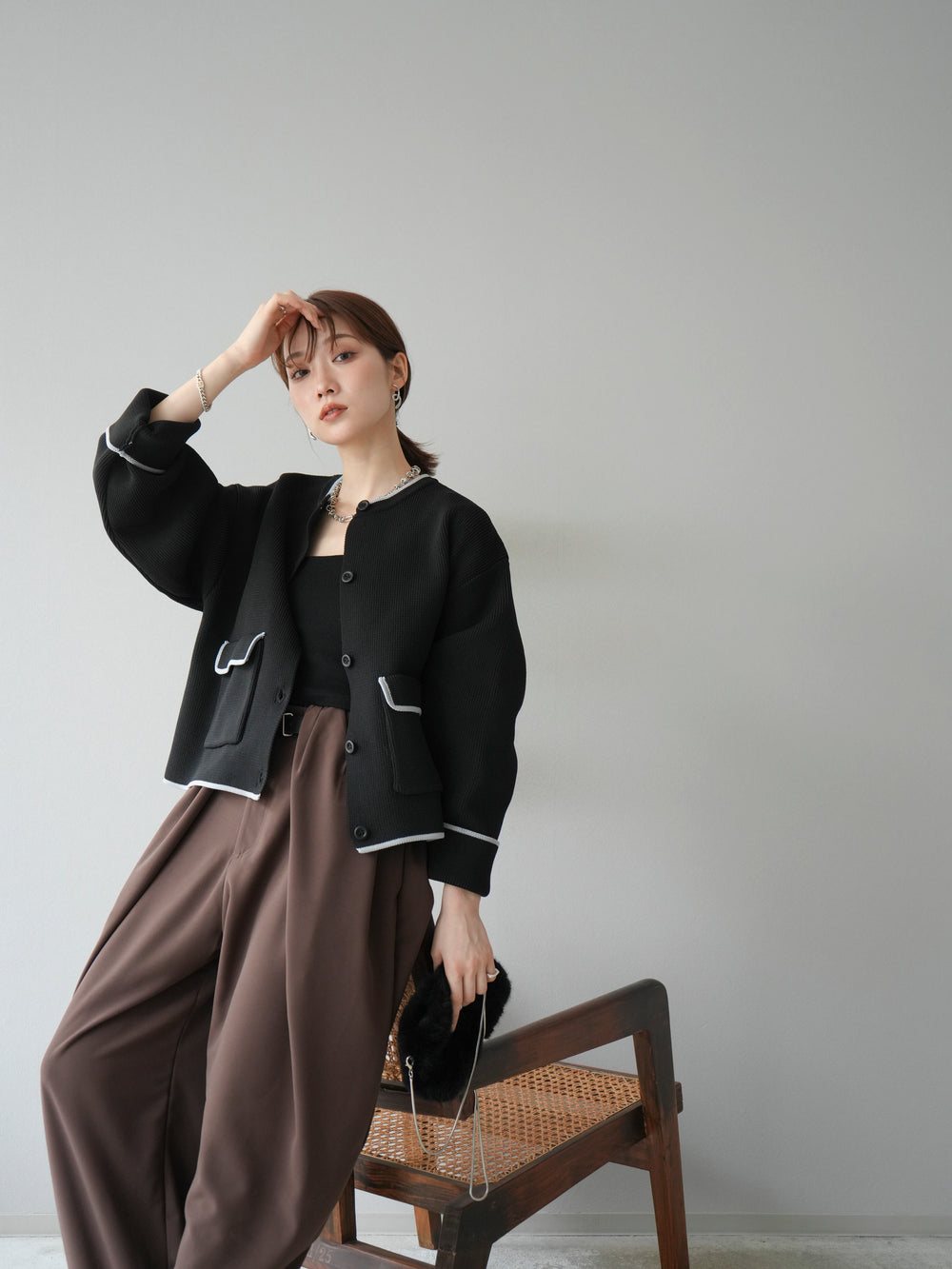[予約]ポリエステル配色クルーネックカーディガン/ブラック