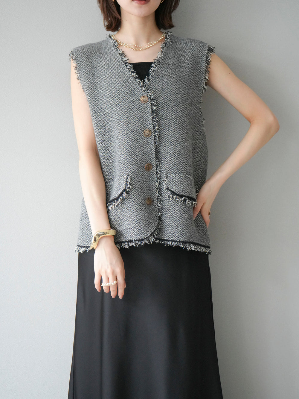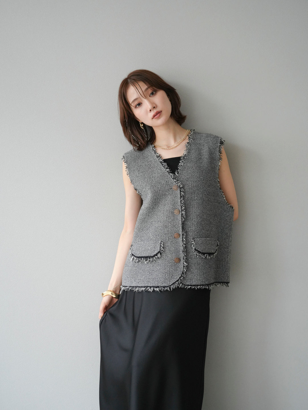 [予約]ツイードライクフリンジニットベスト/ブラック