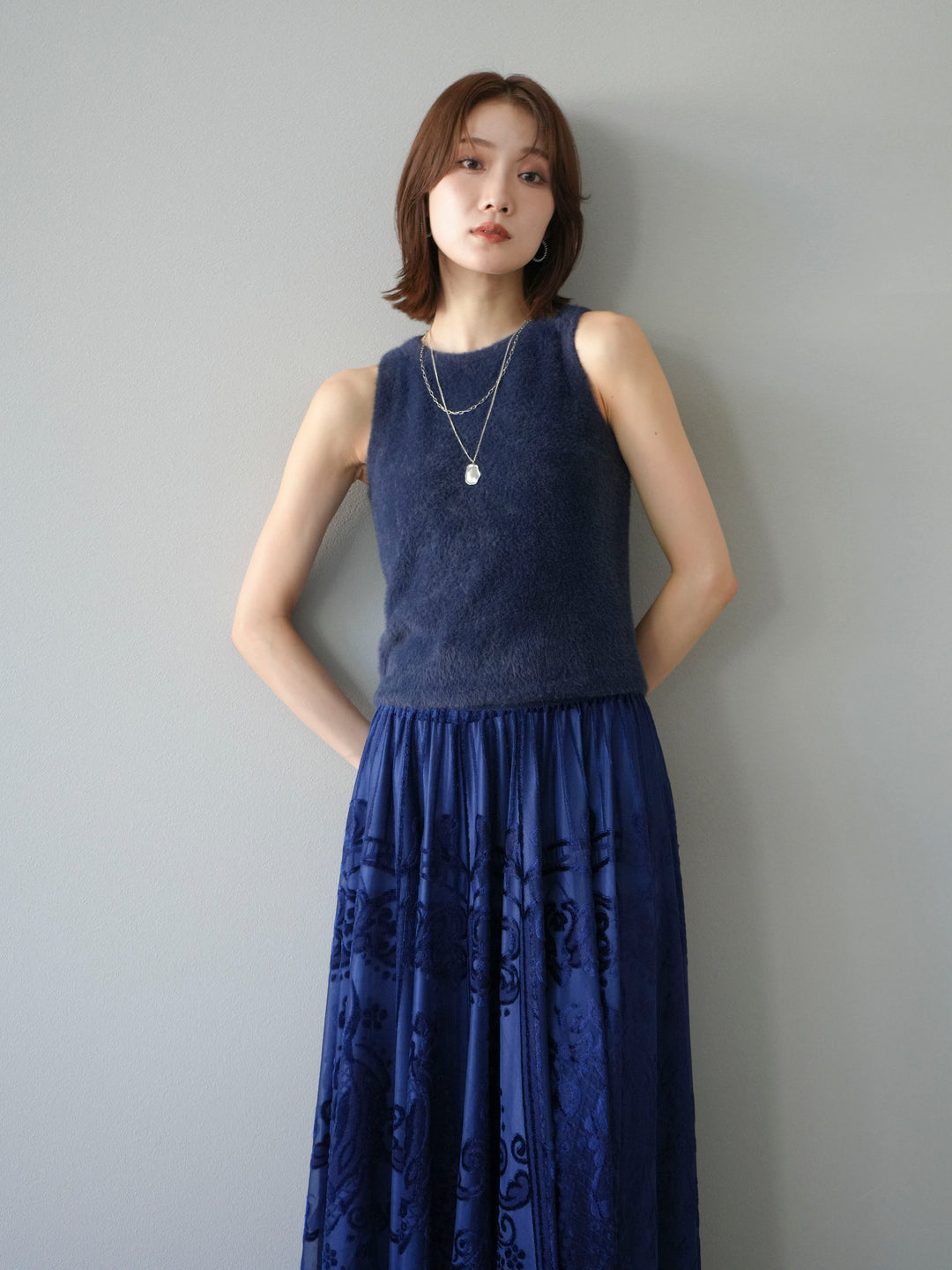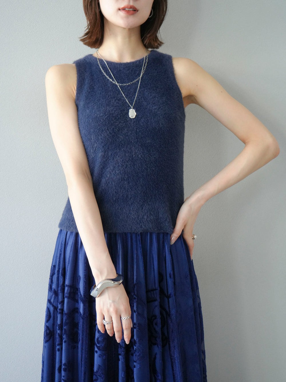 [予約]ボトルネックワッフル編みノースリーブニットトップス/ネイビー