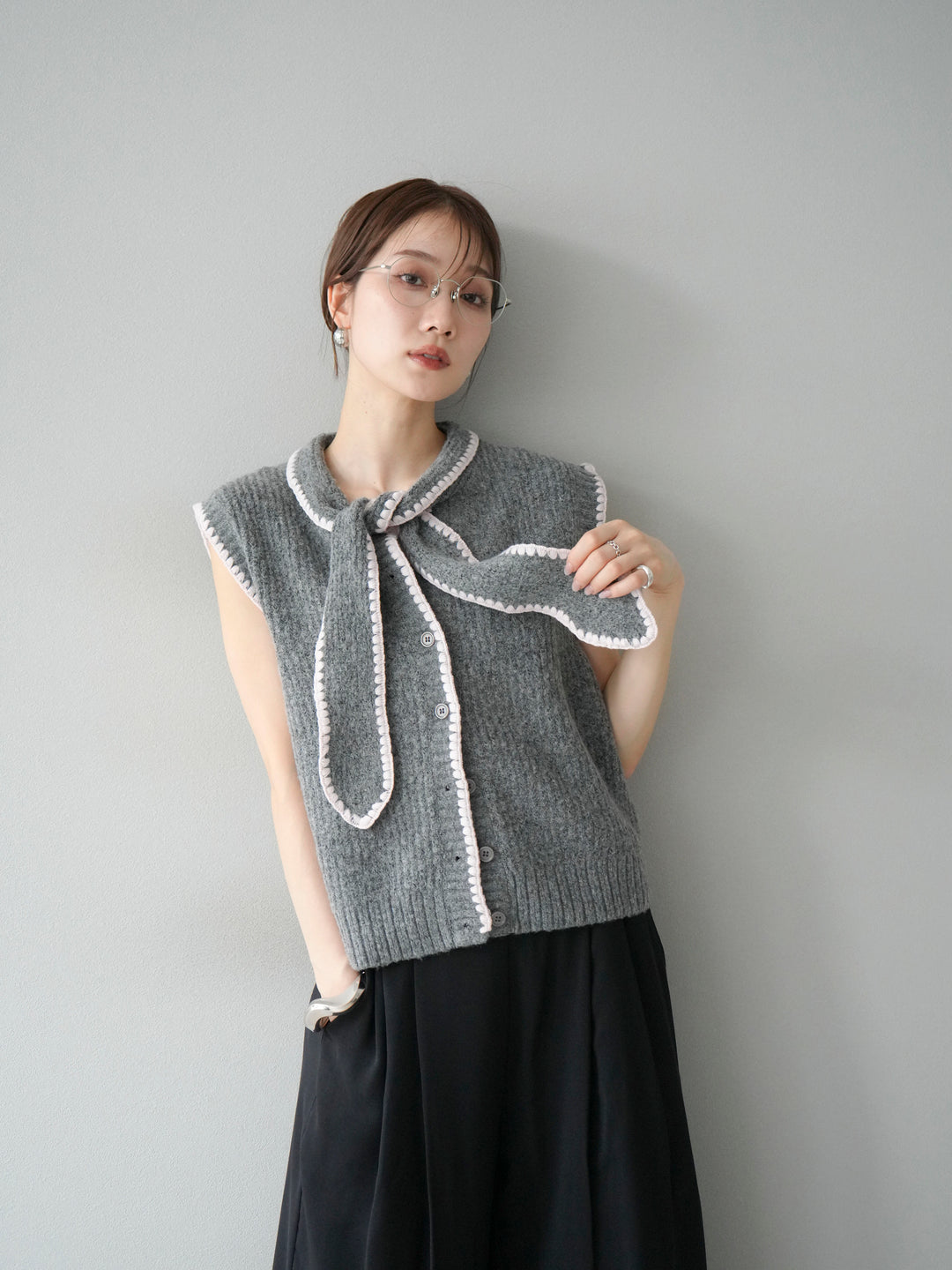 [予約]ステッチデザインボウタイニットベスト/グレー