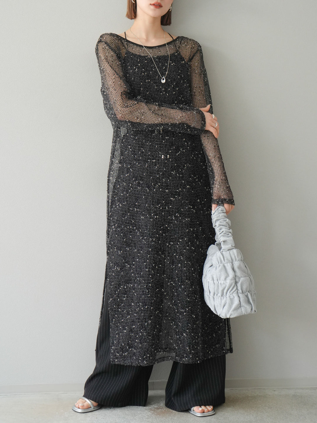 [予約]キャンディースリーブカラーネップスパンコールニットプルオーバー/navy