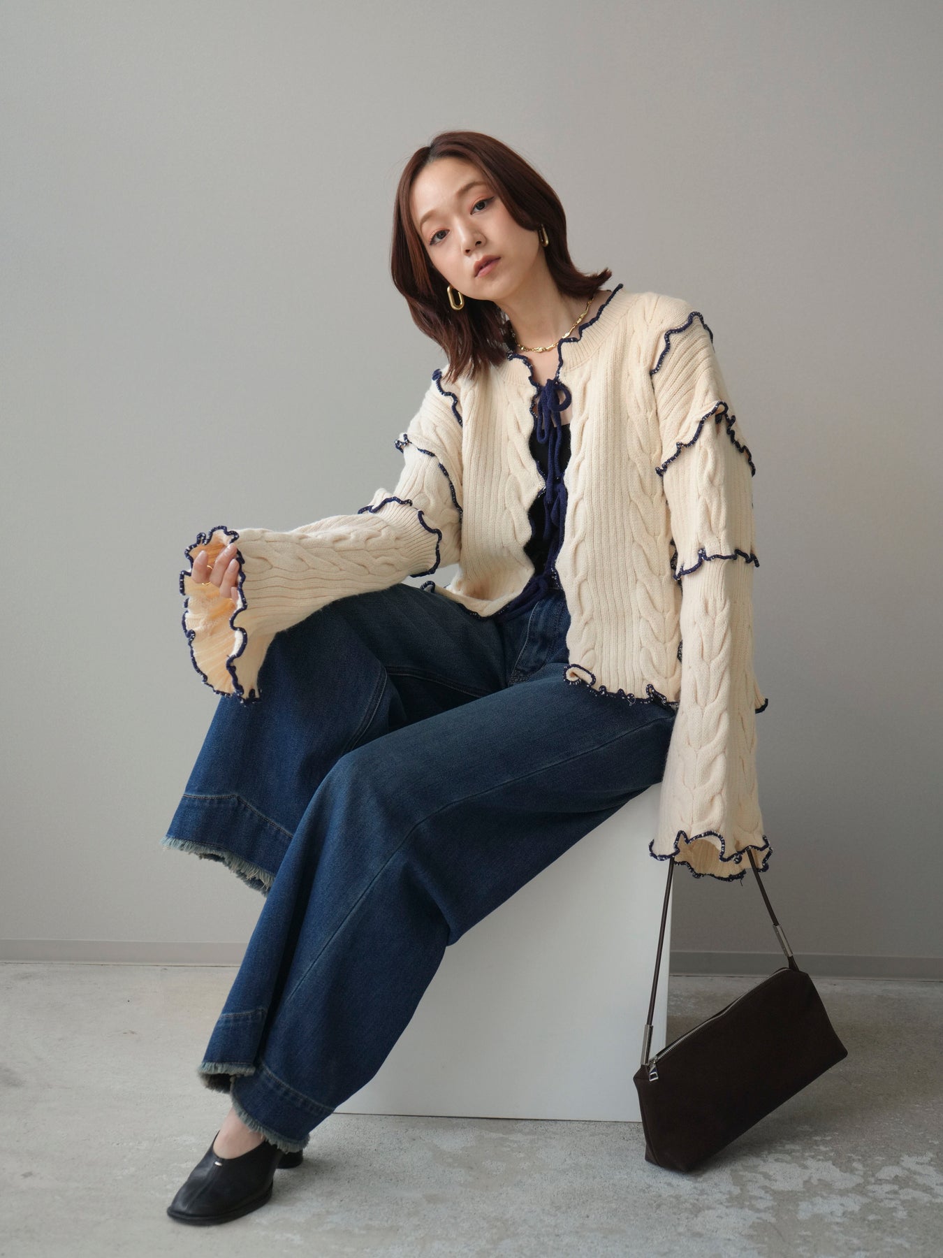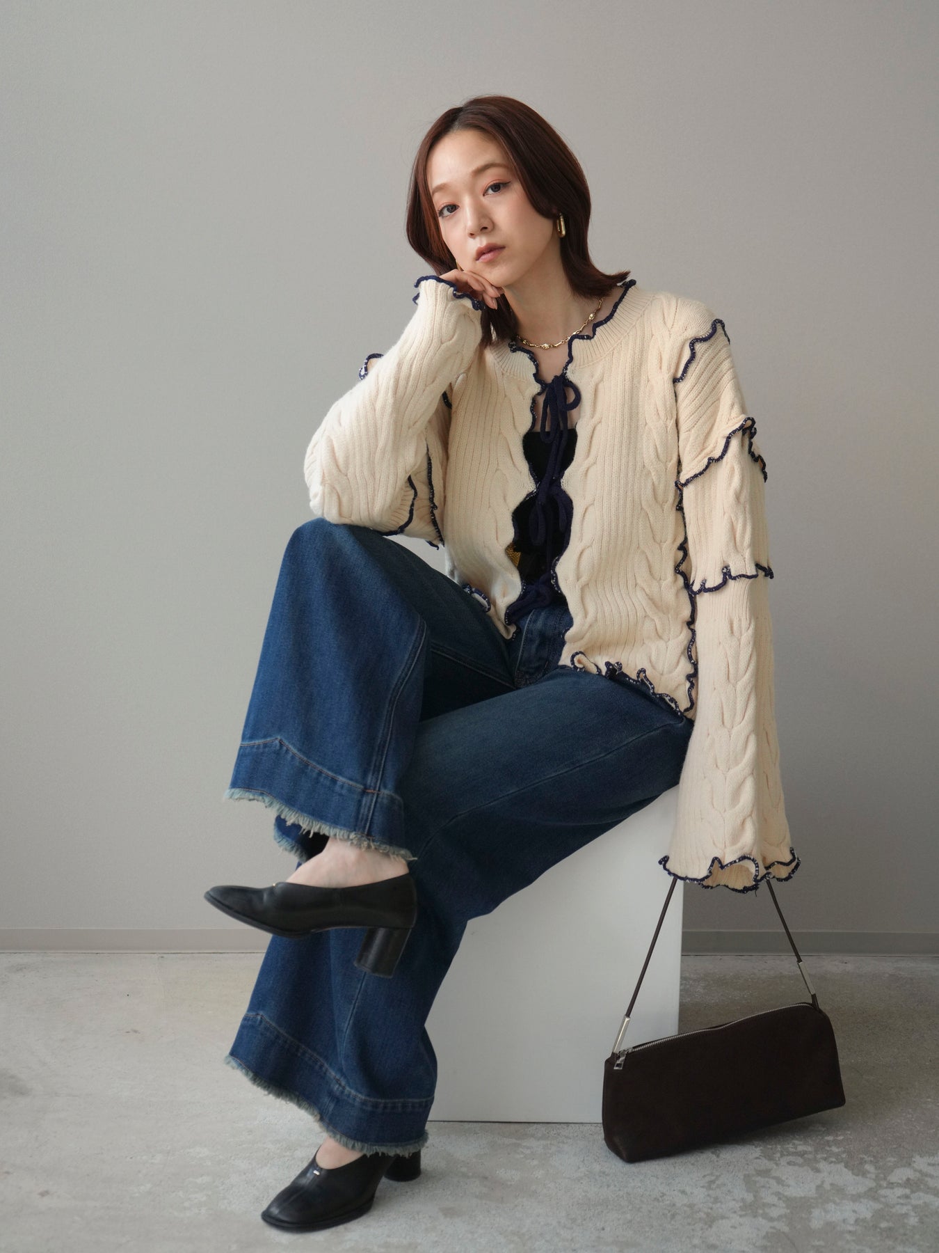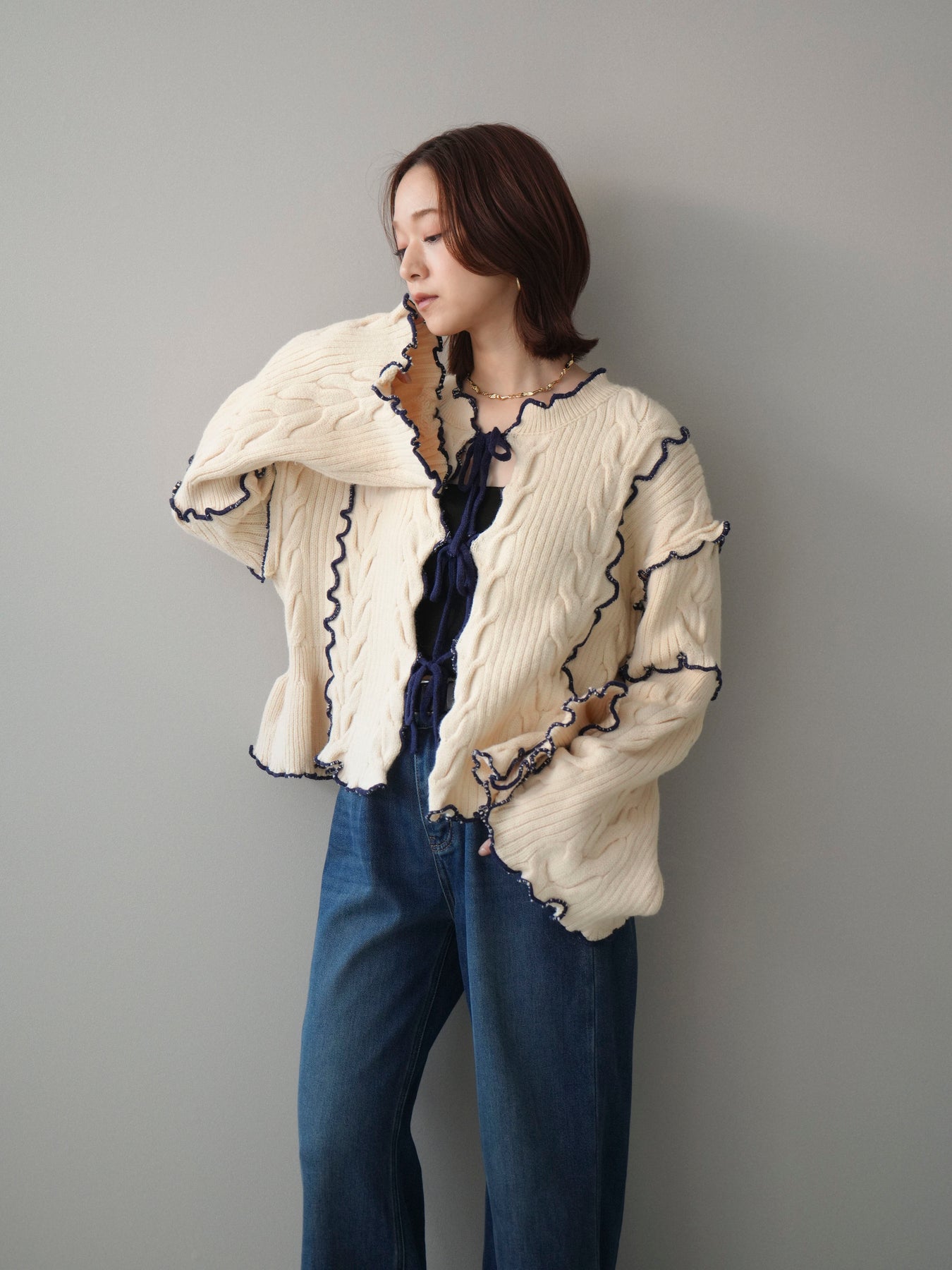 配色メローが印象的な、デザイン性の高いニットカーディガン。 縁取りのように施されたメローディテールが全体に動きを与え、さりげなく甘さをプラスします。 フロントのリボンデザインがポイントとなり、シンプルなコーディネートにアクセントを添えてくれる一着。 程よくフィット感のあるシルエットで、レイヤードしやすく、バランスの取りやすさも魅力です。 デイリーからトレンド感のあるスタイリングまで、幅広く楽しめるアイテムです。