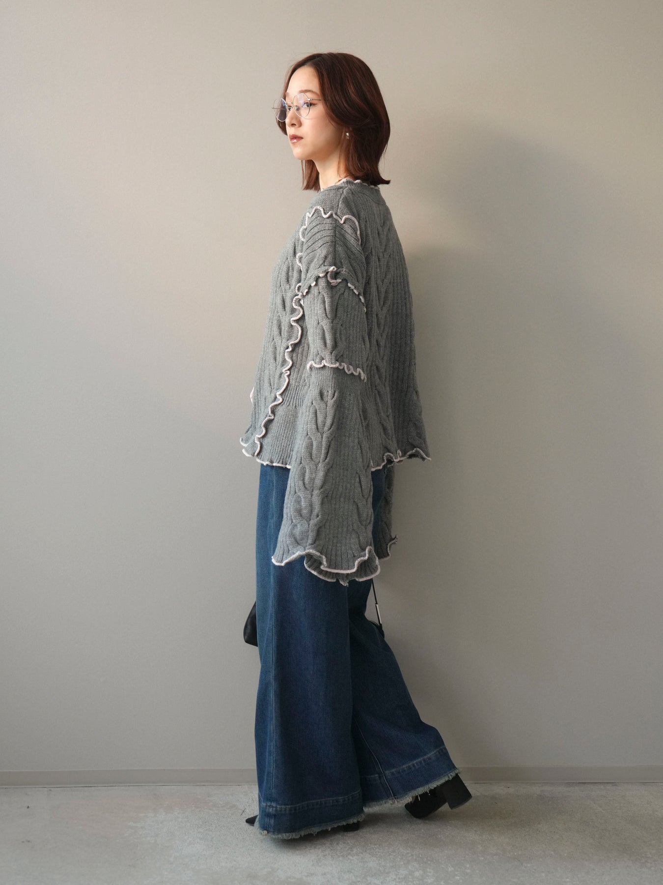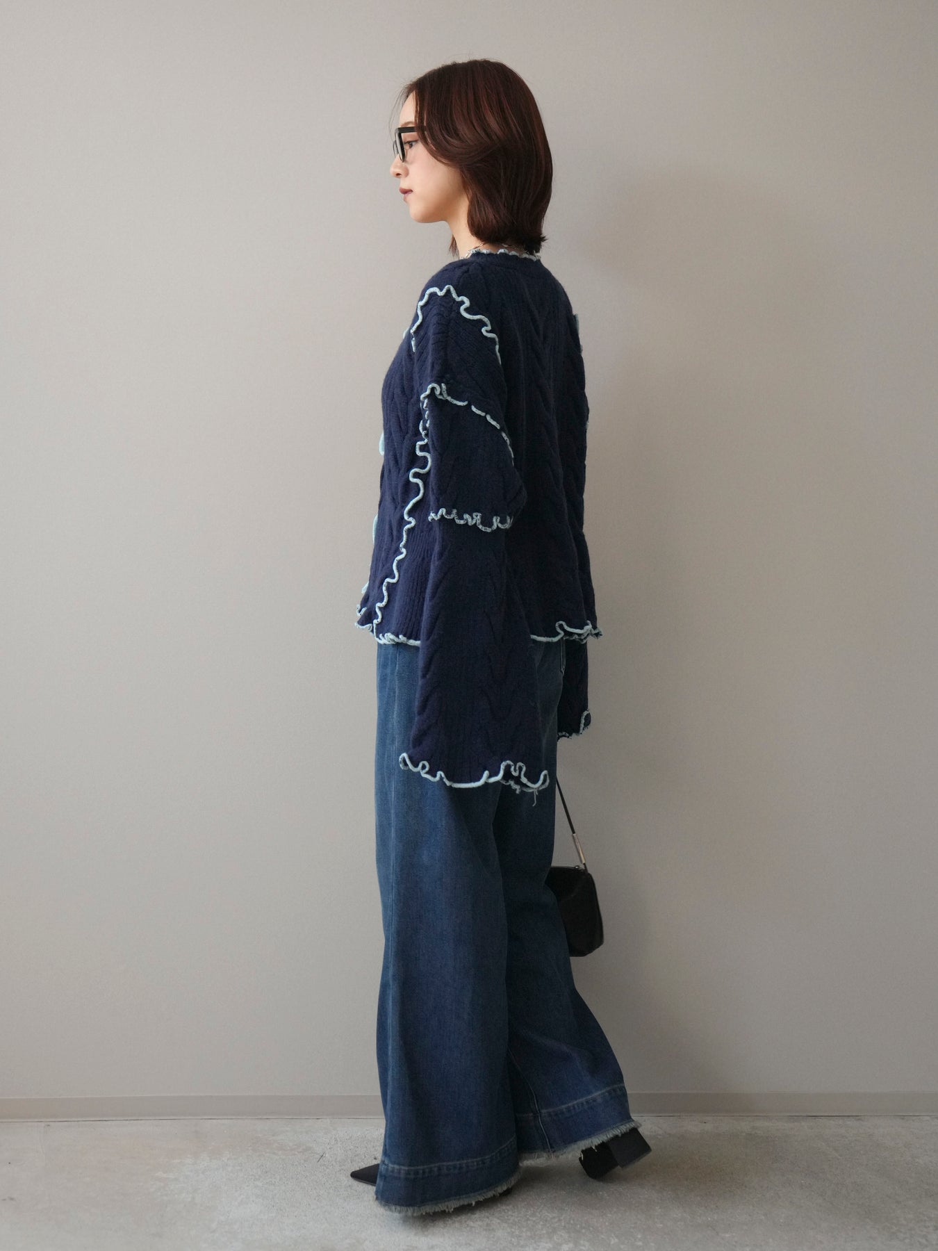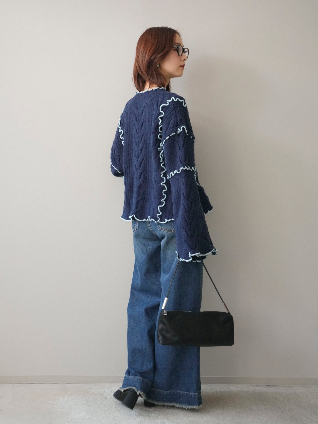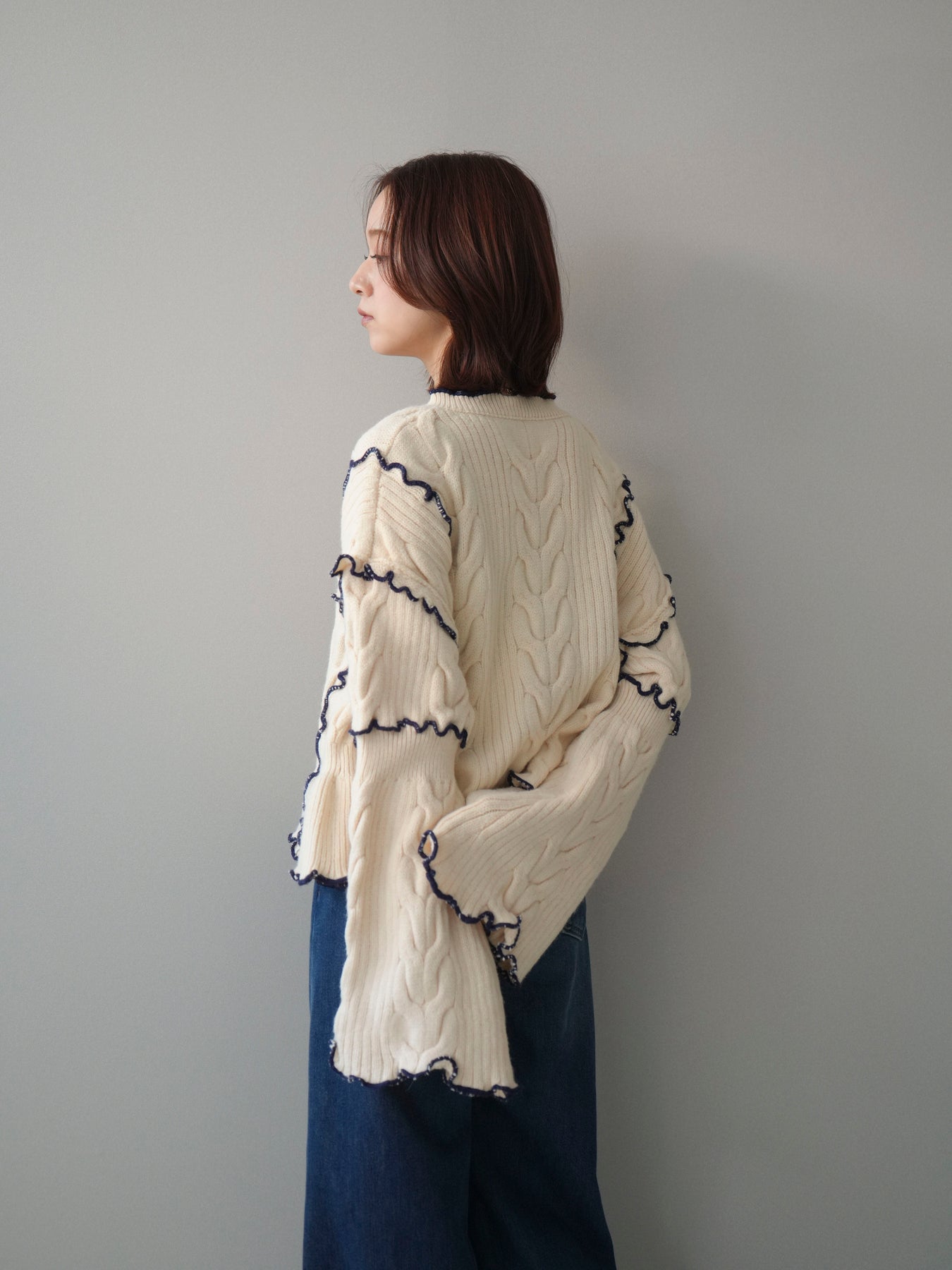 配色メローが印象的な、デザイン性の高いニットカーディガン。 縁取りのように施されたメローディテールが全体に動きを与え、さりげなく甘さをプラスします。 フロントのリボンデザインがポイントとなり、シンプルなコーディネートにアクセントを添えてくれる一着。 程よくフィット感のあるシルエットで、レイヤードしやすく、バランスの取りやすさも魅力です。 デイリーからトレンド感のあるスタイリングまで、幅広く楽しめるアイテムです。