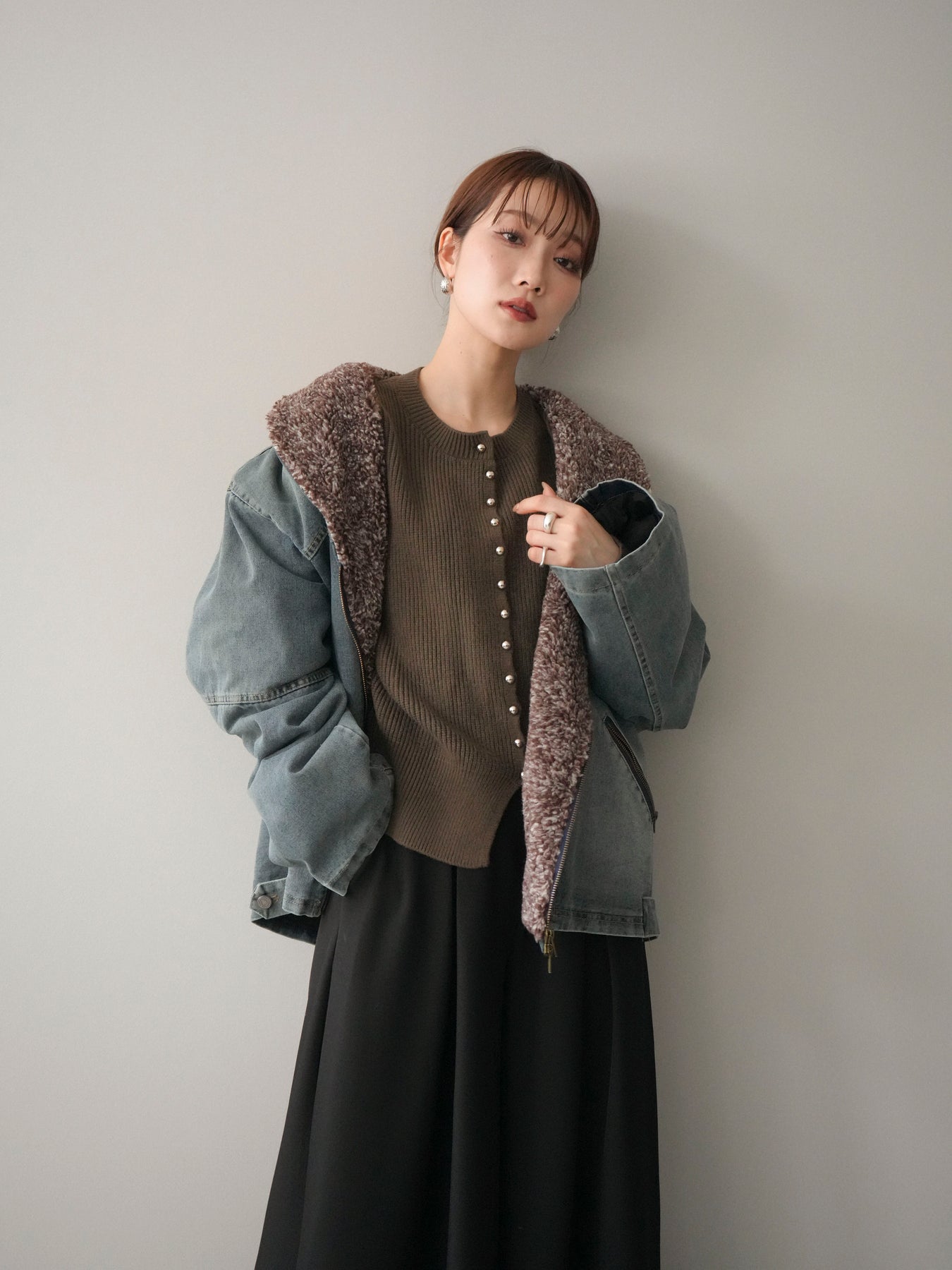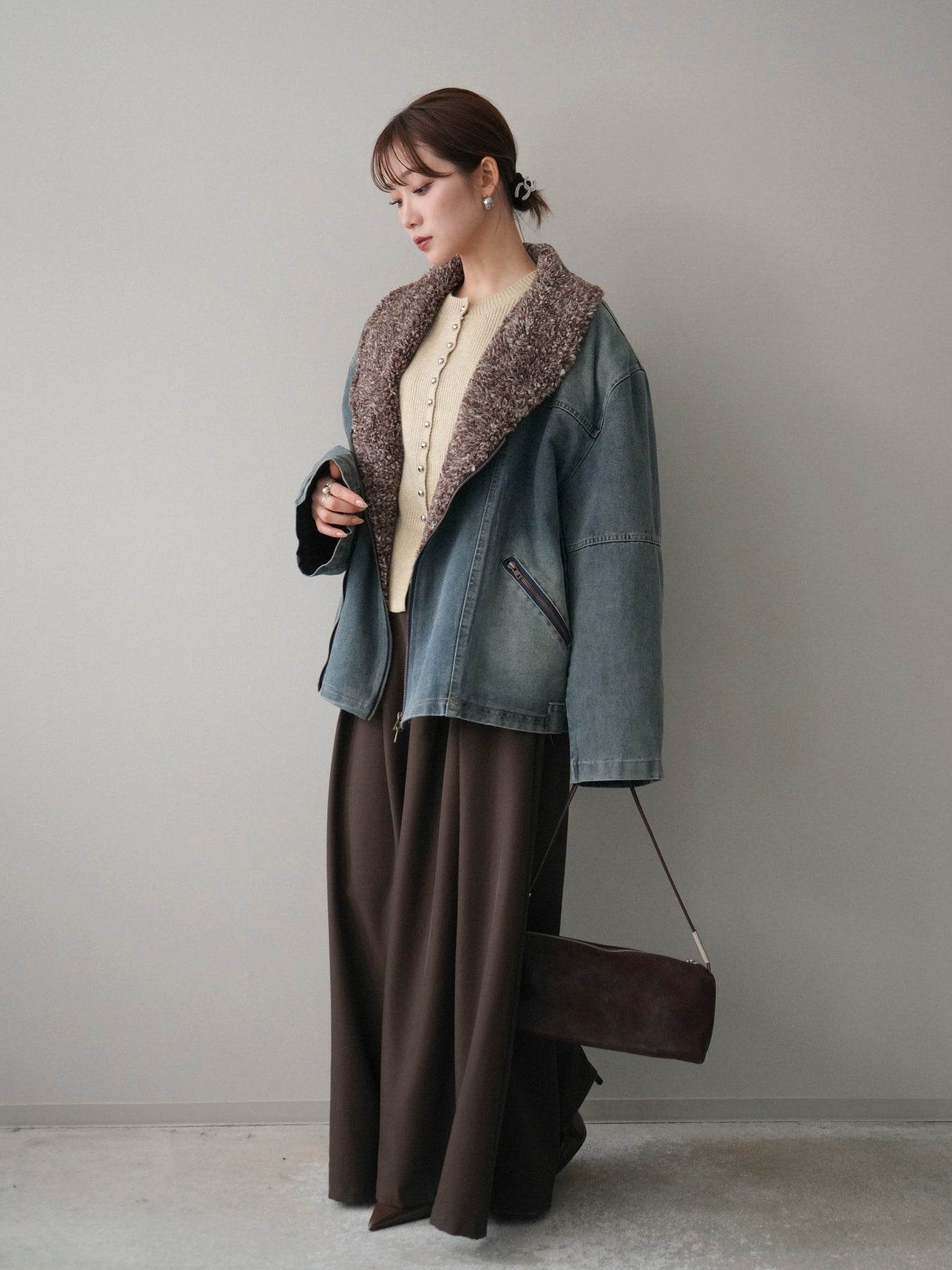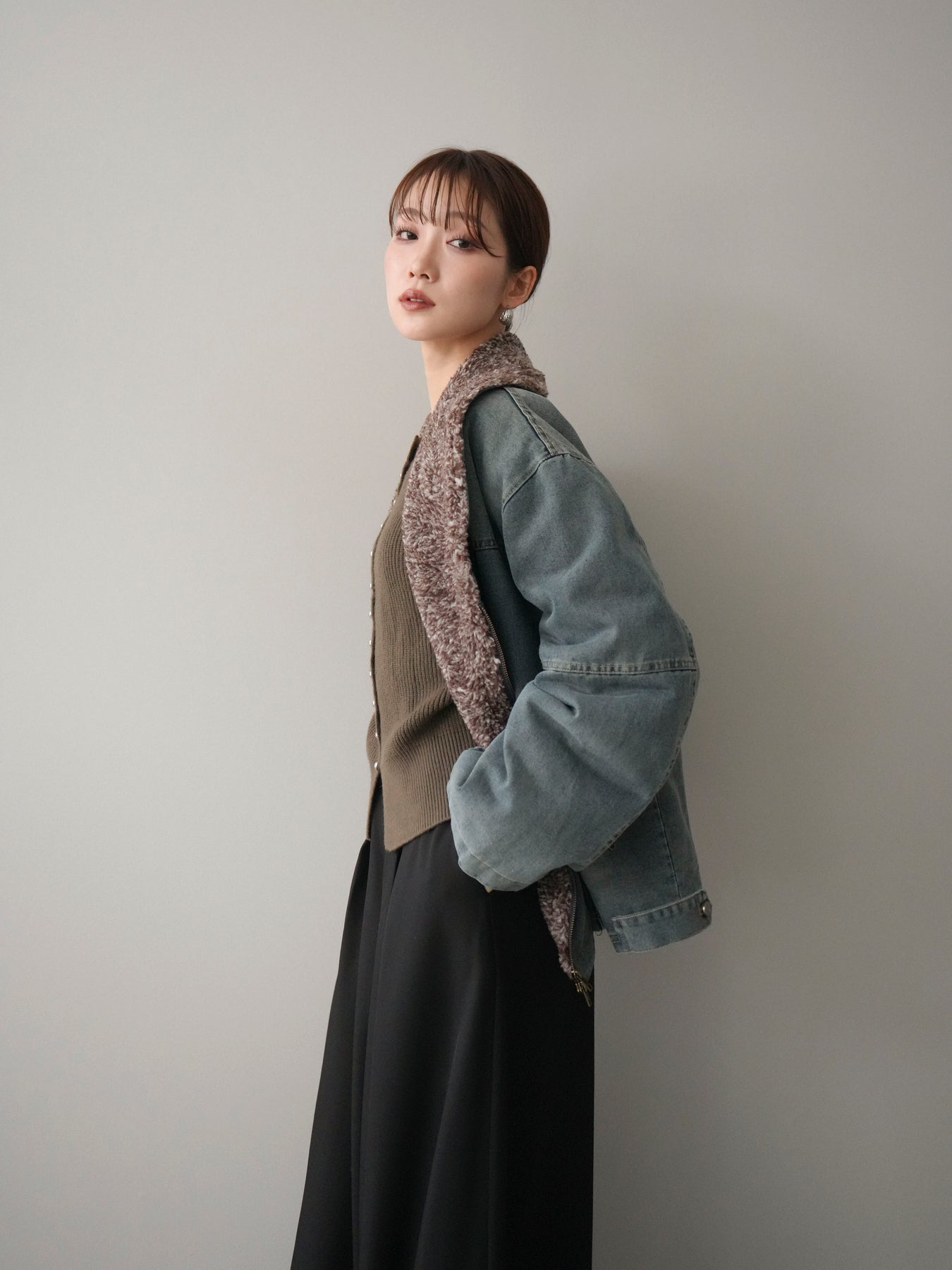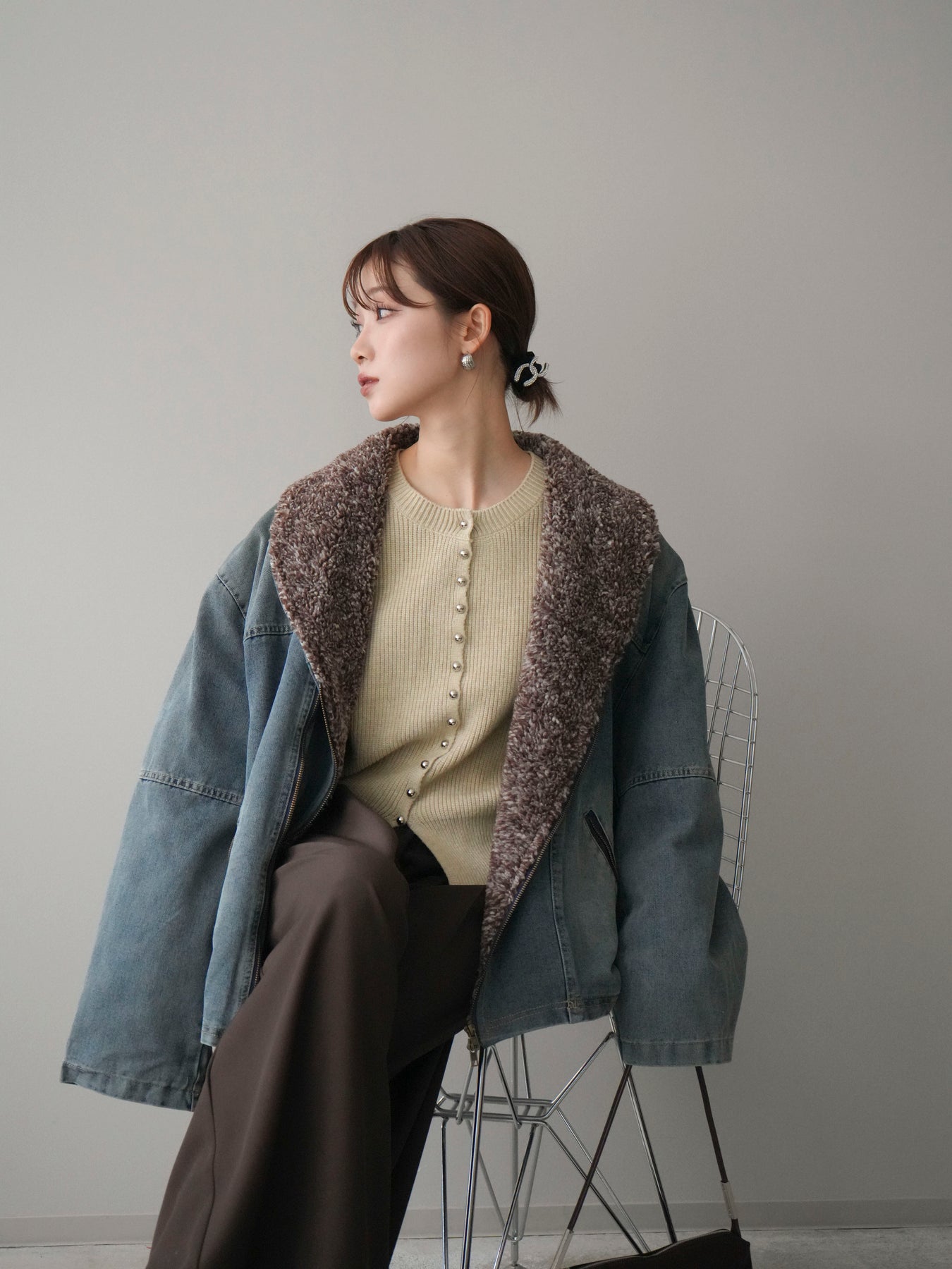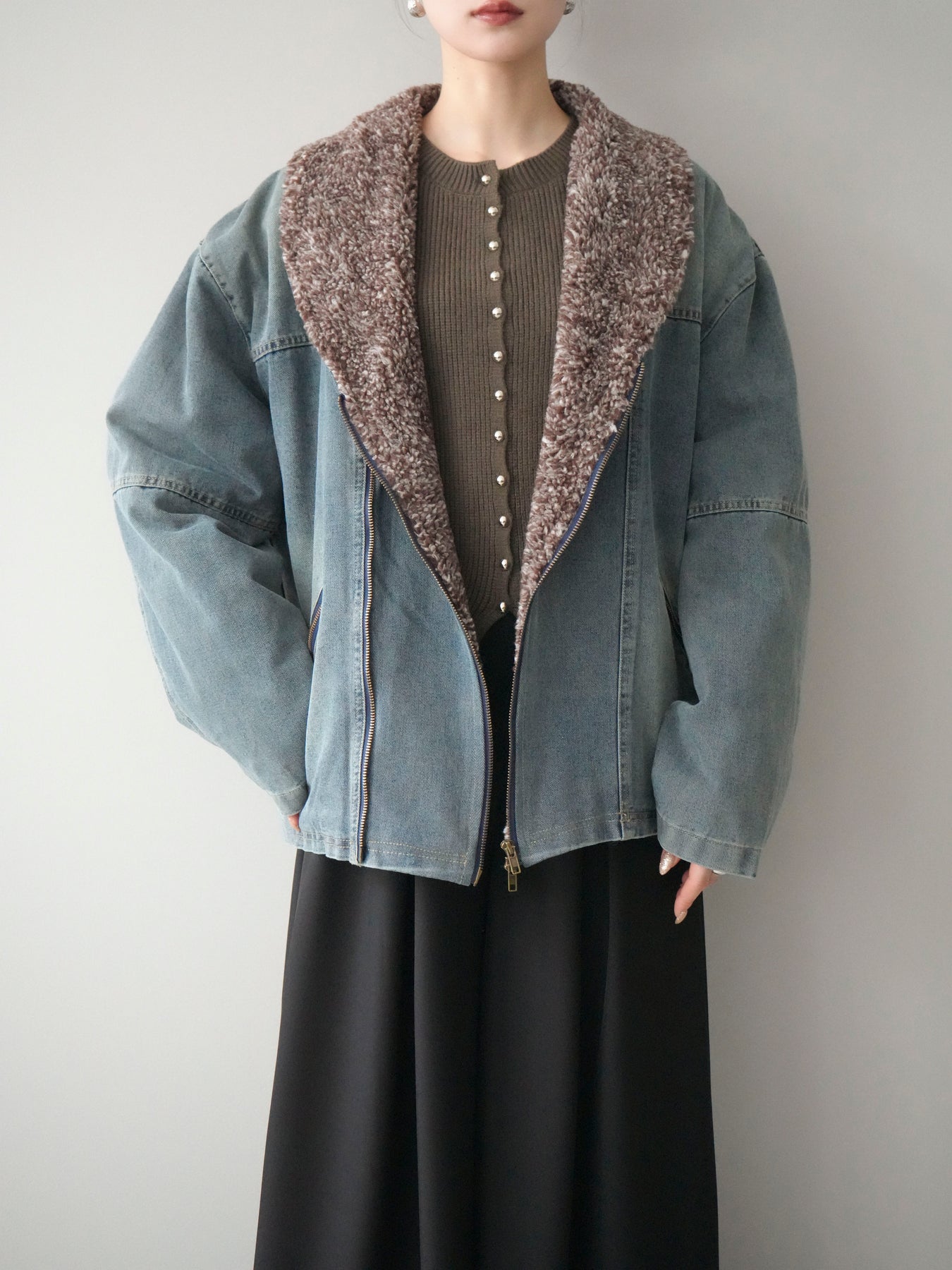 デニムのカジュアルさに、ミックス感のあるボアを組み合わせた存在感のあるジャケット。 異素材のコントラストがコーディネートに奥行きを与え、羽織るだけで季節感のあるスタイリングが完成します。 衿元のボアが顔まわりをやさしく包み込み、ほどよいボリューム感がアクセントに。 全体はすっきりとしたバランスで、パンツにもスカートにも合わせやすいのが魅力です。 デイリー使いはもちろん、秋冬の主役アウターとして活躍する一着です。
