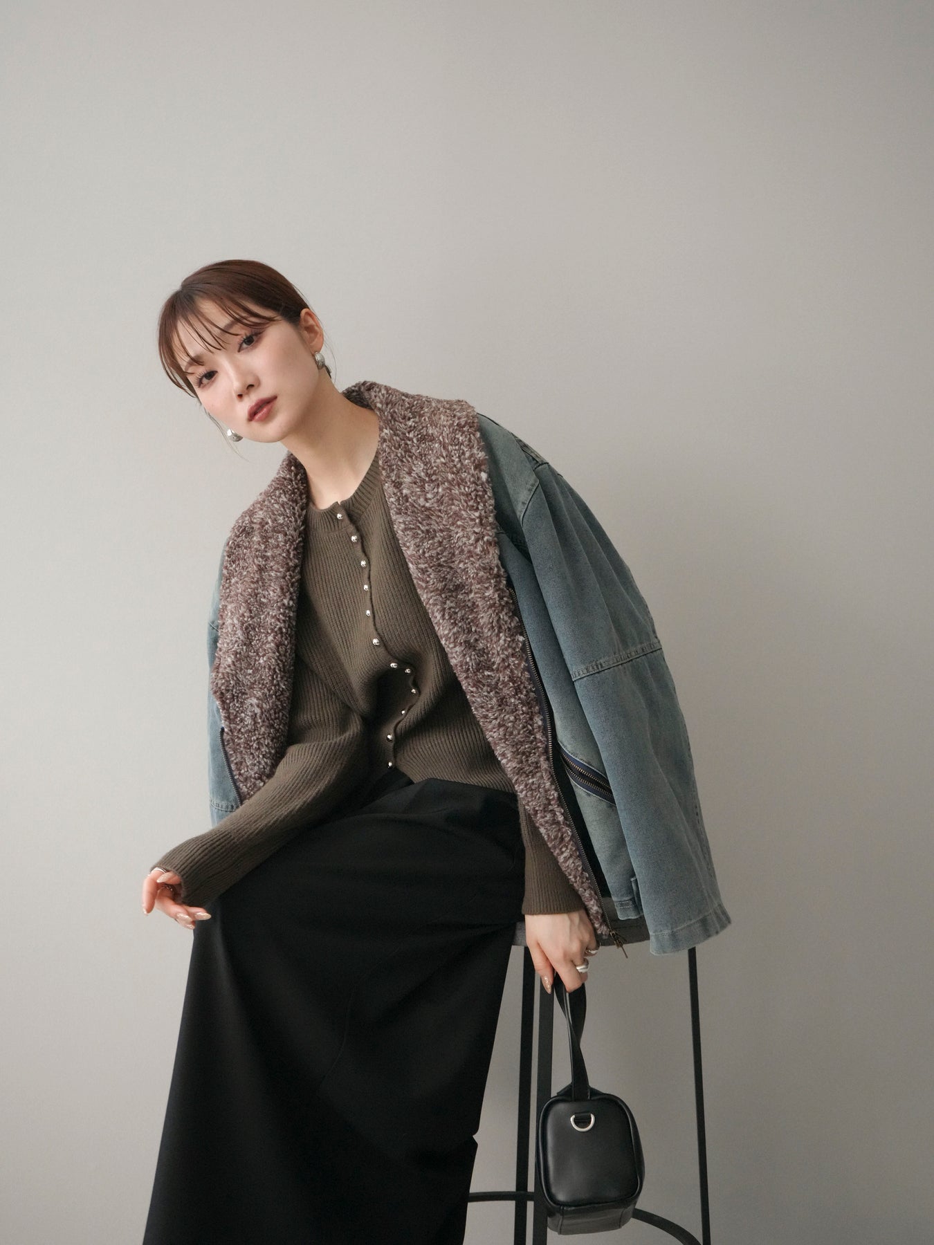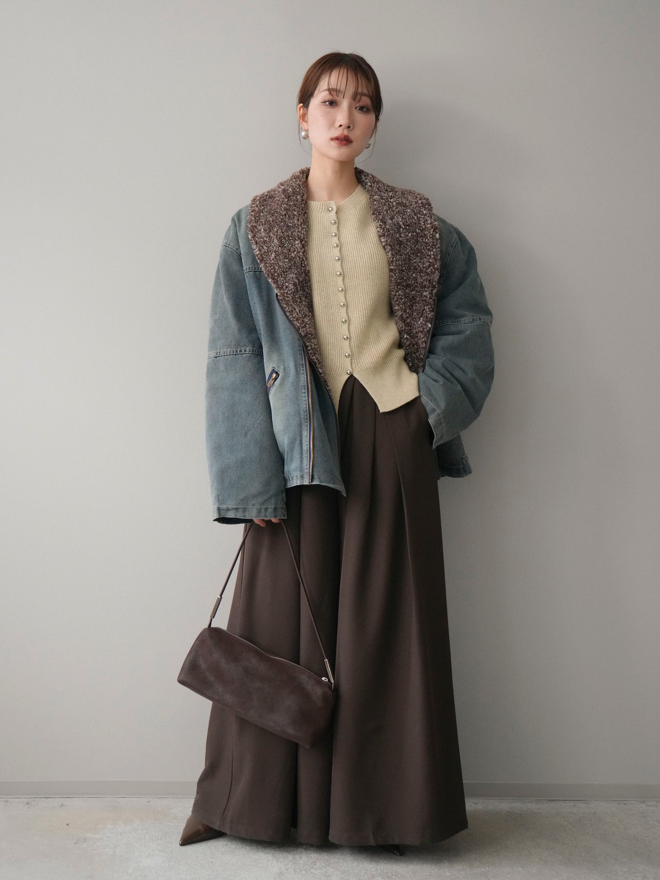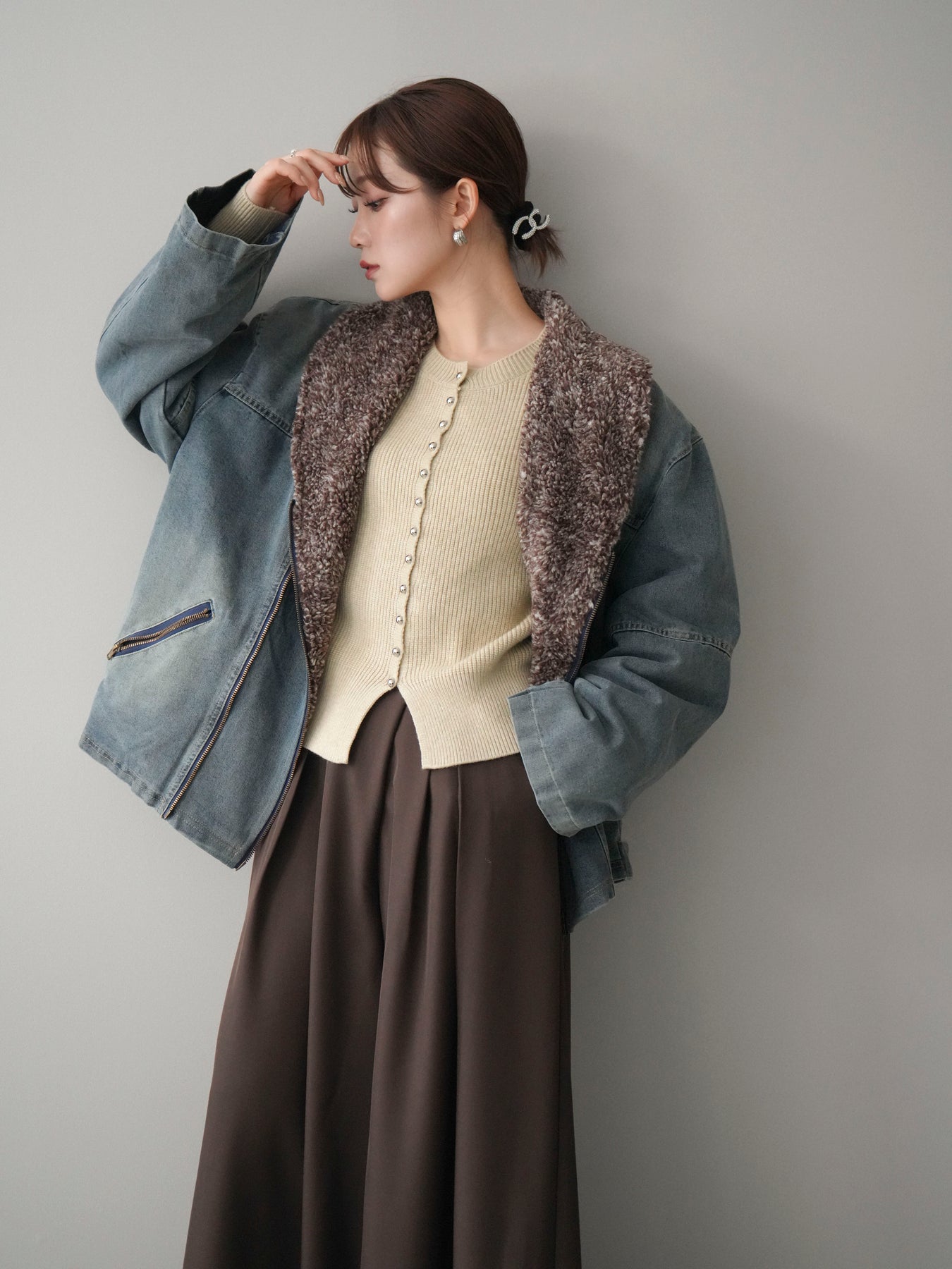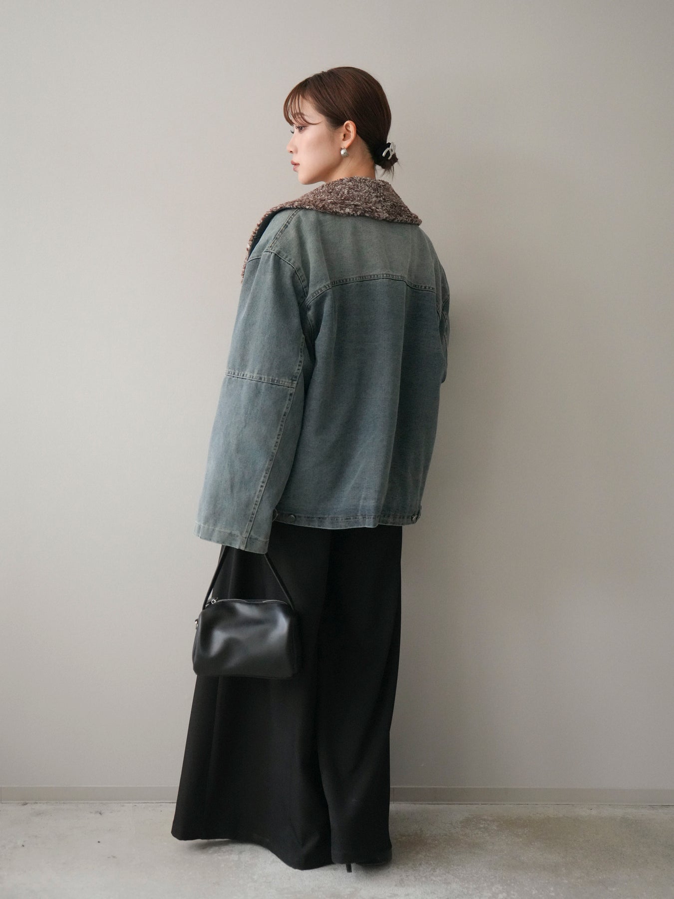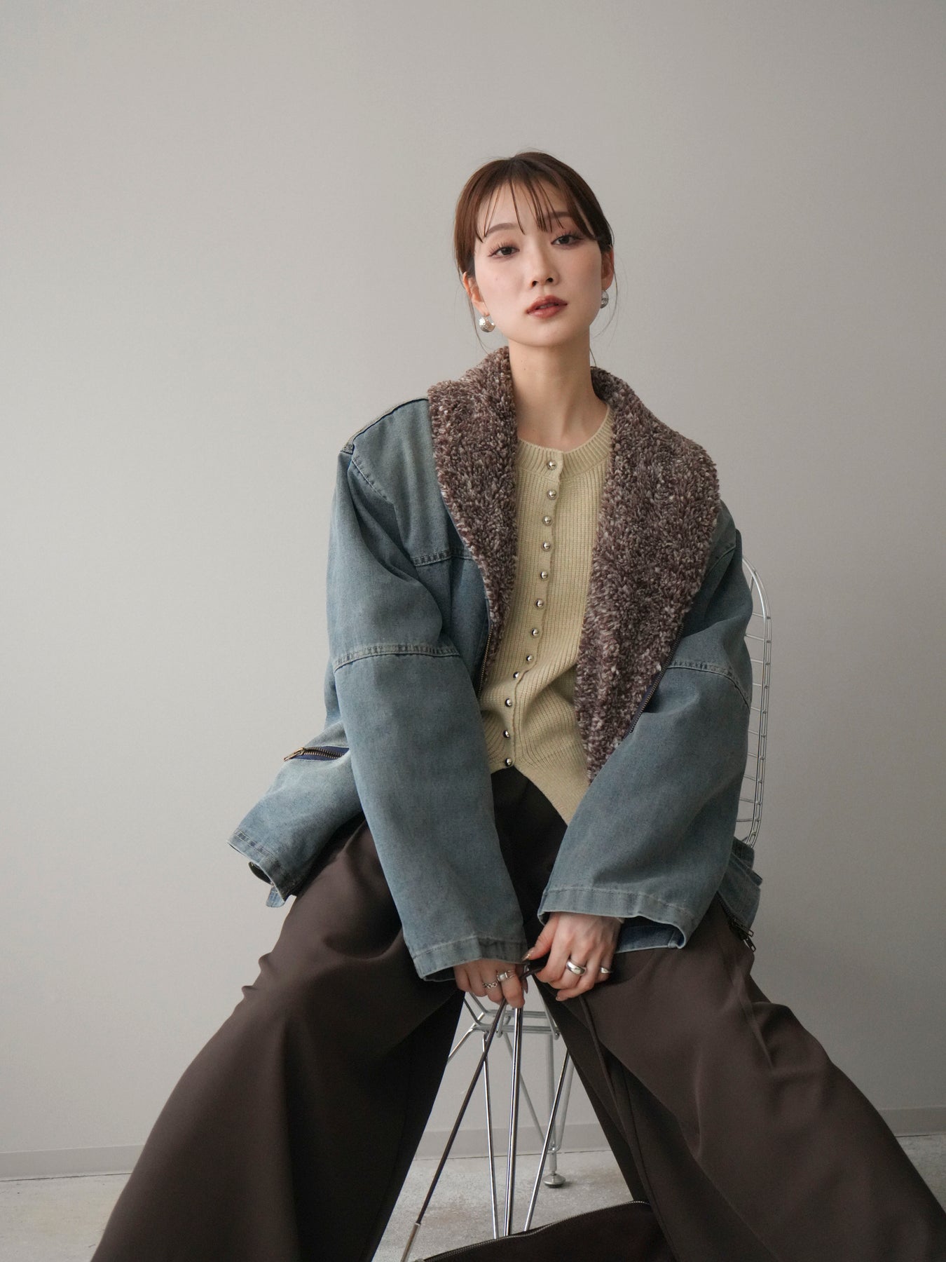 デニムのカジュアルさに、ミックス感のあるボアを組み合わせた存在感のあるジャケット。 異素材のコントラストがコーディネートに奥行きを与え、羽織るだけで季節感のあるスタイリングが完成します。 衿元のボアが顔まわりをやさしく包み込み、ほどよいボリューム感がアクセントに。 全体はすっきりとしたバランスで、パンツにもスカートにも合わせやすいのが魅力です。 デイリー使いはもちろん、秋冬の主役アウターとして活躍する一着です。
