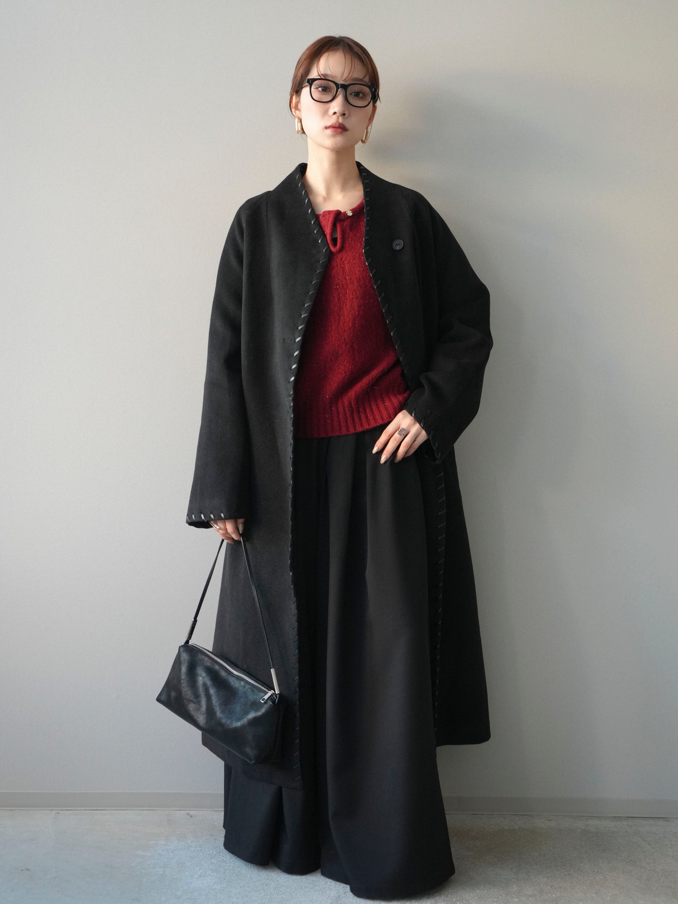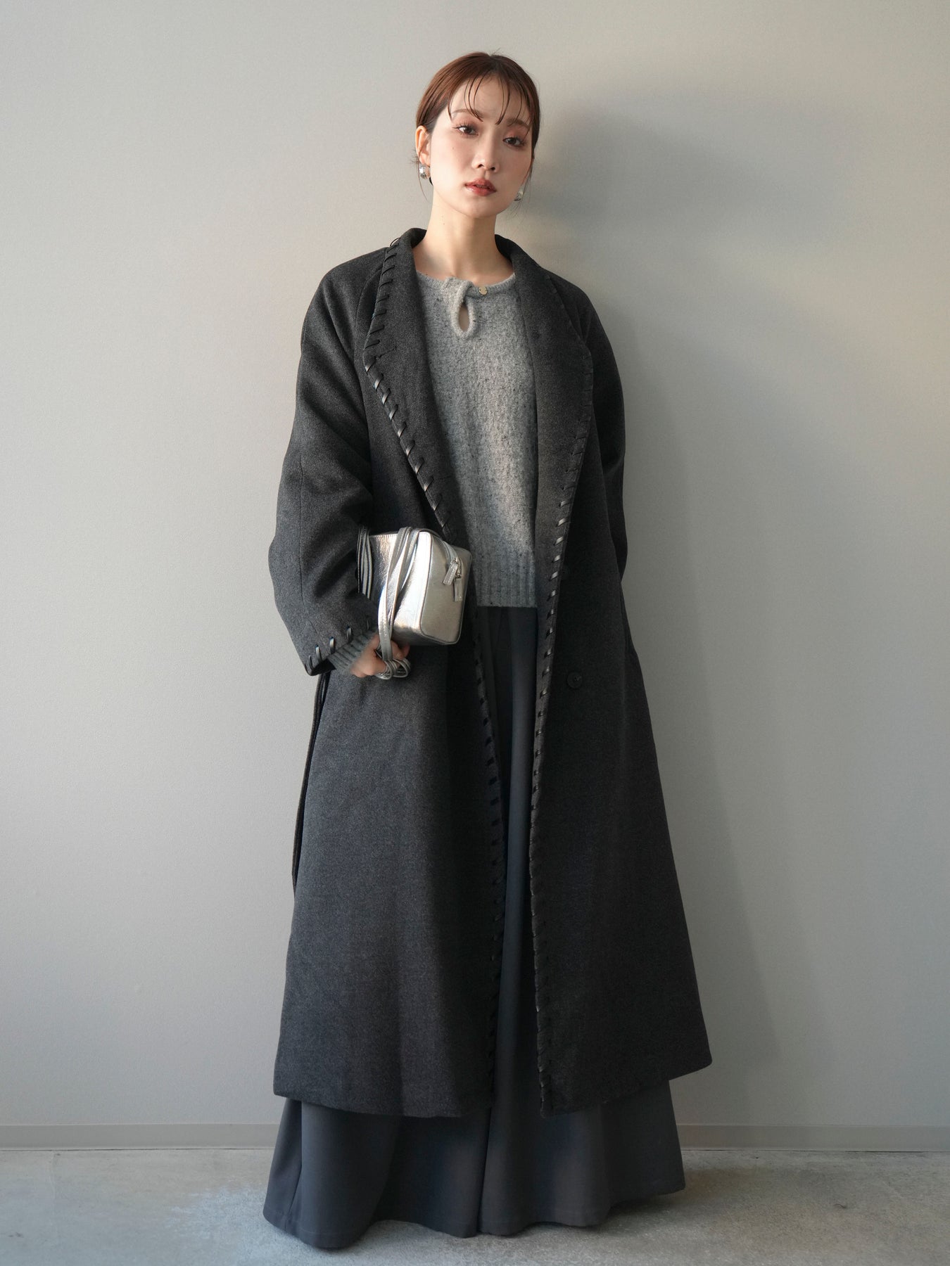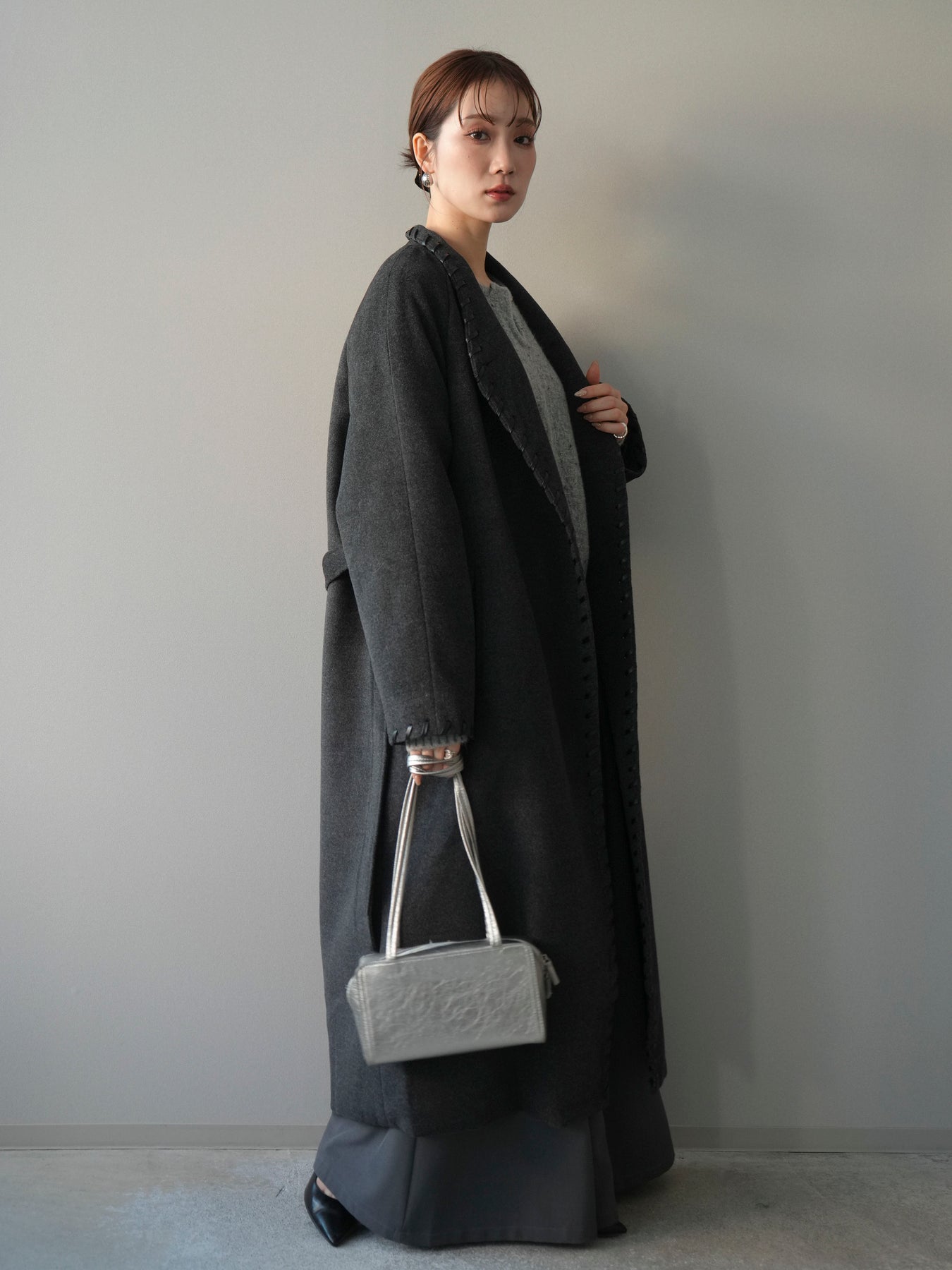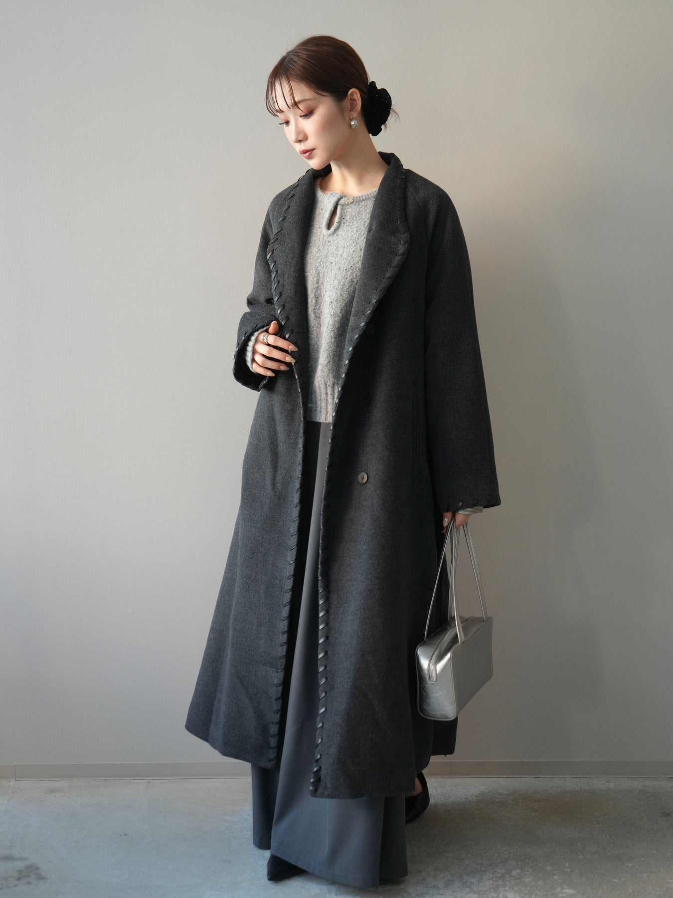 随所に施されたハンドステッチが印象的な、上品さ漂うロングコート。 さりげないステッチワークがデザインのアクセントとなり、シンプルな中にも温もりのある表情を添えています。 裏中綿仕様で、見た目はすっきりとしながらもシーズンムードをしっかりと感じられる一着。 縦のラインを強調するロング丈が、スタイリングをスマートにまとめてくれます。 デイリーからきれいめまで幅広く対応し、羽織るだけで大人らしい落ち着いた印象に仕上がるコートです。