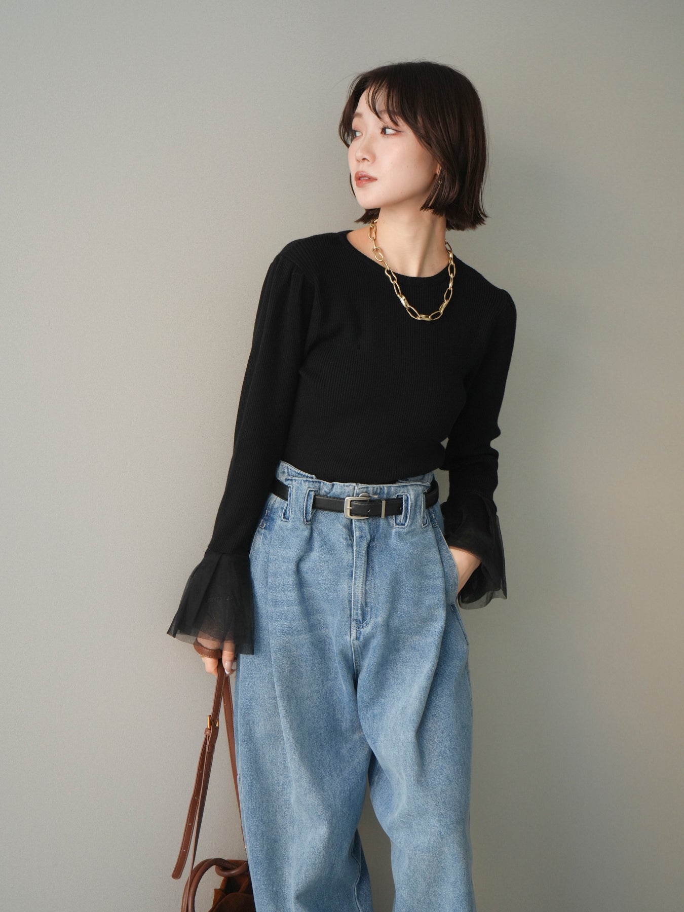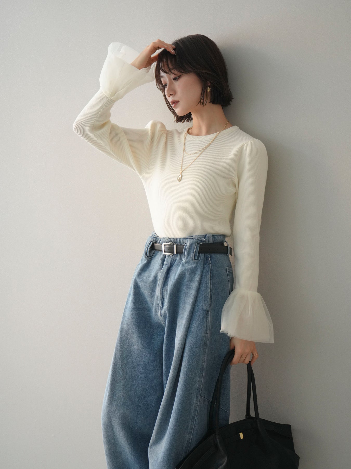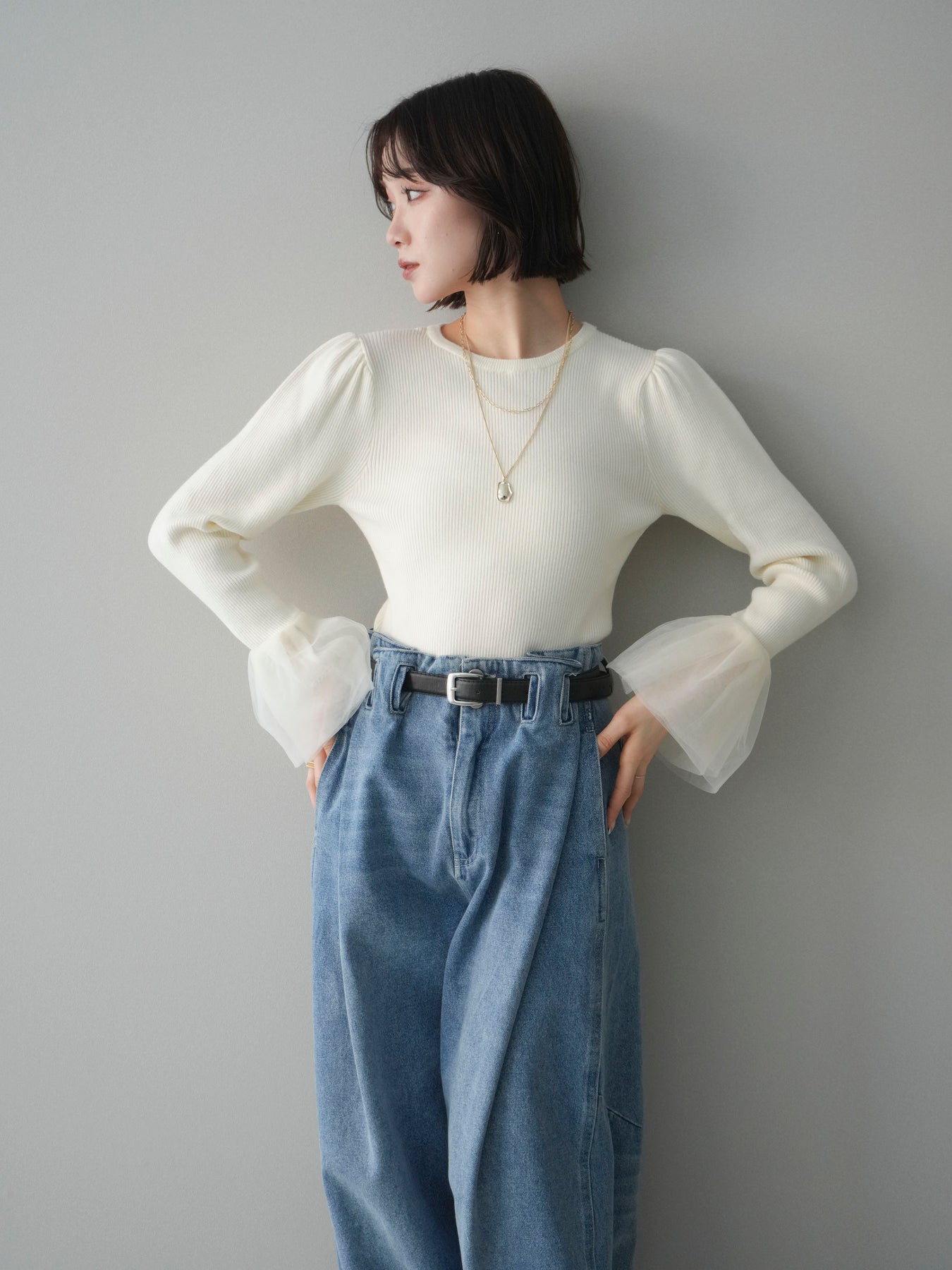 袖にあしらったチュール素材が印象的な、パワーショルデザインのリブニットトップス。 繊細な透け感と立体感のある袖デザインが、シンプルなリブ編みボディにさりげない華やかさを添えます。 身頃はほどよくフィット感のあるリブ素材で、全体のバランスをすっきりとまとめながら、ショルダーラインに自然な存在感をプラス。 袖口にかけて広がるチュールが動きに合わせて柔らかく揺れ、スタイリングに軽やかなニュアンスをもたらします。 一枚で主役になるデザインなので、デニムなどのカジュアルなボトムスから、きれいめなアイテムまで幅広く合わせやすく、季節の変わり目にも活躍する一着です。 ※ボトムス、キャミソール(インナー)以外の商品は一律でインナーは付属していません。