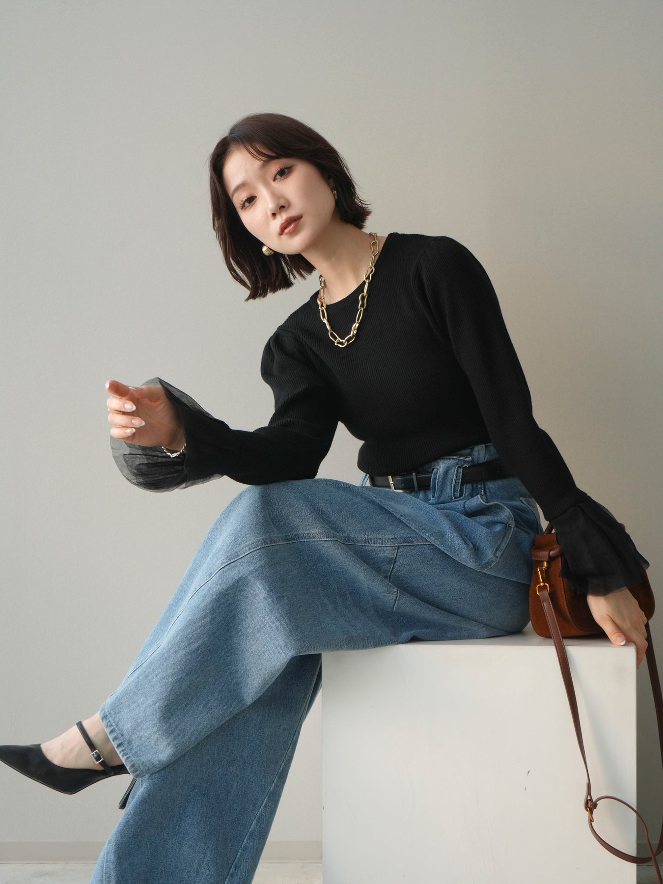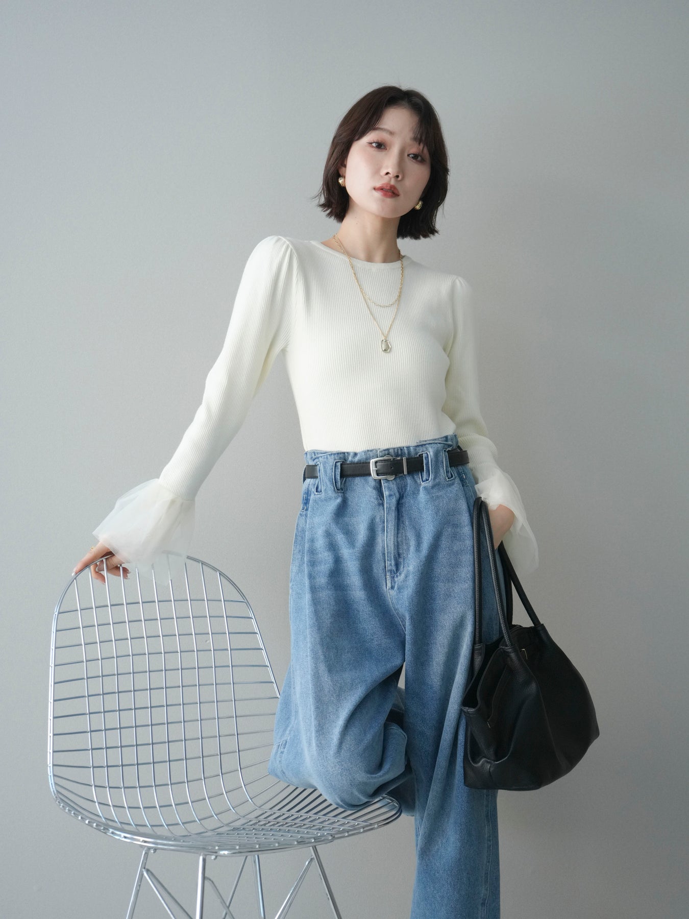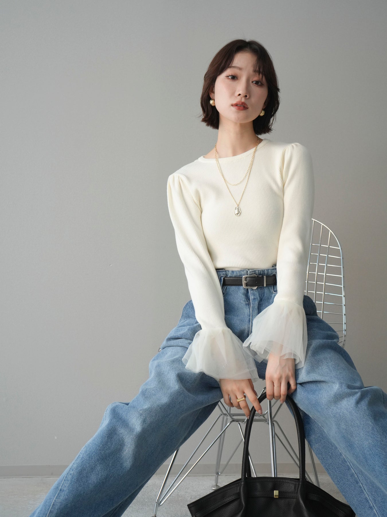 袖にあしらったチュール素材が印象的な、パワーショルデザインのリブニットトップス。 繊細な透け感と立体感のある袖デザインが、シンプルなリブ編みボディにさりげない華やかさを添えます。 身頃はほどよくフィット感のあるリブ素材で、全体のバランスをすっきりとまとめながら、ショルダーラインに自然な存在感をプラス。 袖口にかけて広がるチュールが動きに合わせて柔らかく揺れ、スタイリングに軽やかなニュアンスをもたらします。 一枚で主役になるデザインなので、デニムなどのカジュアルなボトムスから、きれいめなアイテムまで幅広く合わせやすく、季節の変わり目にも活躍する一着です。 ※ボトムス、キャミソール(インナー)以外の商品は一律でインナーは付属していません。