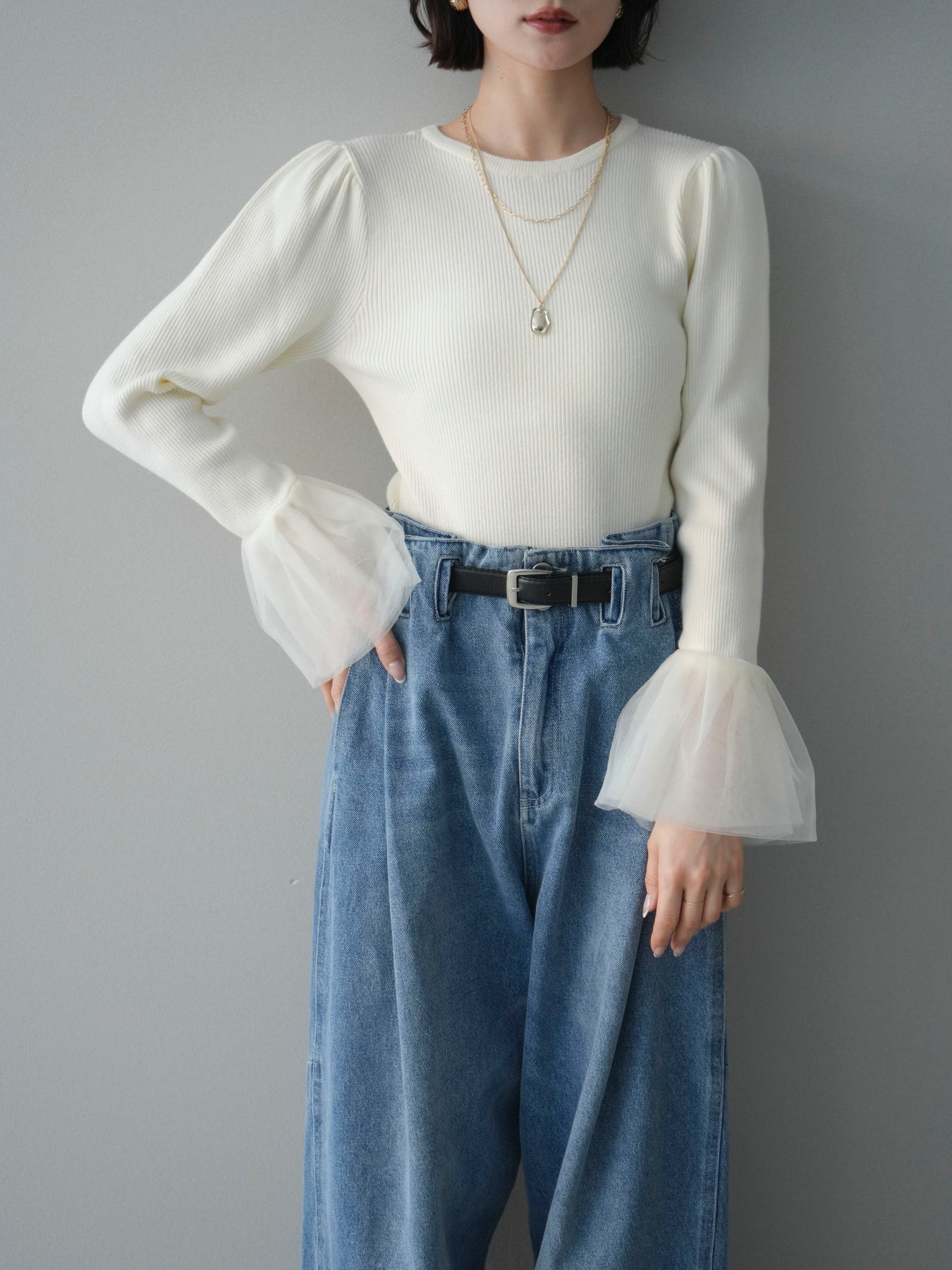 ◆ [予約]袖チュールパワショルリブニットトップス