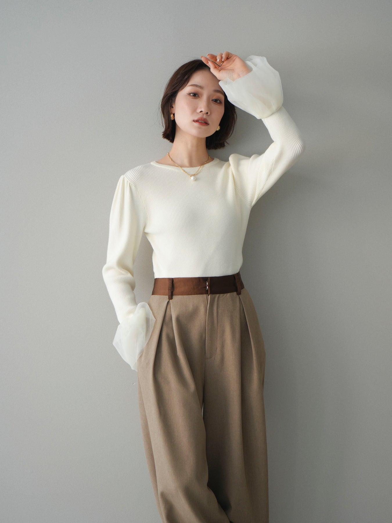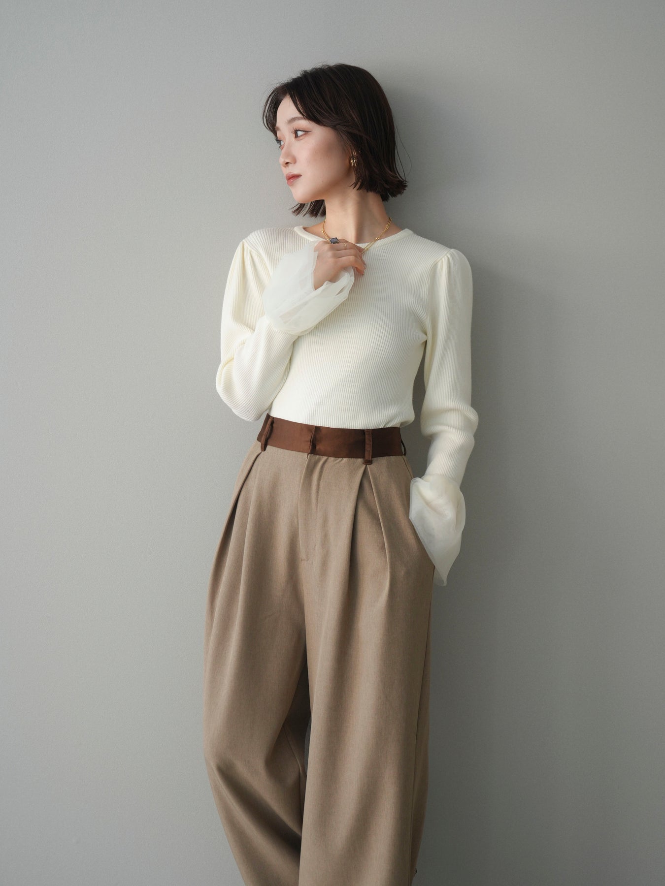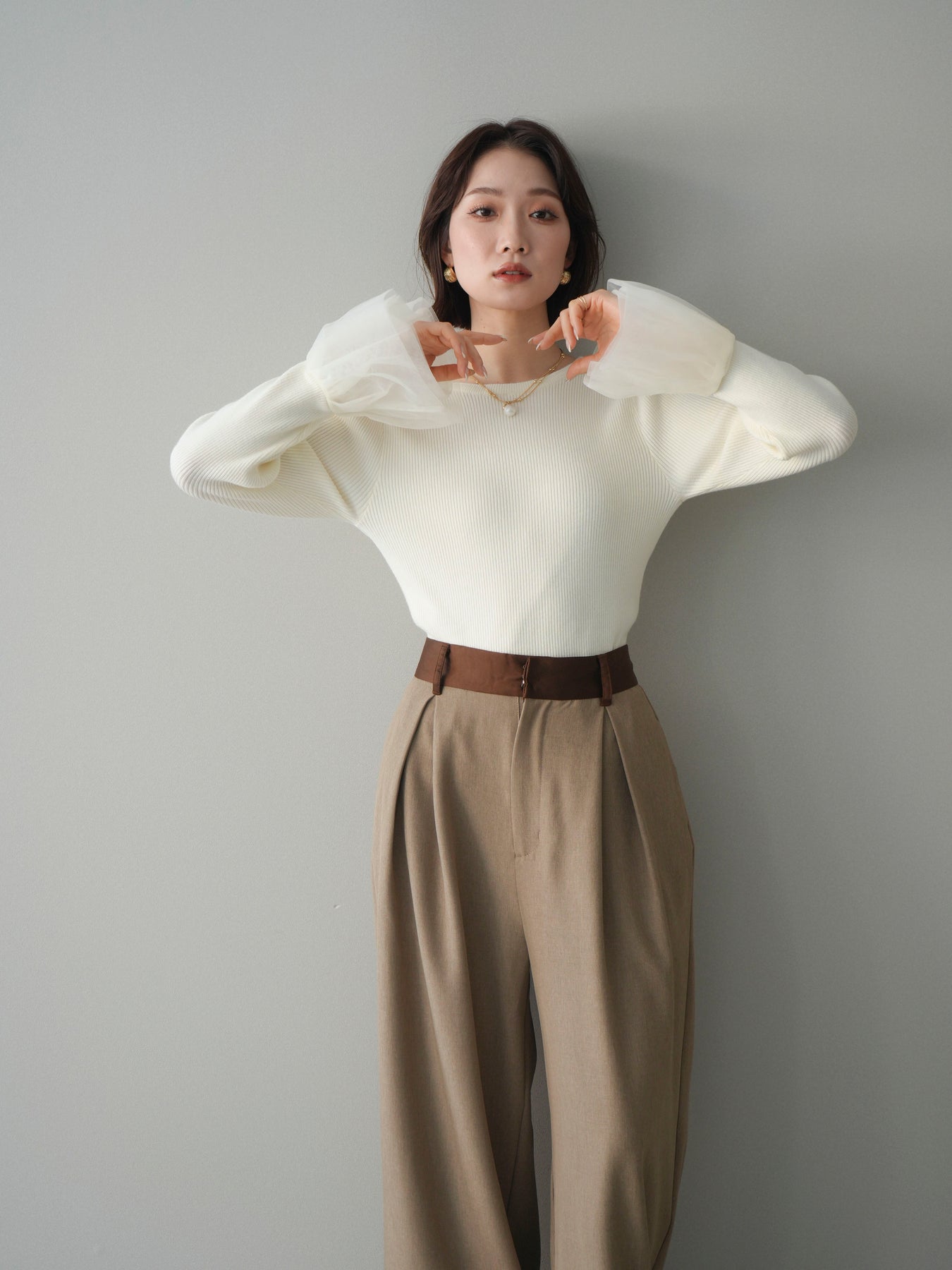[SET]袖チュールパワショルリブニットトップス+サテンベルトタックワイドパンツ(2set)