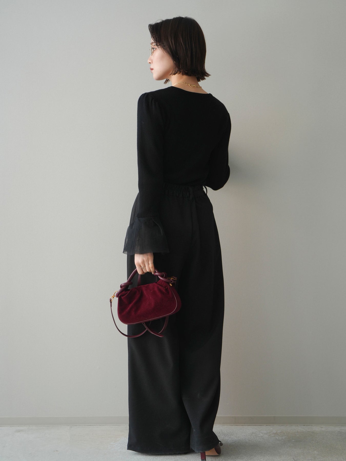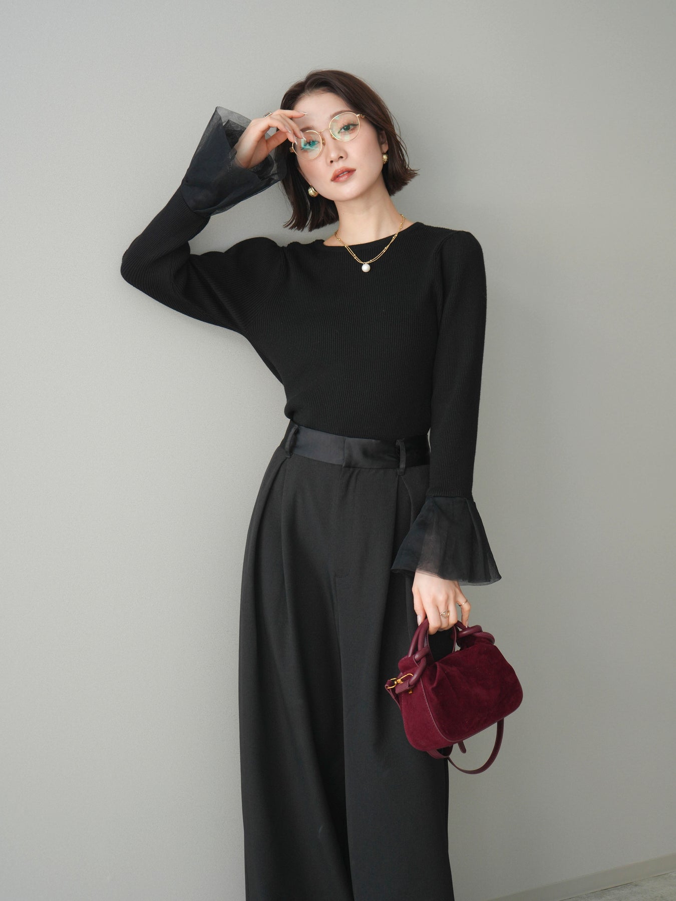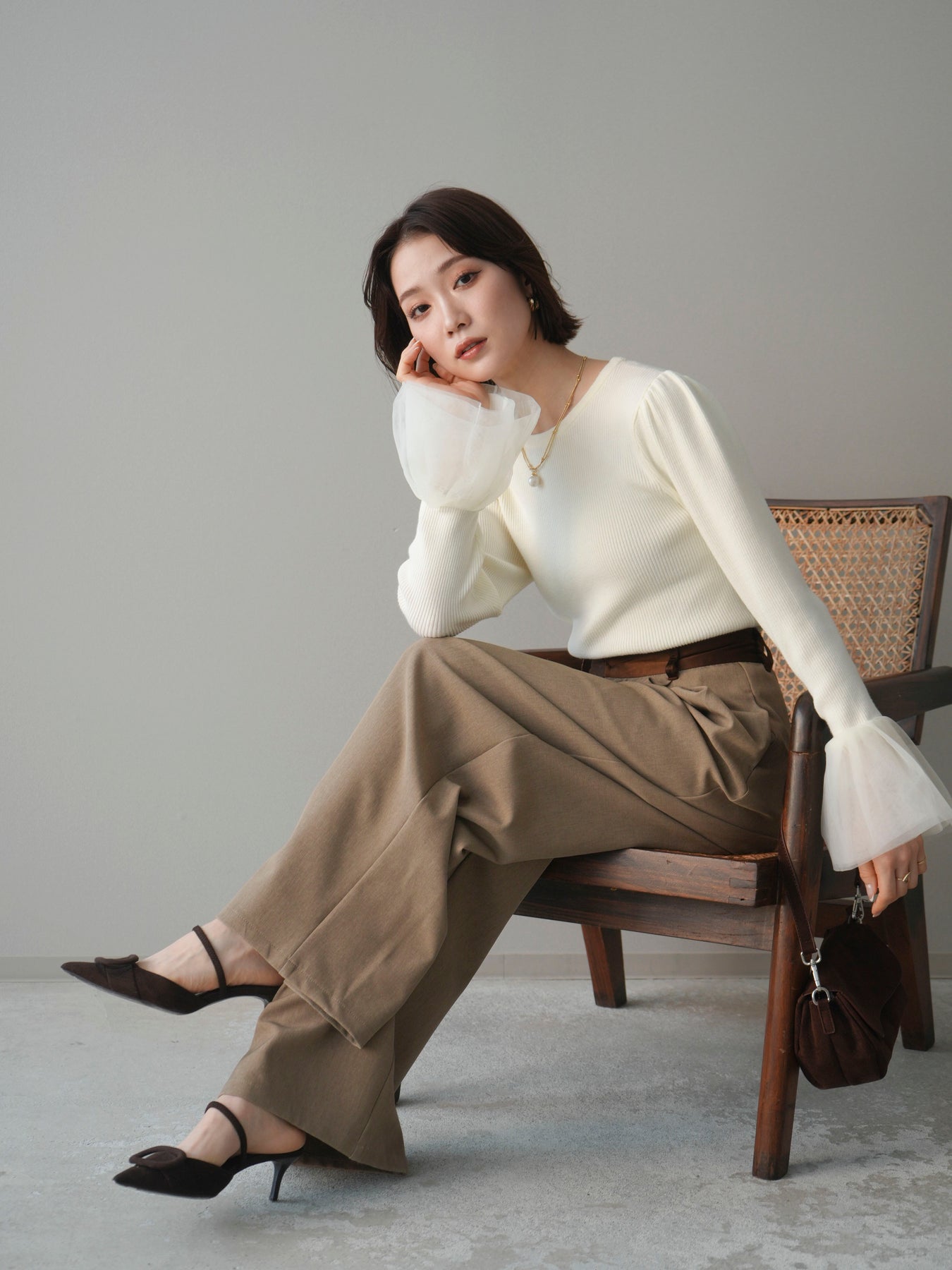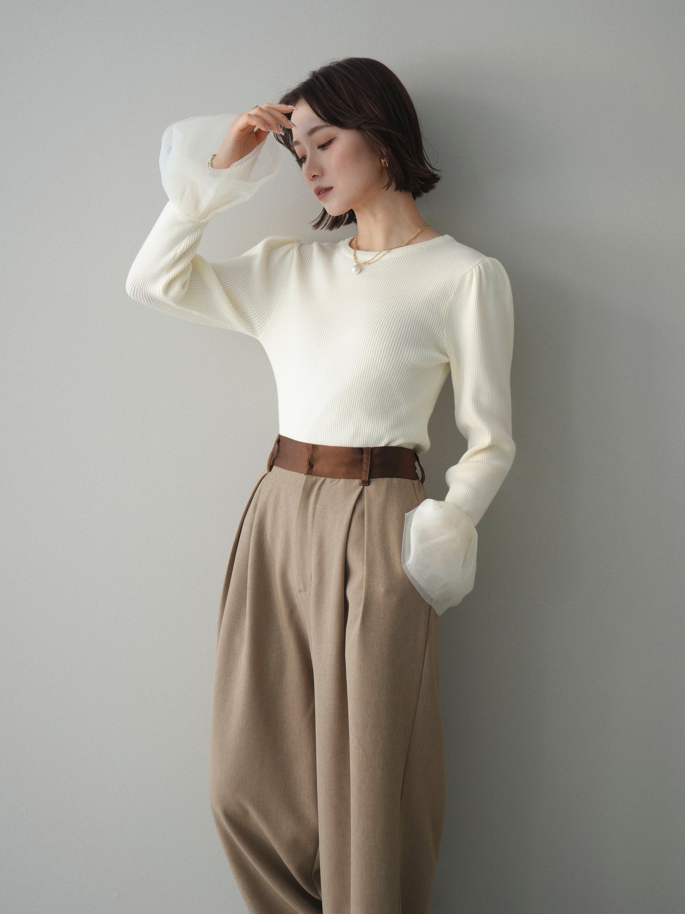[SET]袖チュールパワショルリブニットトップス+サテンベルトタックワイドパンツ(2set)