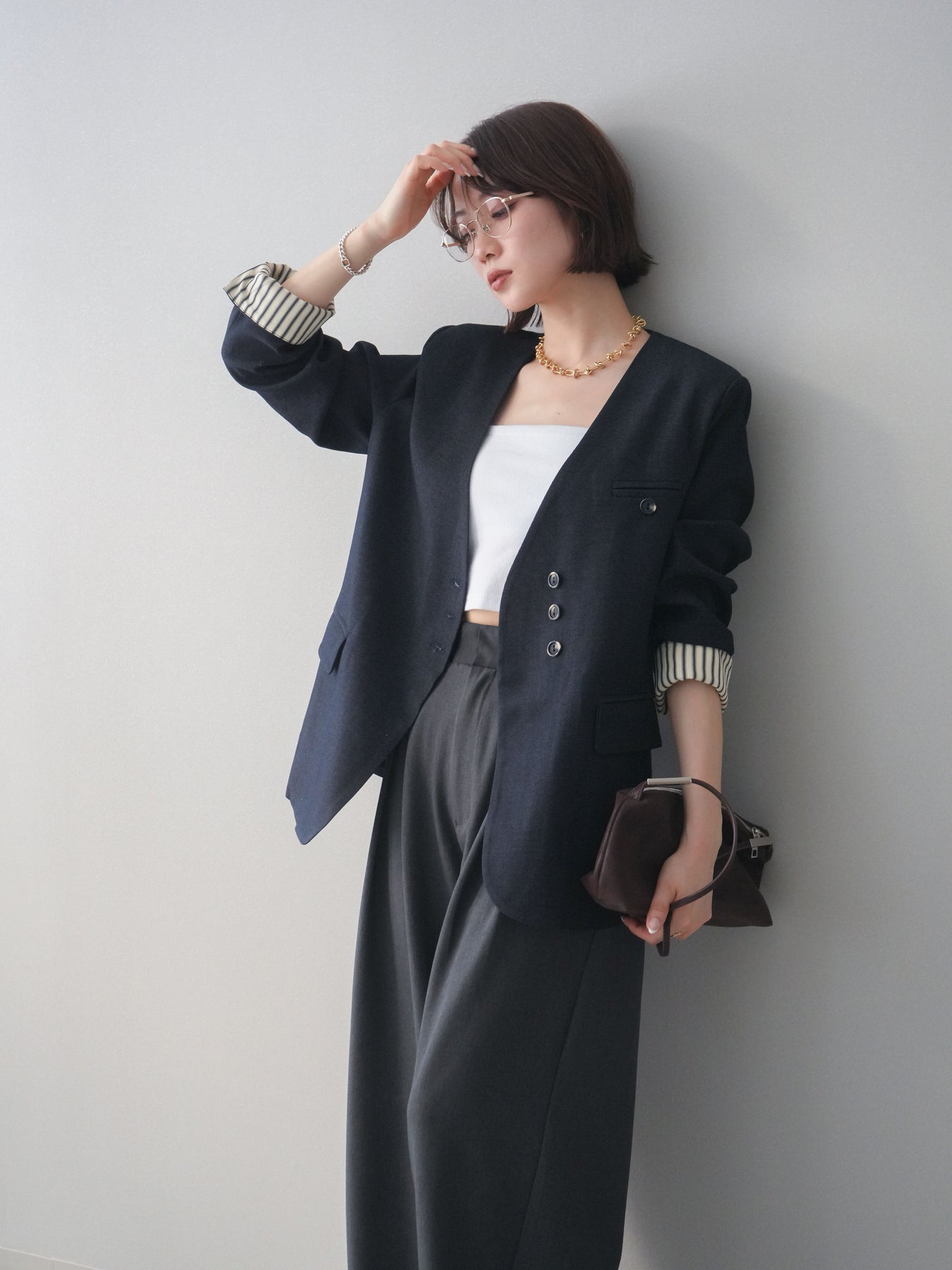 程よいきちんと感と抜け感を両立した、ノーカラーデザインのジャケット。 首元をすっきり見せるカッティングに、さりげないボタン配置がアクセントになり、シンプルながら印象に残る一着です。 袖口を折り返したときに覗くディテールが、着こなしに奥行きをプラス。インナー次第で雰囲気が変わり、デイリーから少し整えたいシーンまで幅広く活躍します。 軽やかな着心地で、肩の力を抜いたスタイルにも自然に馴染むのも魅力です。 ※ボトムス、キャミソール(インナー)以外の商品は一律でインナーは付属していません。